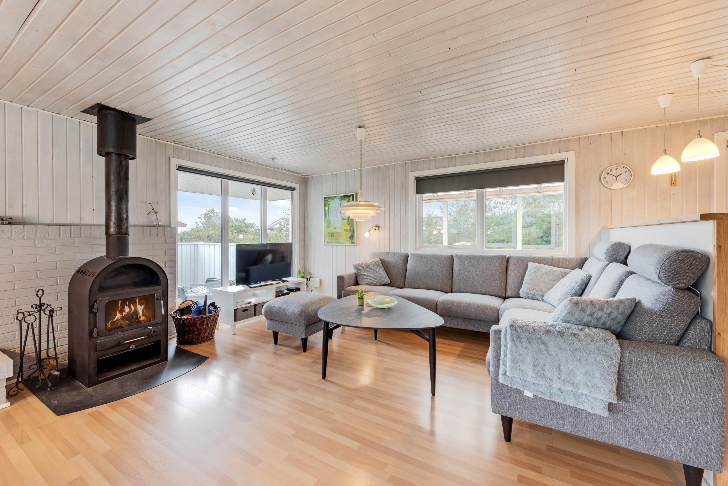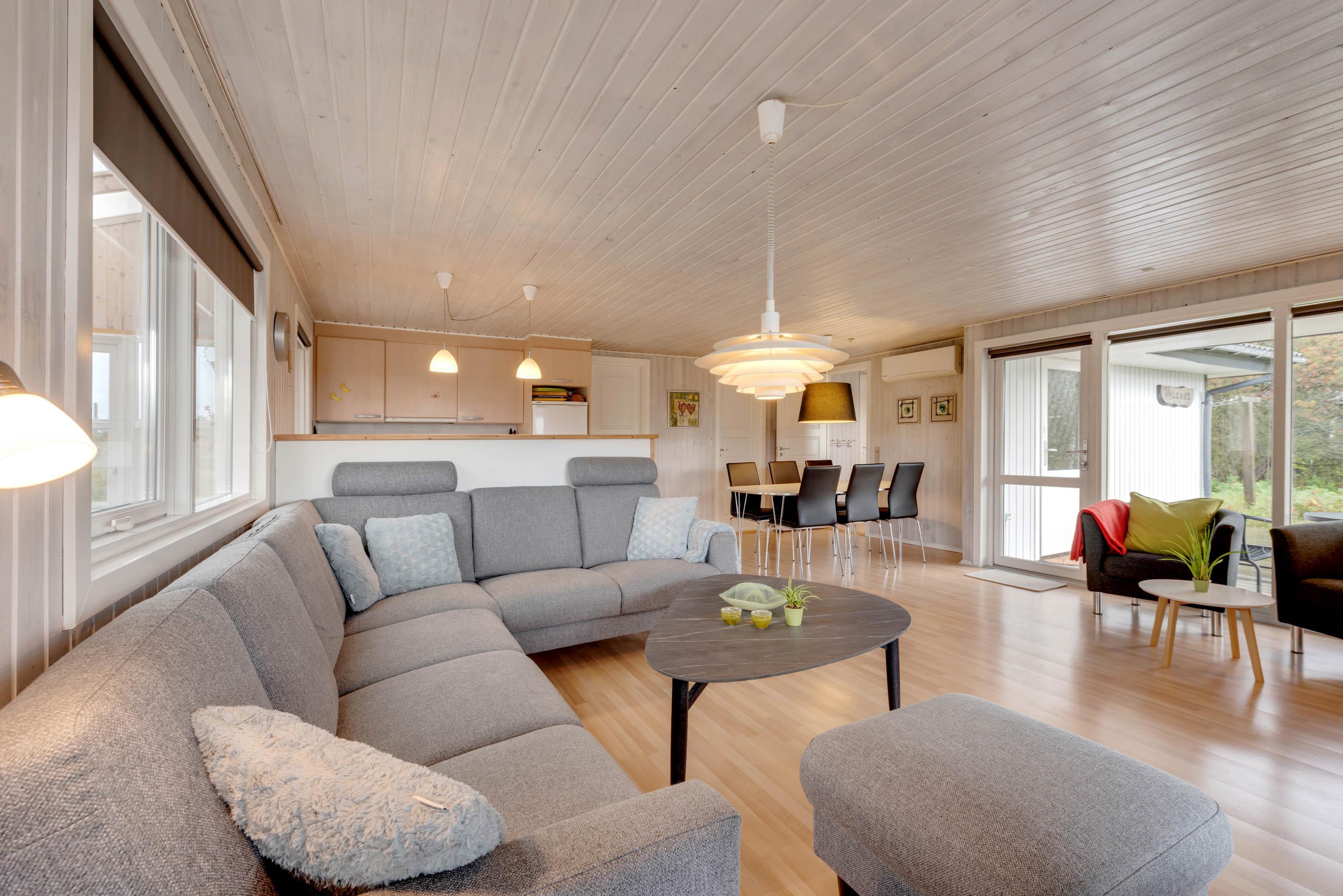 Når I træder ind i feriehuset, kommer I først til entréen med opbevaringsplads og direkte adgang til det åbne køkkenalrum. I stuen sørger brændeovnen og varmepumpen for en behagelig varme, og hjørnesofaen er perfekt til spil, hyggesnak eller en filmaften. Desuden har sommerhuset et Chromecast, så I nemt kan streame jeres yndlingsfilm og serier fra egne enheder. Køkkenet er godt udstyret med opvaskemaskine, mikrobølgeovn og køleskab med fryser – alt, hvad I skal bruge for et bekvemt ophold.