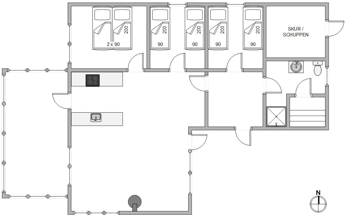 Sommerhuset har 3 soveværelser: ét med dobbeltseng og to med hver 2 enkeltsenge – perfekt til familier. Alle værelser har tæppebelægning og skaber en hyggelig og hjemlig stemning. Badeværelset har bruser og sauna – ideelt til afslapning efter en strandtur. Vaskemaskinen står i skuret, så I kan holde tøjet frisk under opholdet.
