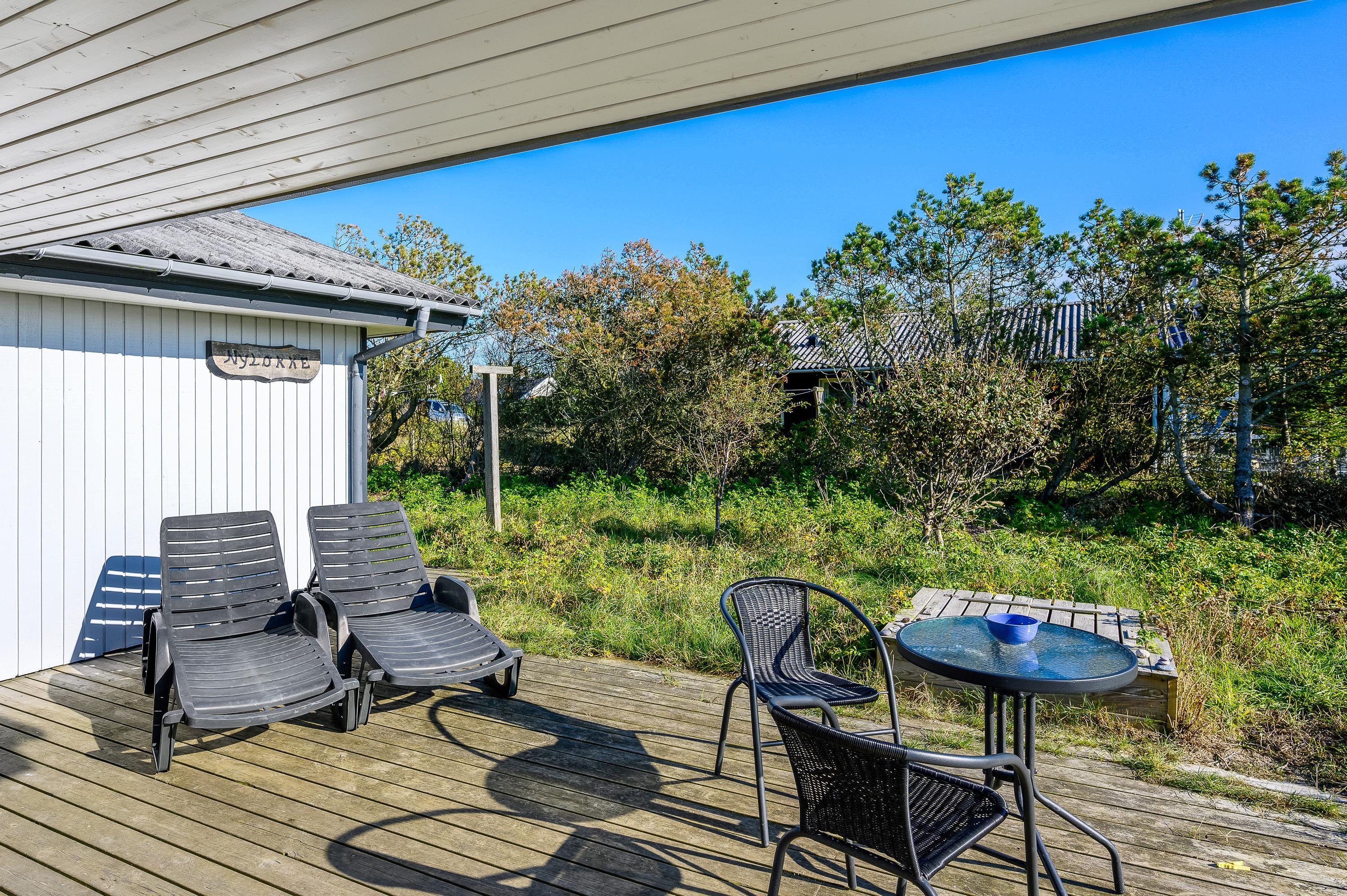 Feriehuset ligger på en stor naturgrund med udsigt mod syd over det fredede hedeområde. Terrassen er delvist overdækket og delvist lukket, så I kan nyde solnedgangen eller sidde ude uanset vejret.