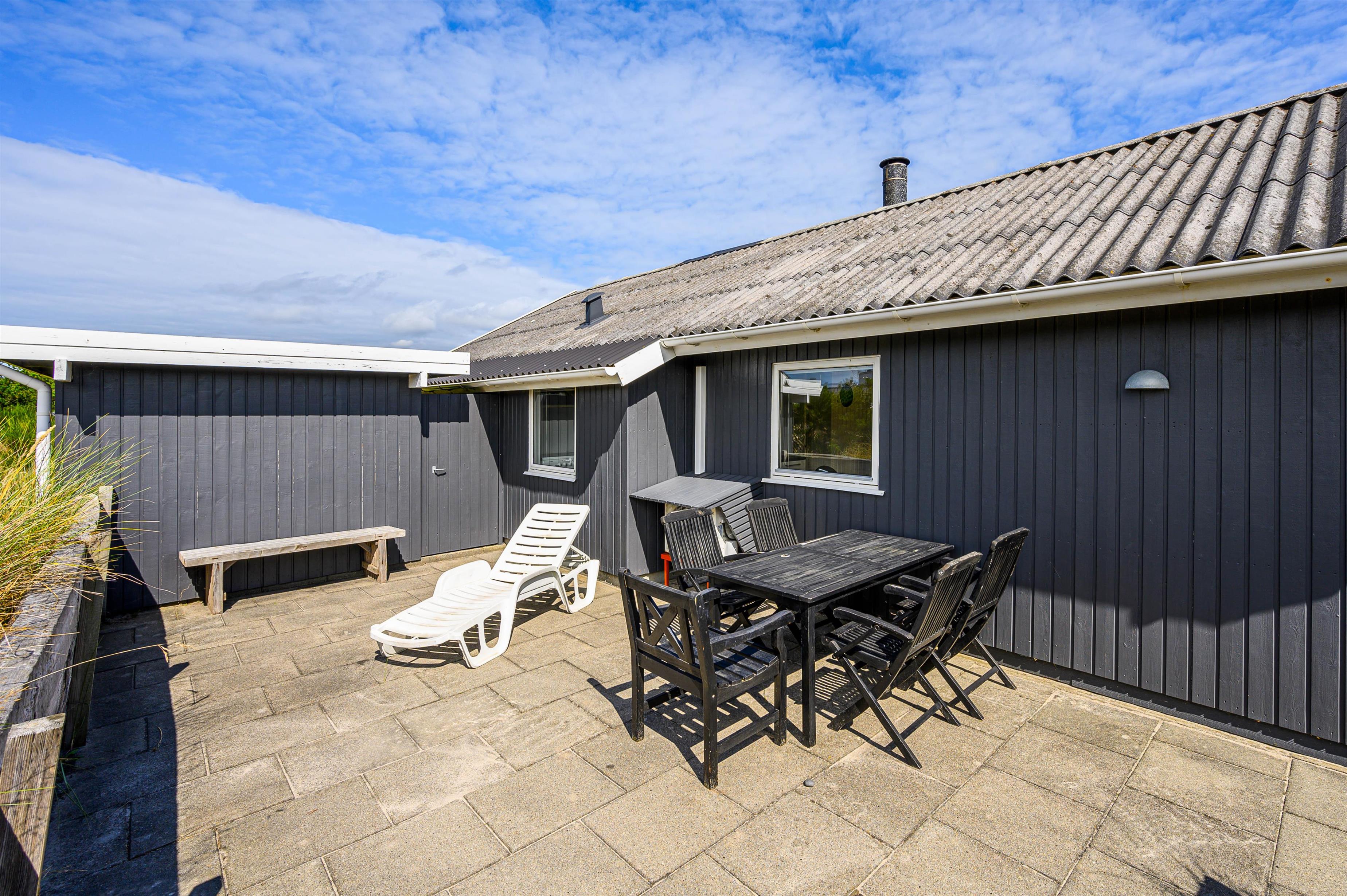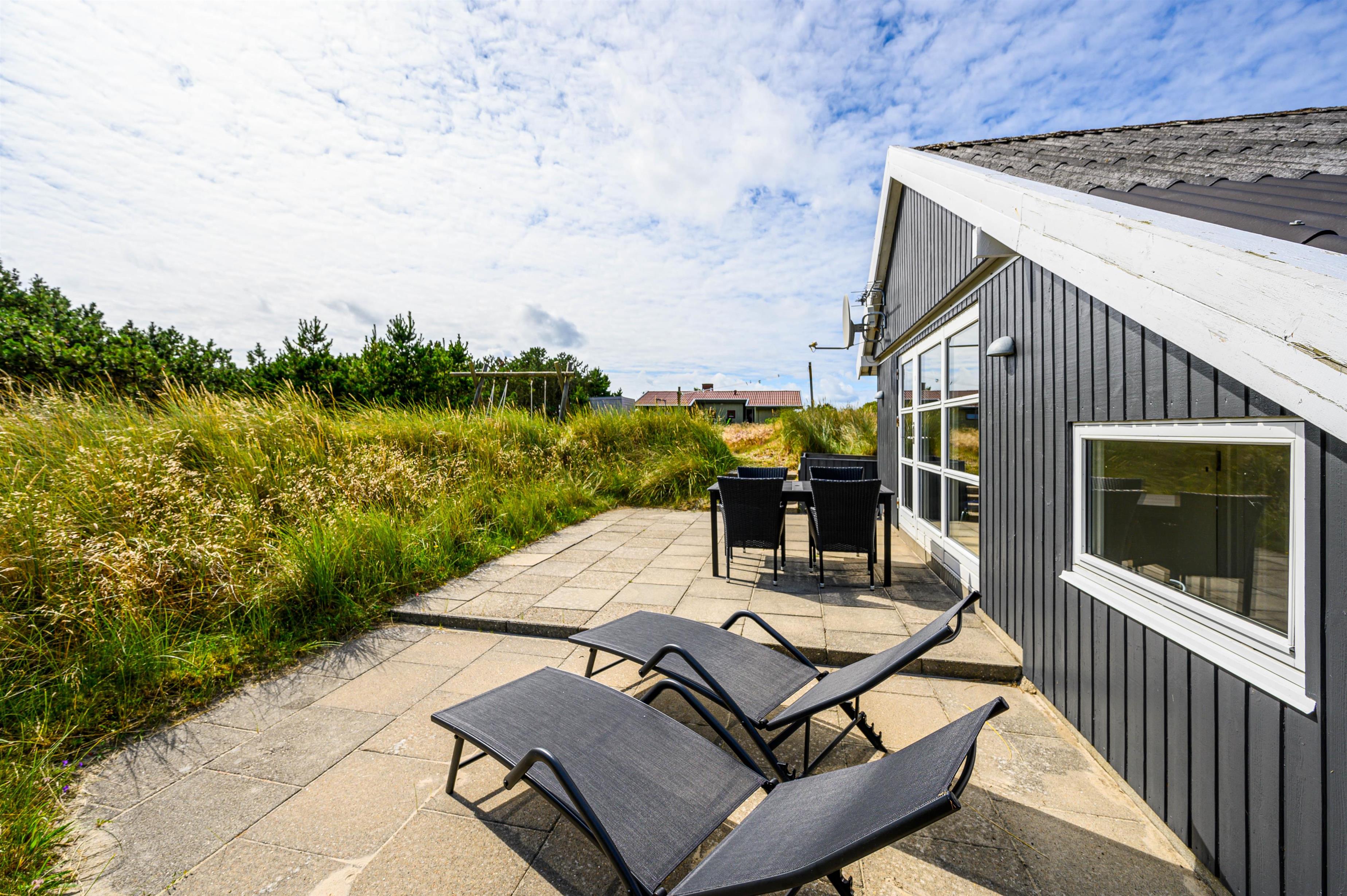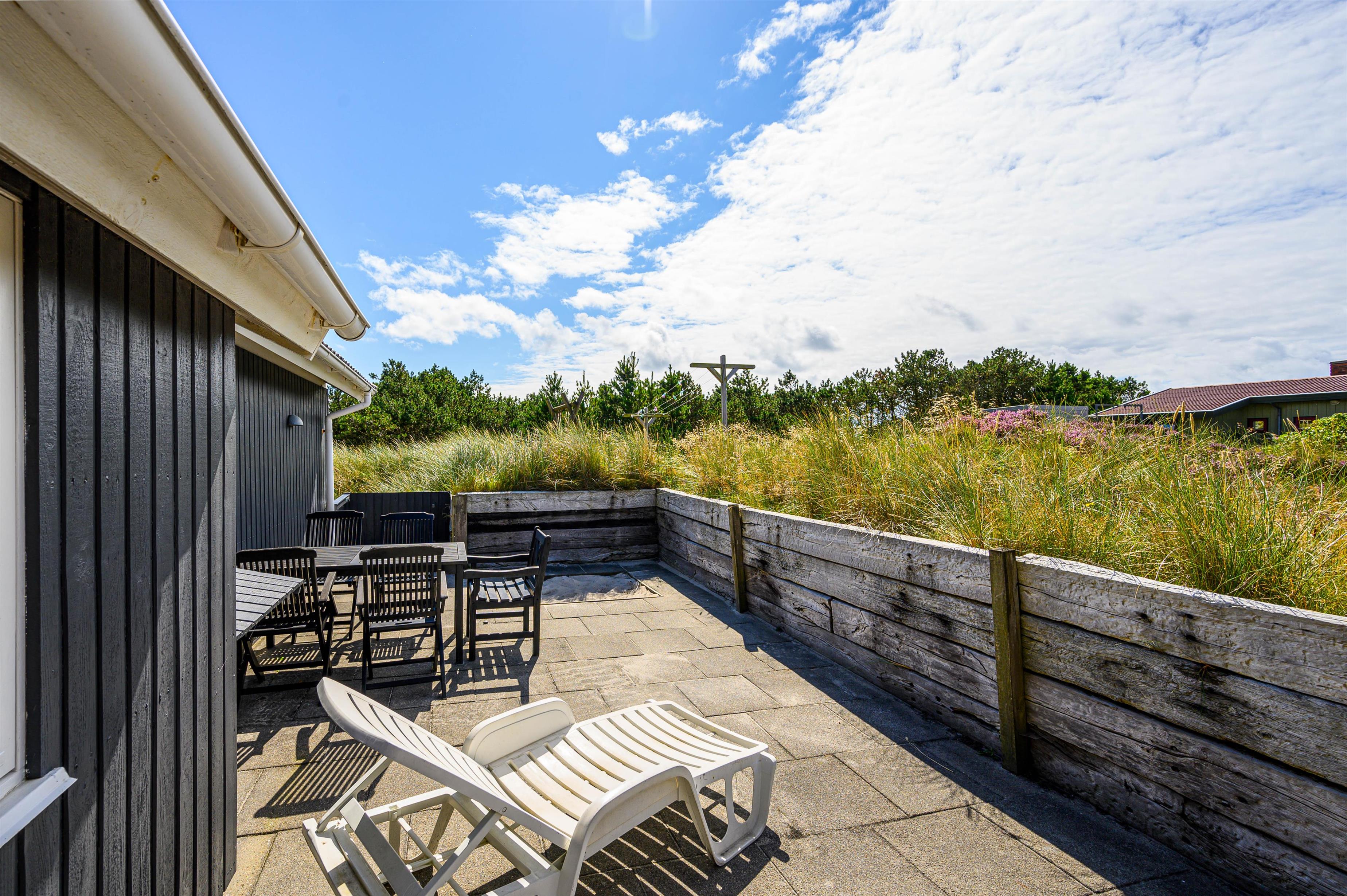 Rundt om sommerhuset findes flere dejlige terrasser, så I kan nyde solen hele dagen. På den lukkede østterrasse kan I starte dagen med en varm kop kaffe, mens vestterrassen er perfekt til hyggelige eftermiddage og uforstyrrede timer for børnene i sandkassen. Til de mindste er der også et lille gyngestativ.