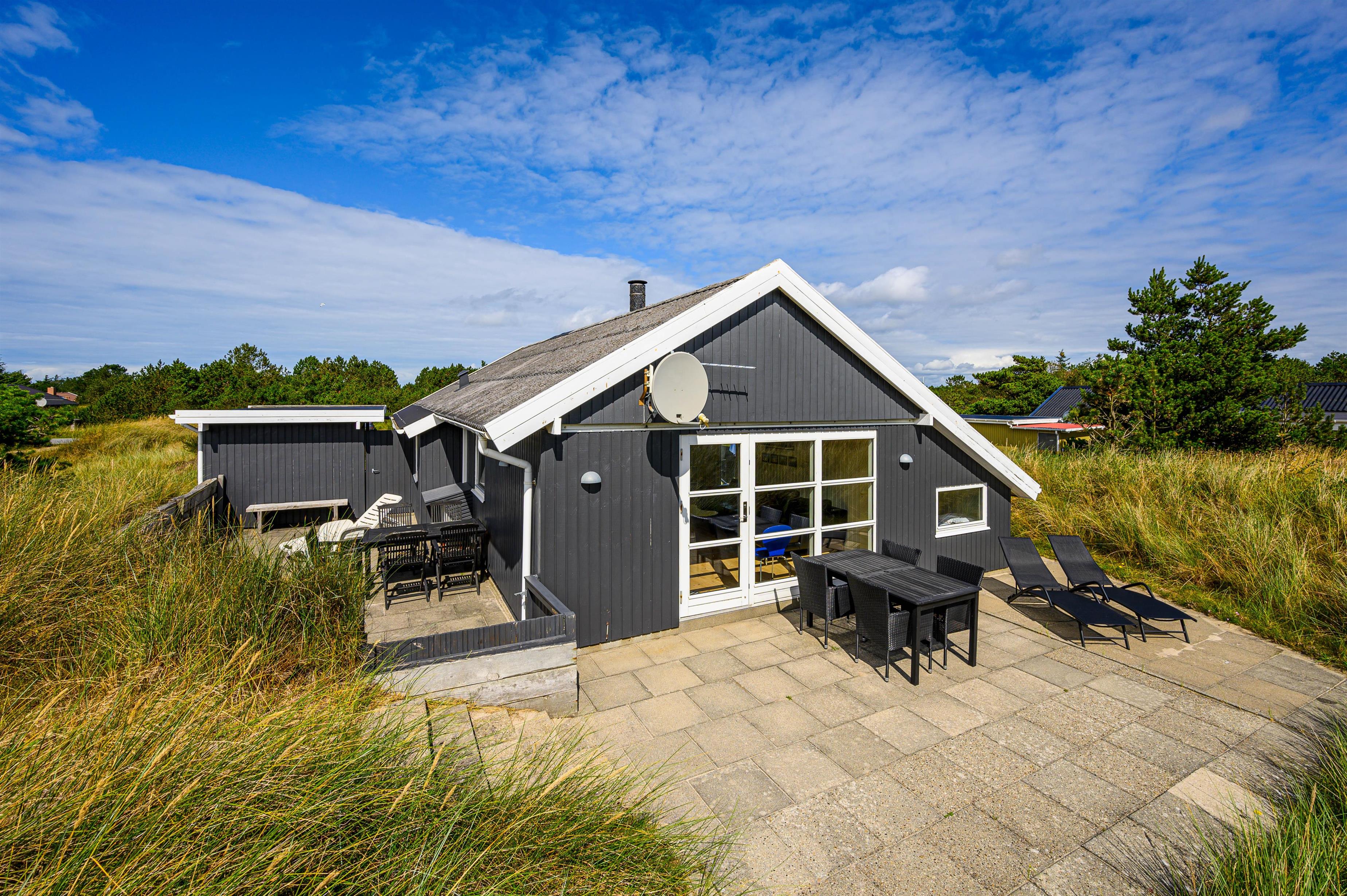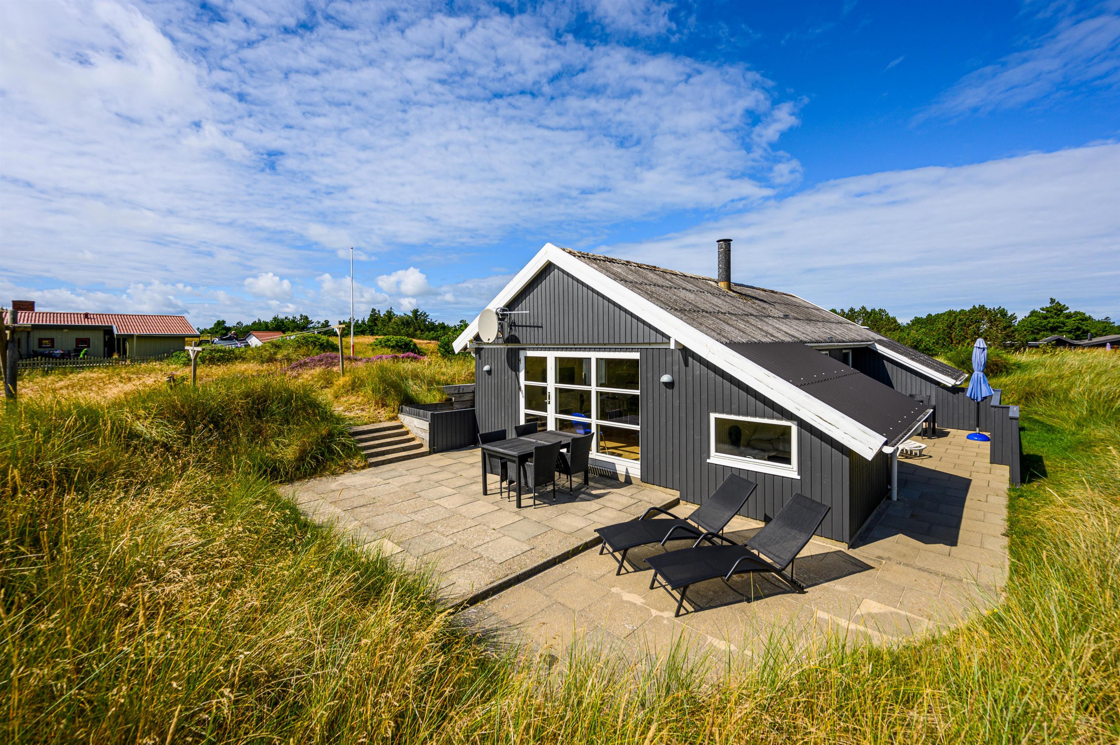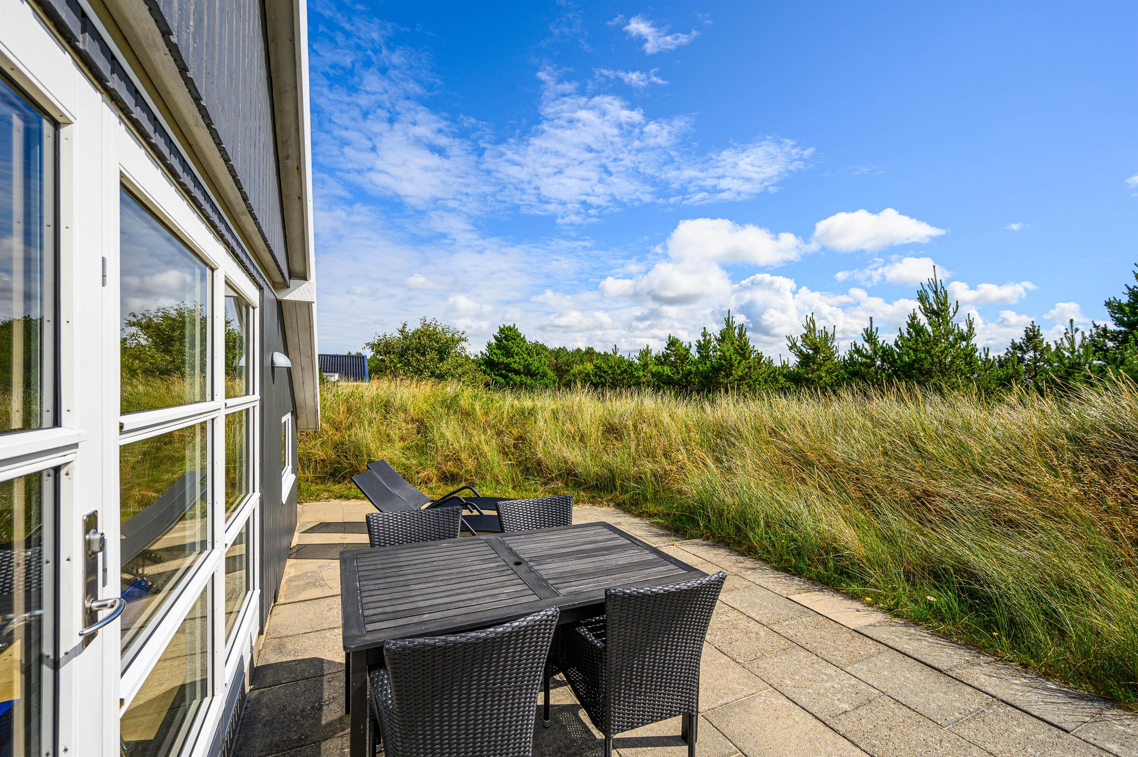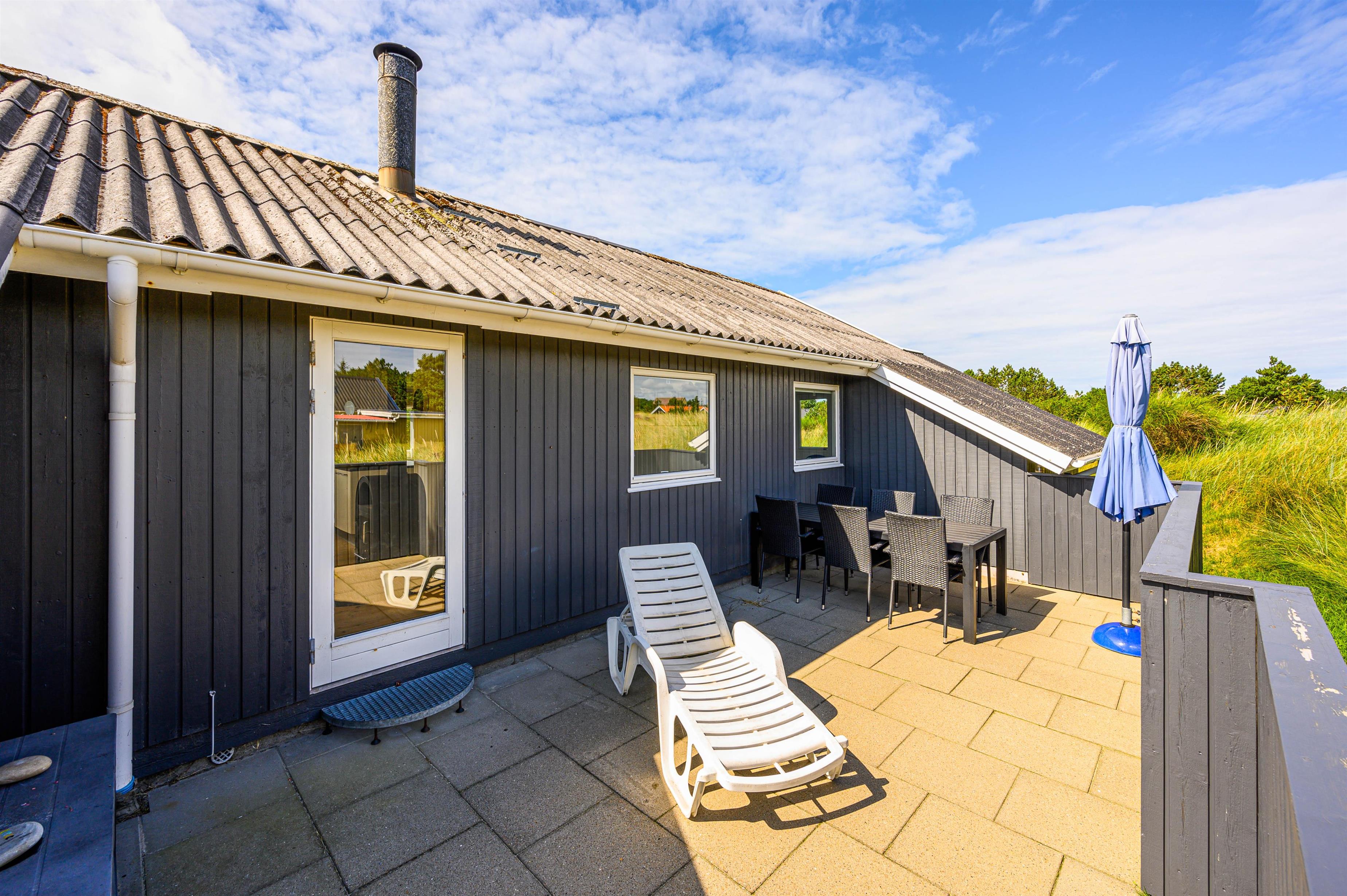 Rundt om sommerhuset findes flere dejlige terrasser, så I kan nyde solen hele dagen. På den lukkede østterrasse kan I starte dagen med en varm kop kaffe, mens vestterrassen er perfekt til hyggelige eftermiddage og uforstyrrede timer for børnene i sandkassen. Til de mindste er der også et lille gyngestativ.