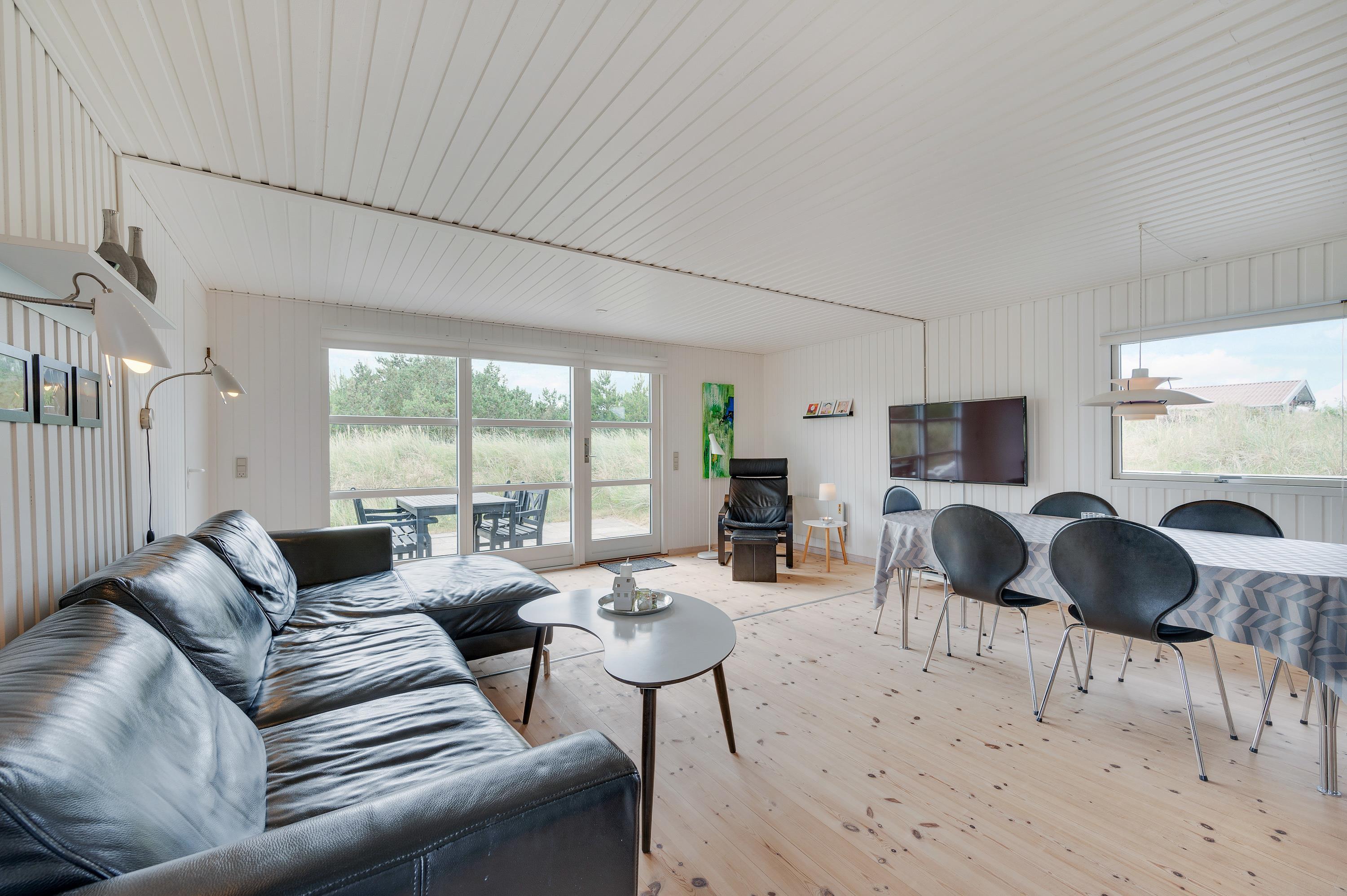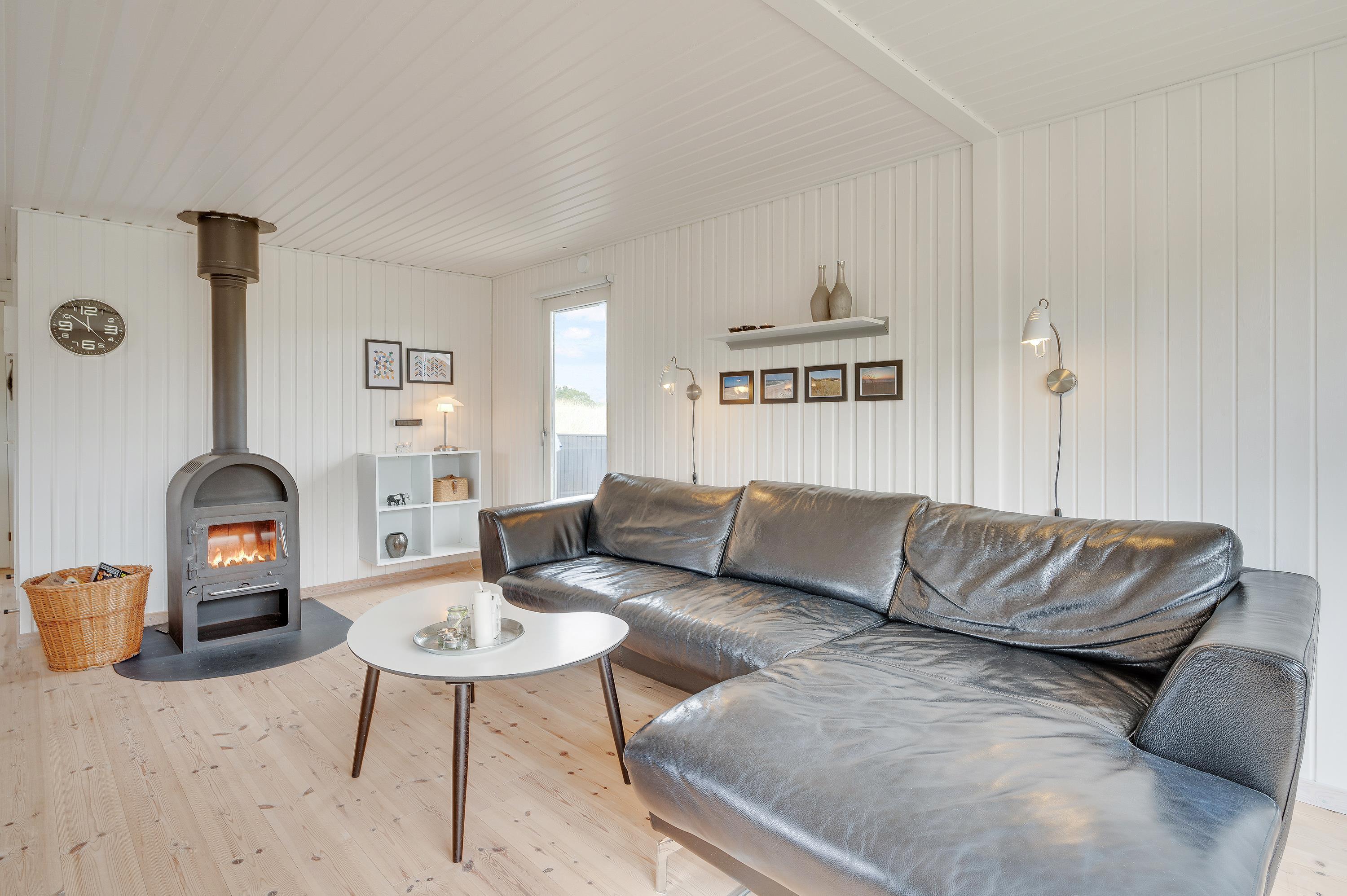 Hjertet i sommerhuset er den store kombinerede stue- og spiseafdeling med åben køkkenløsning. De store sydvendte vinduer fylder rummet med lys og skaber en indbydende atmosfære. For behagelig varme og et godt indeklima kan I benytte den energibesparende varmepumpe eller den hyggelige brændeovn. I det veludstyrede køkken kan I sammen tilberede lækre måltider, mens opvaskemaskinen gør arbejdet lettere. Om aftenen indbyder de komfortable sofaer og den behagelige lænestol til spil eller afslappet læsning.
