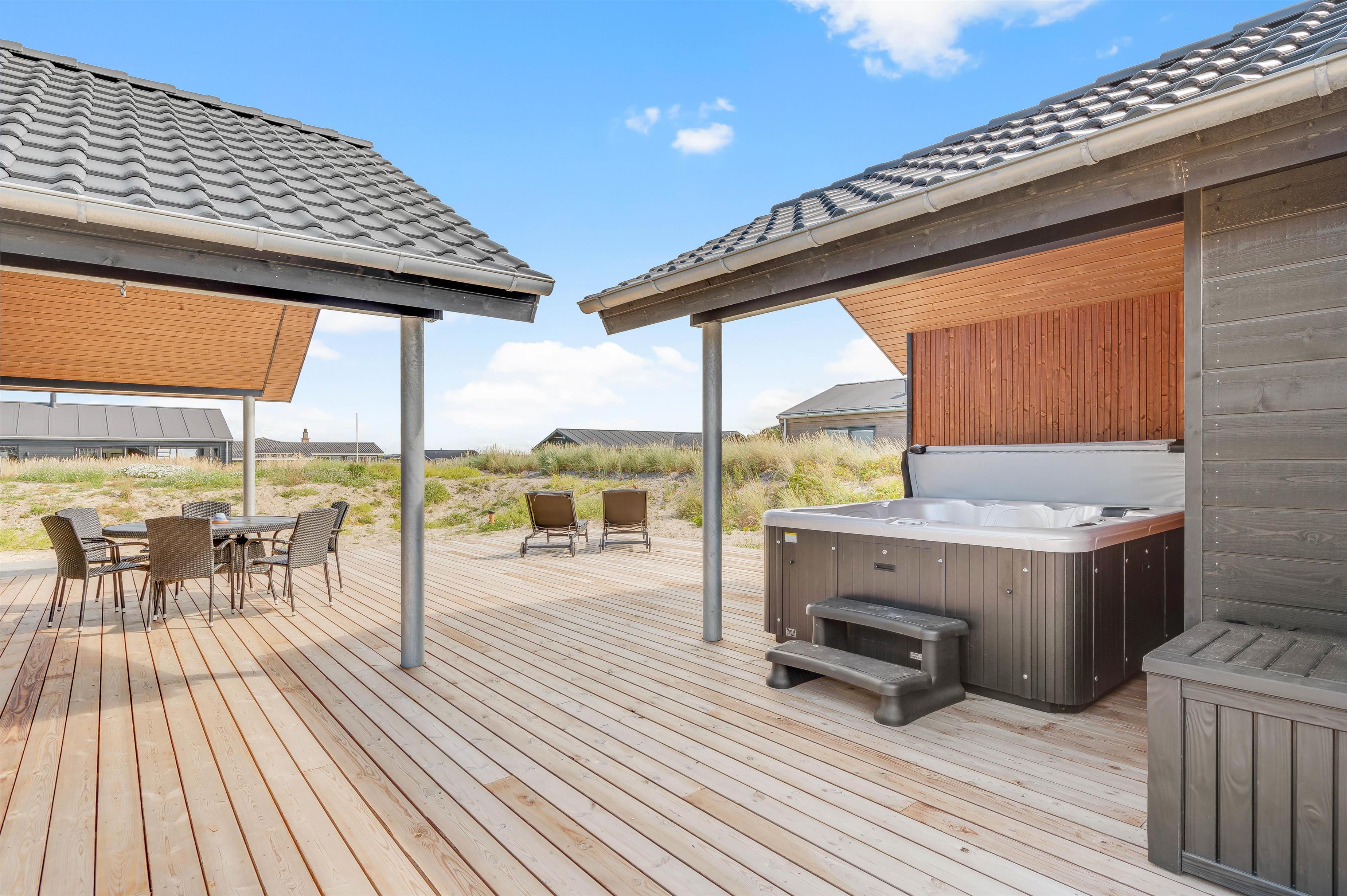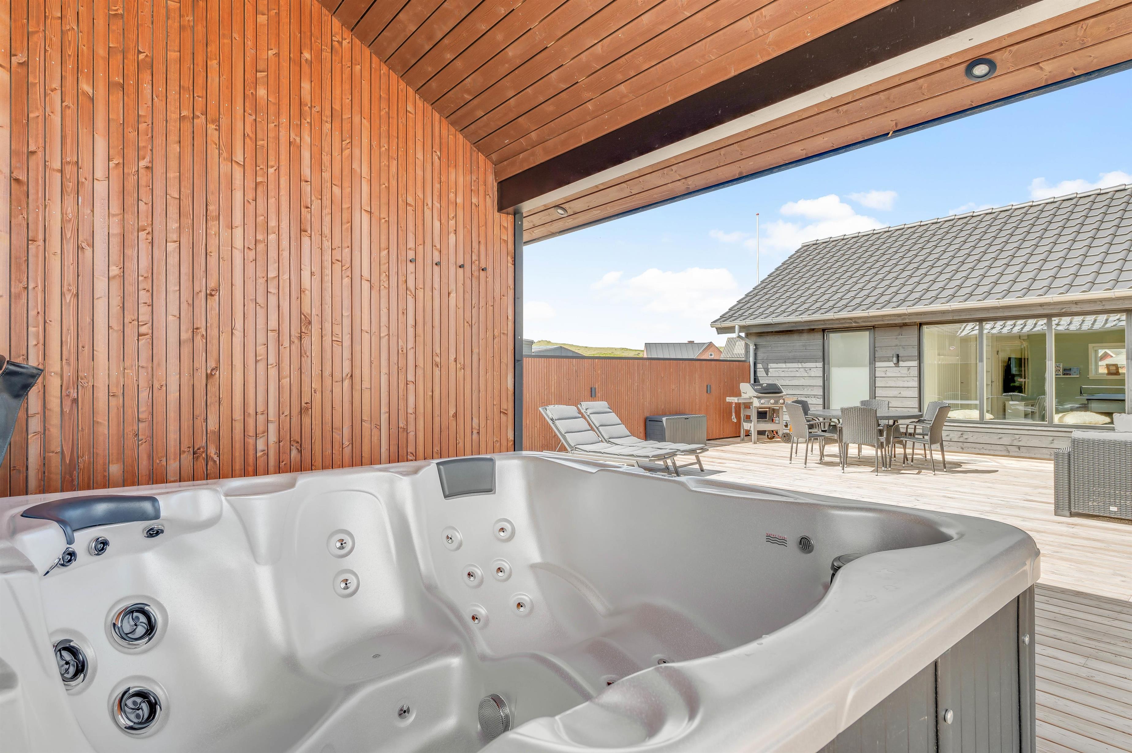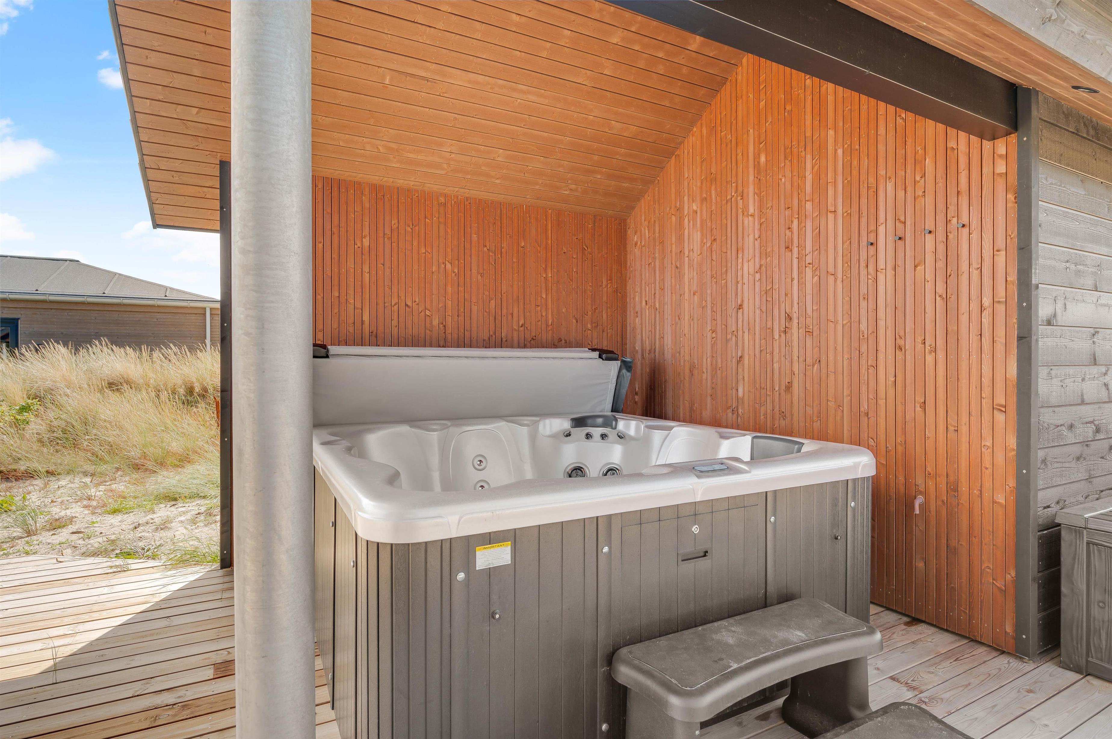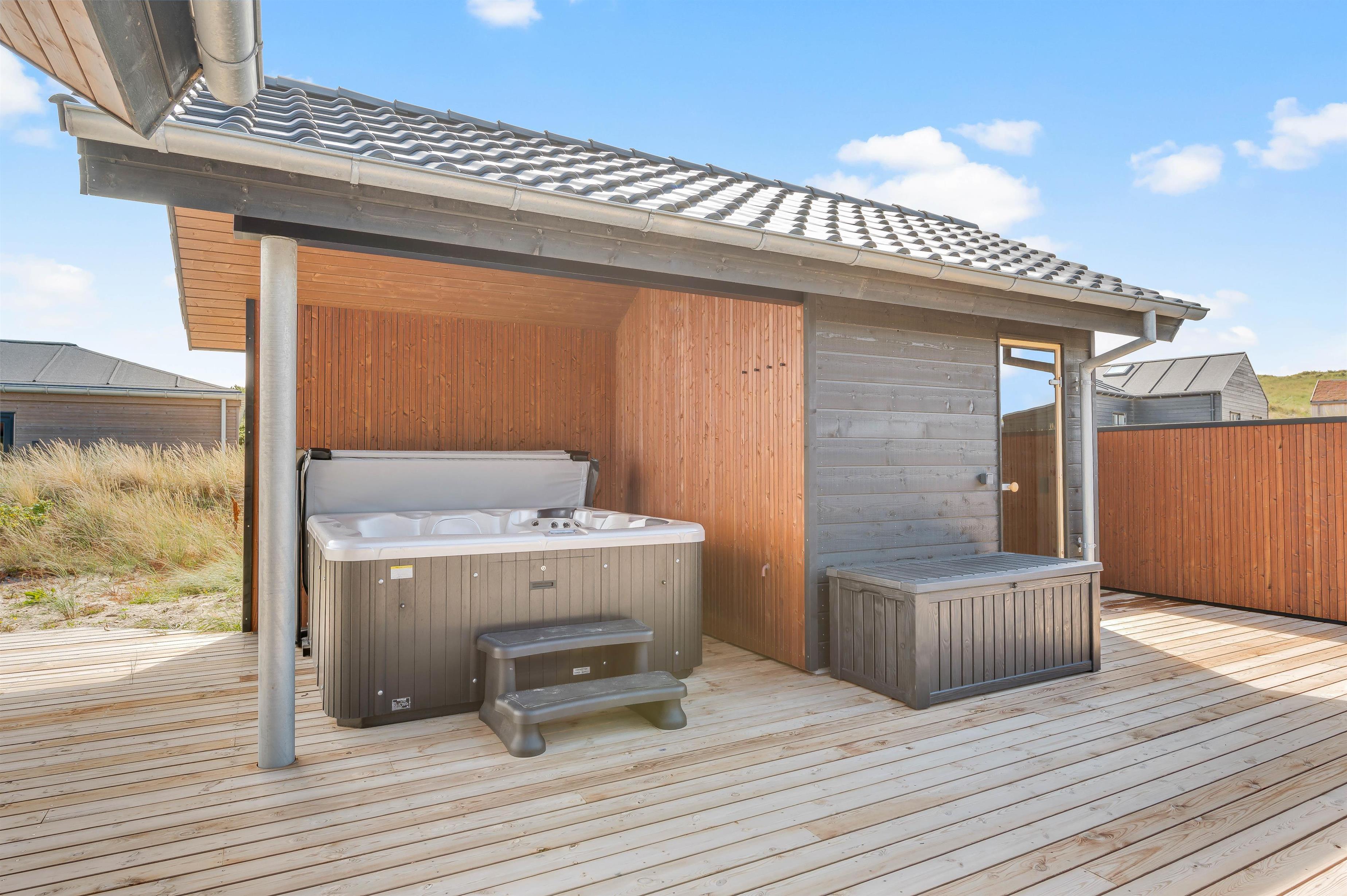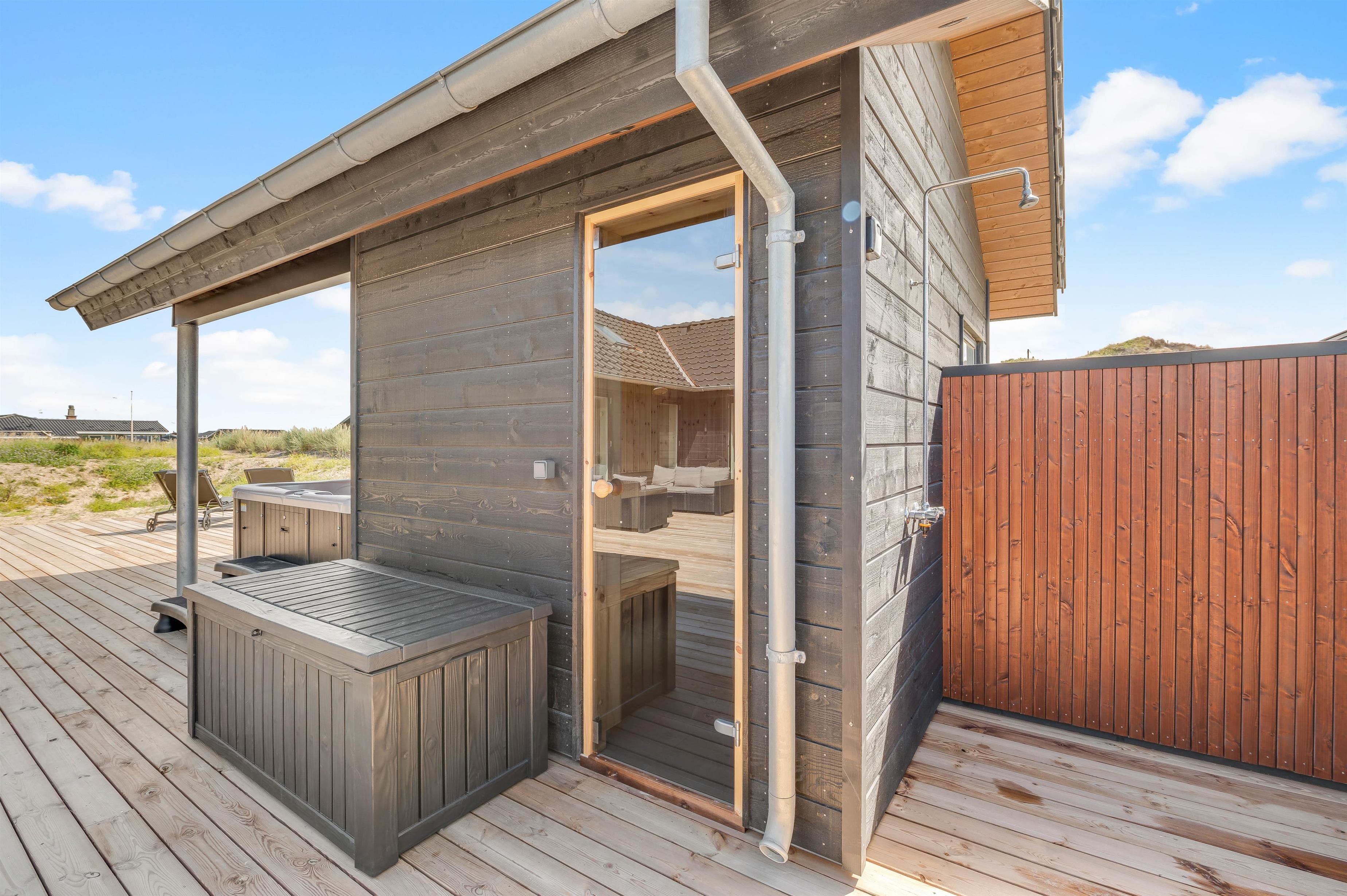 På den 1250 kvadratmeter store naturgrund på Bjerregårdsvej 389 har du god plads til aktiviteter og også til wellness og afslapning. Det udendørs wellnessområde omfatter udesauna, udespa og udendørs bruser, som giver jer en dejlig afkøling i sommerhalvåret. Her kan du virkelig lade dig forkæle. Hør lyden af ??Vesterhavet kun 200 meter væk, imens du slapper af i spaen og måske nyder et godt glas vin. Udebruseren kan benyttes fra april til november.