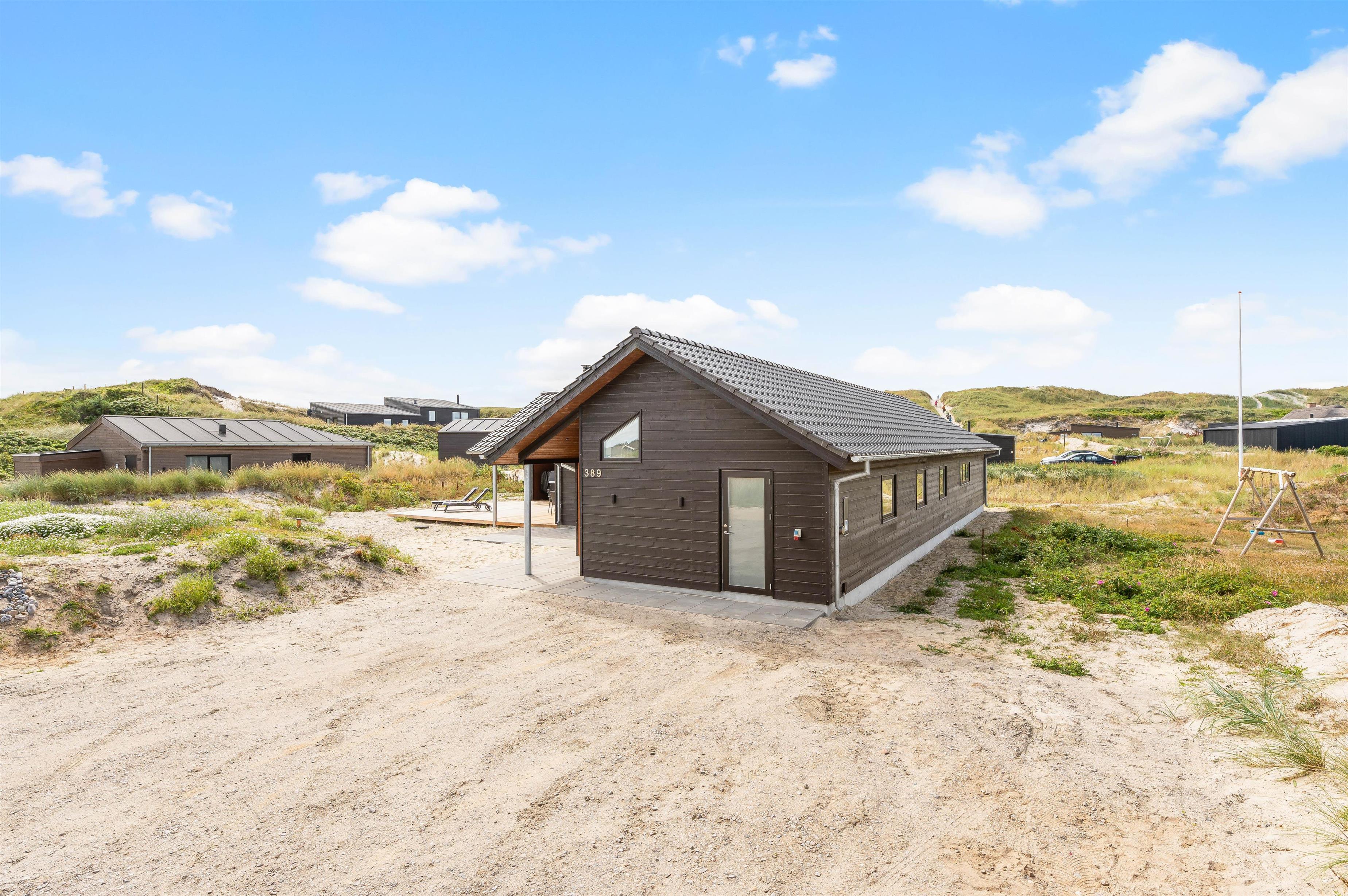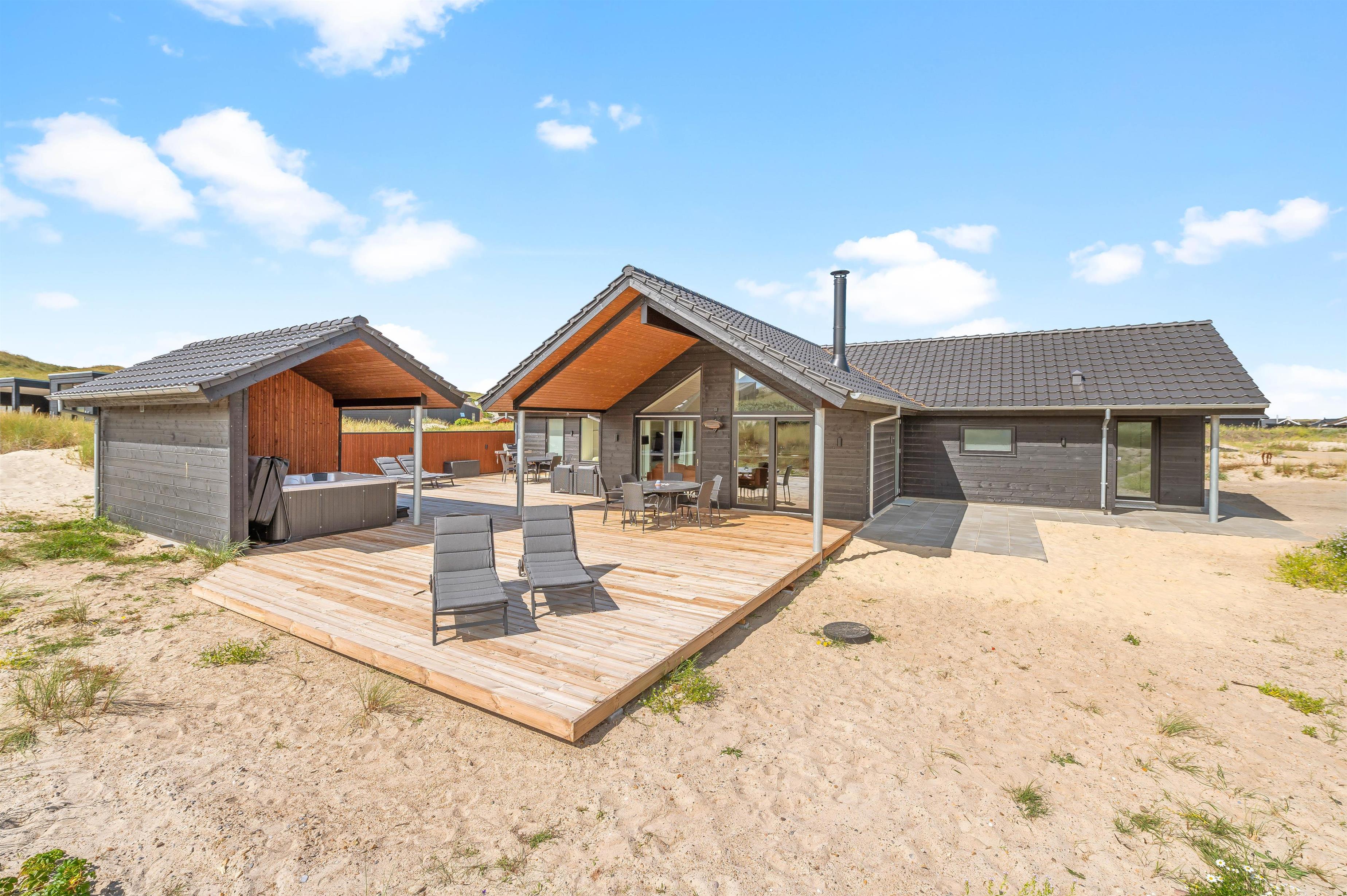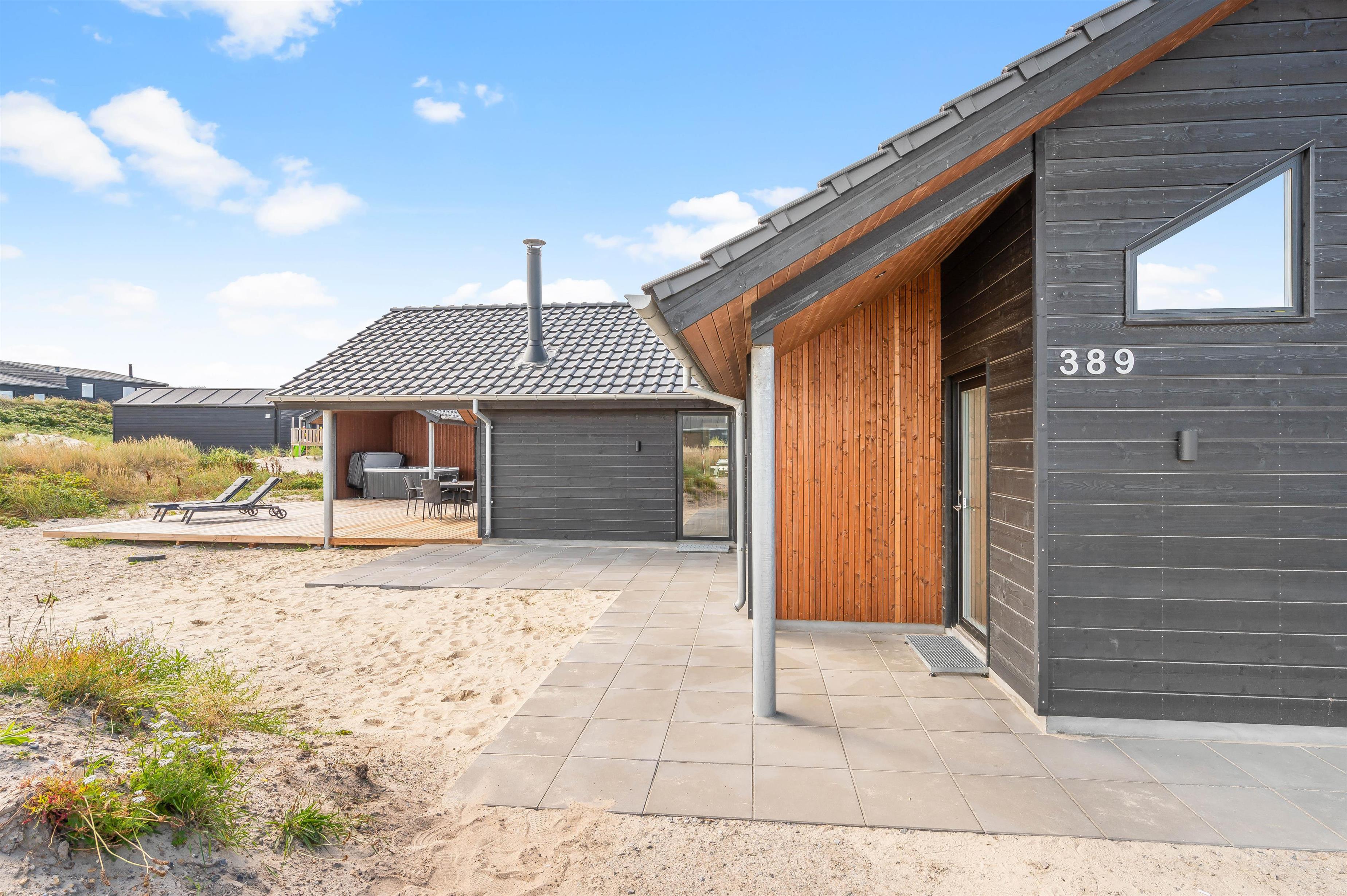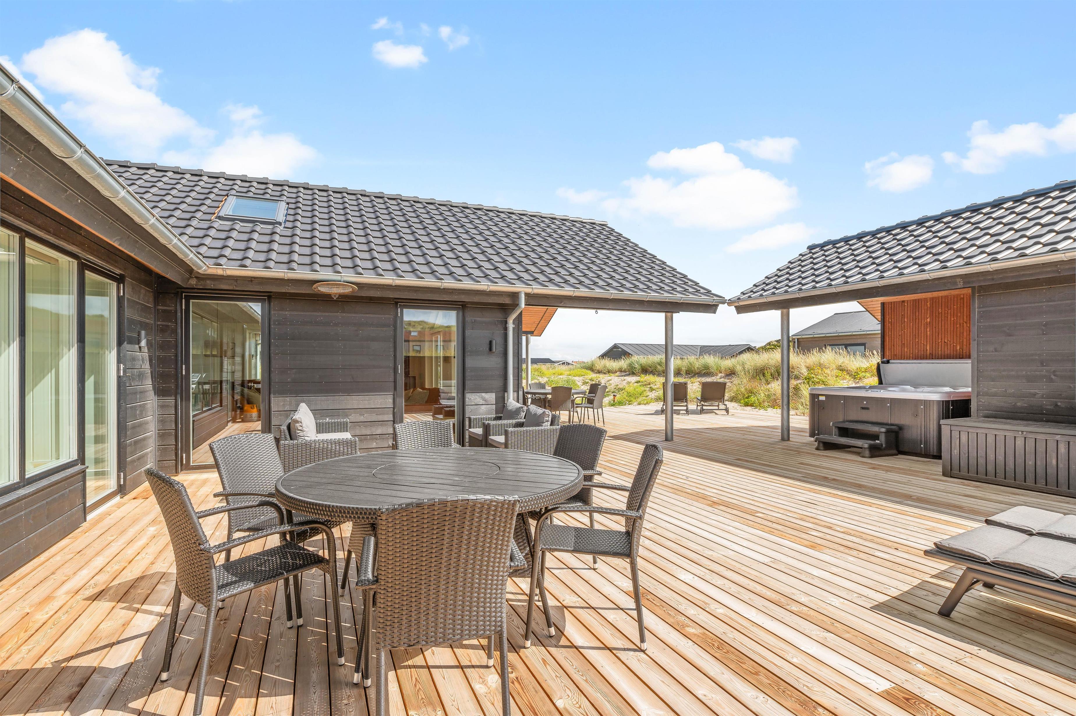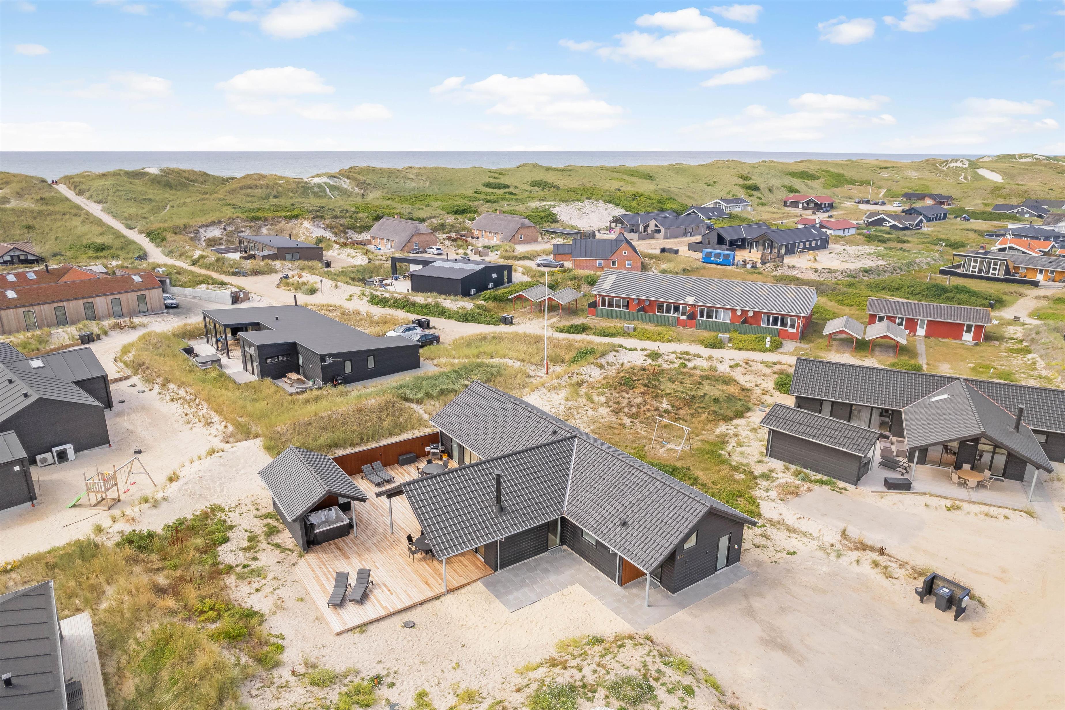 På den 1250 kvadratmeter store naturgrund på Bjerregårdsvej 389 har du god plads til aktiviteter og også til wellness og afslapning. Det udendørs wellnessområde omfatter udesauna, udespa og udendørs bruser, som giver jer en dejlig afkøling i sommerhalvåret. Her kan du virkelig lade dig forkæle. Hør lyden af ??Vesterhavet kun 200 meter væk, imens du slapper af i spaen og måske nyder et godt glas vin. Udebruseren kan benyttes fra april til november.