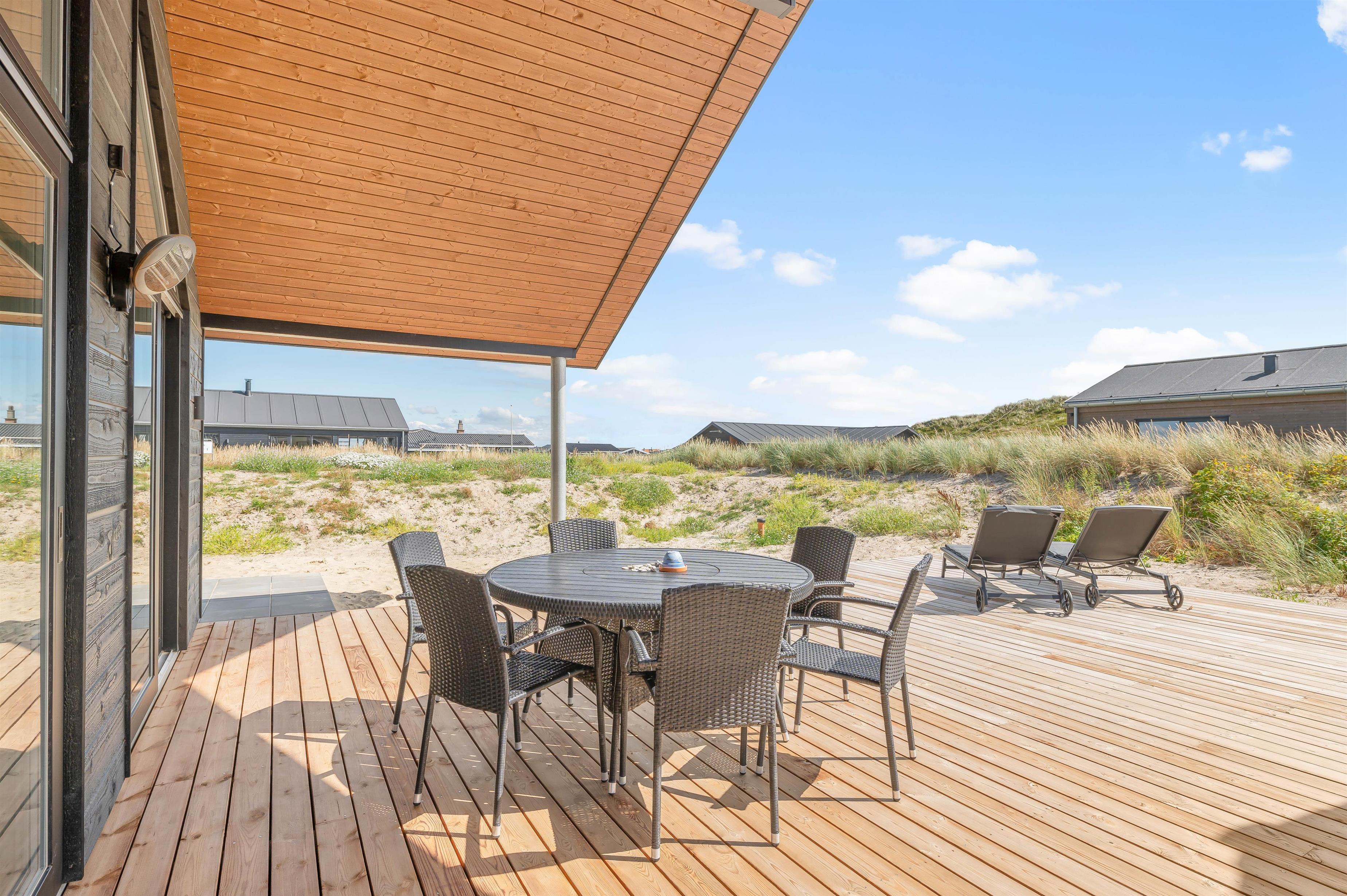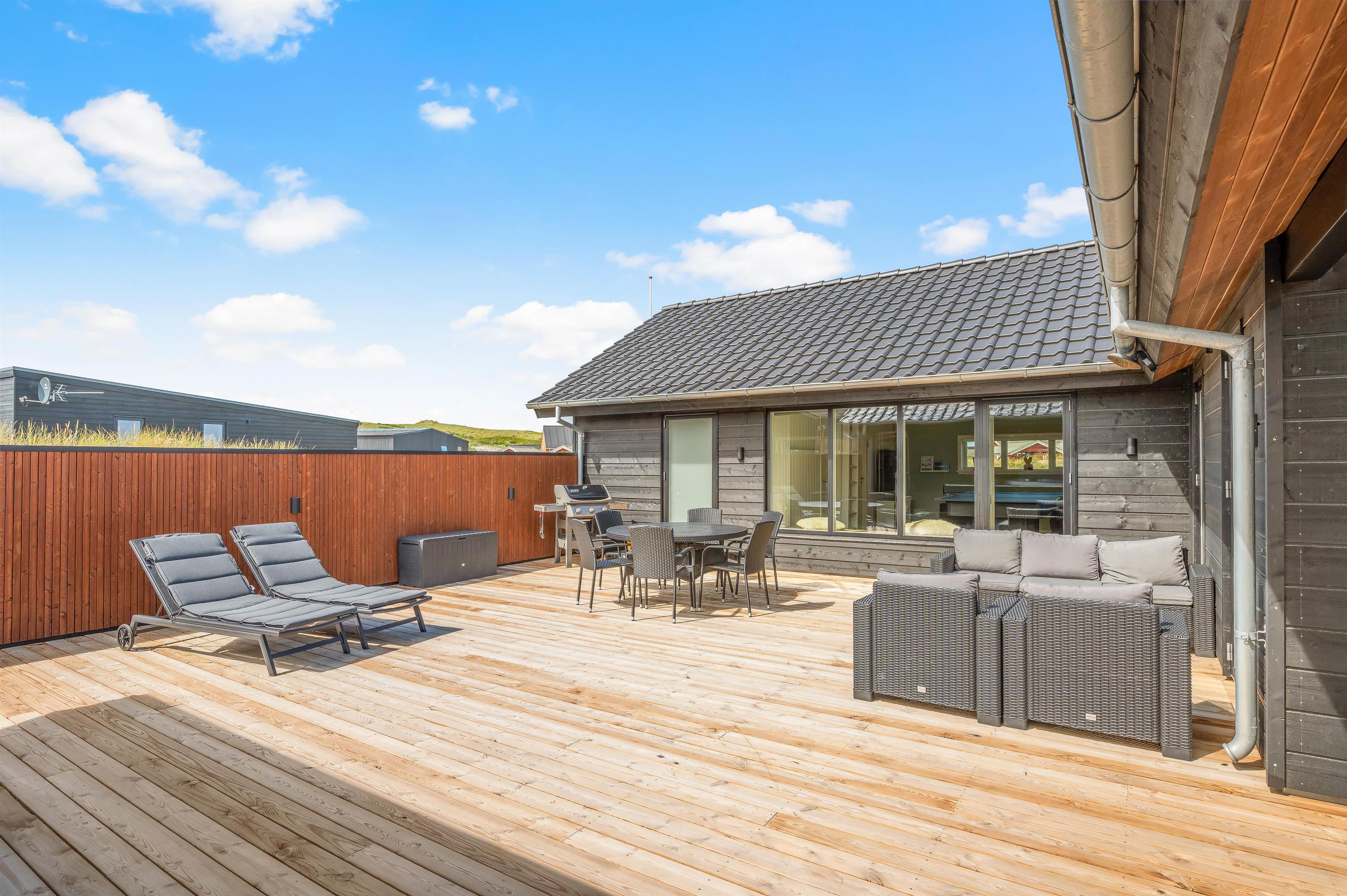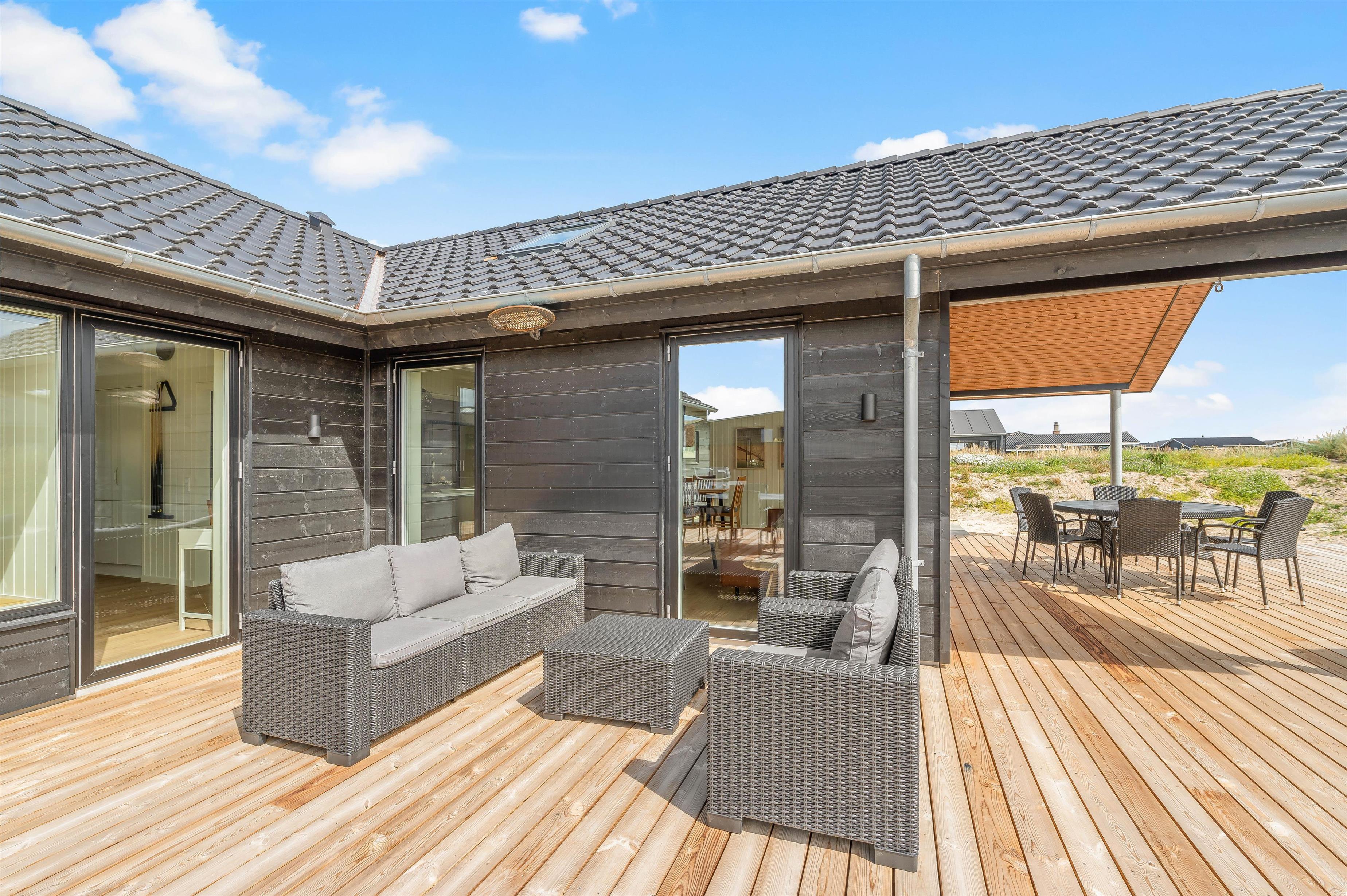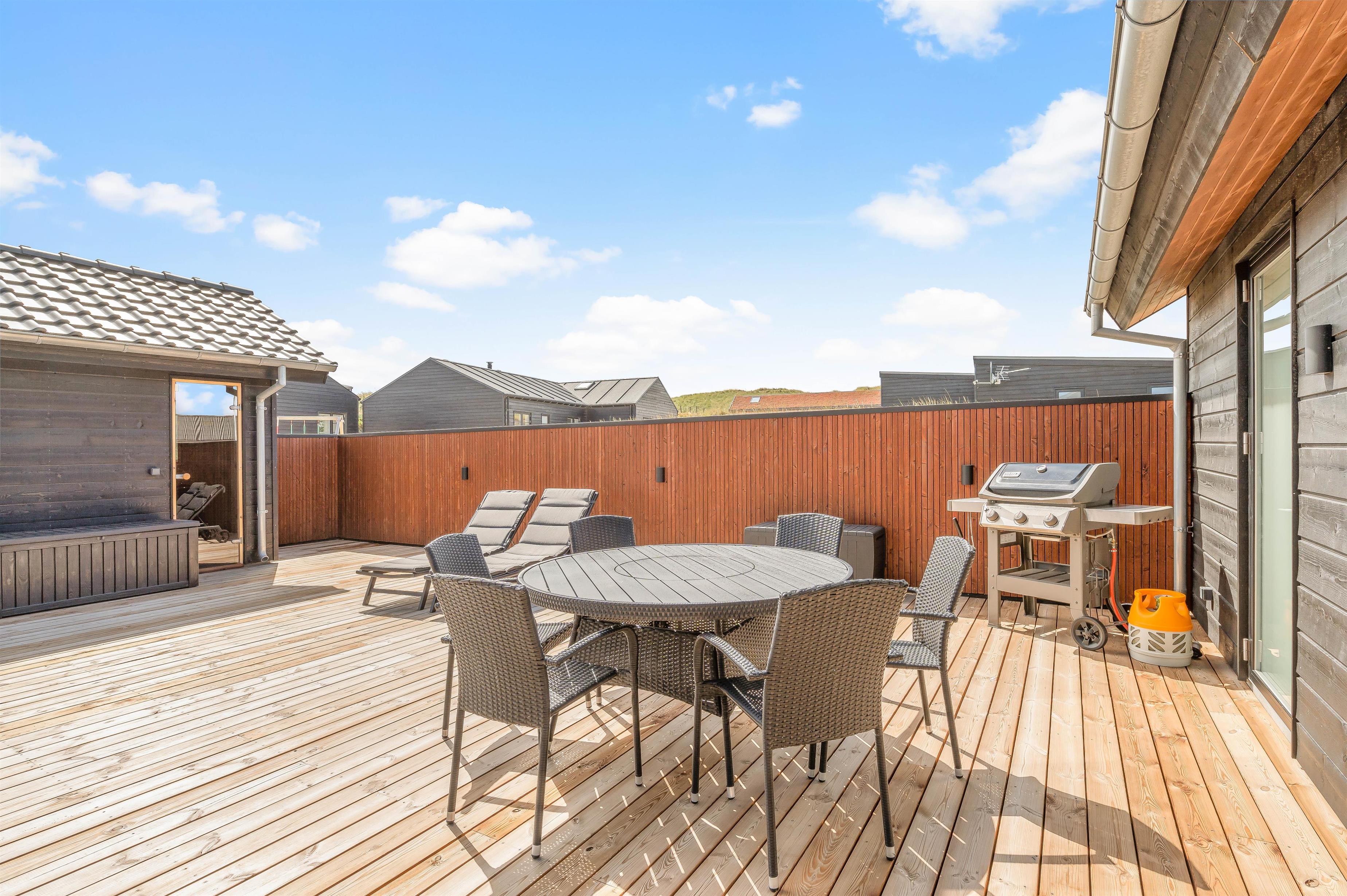 Gasgrillen af ??høj kvalitet er ideel til en hyggelig grillaften. På den åbne terrasse kan du slappe af i de komfortable havemøbler og læse en god bog. Selv i blæst eller regn er du beskyttet på den overdækkede terrasse og kan nyde naturen og den friske luft. Når temperaturen begynder at falde på en lun sommeraften kan I tænde for terrassevarmeren, så I kan blive siddende længere uden at fryse. På morgenterrassen på feriehusets østside finder du en dejlig plet til indtagelse af morgenmad eller brunch på en solskinsdag.