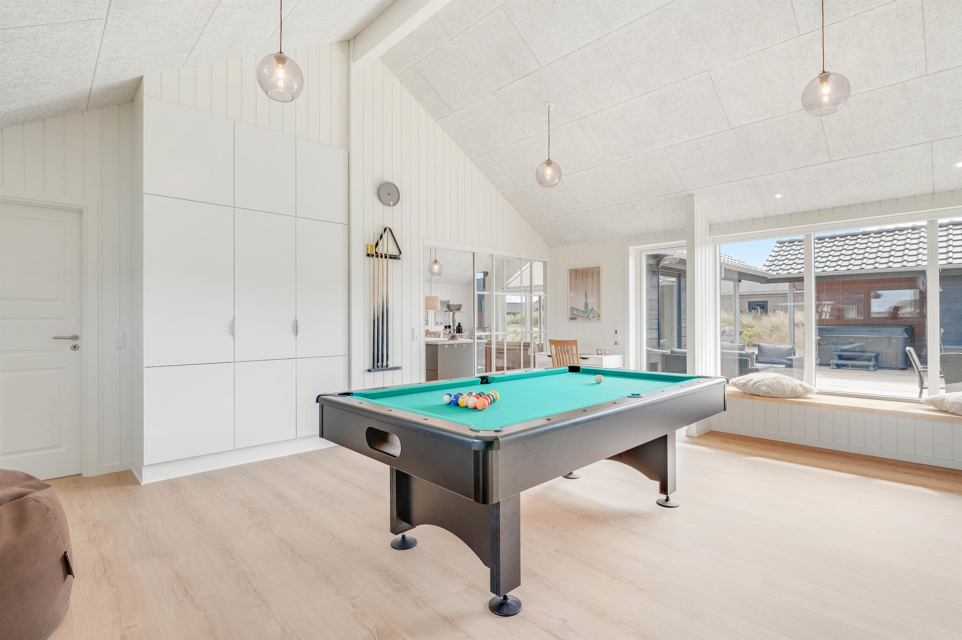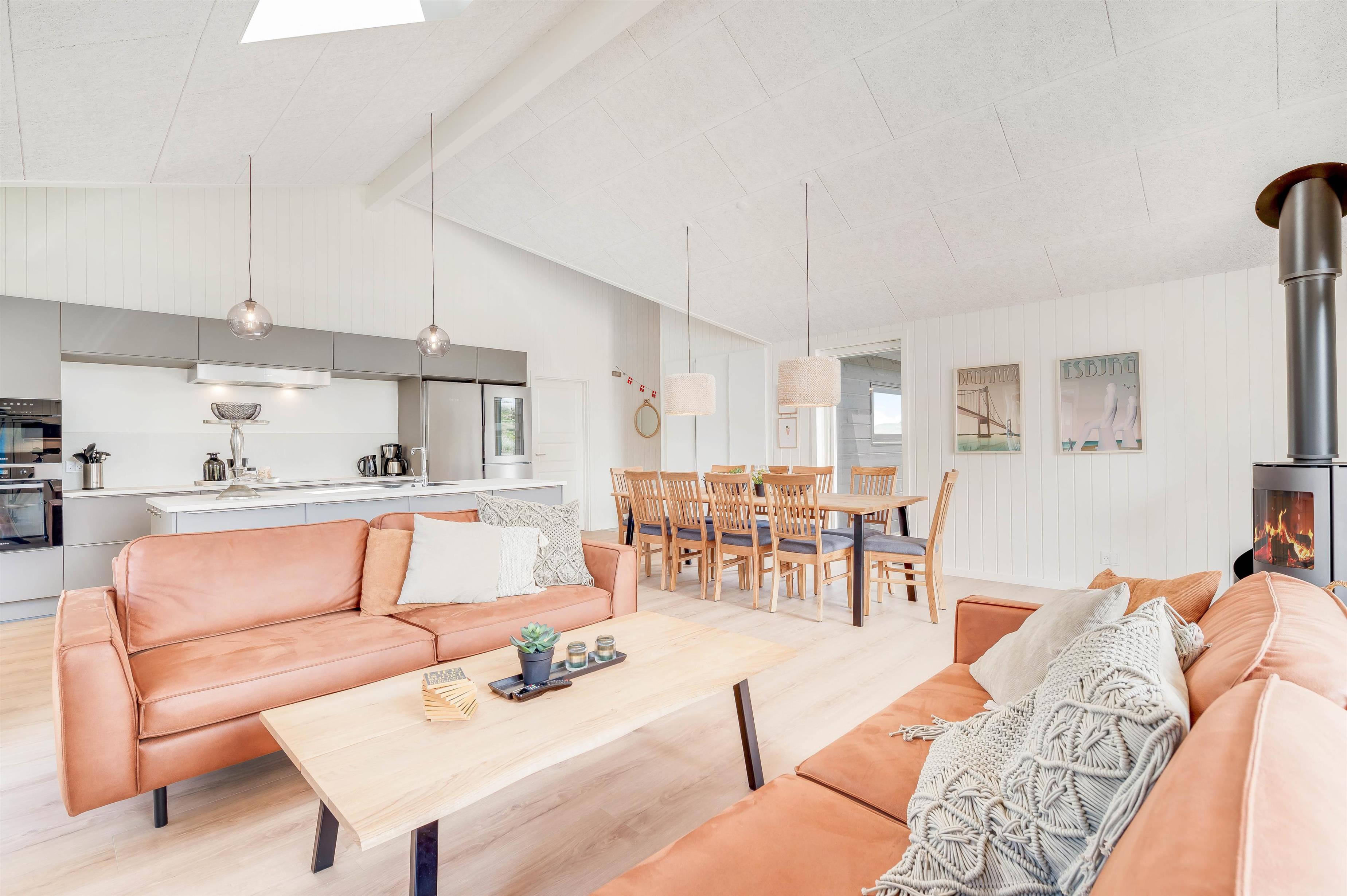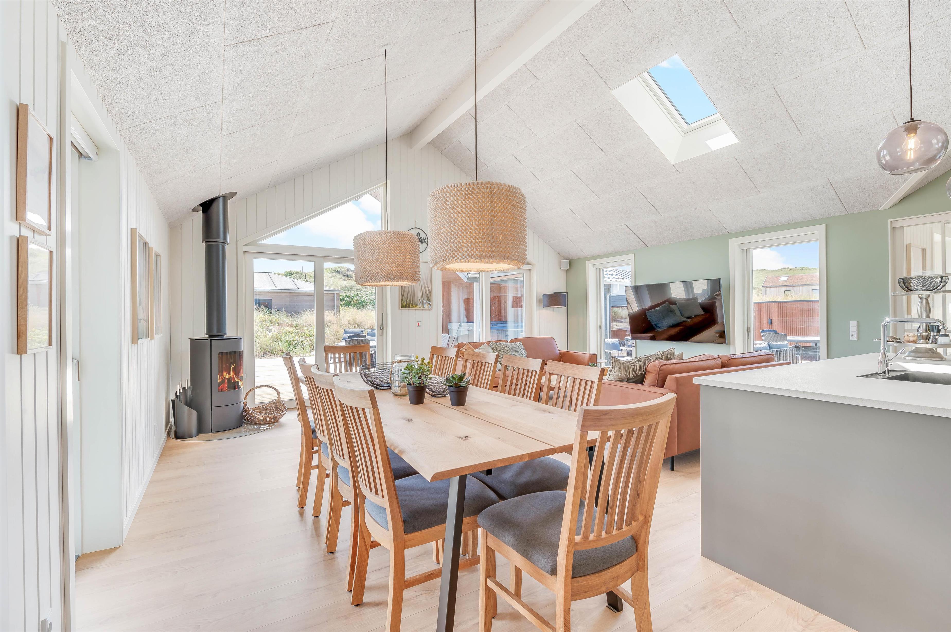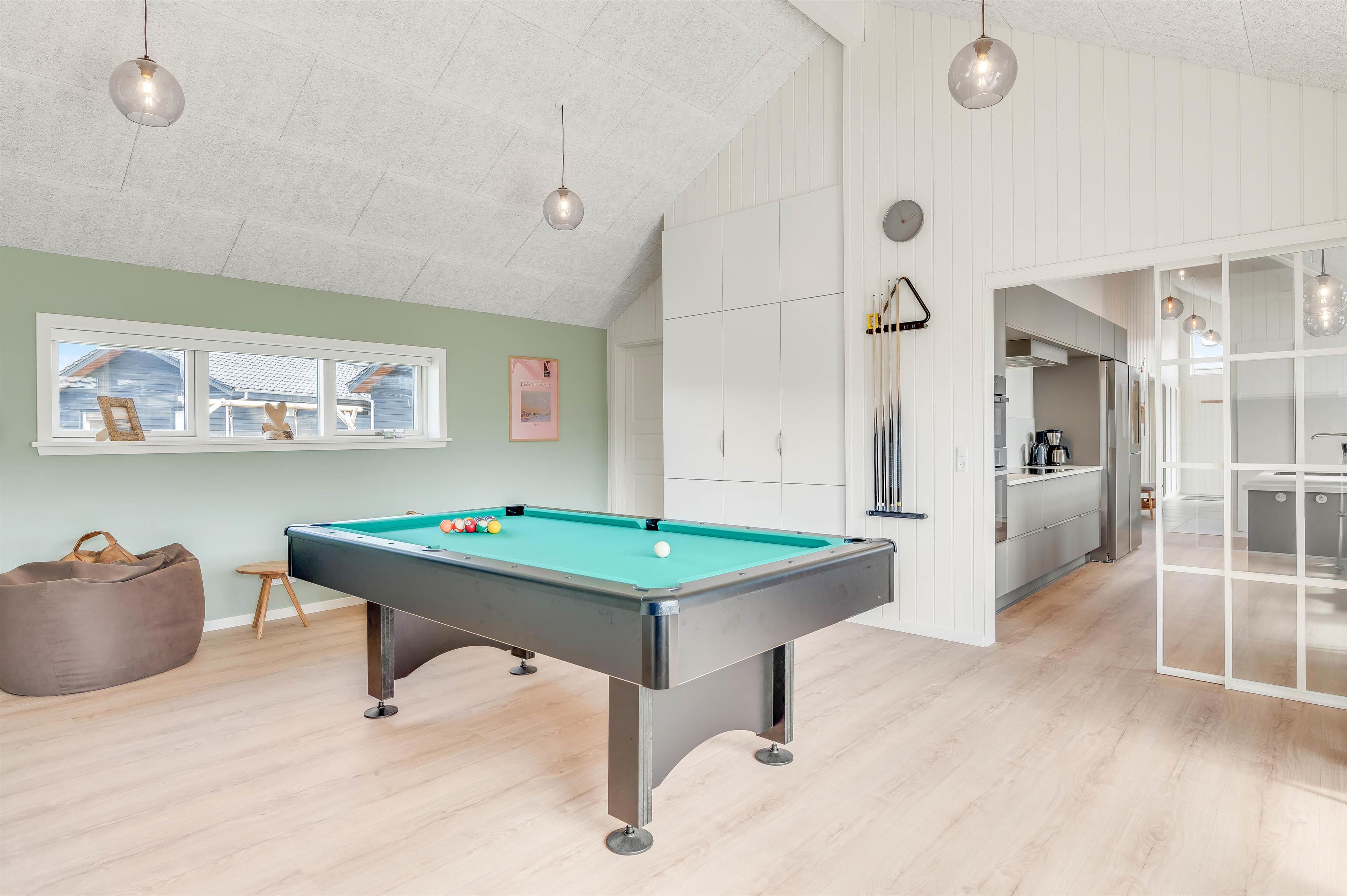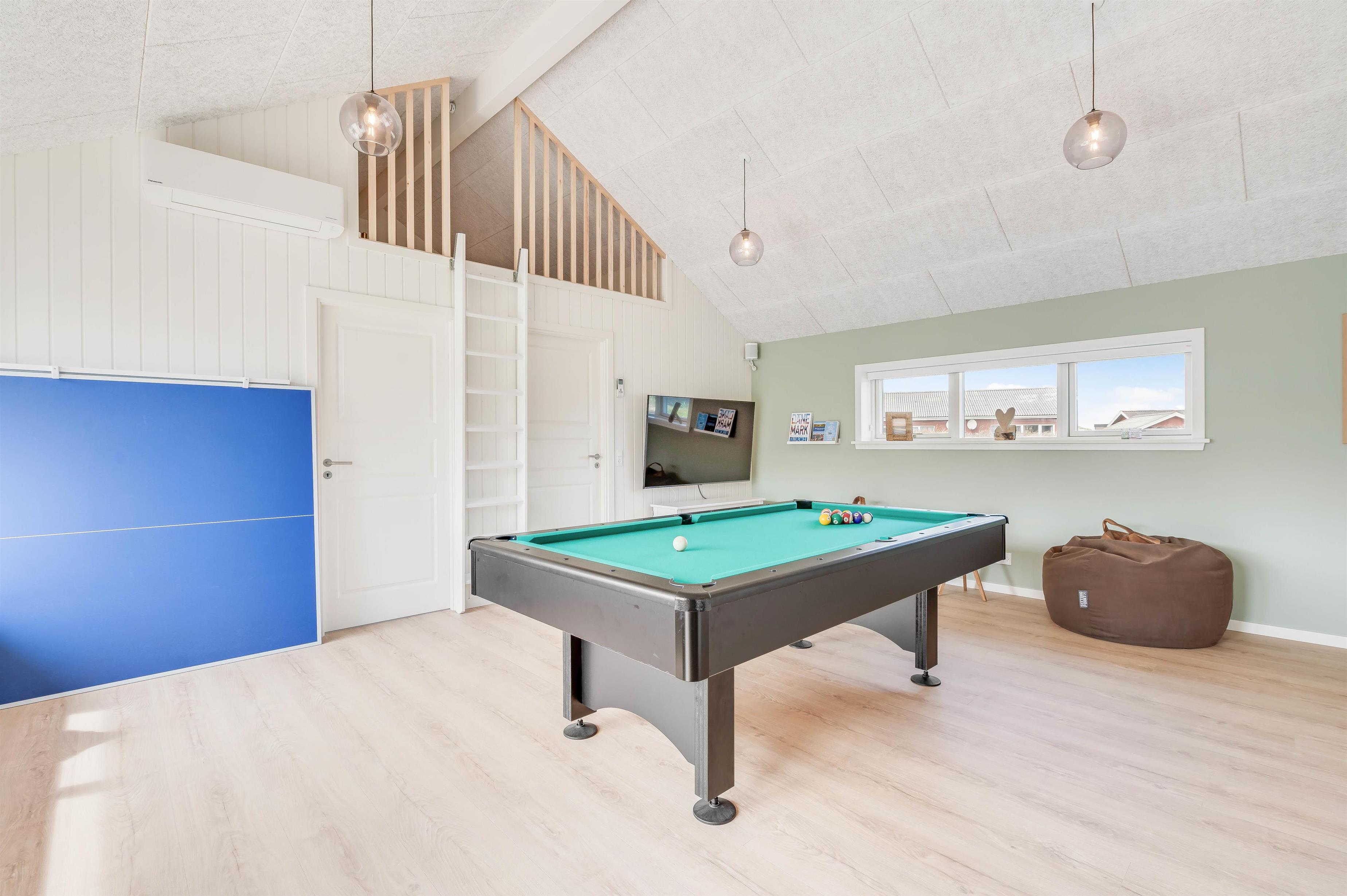 Op til 10 personer og to hunde kan føle sig velkommen i dette luksuriøst indrettede feriehus. Den rummelige og indbydende indrettede opholdsstue byder på masser af plads til familie og venner. Nyd en hyggelig aften med et godt glas vin foran brændeovnen eller organisér en tv-aften sammen. Aktivitetsrummet er ideelt til en lang aften med playstation-4, spil, pool eller bordtennis. Der er tysk og dansk tv.