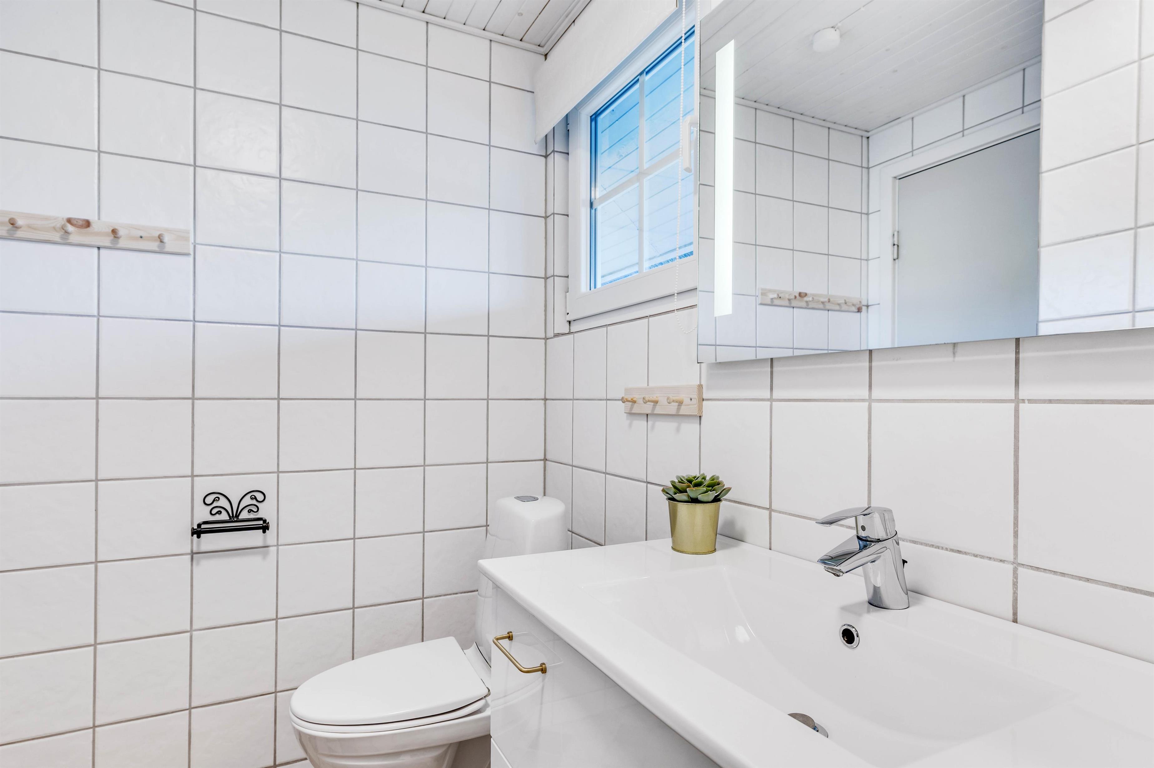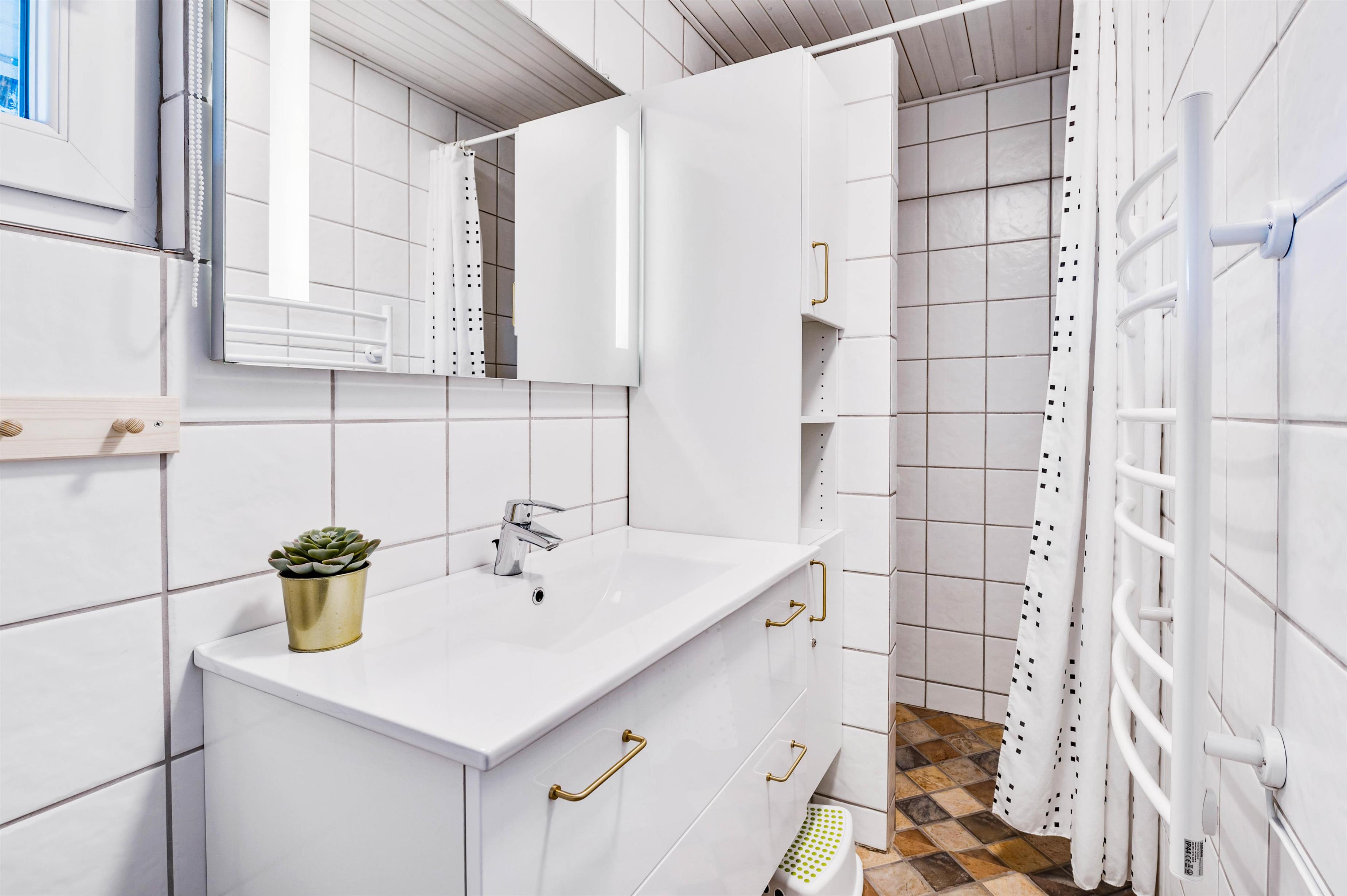 Badeværelset er lyst og praktisk indrettet med fliser fra gulv til loft. En energibesparende varmepumpe sørger, sammen med brændeovnen, for at holde energiforbruget på passende niveau.