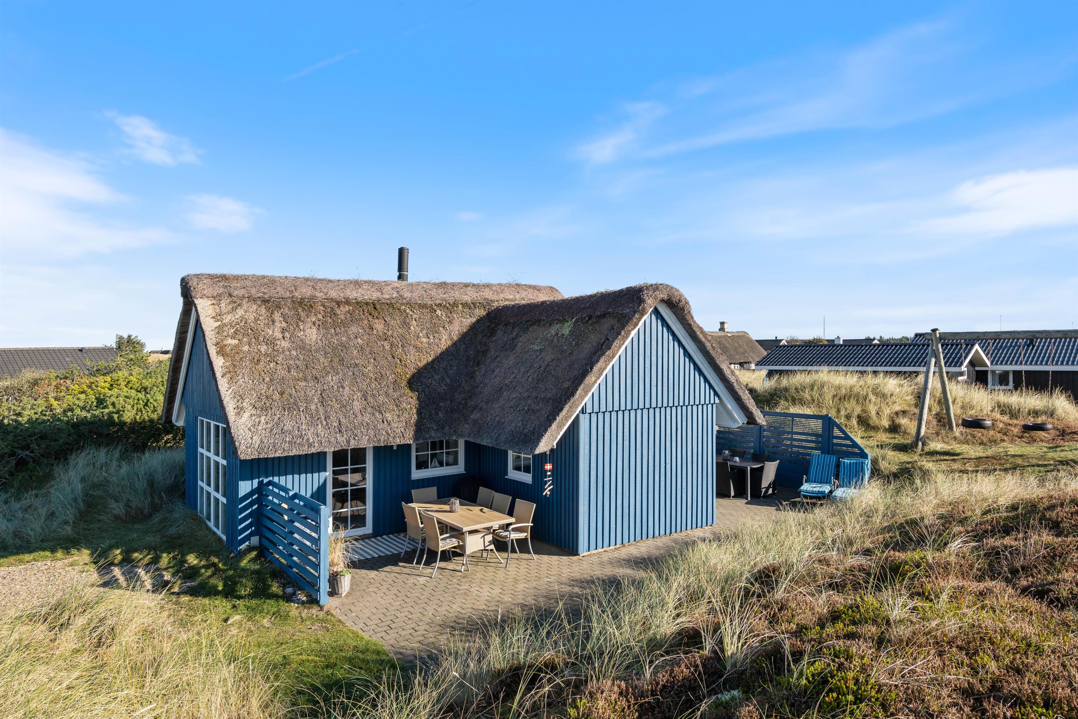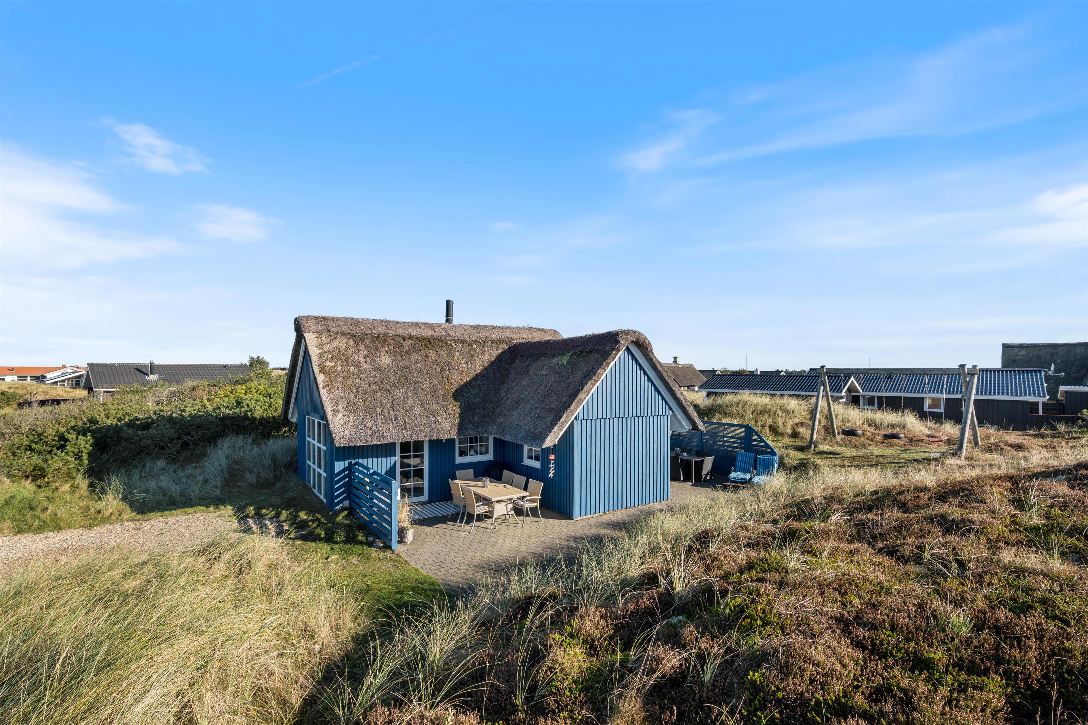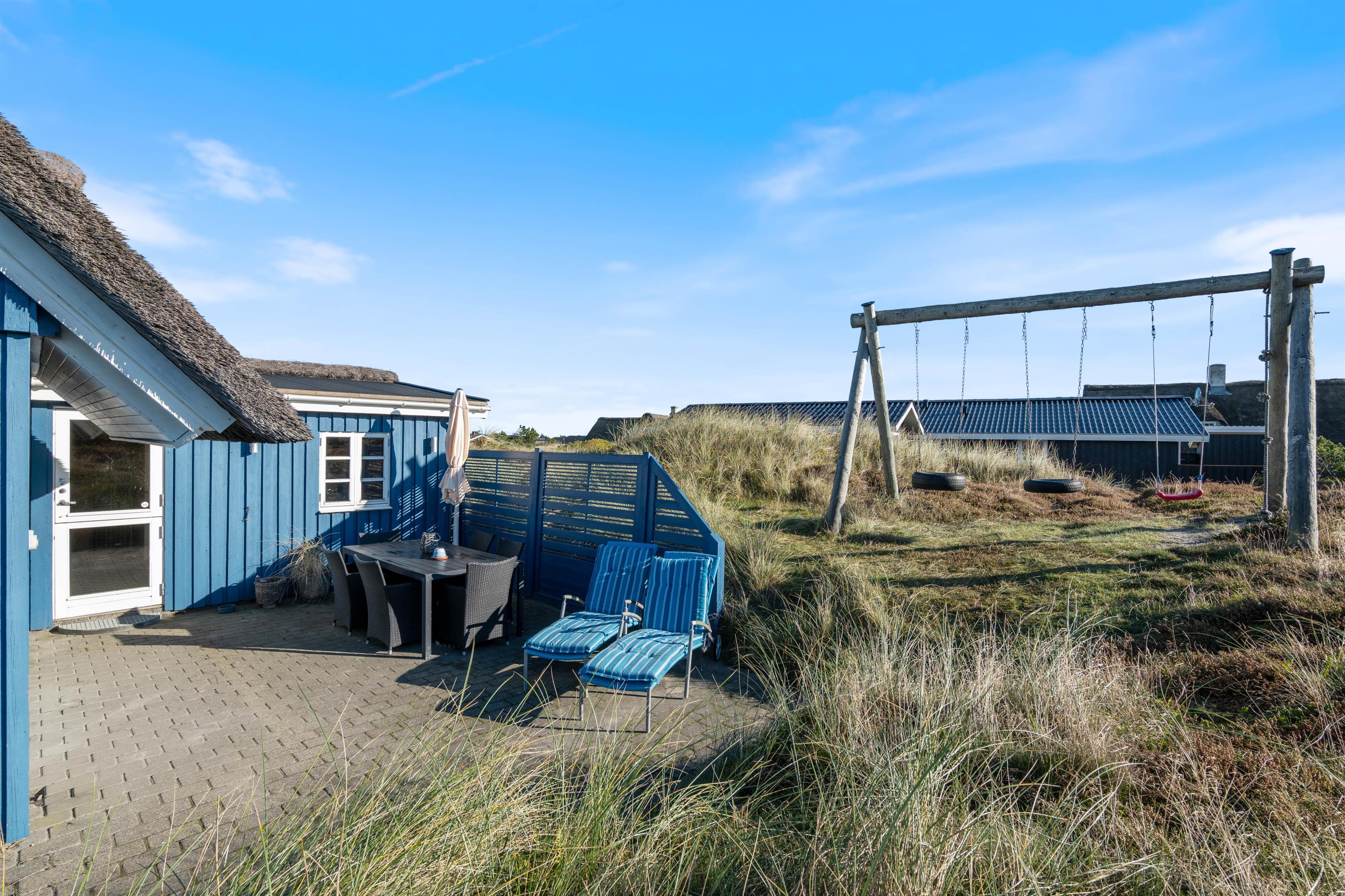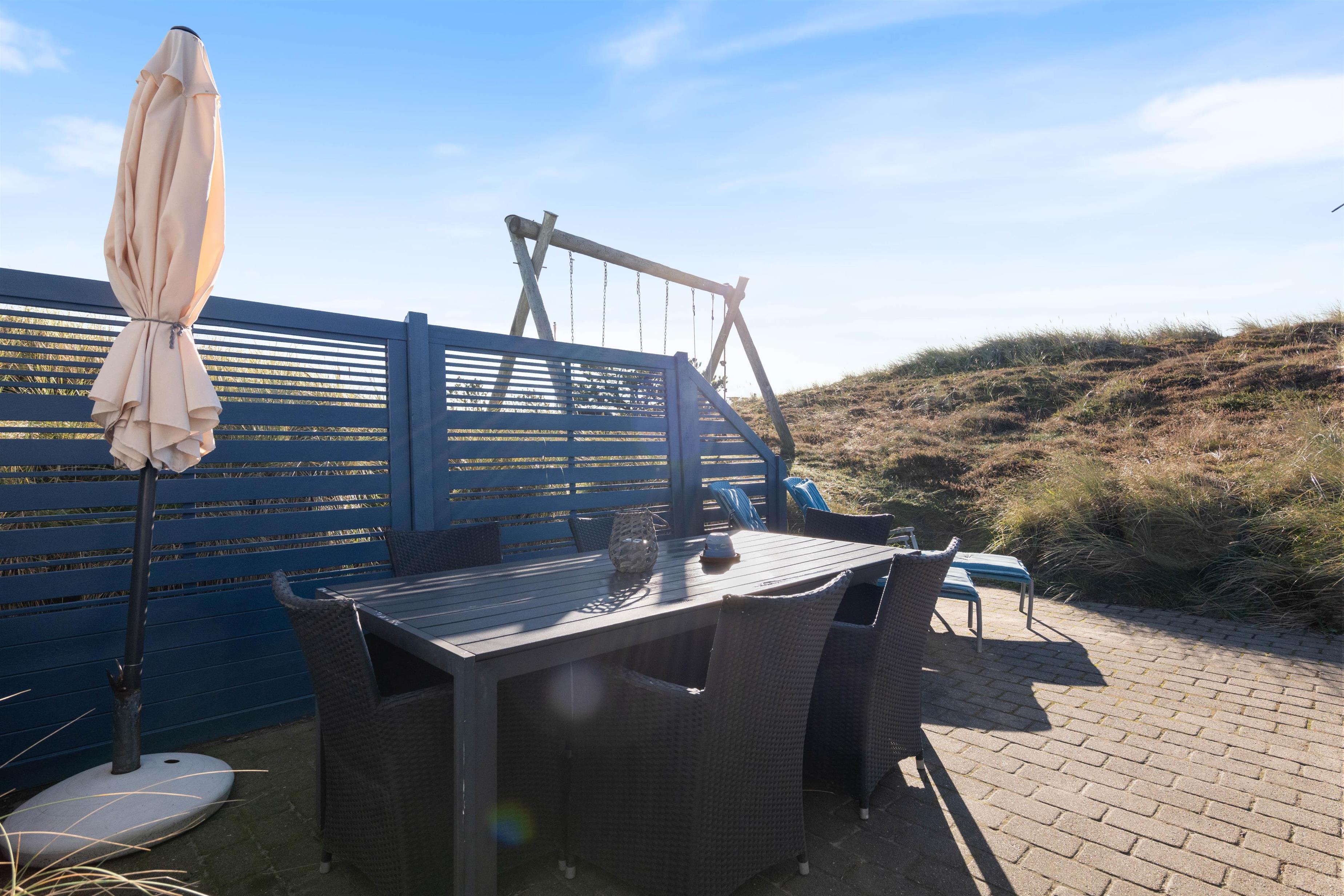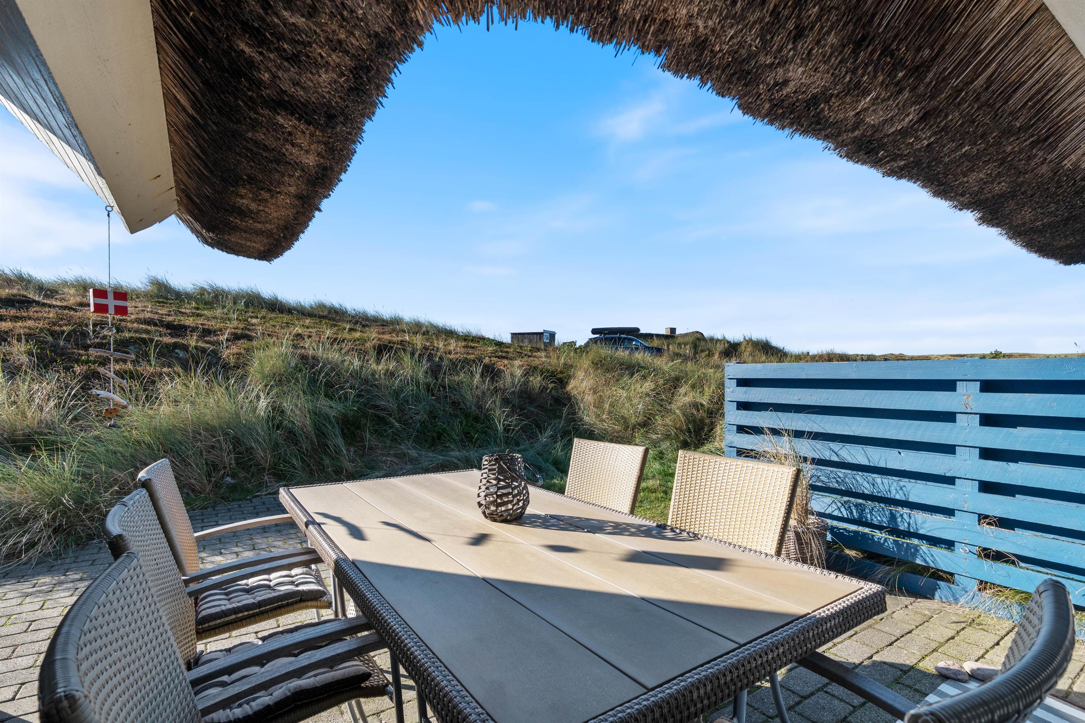 Nyd aftensolen og solnedgangen over klitterne fra terrassen, alt imens I nyder en veltilberedt grill-middag og et godt glas vin på terrassen. Her er masser af frisk luft, og hele tiden kan I høre havets brusen og dufte den salte havduft.