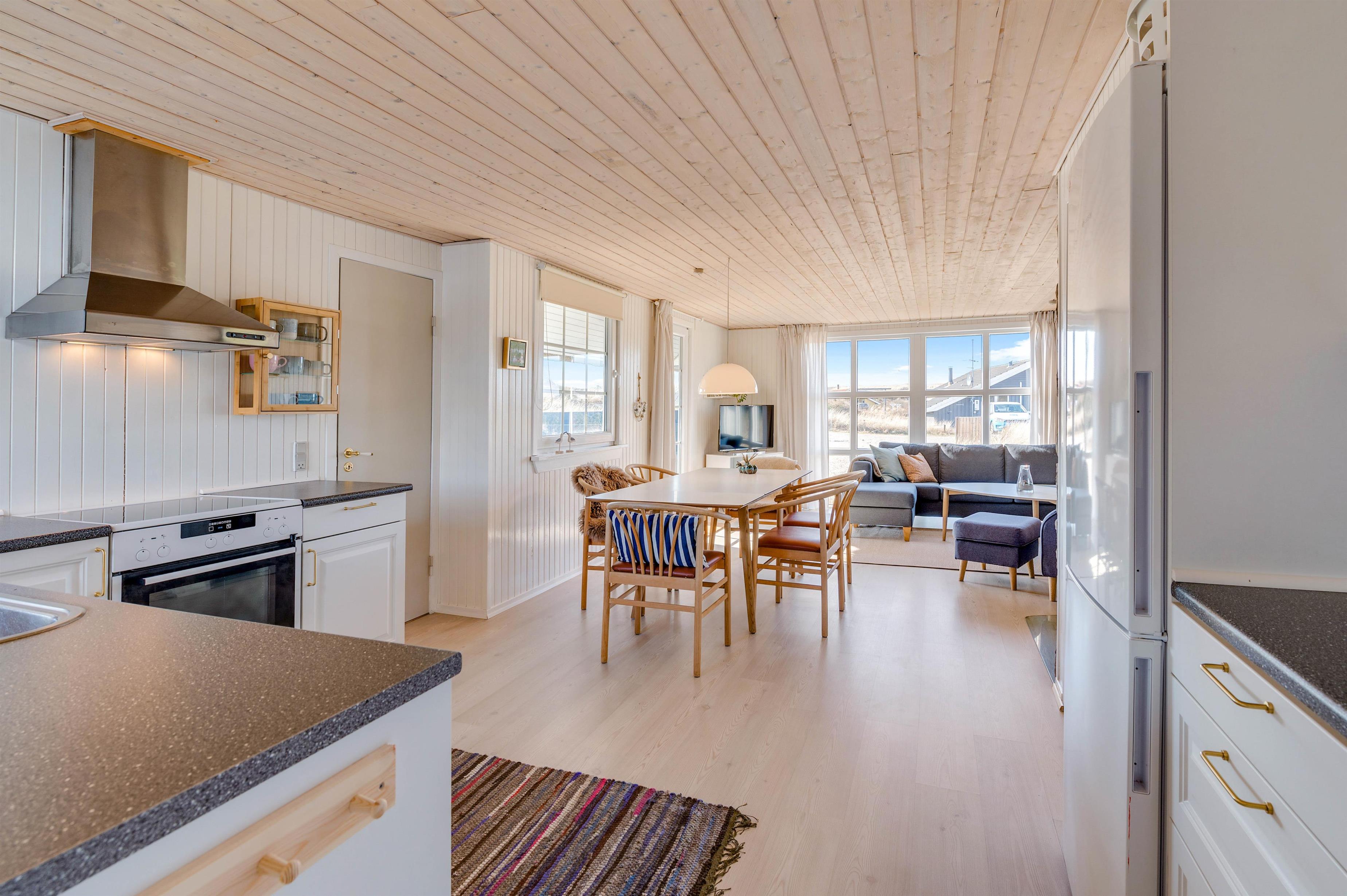 Sommerhusets hjerte er det store opholdsrum-spisestue med et velindrettet køkken-hjørne. Her finder du bl.a. 90 L fryser, mikroovn og opvaskemaskine, som alt sammen gør det nemt at stå for madlavningen.