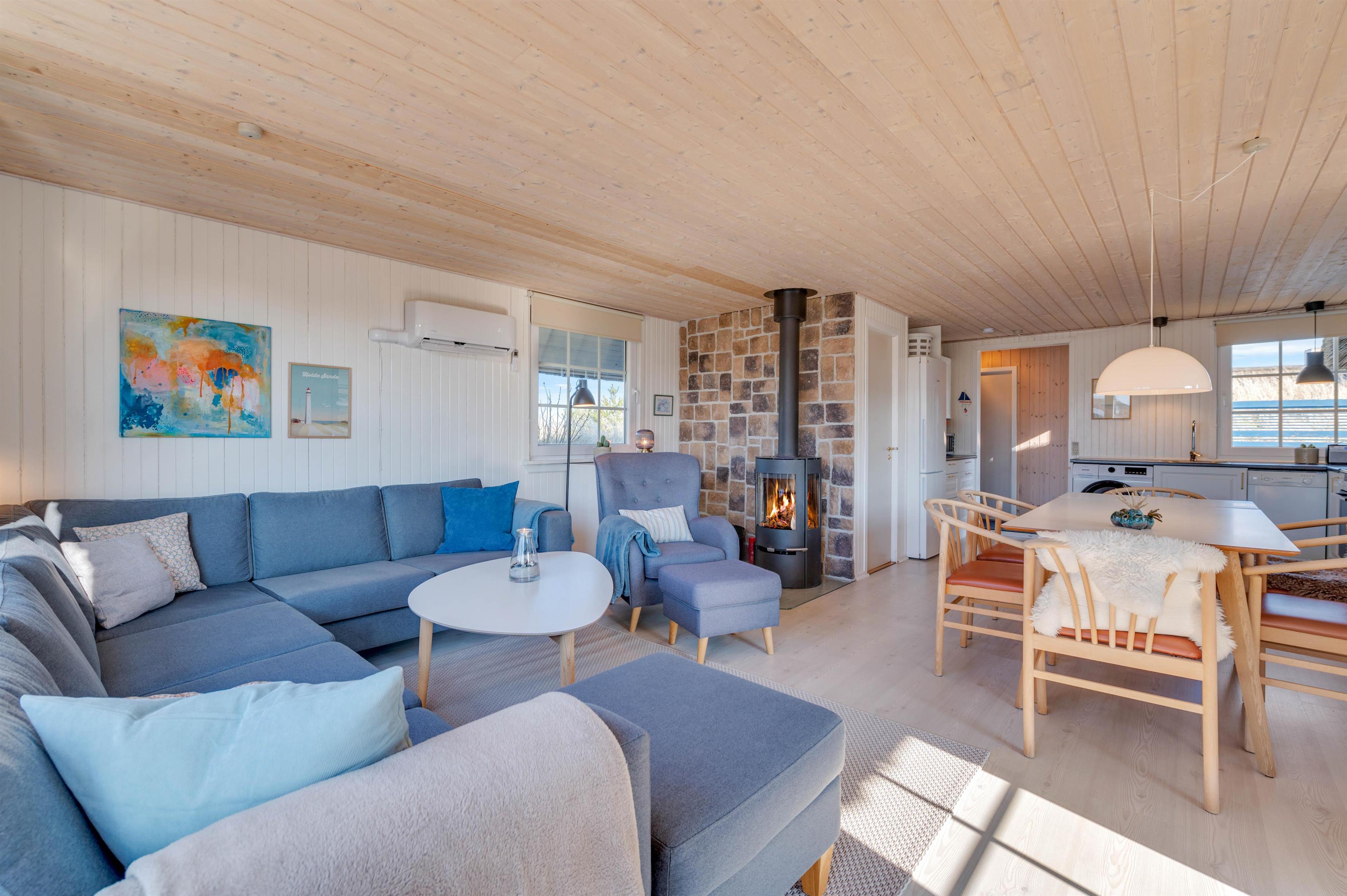 Stuen indbyder til dejligt afslappende samvær og en måske en afslappende stund med en god kop kaffe foran brændeovnen på de lidt koldere dage. Igennem de store vinduespartier har I en storslået udsigt udover det fascinerende klit-landskab. Her kan I også på de køligere dage nyde naturen.