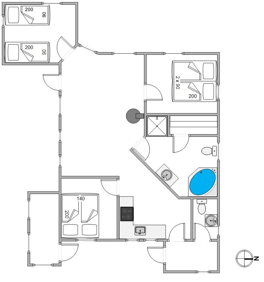 I alt er der 3 soverum: 2 med dobbeltsenge og ét med 2 enkeltsenge. Derudover gør vaskemaskine og tørretumbler det nemt at klare ferietøjet, uanset hvordan vejret arter sig.