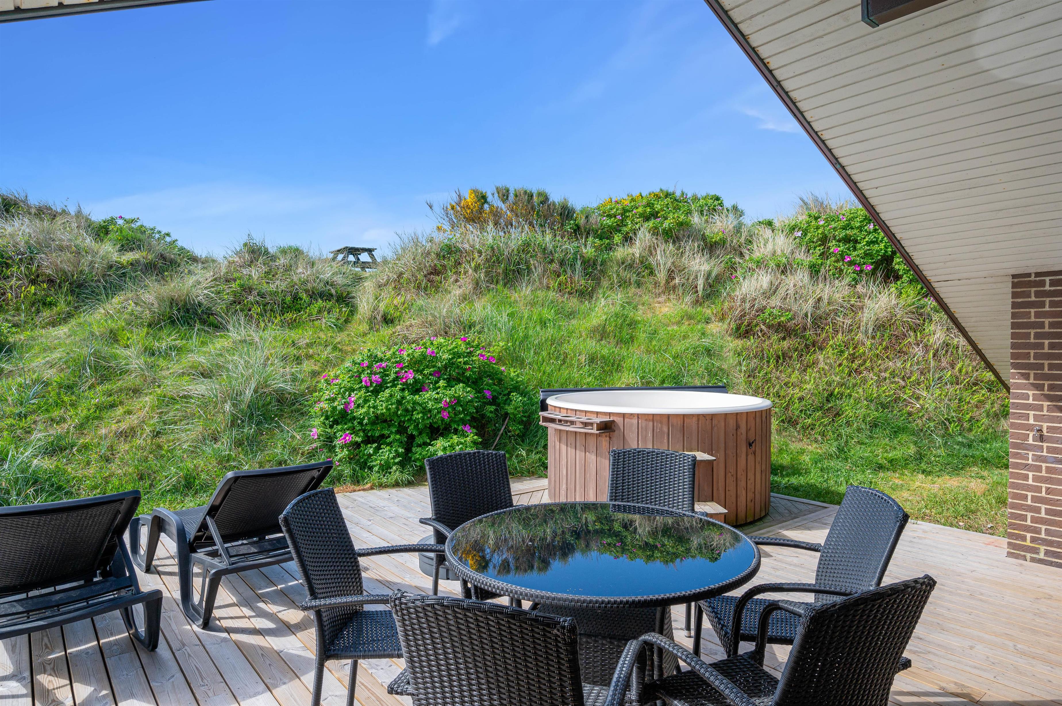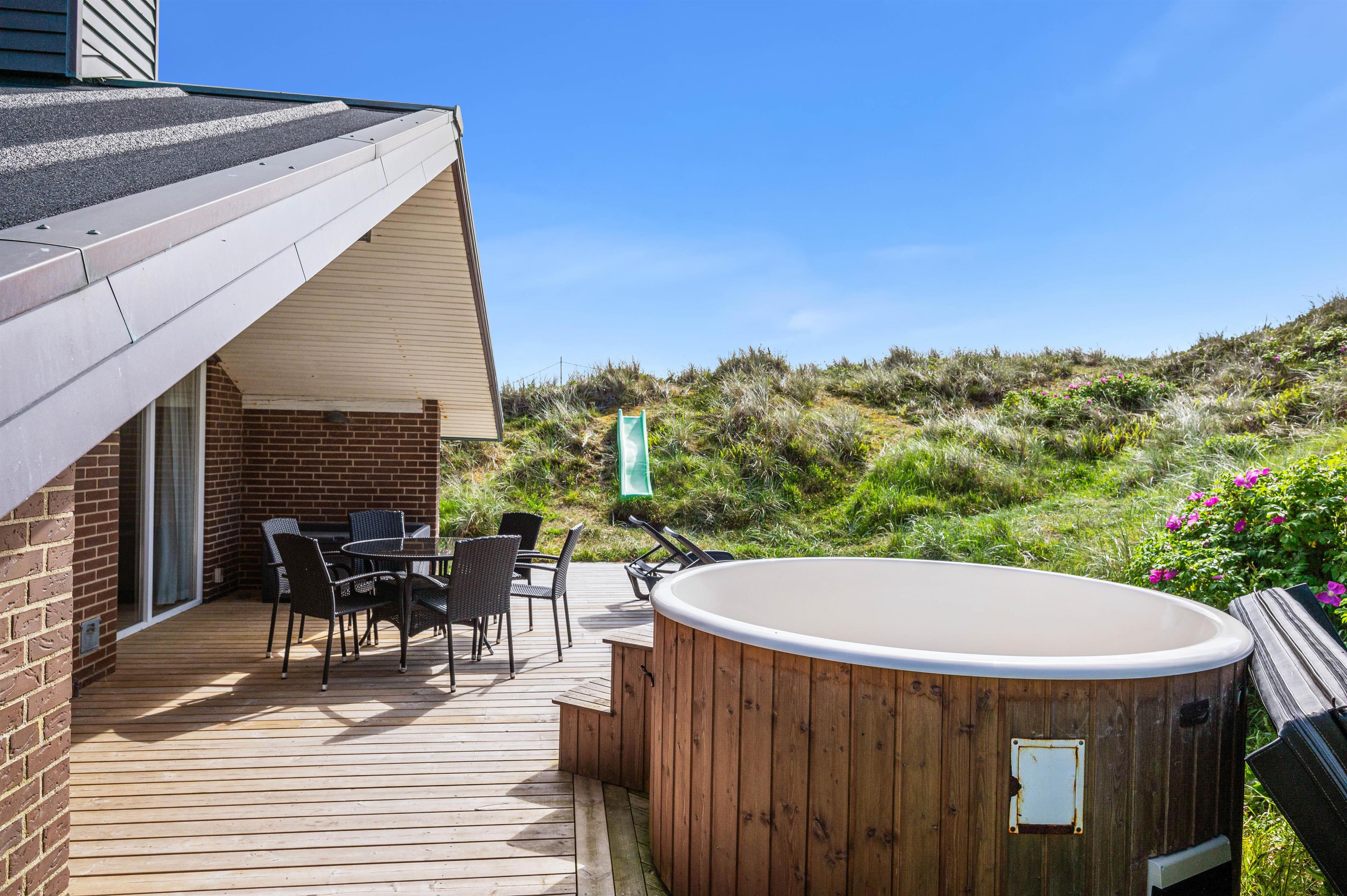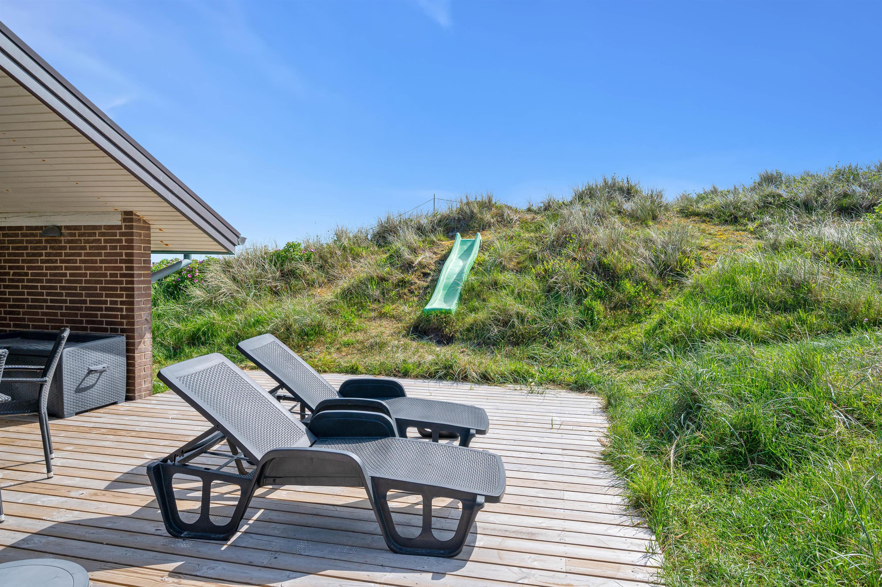 Beliggenheden på en kuperet klitgrund giver en fantastisk udsigt og vesterhavsfornemmelse ved ophold på terrassen. Naturgrunden er yderligere udnyttet med bord-bænkesæt på toppen af klitten, og en rutchebane til de små børn.