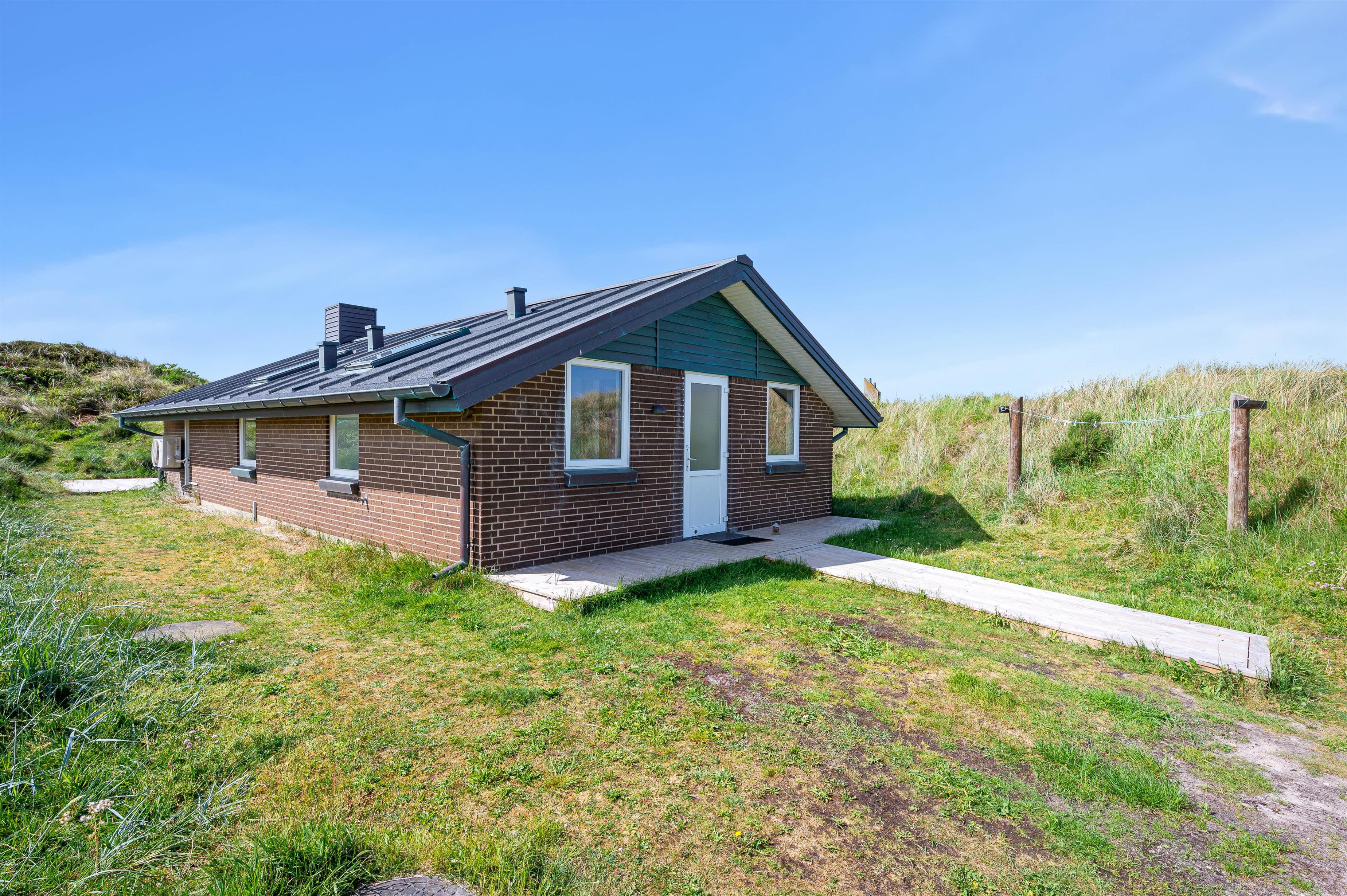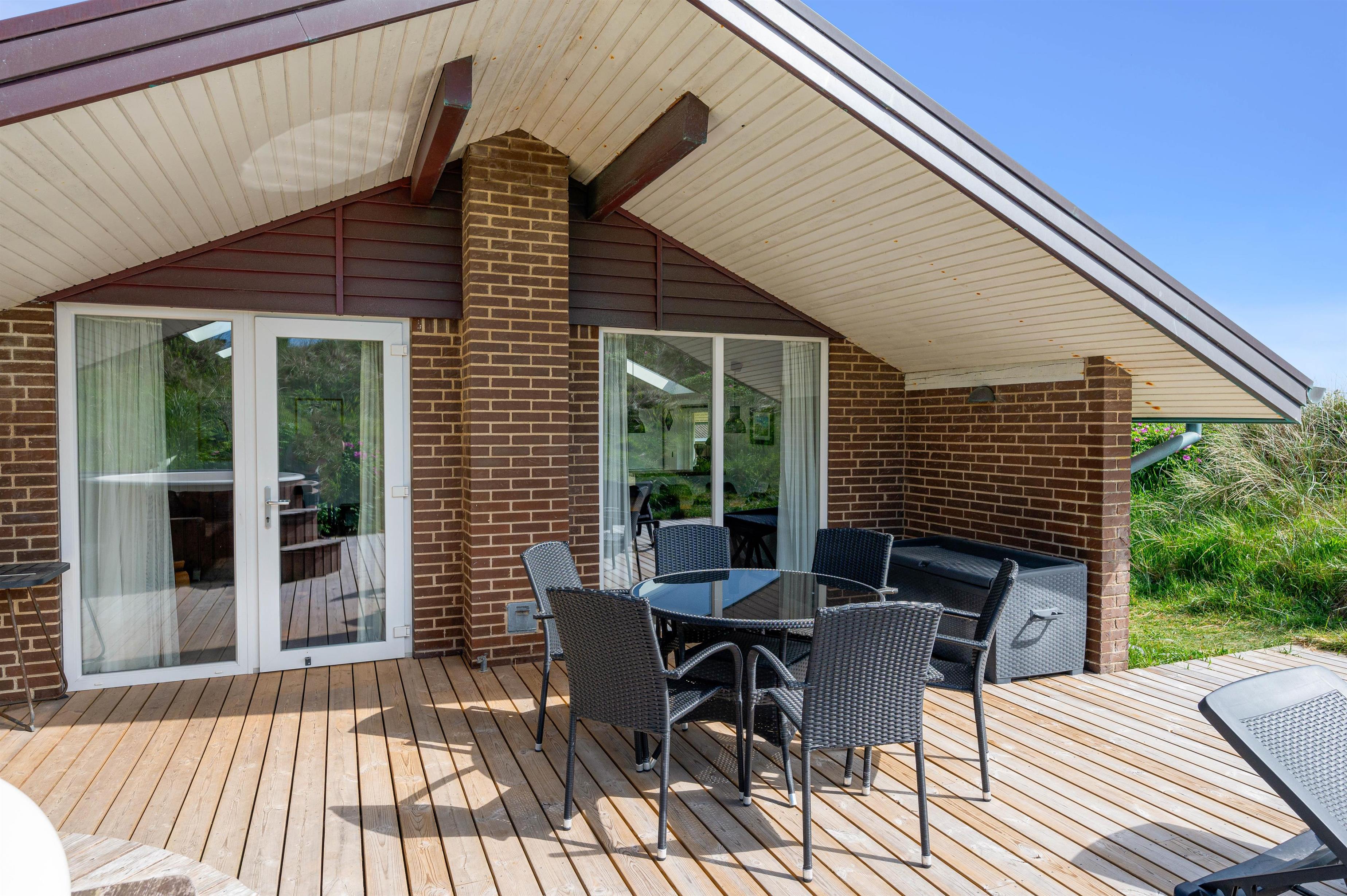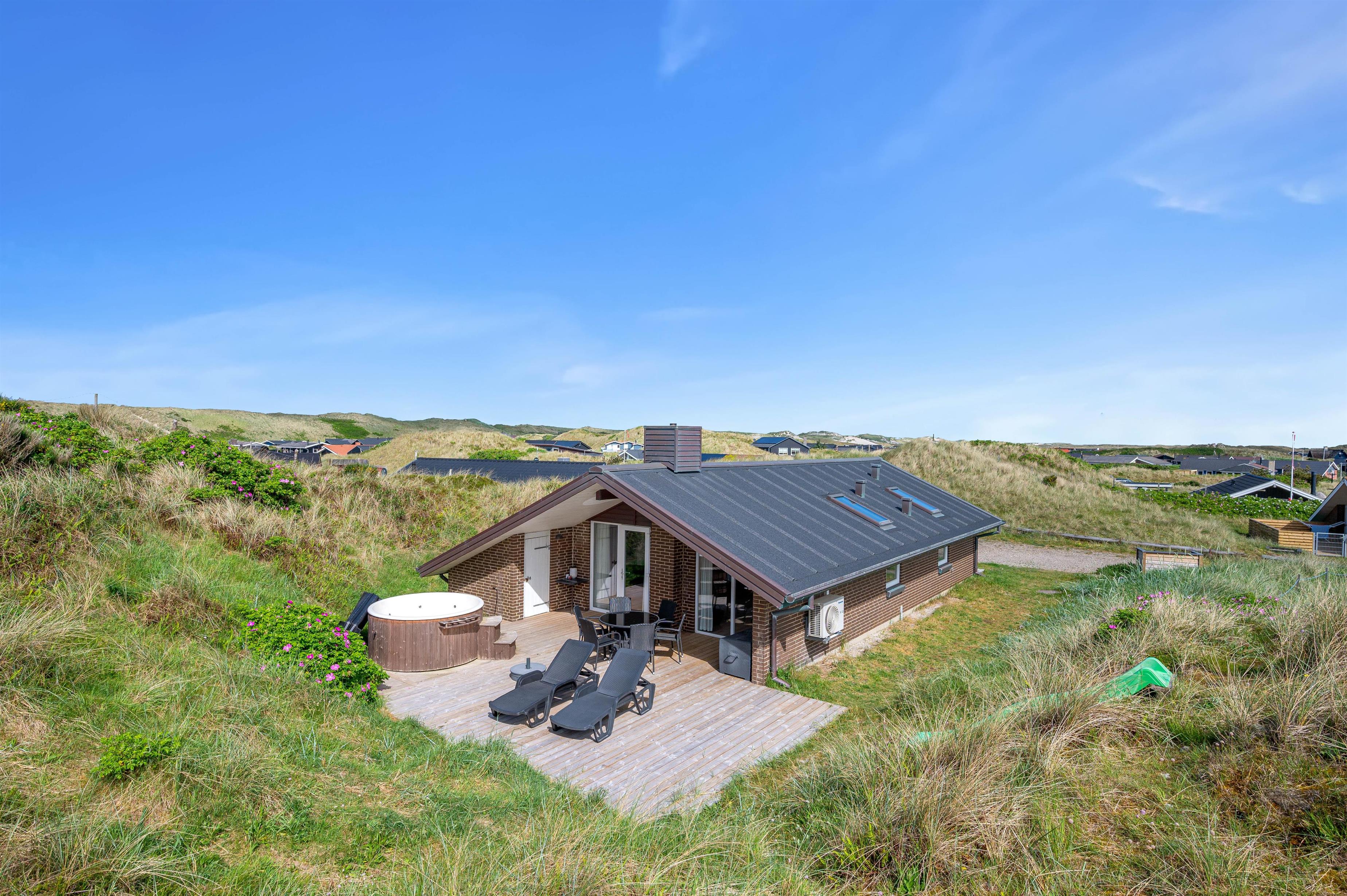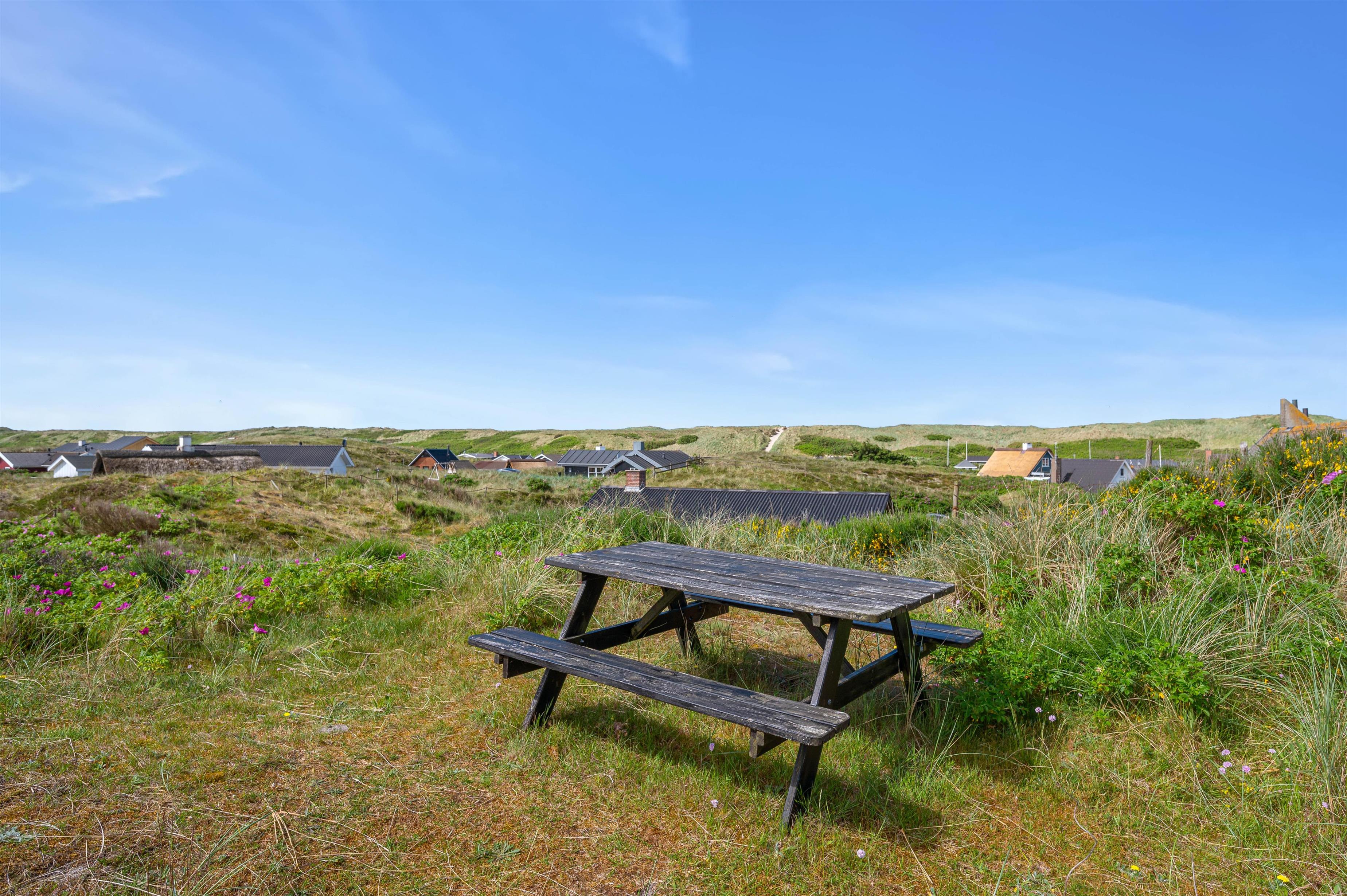 Beliggenheden på en kuperet klitgrund giver en fantastisk udsigt og vesterhavsfornemmelse ved ophold på terrassen. Naturgrunden er yderligere udnyttet med bord-bænkesæt på toppen af klitten, og en rutchebane til de små børn.
