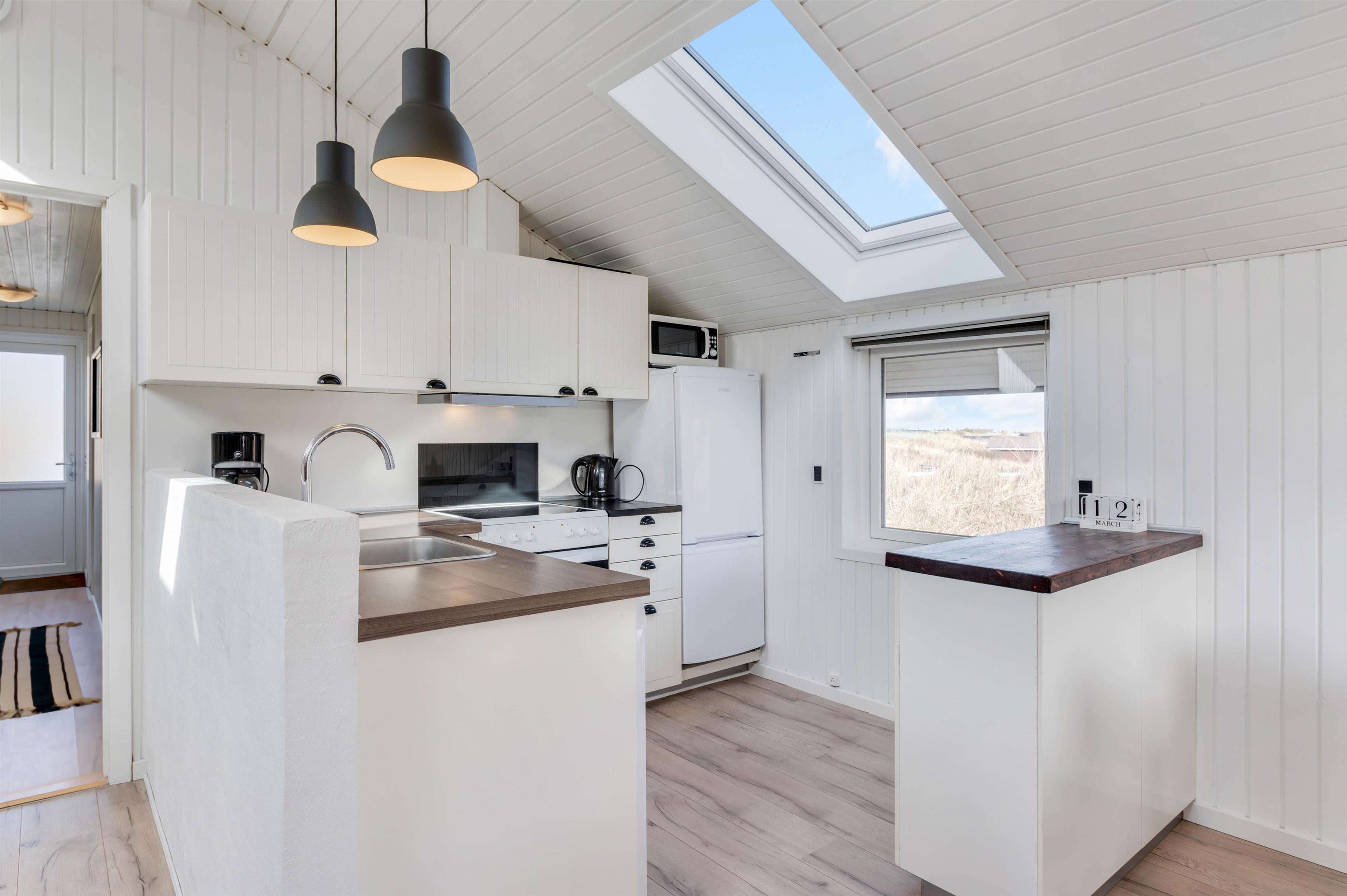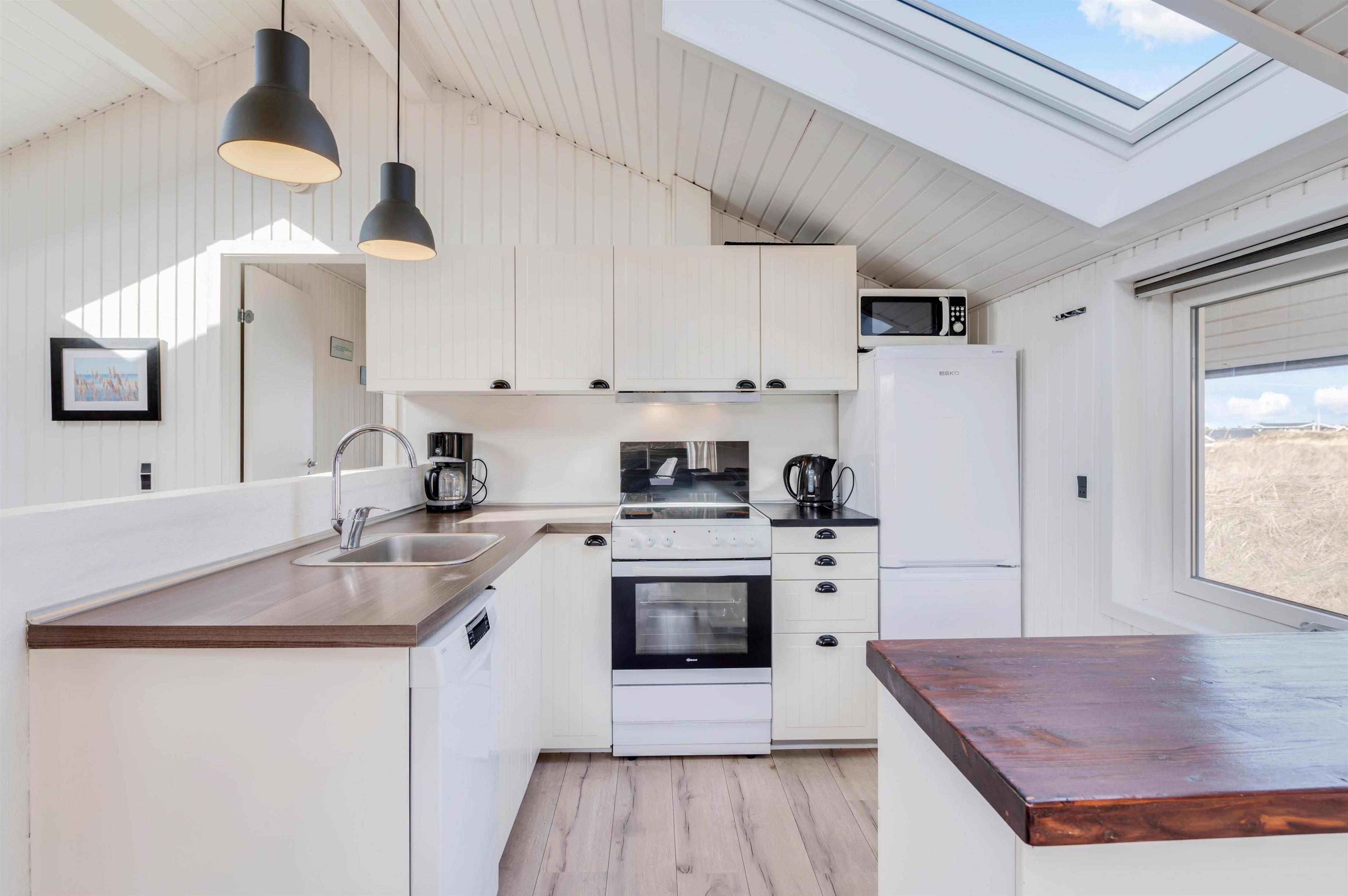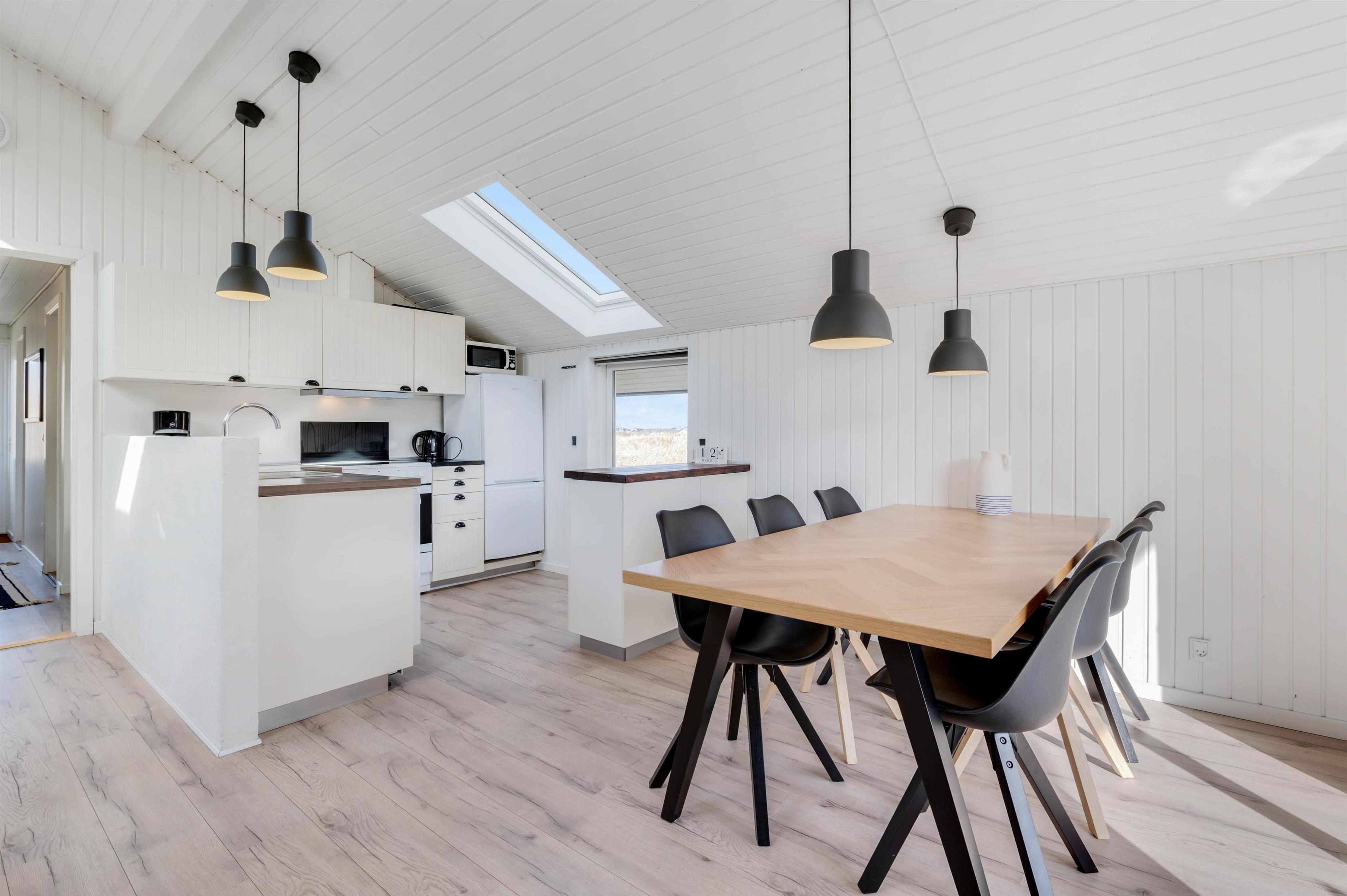 Det åbne køkken danner sammen med spiseafdeling og en god komfortabel opholdsafdeling centrum i dette sommerhus. Lystfiskere vil blive glade for den separate fryser på 100 liter. De hvidmalede trævægge og loft til kip giver en god fornemmelse af rummelighed, og den moderne, smagfulde møblering øger nydelsen af den afslappende ferie. Brændeovnen spreder varme og hygge til både spisepladser og sofagruppe. Her er en mindre alkove, som indbyder til en afstressende stund for både voksne og børn.