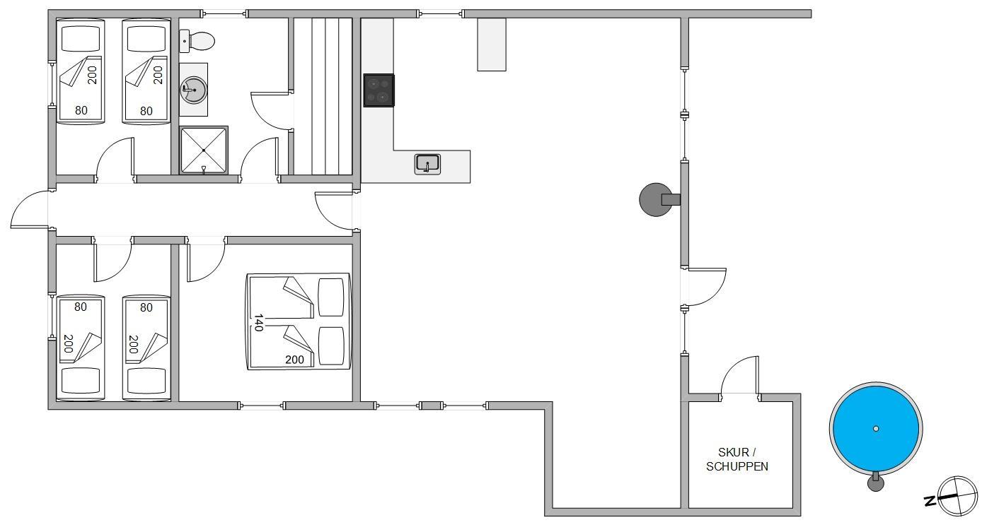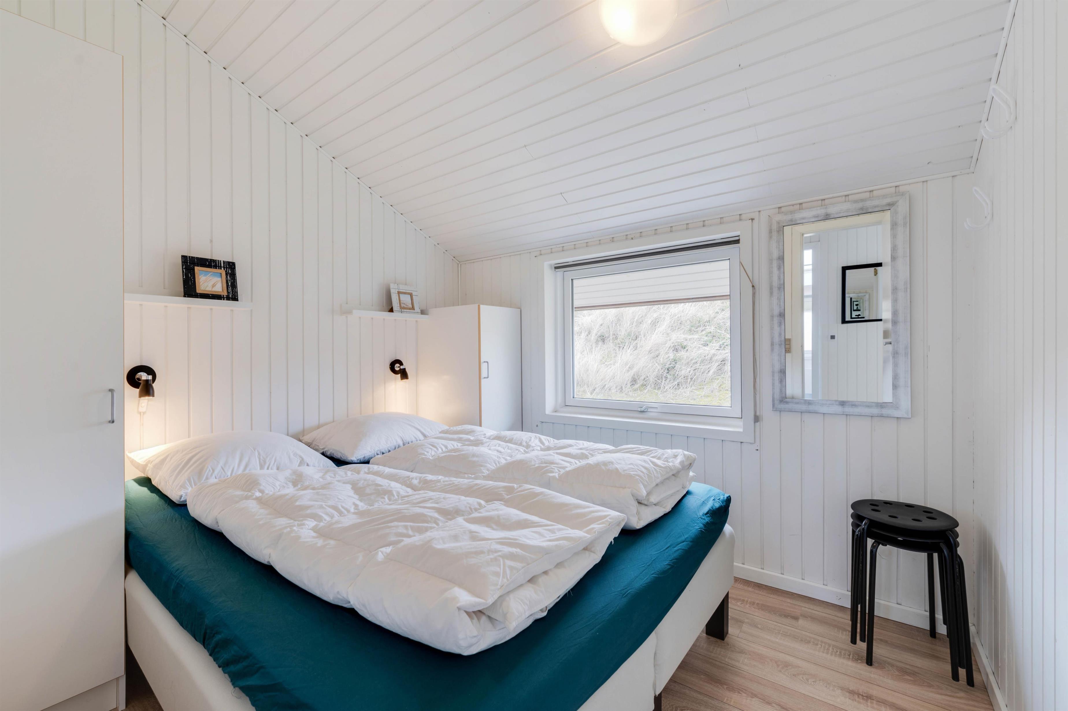 3 gode soveværelser giver plads til 6 personer. Fra feriehusets badeværelse med bruseniche og gulvvarme er der adgang til sauna. Sommerhuset opvarmes blandt andet med en energibesparende varmepumpe.