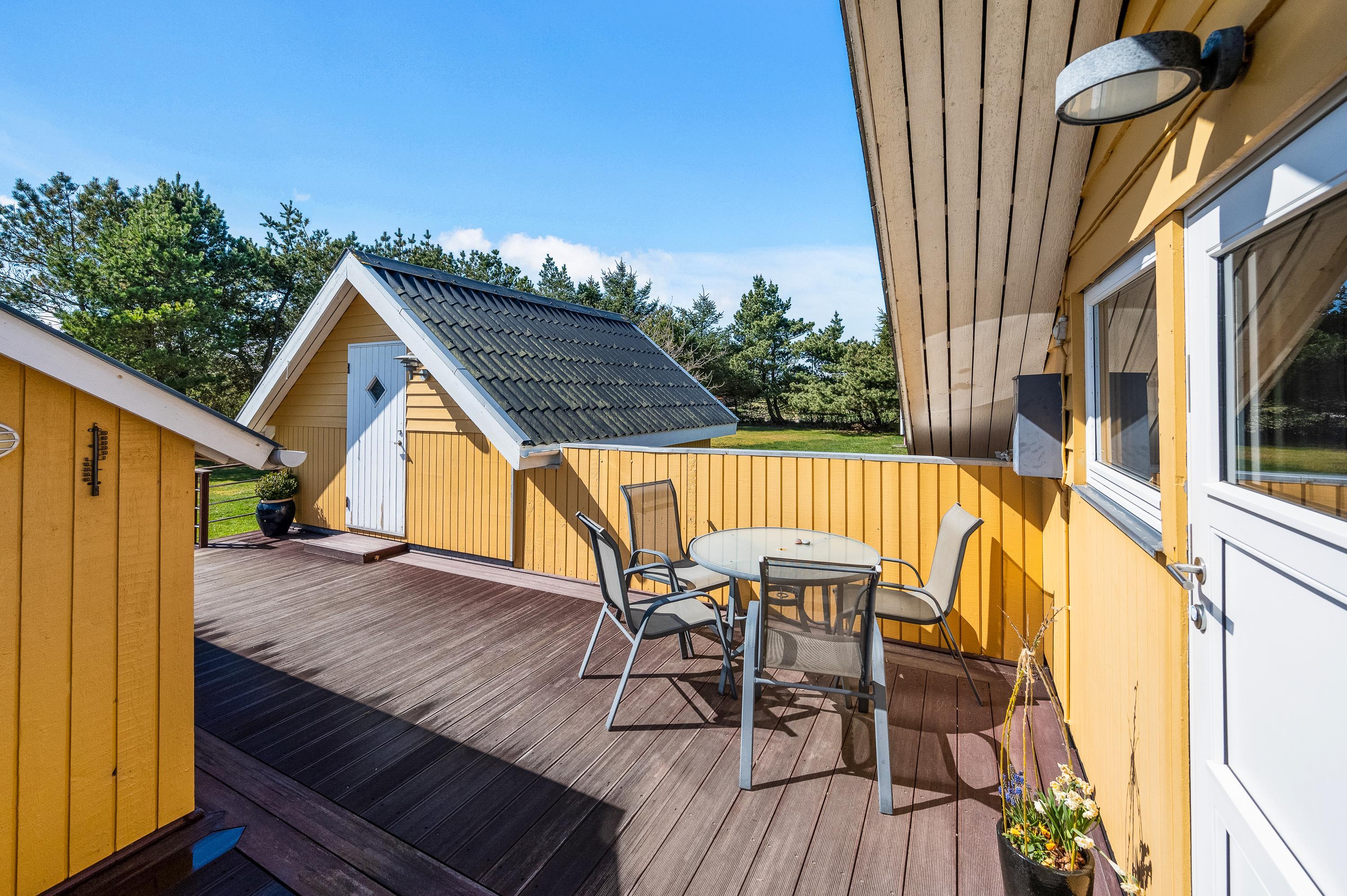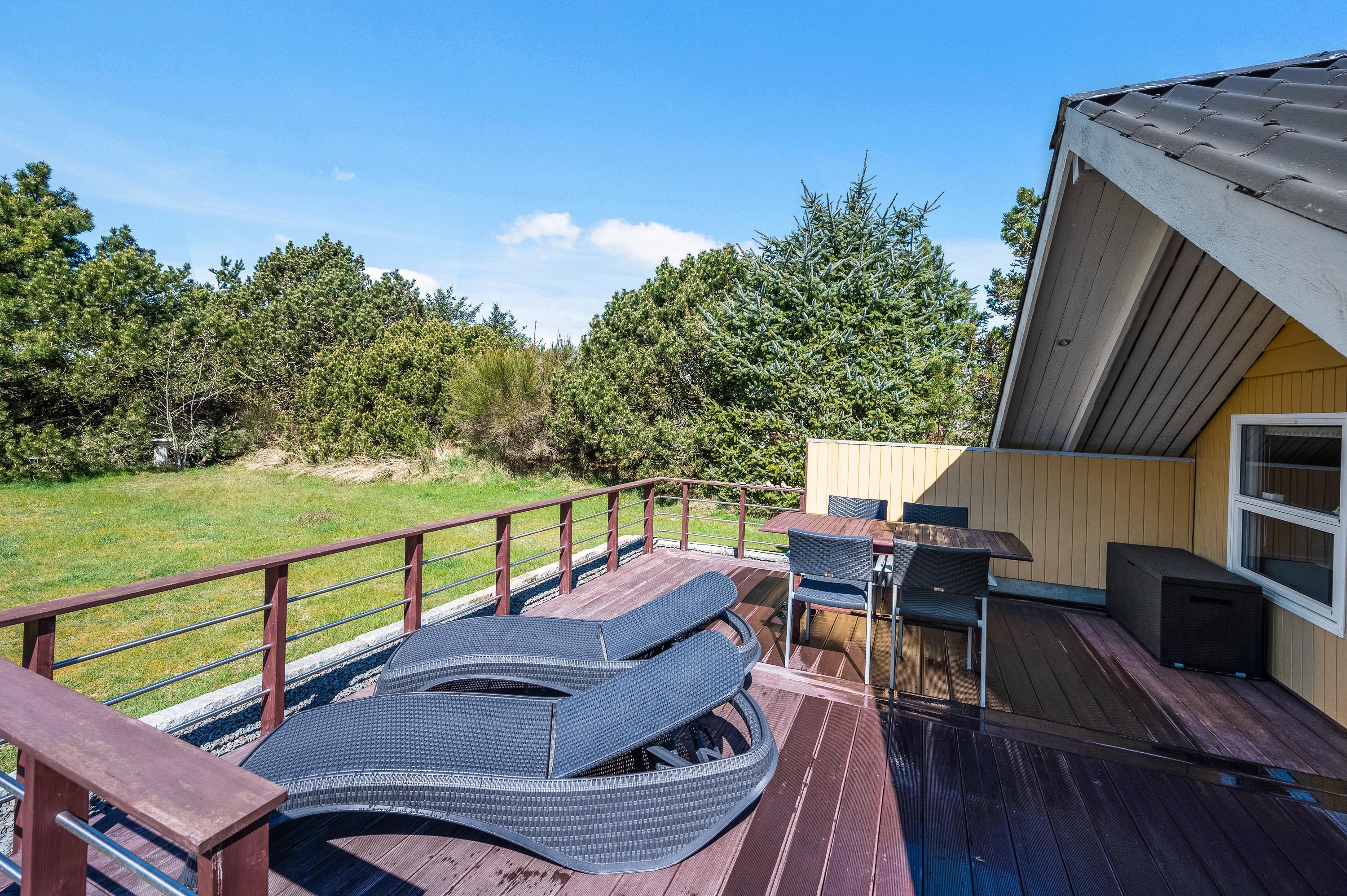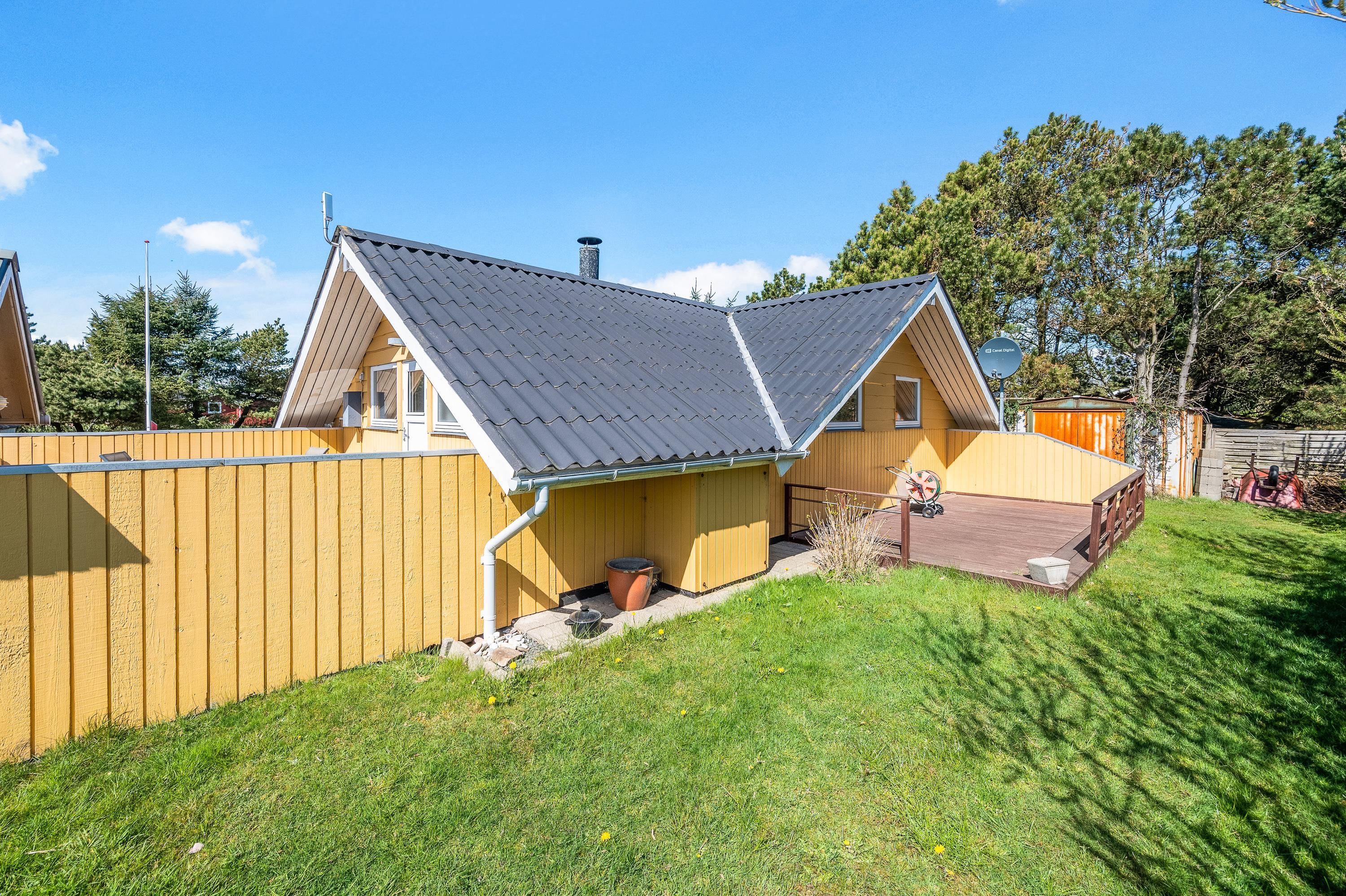 Grunden er dejlig stor og har plads til diverse spil – måske far skal udfordre til en omgang vikingespil? Træterrassen har god plads til, at mor kan slikke sol, imens far og børnene leger ude på græsplænen, som er flot indkredset af store træer.