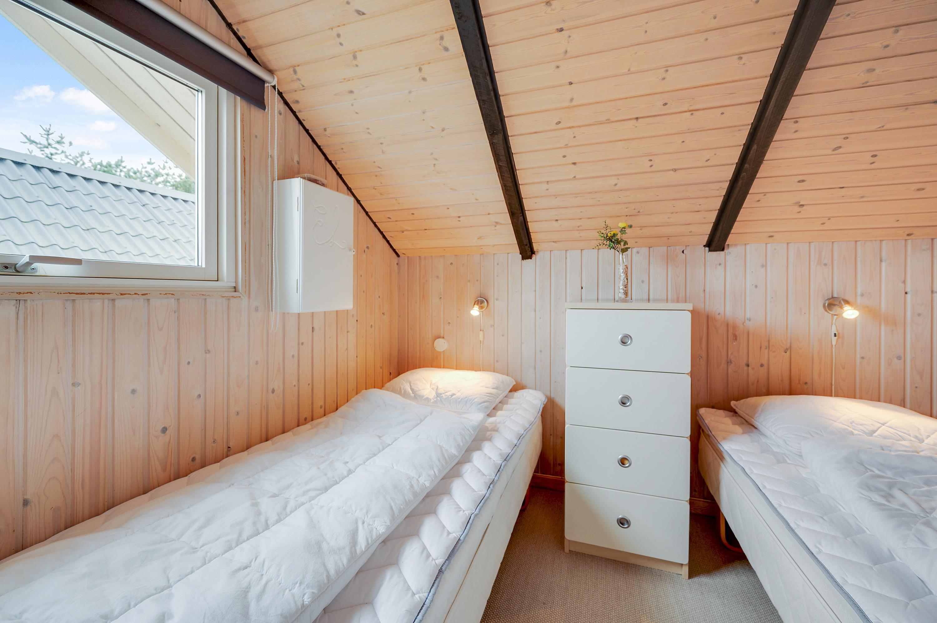 Feriehuset er indrettet med et dejligt lyst køkken, som er i åben forbindelse med stuen. Det indeholder 2 soverum inde i sommerhuset og det 3. soverum er placeret i annekset. I stuen er brændeovnen sammen med træværk og hyggesofa med til at skabe en hyggelig og dejlig feriestemning. Her er også en energibesparende varmepumpe, som I med fordel kan benytte jer af.