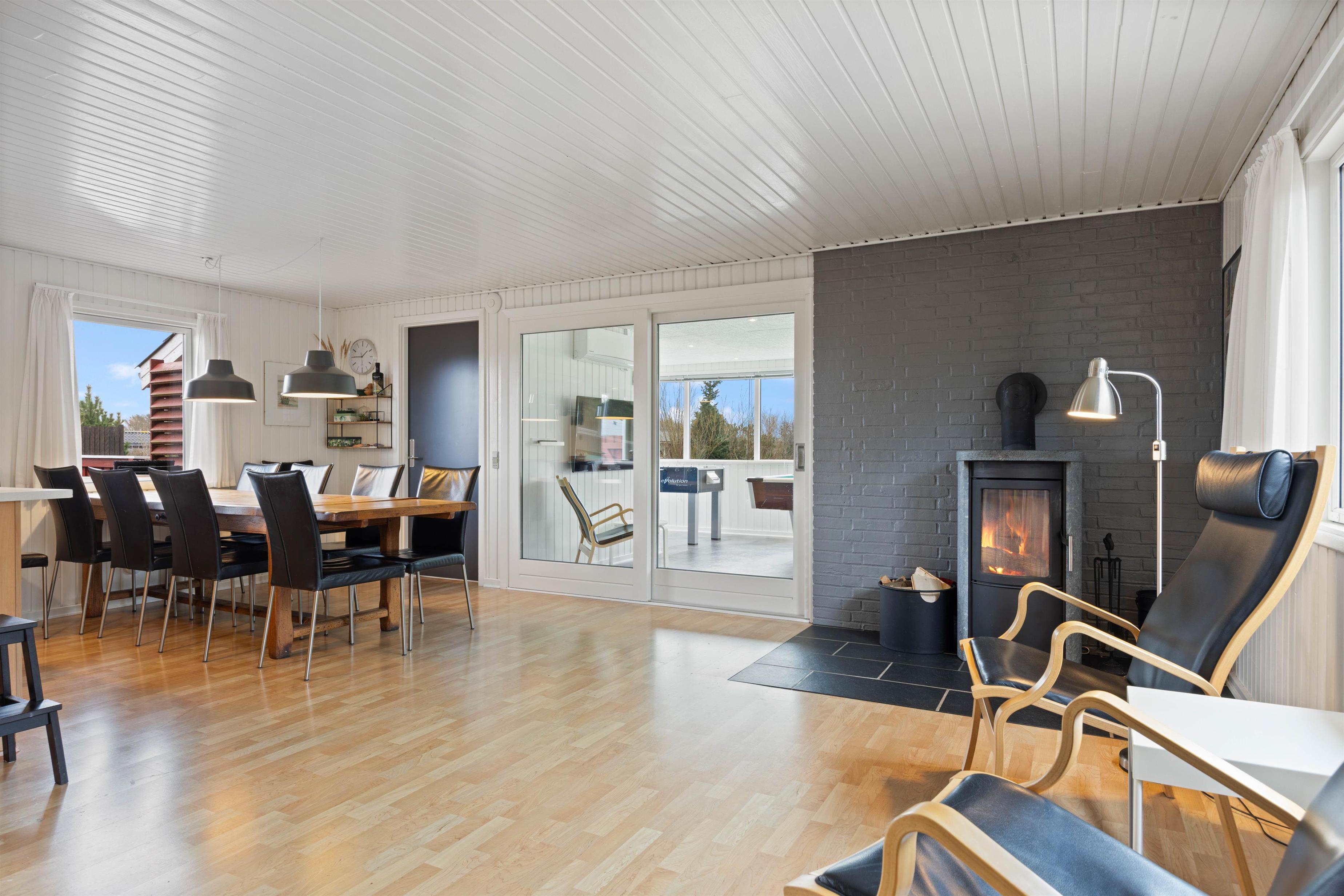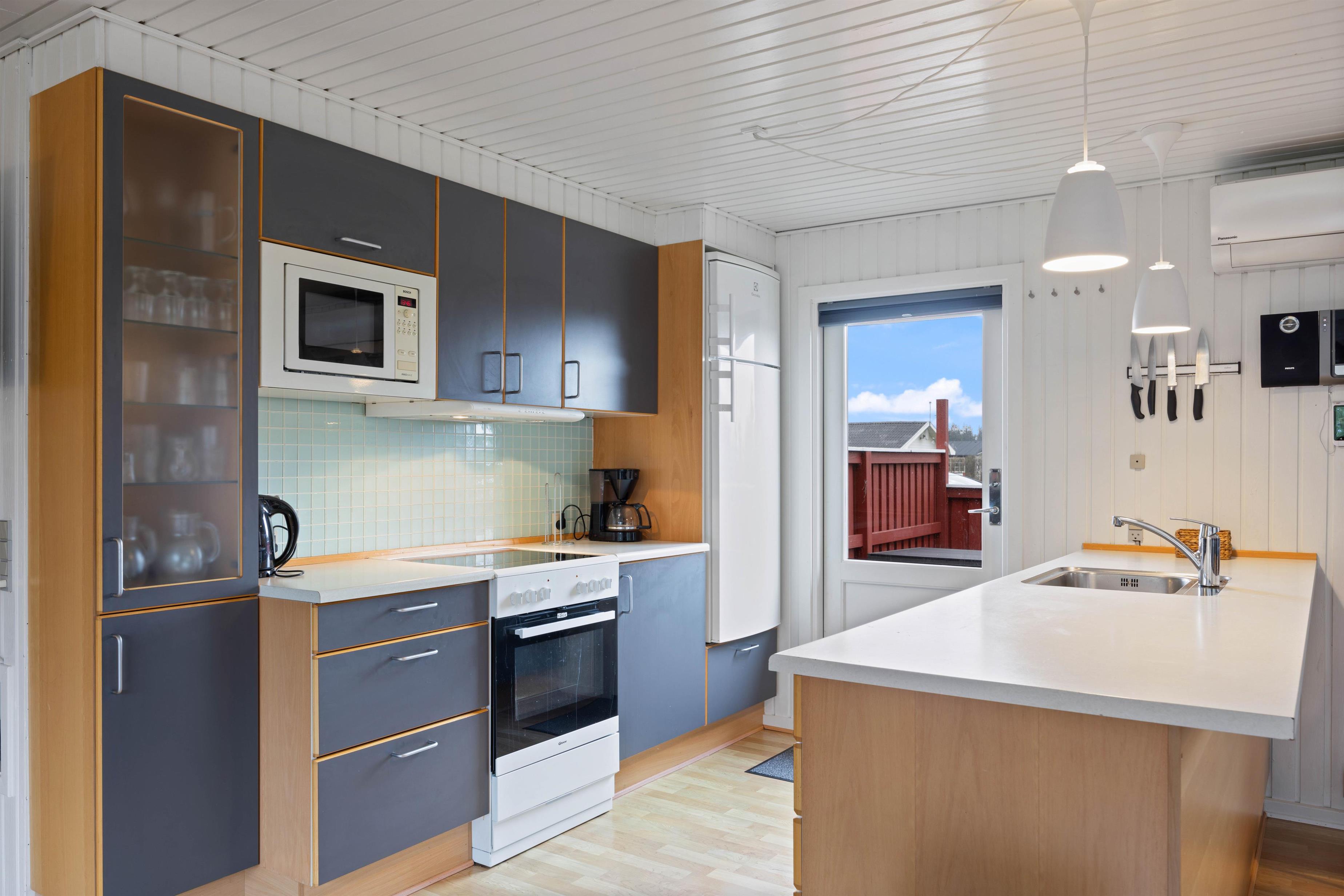 Dette skønne træferiehus er løbende renoveret og godt indrettet. Køkkenafdelingen er lys og åben, og bl.a. med mikroovn og opvaskemaskine. Opholdsrummet er i direkte forbindelse med køkkenafdeling og indrettet med spiseplads og sofahjørne, hvorfra man på de lidt køligere dage kan nyde den knitrende ild i brændeovnen.
