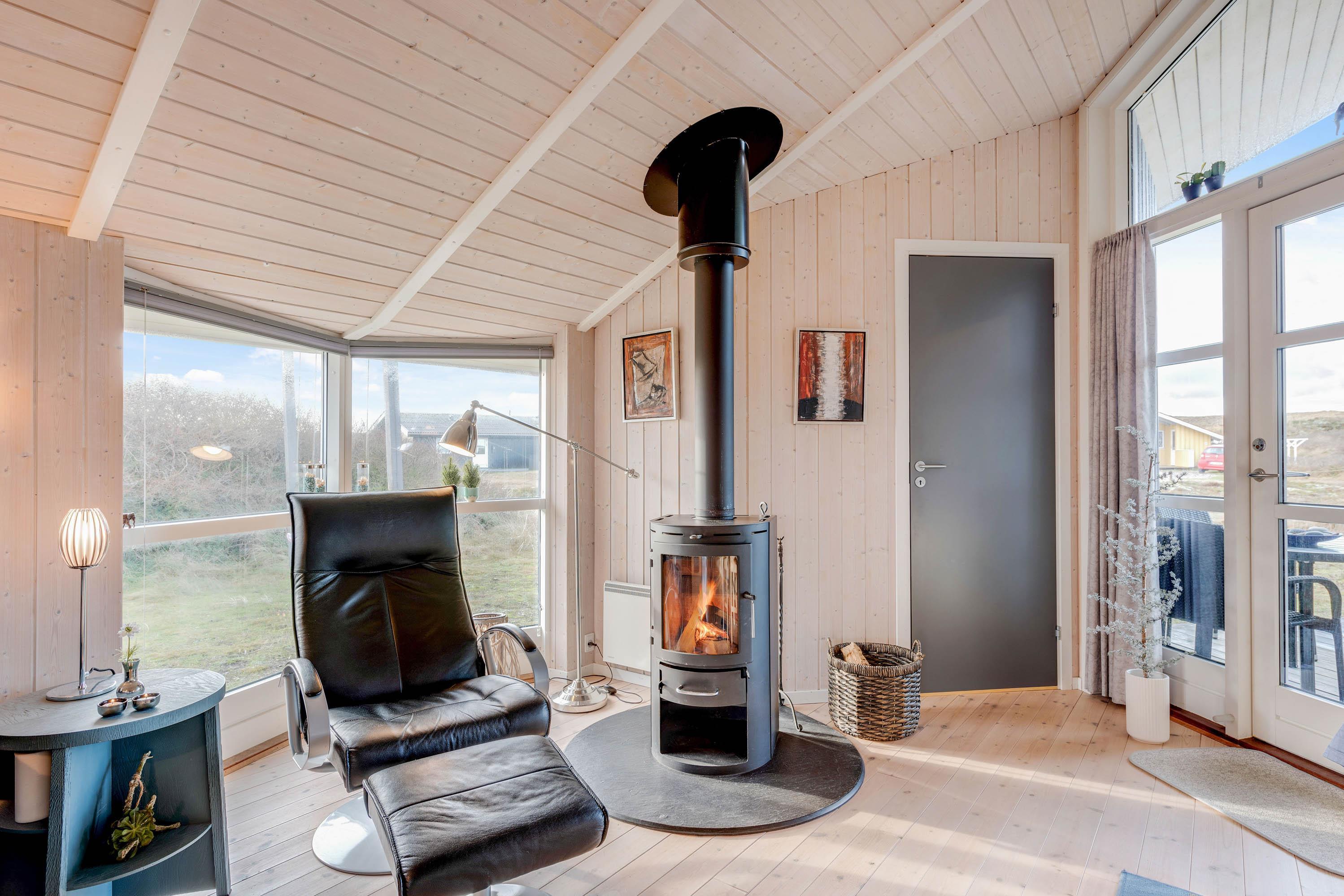 Husets hjerte er det åbne opholdsrum med stue og spiseafdeling, som ligger i åben forbindelse til det veludstyrede køkken. Her er rammerne sat for en masse hyggelige feriestunder med de nærmeste, og med den knitrende brændeovn i baggrunden bliver dagene kun endnu hyggeligere.