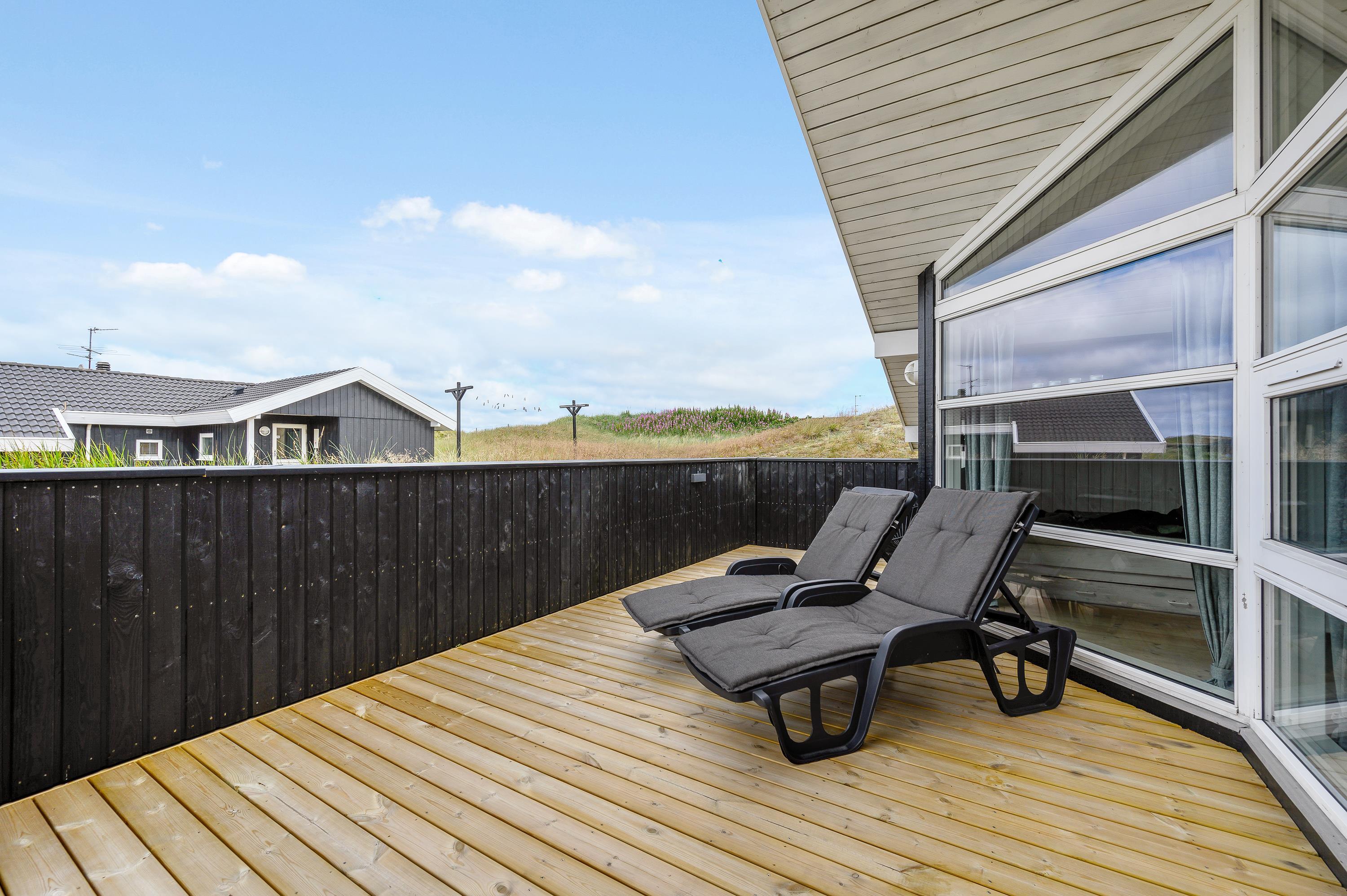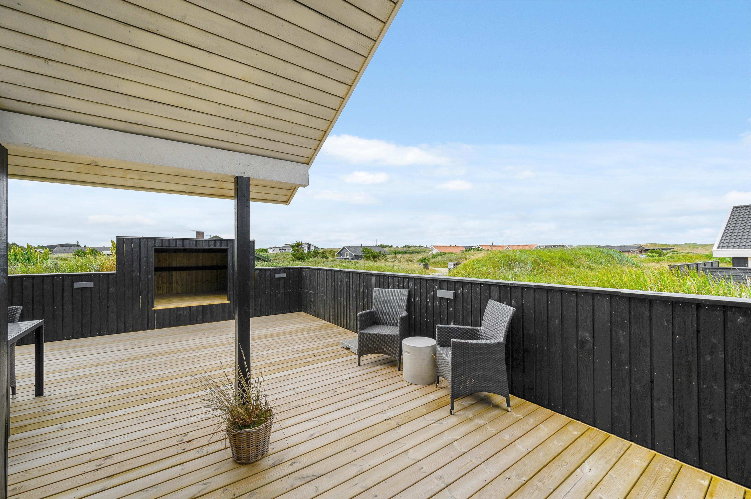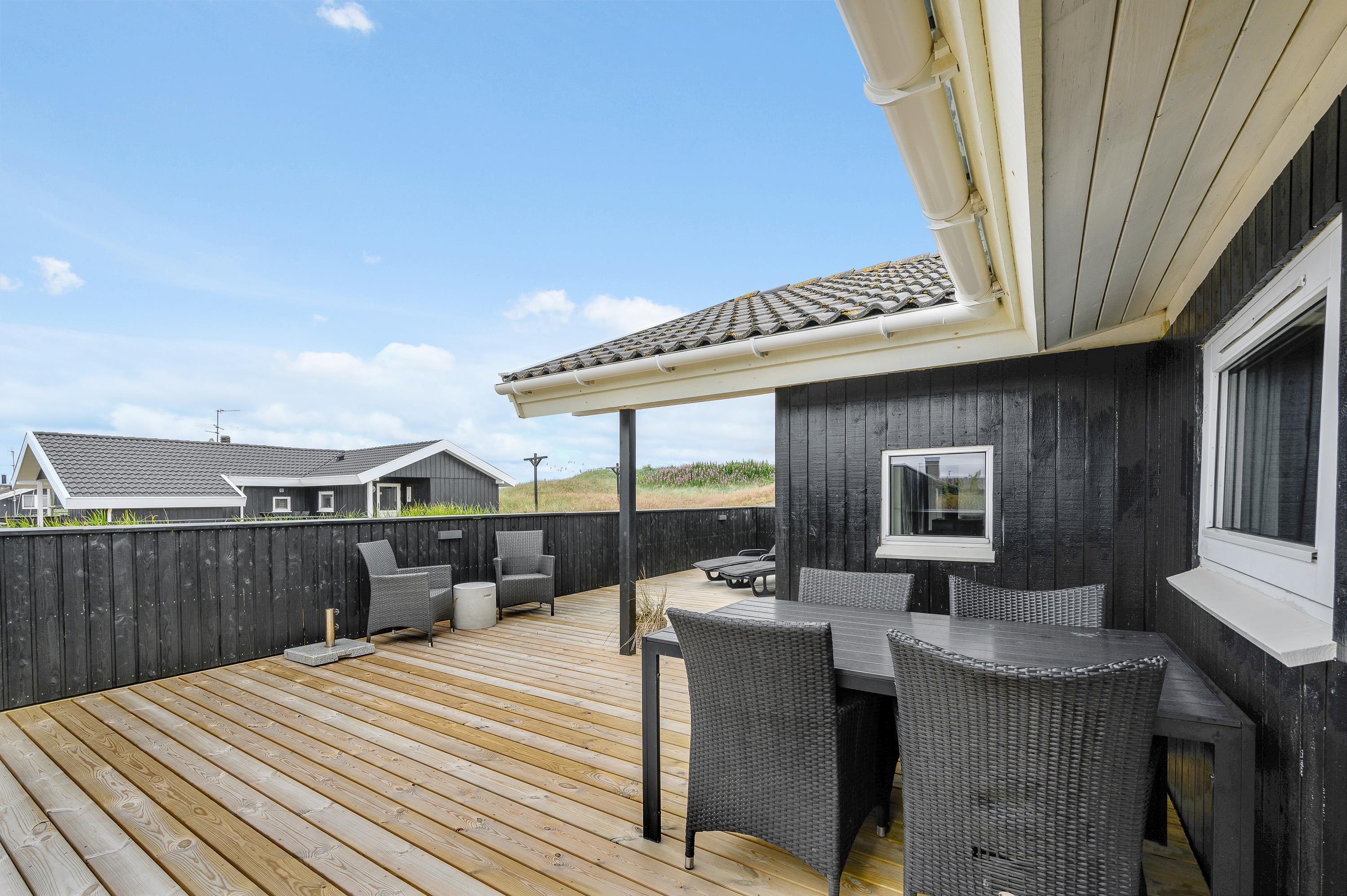 Sommerhuset har to dejlige terrasser. Den ene vender mod øst, og det er derfor næsten et ”must” at nyde morgenmaden på terrassen, når solen skinner og der er blevet hentet nybagte rundstykker fra den lokale købmand, som ligger blot 800 meter fra sommerhuset. Den anden terrasse mod vest er delvist overdækket, og her er det muligt at nyde en god bog med en kop kaffe i solen eller afslutte dagen i samvær med familien, mens solen går ned.