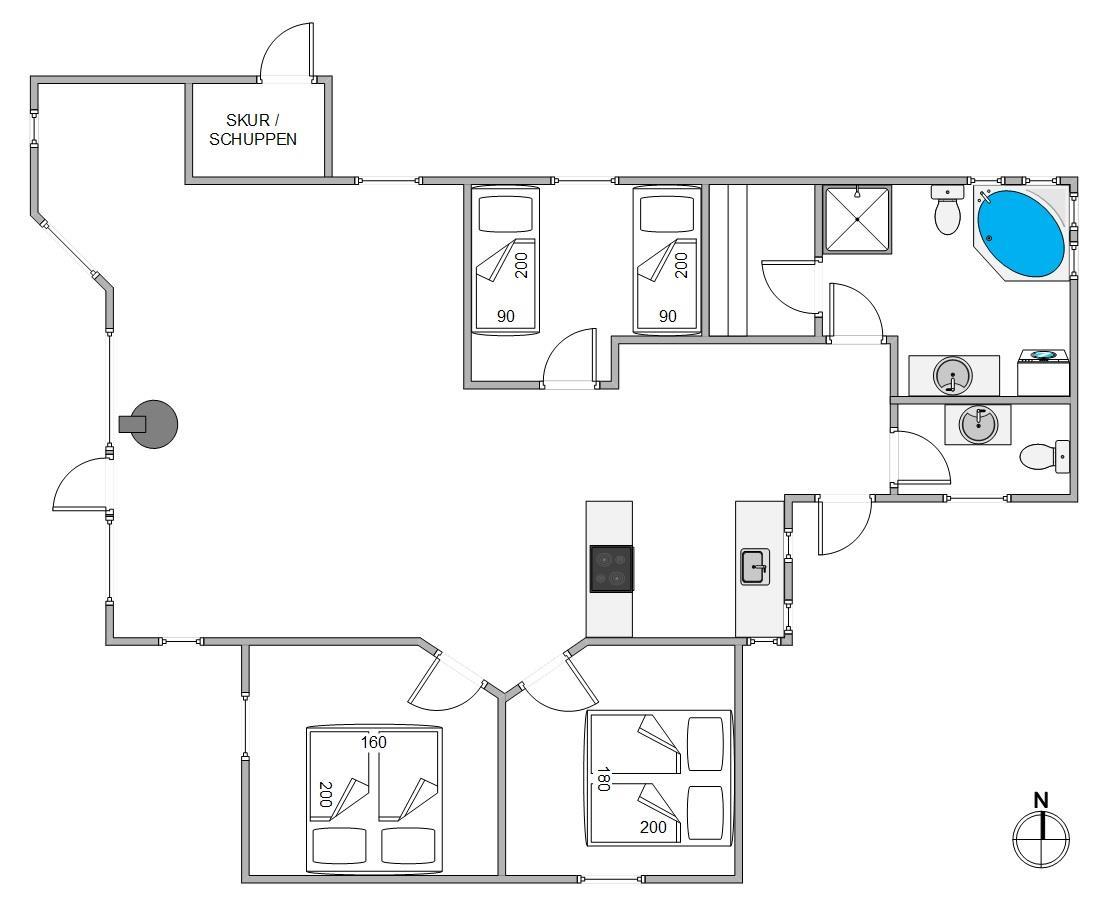 Det traditionelle sommerhus har plads til 6 feriegæster fordelt på 3 soverum. På to af værelserne er der dobbeltsenge og på det sidste værelse finder I 2 enkeltsenge.