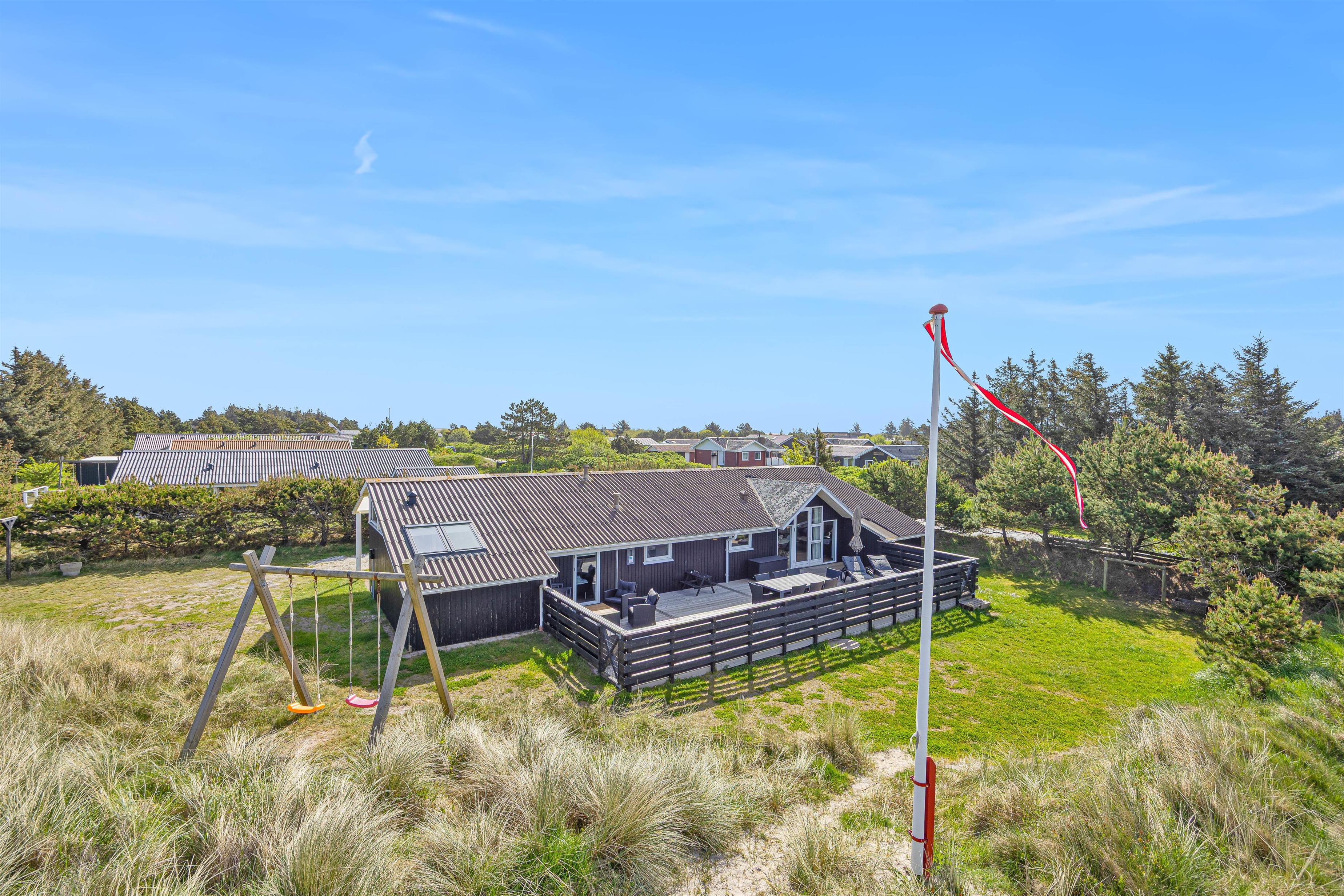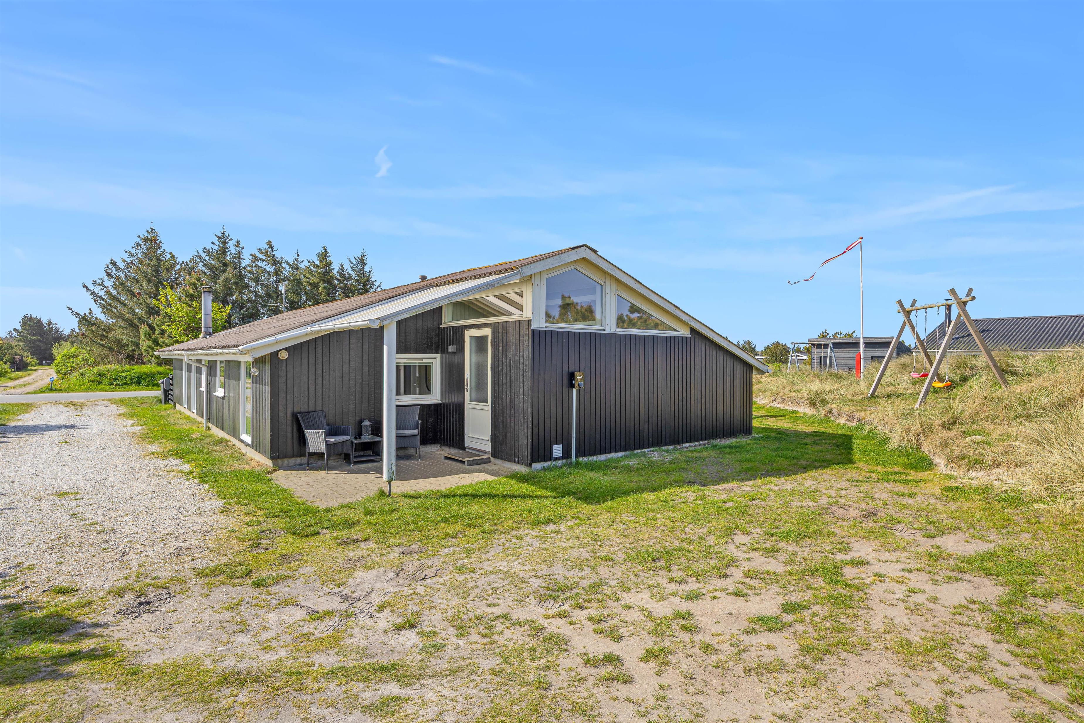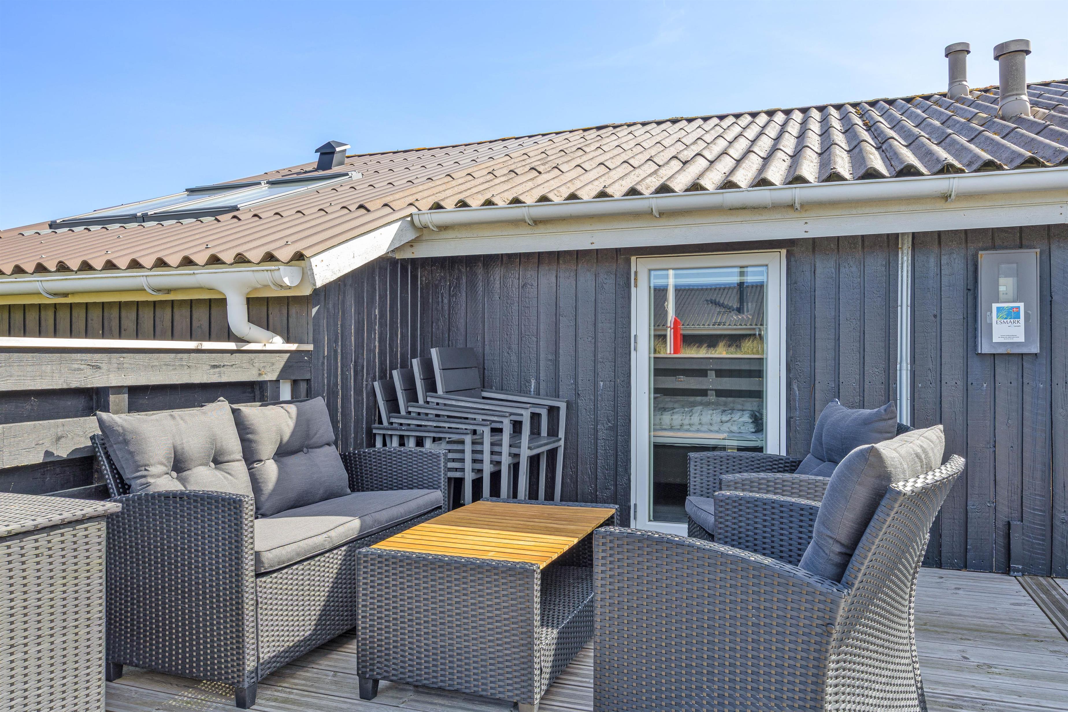 Feriehuset har også en stor lukket terrasse, samt en have dertil, som til glæde for børnene har både sandkasse og gyngestativ.