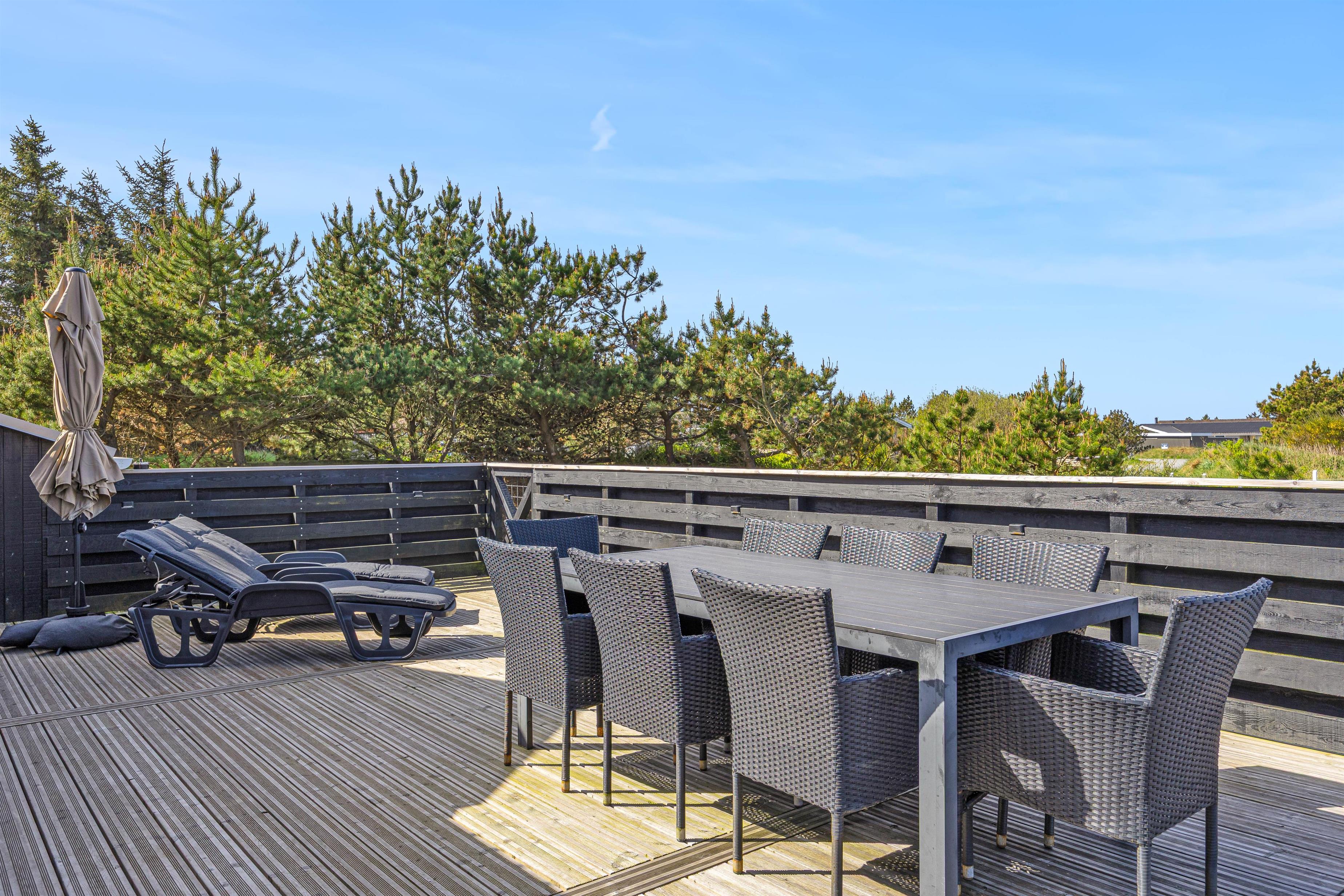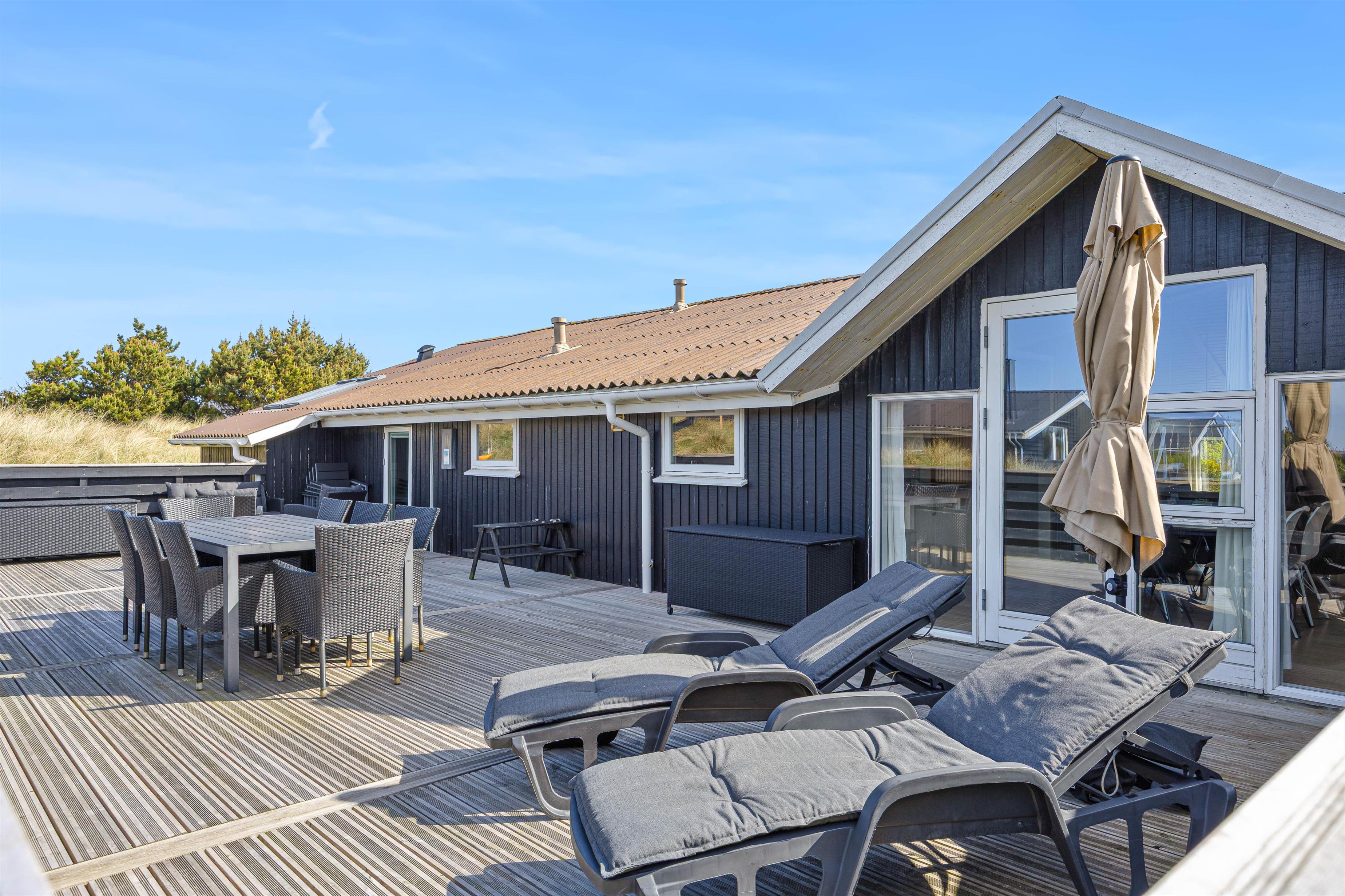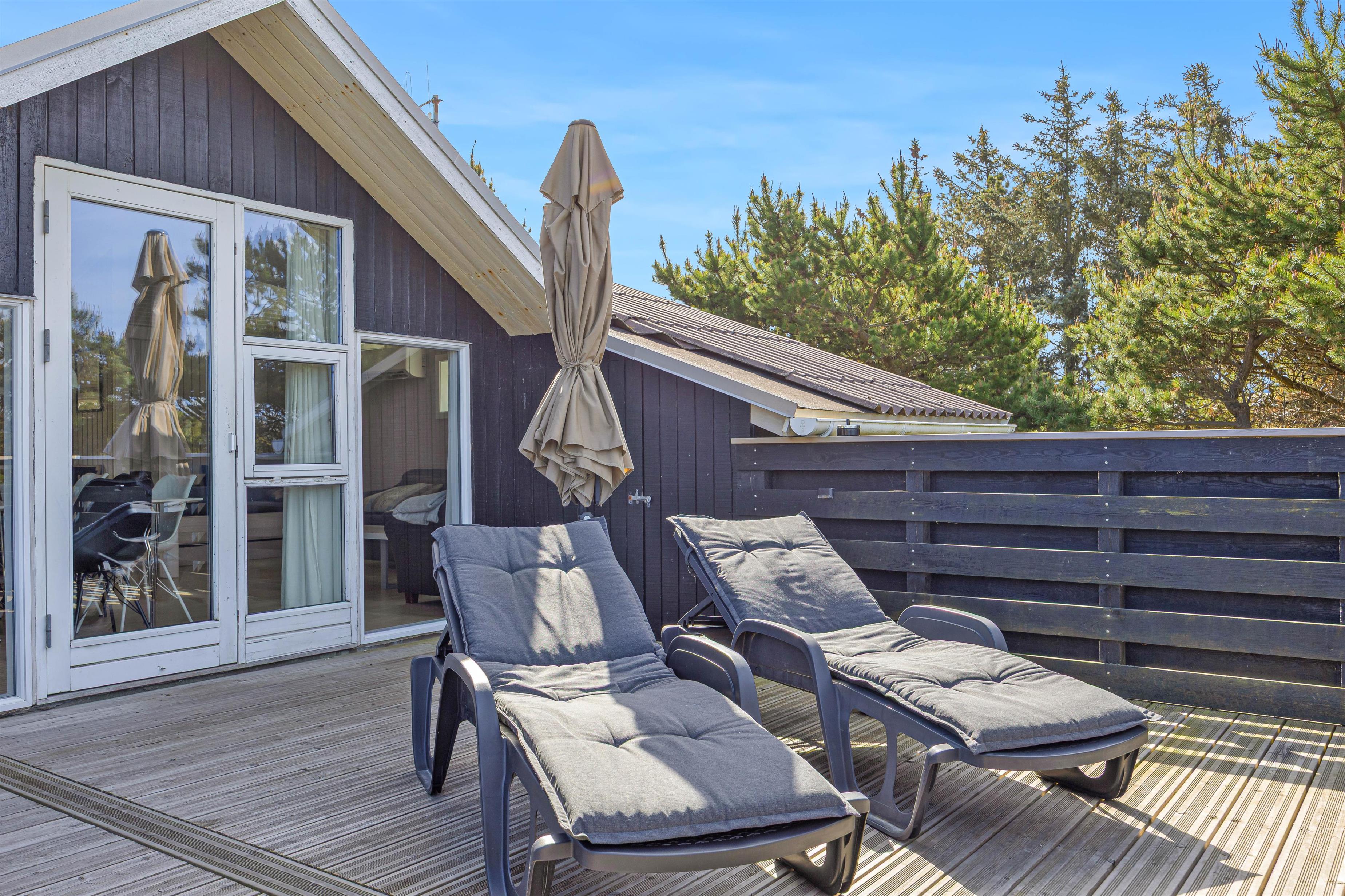 Feriehuset har også en stor lukket terrasse, samt en have dertil, som til glæde for børnene har både sandkasse og gyngestativ.
