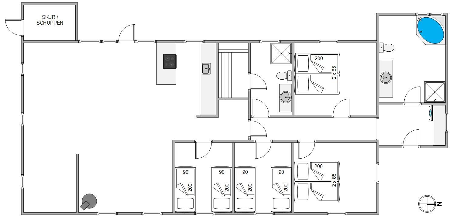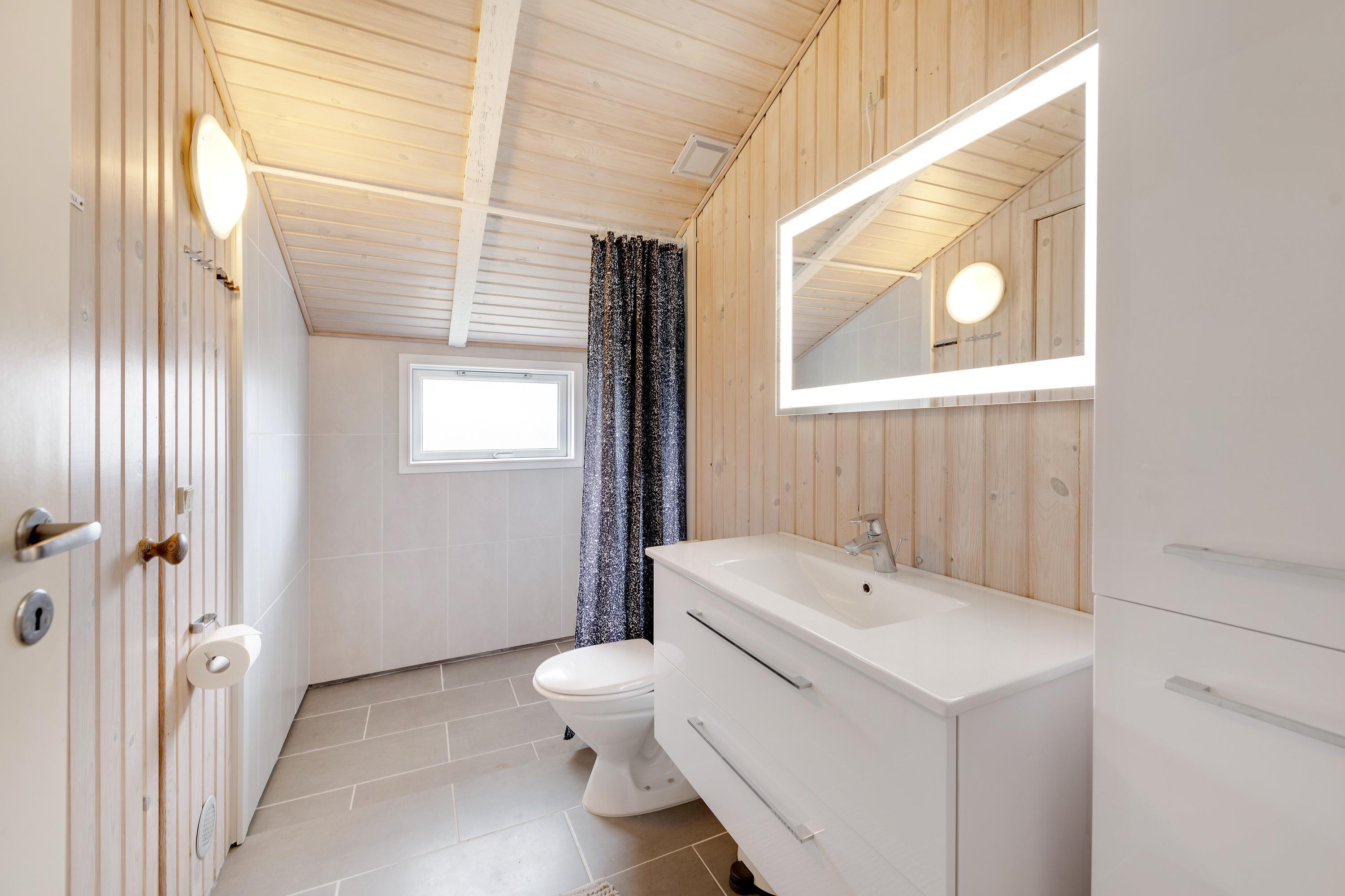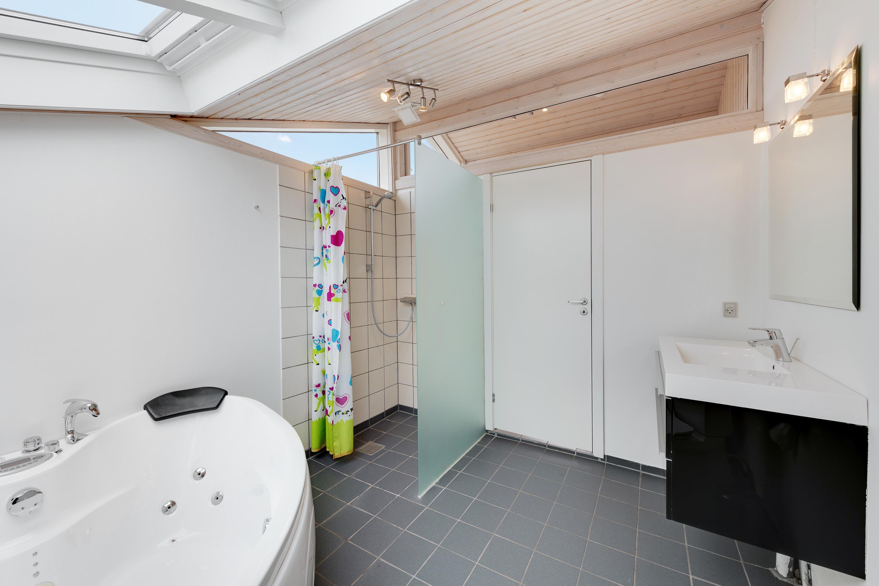 Der er 2 badeværelser, hvoraf det ene badeværelse rummer både spabad og sauna. Her kan I rigtig nyde feriestemningen, når I får tændt op i boblebadet og mærker varmen fra saunaen efterfølgende.