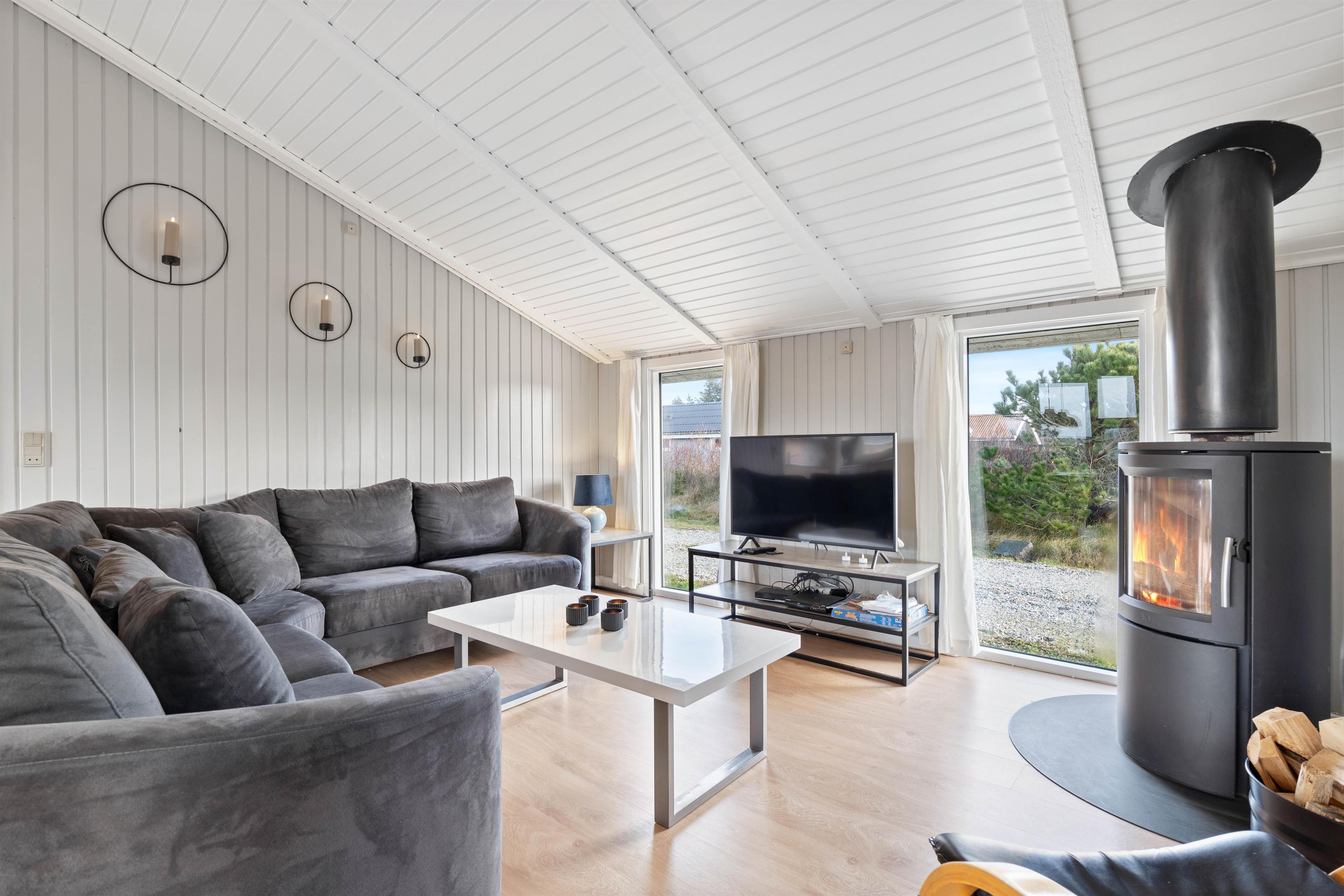 Husets indre oser af ægte sommerhuscharme – med træbeklædte vægge og brændeovnen, som står midt i stuen. Stuen er slået sammen med køkkenet, og det giver et stort fællesrum, hvor mange hyggelige timer med familien kan bruges. Huset er dejligt lyst, og dette skyldes især vinduespartierne, som lukker lyset ind udefra. Generelt er der blevet brugt lyse farver i indretningen, hvilket skaber en hyggelig og rolig stemning i huset.