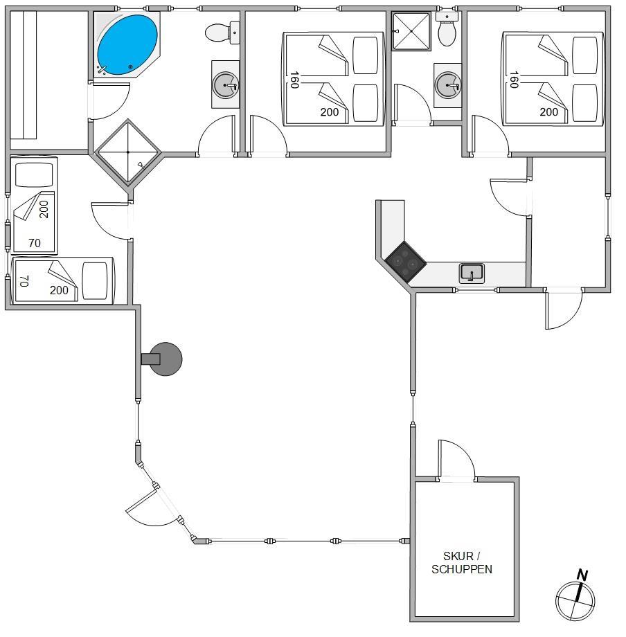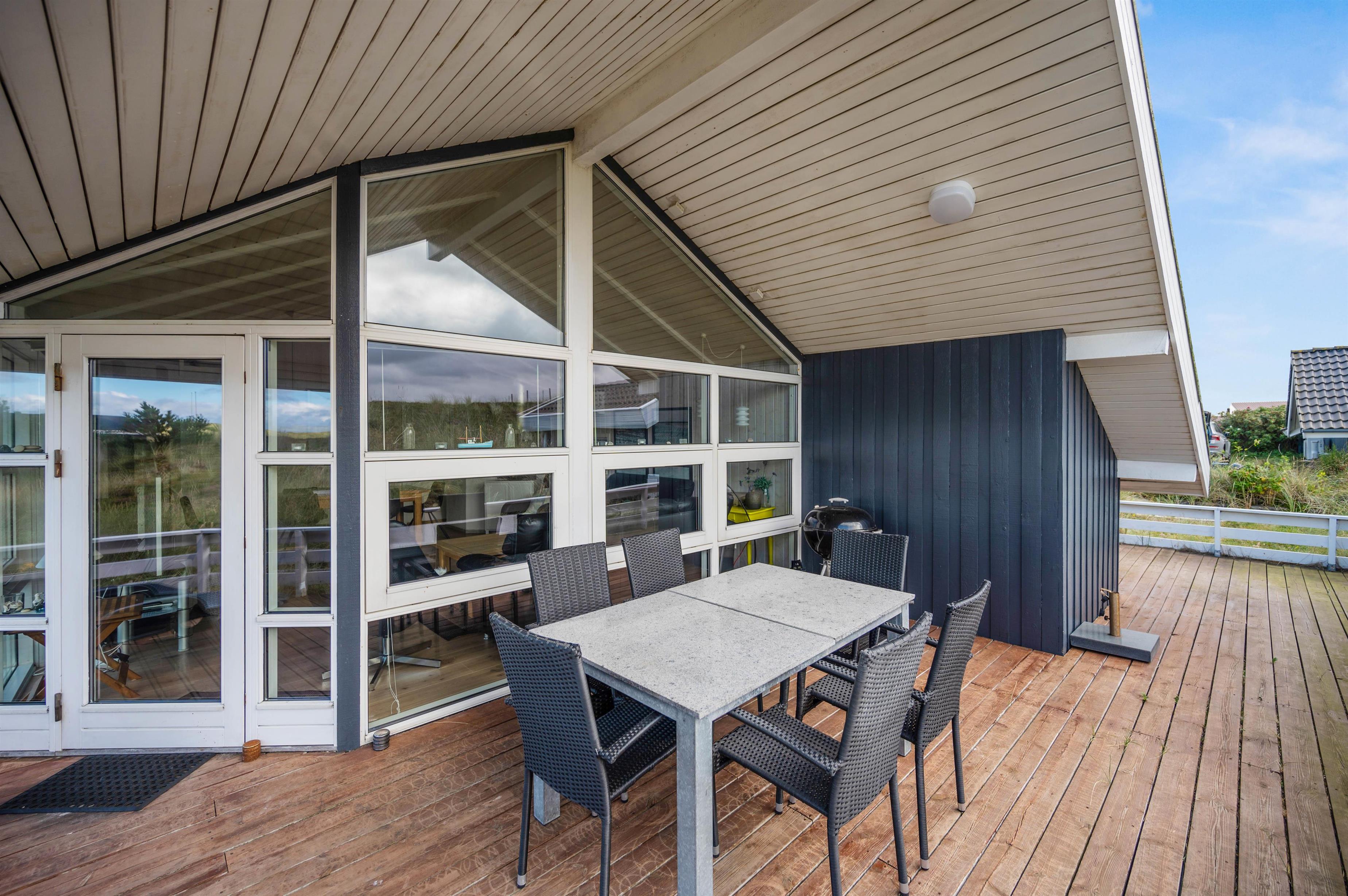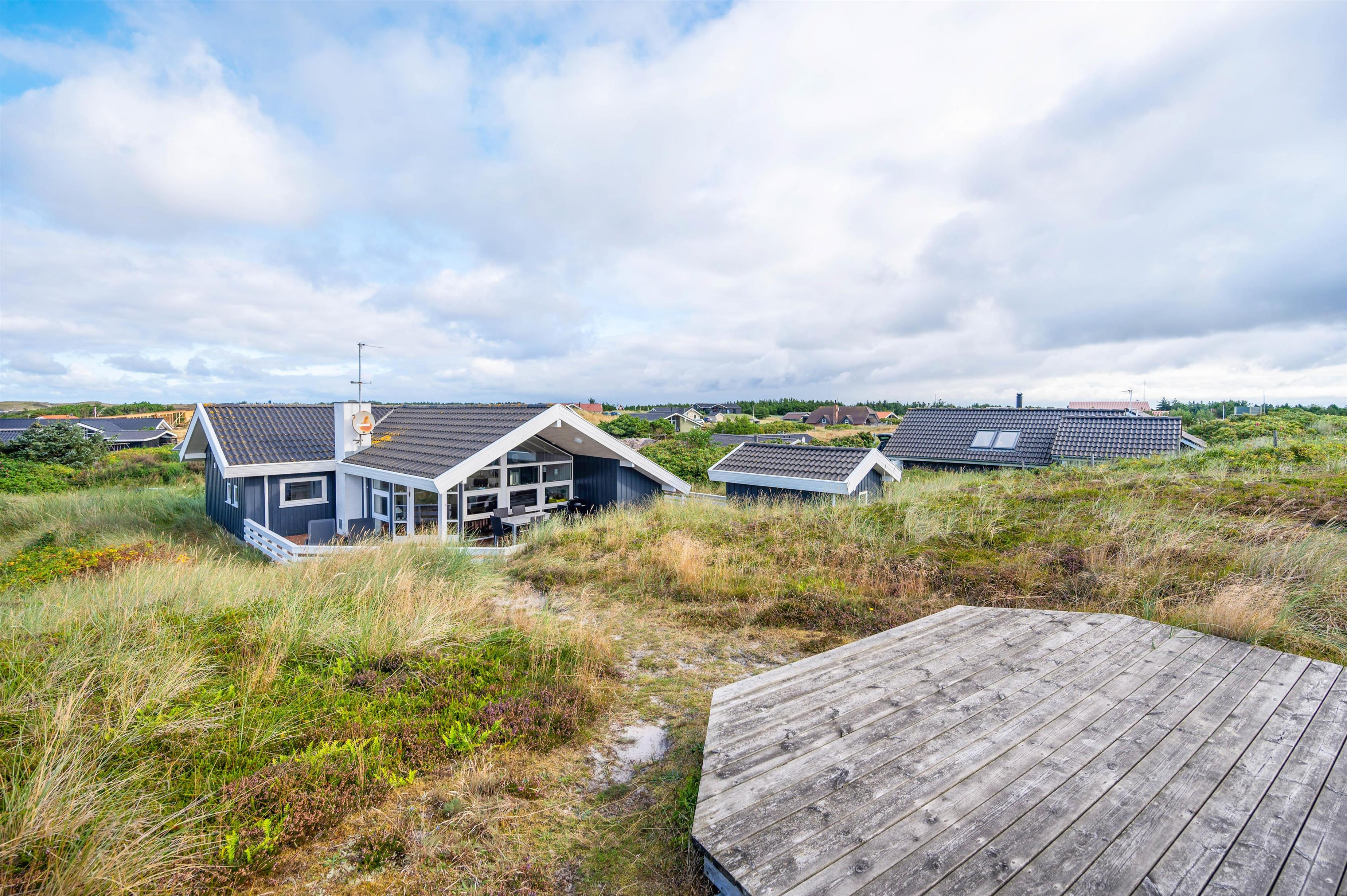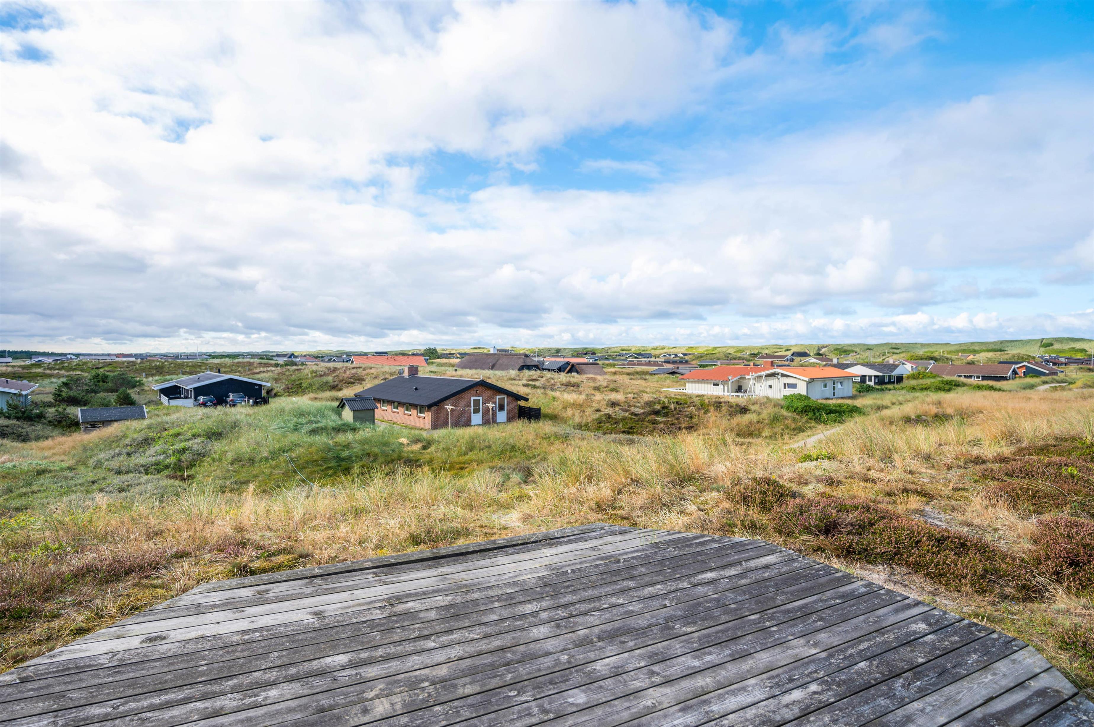 Huset har flere dejlige afskærmede terrasser rundt om huset – og på en lille forhøjning foran huset, finder I en træ-terrasse, hvorfra man har et fantastisk view over husområdet og klitterne. Huset har også en skur hvortil cykler kan opbevares.
