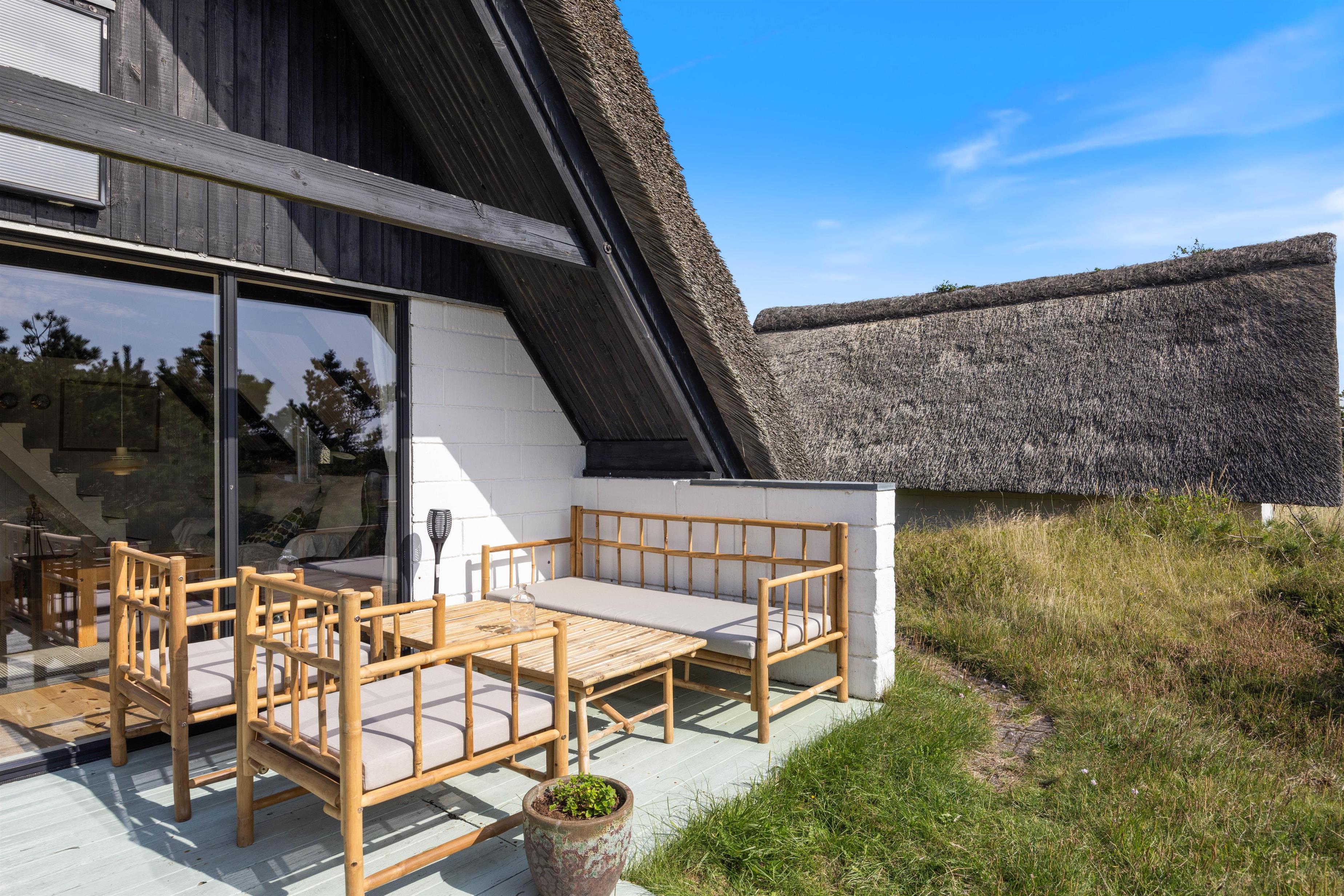 Sommerhuset har en god læfyldt, møbleret terrasse, som indbyder til mange hyggelige timer, og hvor der er god plads til hyggelige grillaftener og soldyrkning.