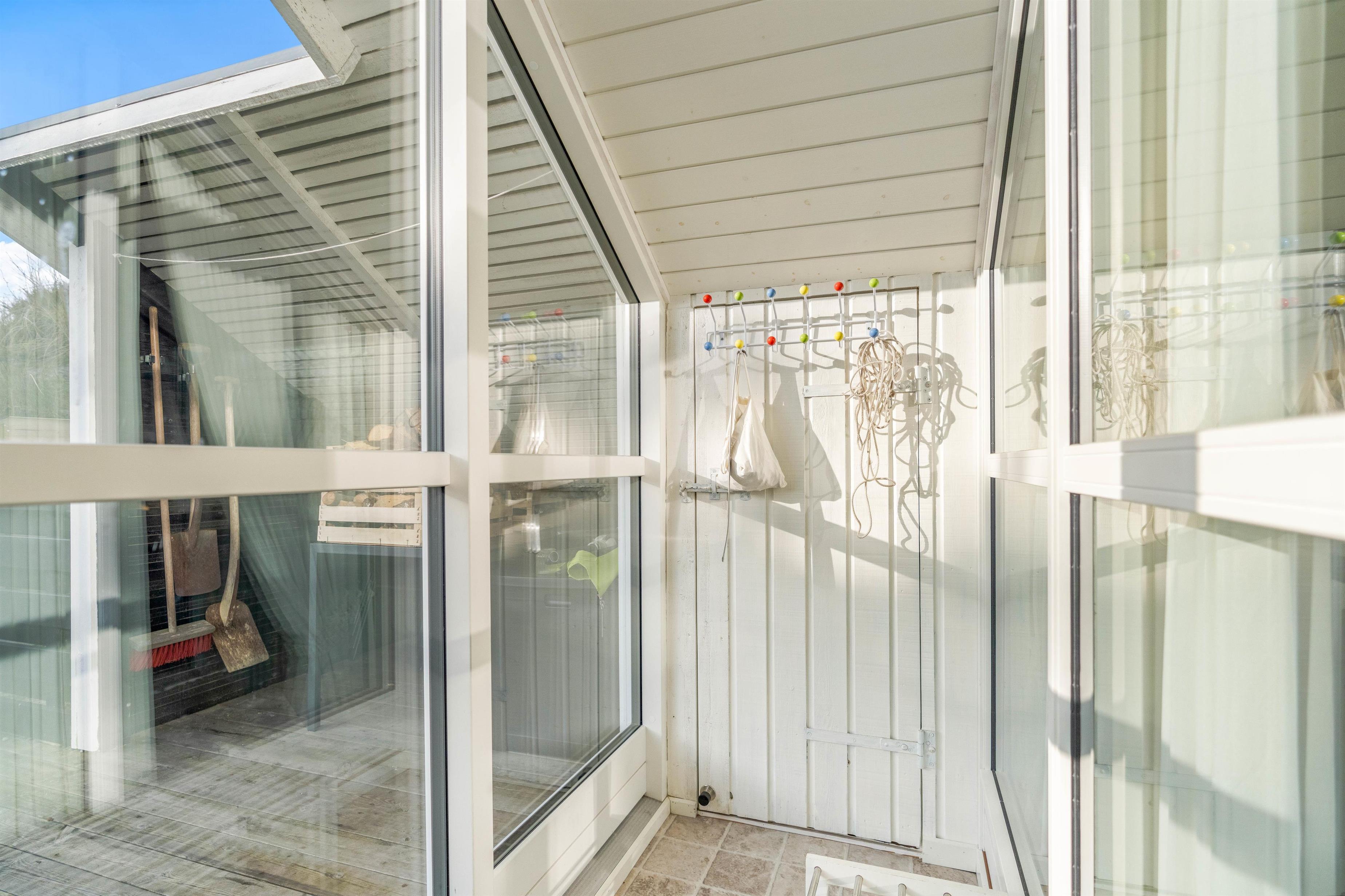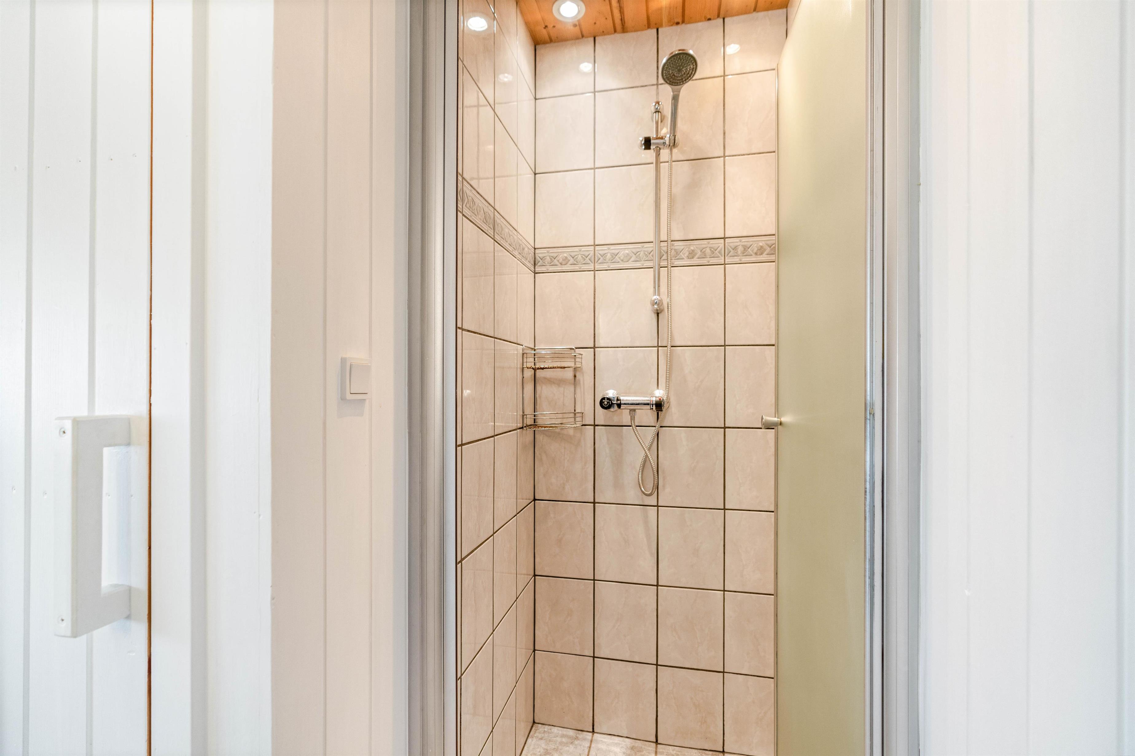 Badeværelset har gulvvarme, en bruseniche og en god sauna. Her kan I varme jer efter en gåtur ved stranden. På badeværelset er sommerhusets vaskemaskine og tørretumbler også placeret.