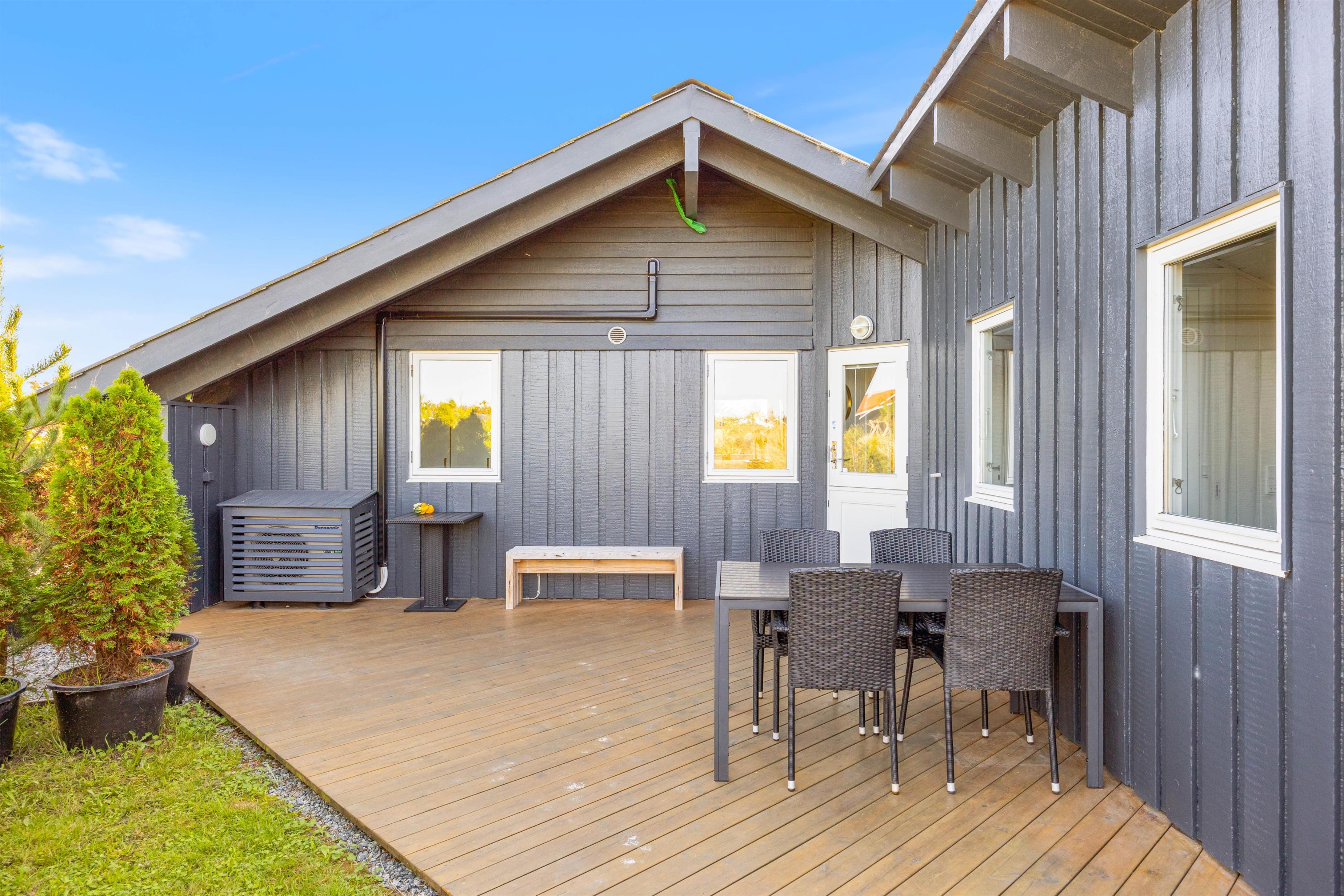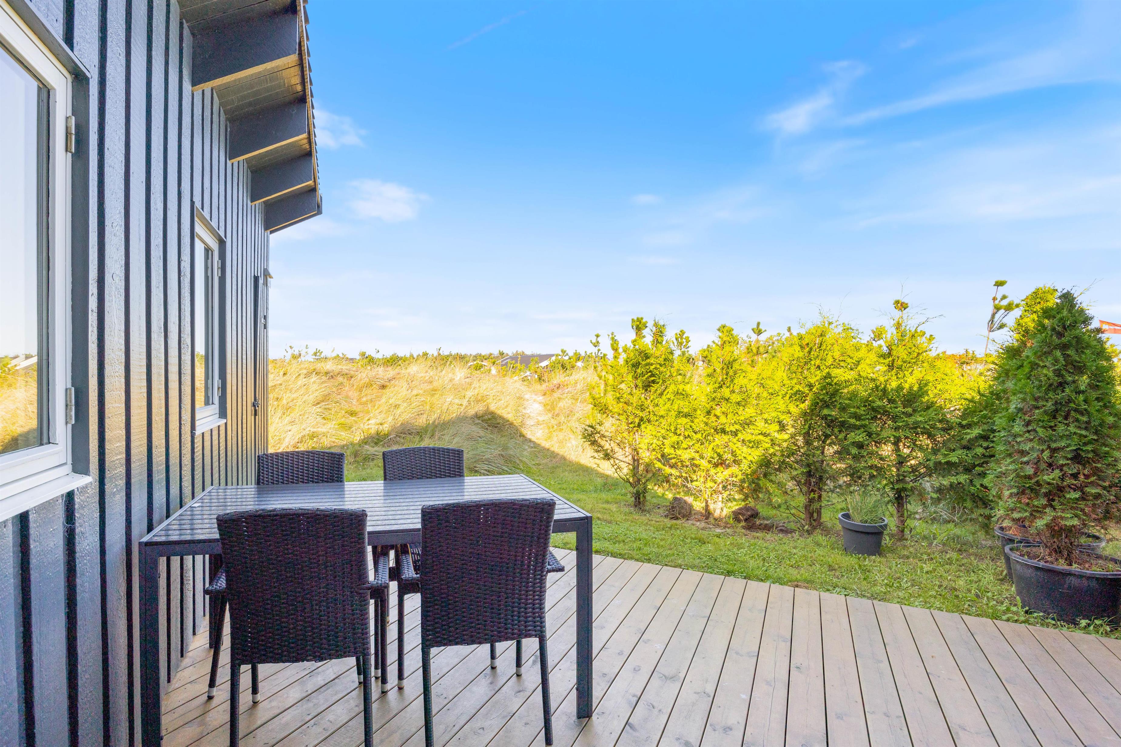 Den lukkede sydvendte terrasse er delvist overdækket og er udstyret med havemøbler og grill, så I kan nyde et lækkert grillmåltid i læ. Den lukkede terrasse er især praktisk, hvis du har småbørn med, som skal holdes under opsyn. Til de mindste er der også en sandkasse, som er placeret ved den nordøstvendte terrasse. Her kan du også nyde morgenkaffen til solopgangen, imens resten af familien stadig sover. På vestsiden er der endnu en hyggelig terrasse, hvor de sidste solstråler kan nydes.