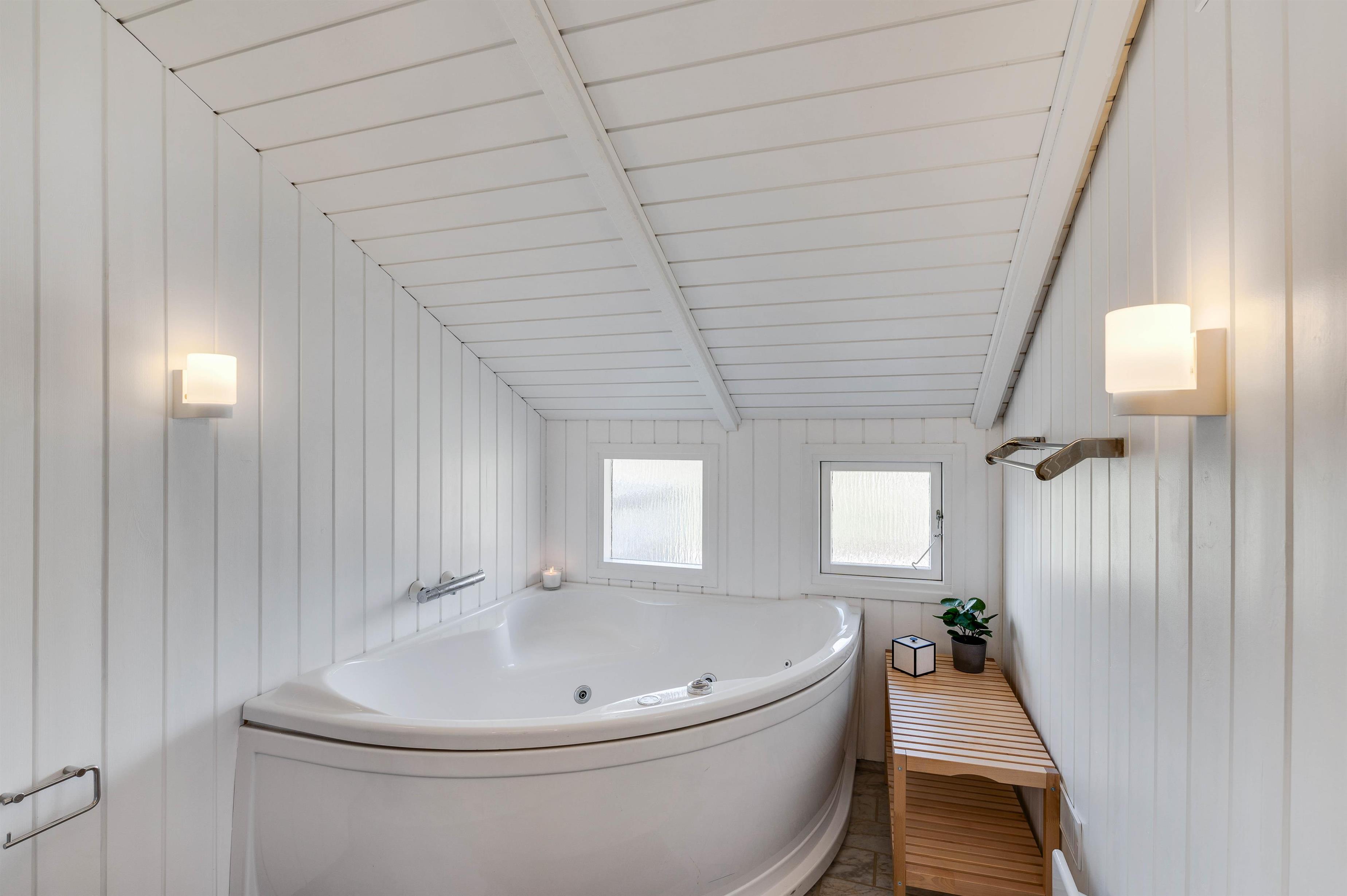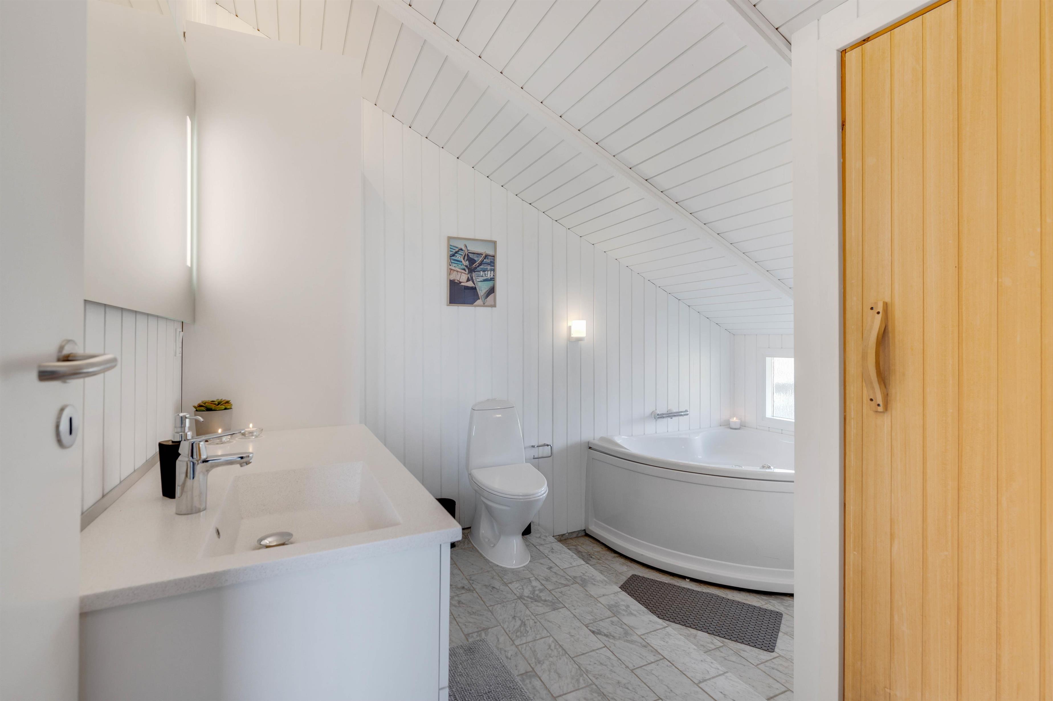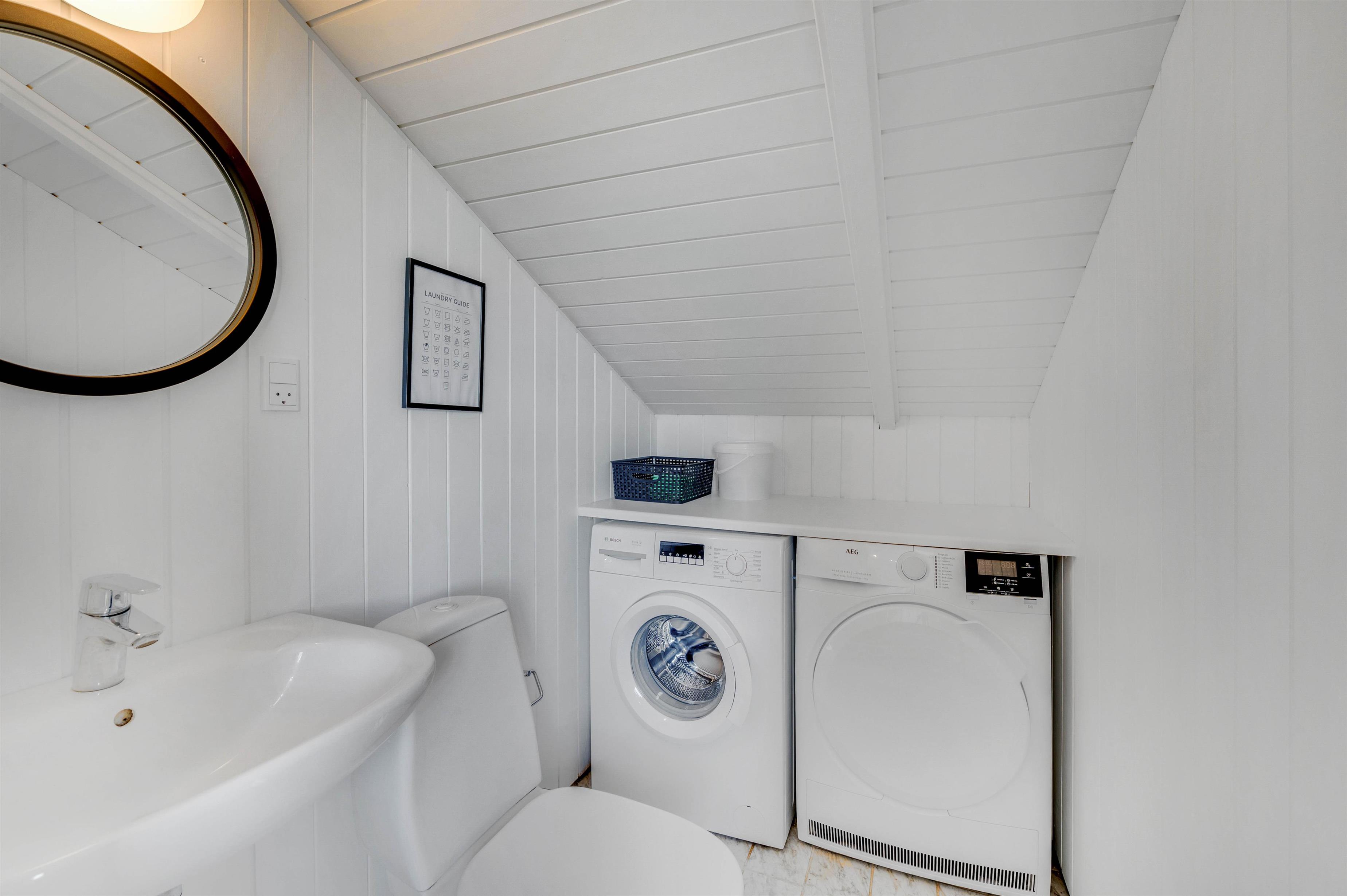 Sommerhuset har et rummeligt badeværelse, hvor der både er spabad samt sauna. Her kan I nyde en afslappende aften efter en god dag i den skønne natur. Derudover er der et gæstetoilet med vaskemaskine og tørretumbler, så I har mulighed for rent tøj under hele ferien.