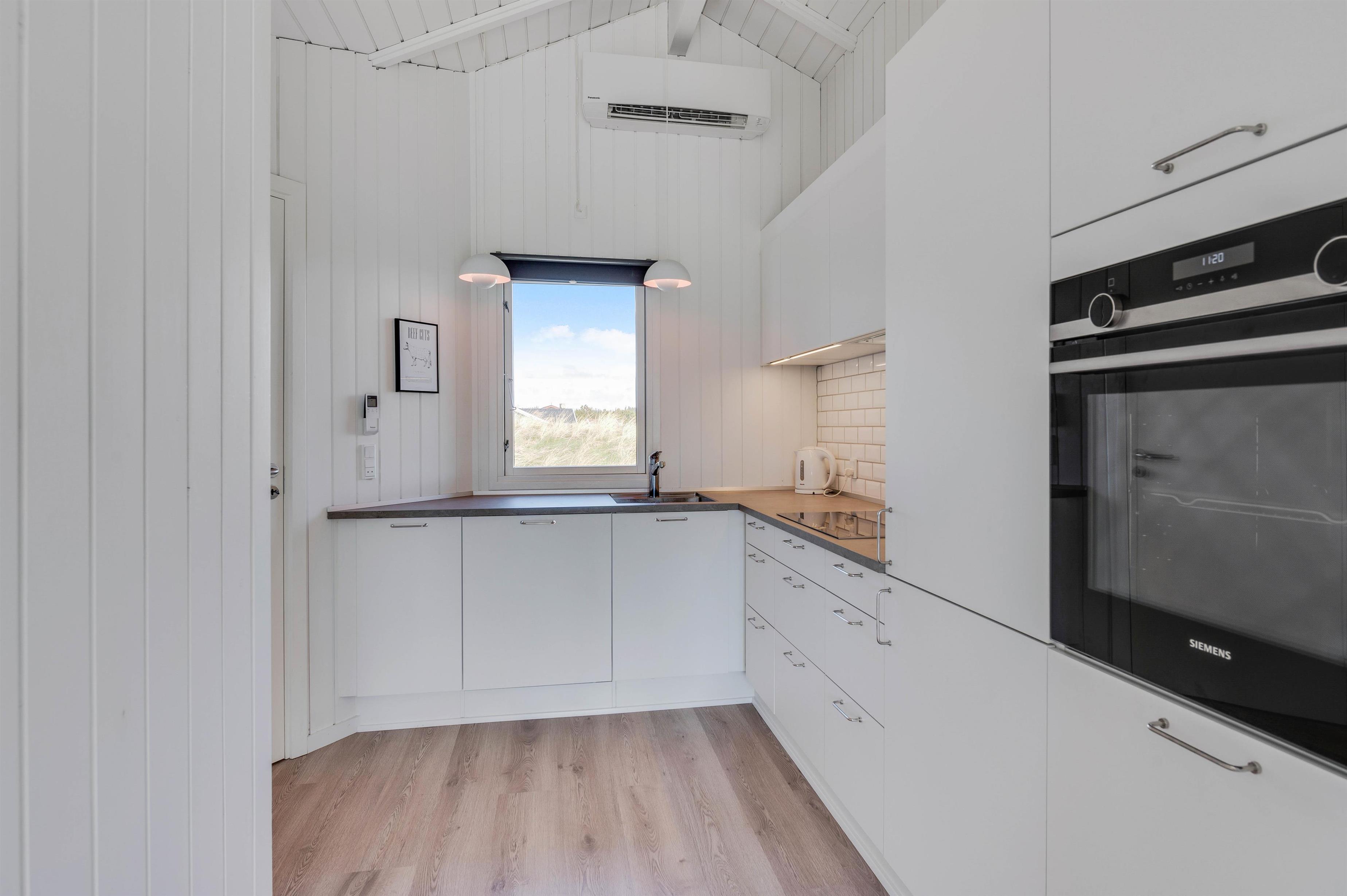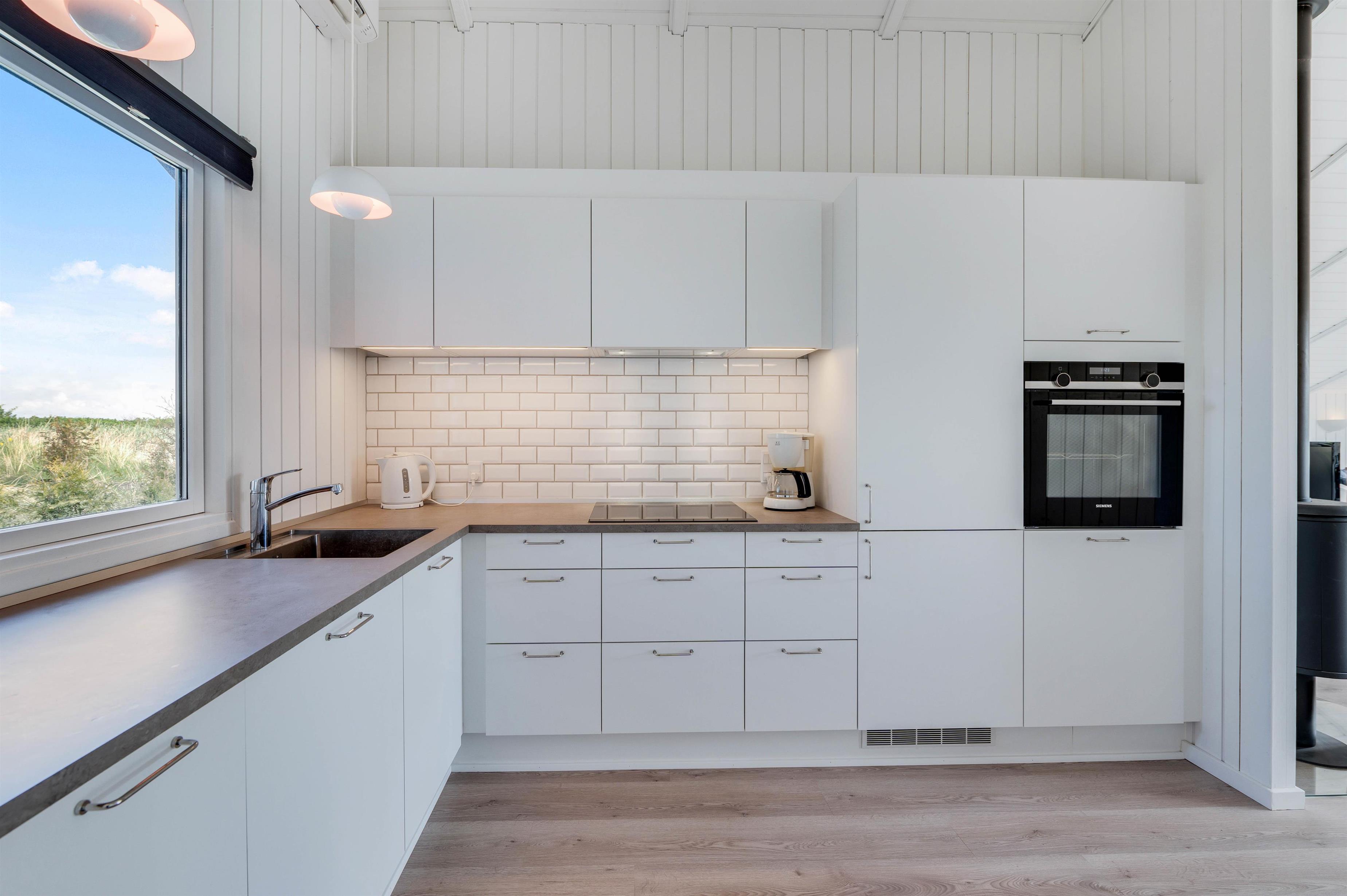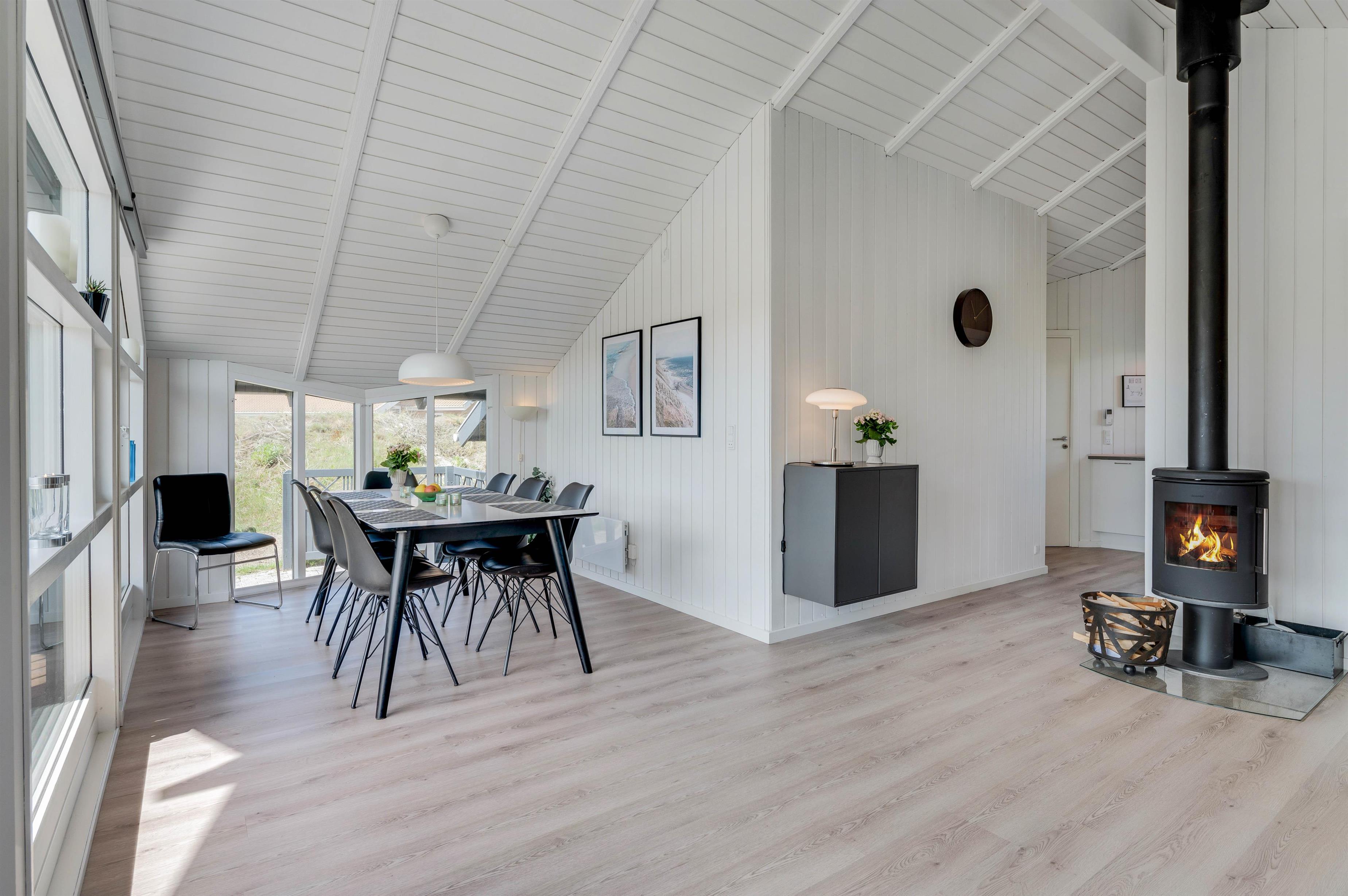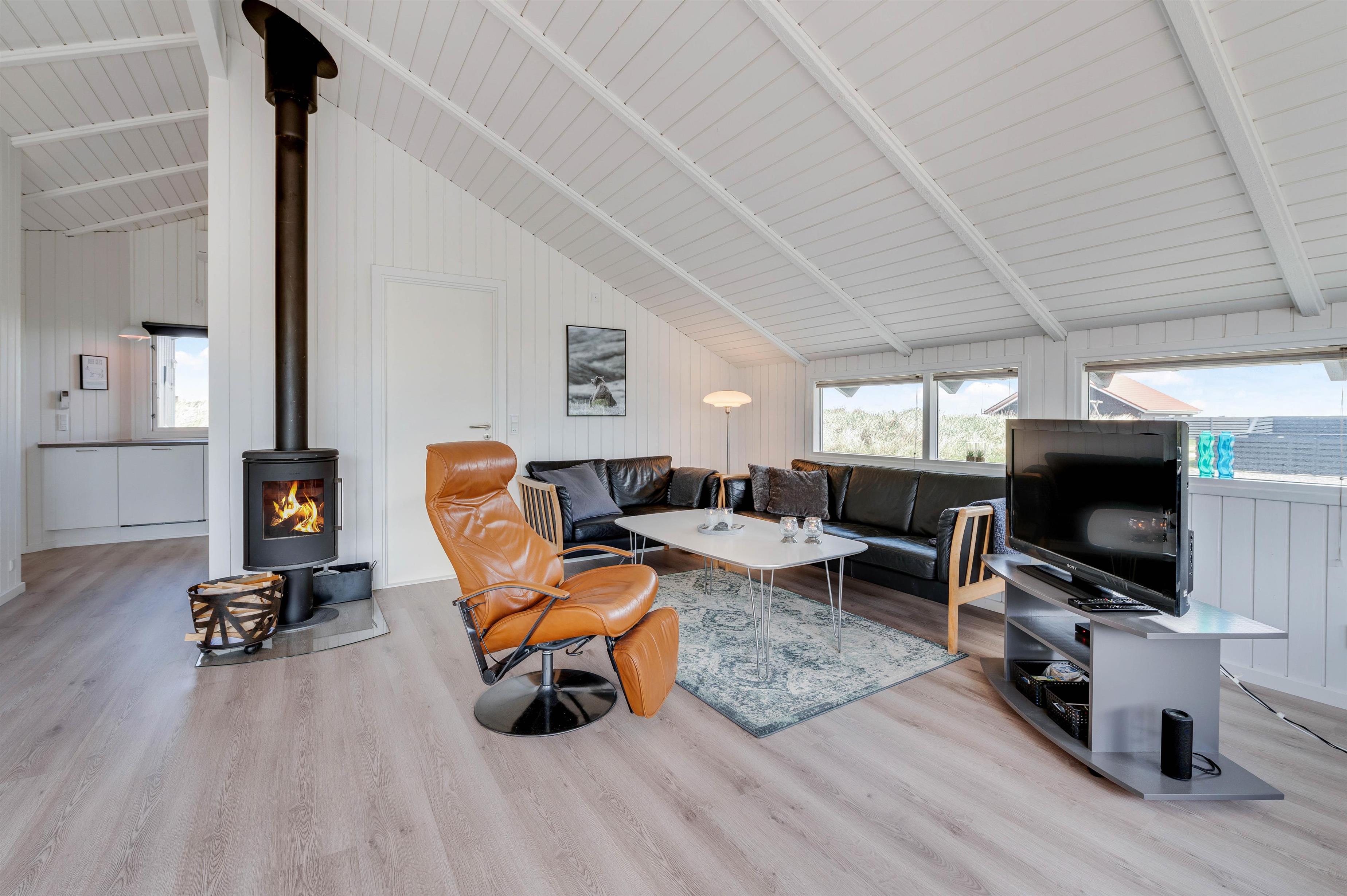 I stuen er der desuden en brændeovn, som spreder varme og ekstra hygge på en blæsende efterårsdag. Den lyse stue har trægulv, er i åben forbindelse med køkkenet og er indrettet med behagelige møbler. I køkken/alrum finder I også husets varmepumpe, der er med til at holde en behagelig temperatur året rundt.