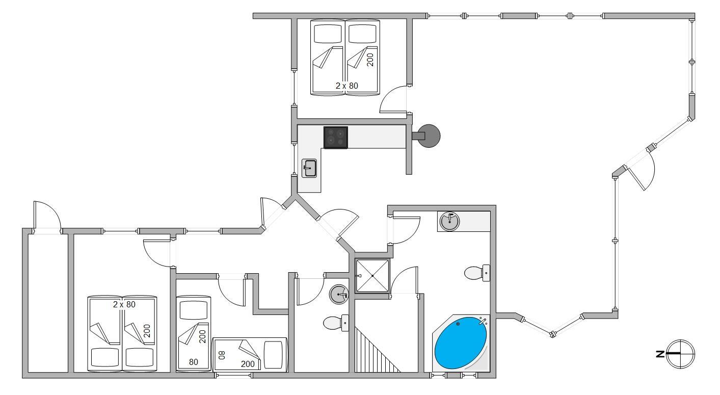 I den sydlige del af Bjerregård ligger dette hyggelige sommerhus, som har en lys og venlig indretning. Rundt om sommerhuset er der dejlige terrasser, hvor I kan nyde solen og den friske luft. Der er brændeovn i opholdsrummet og på badeværelset er der både sauna og spabad.