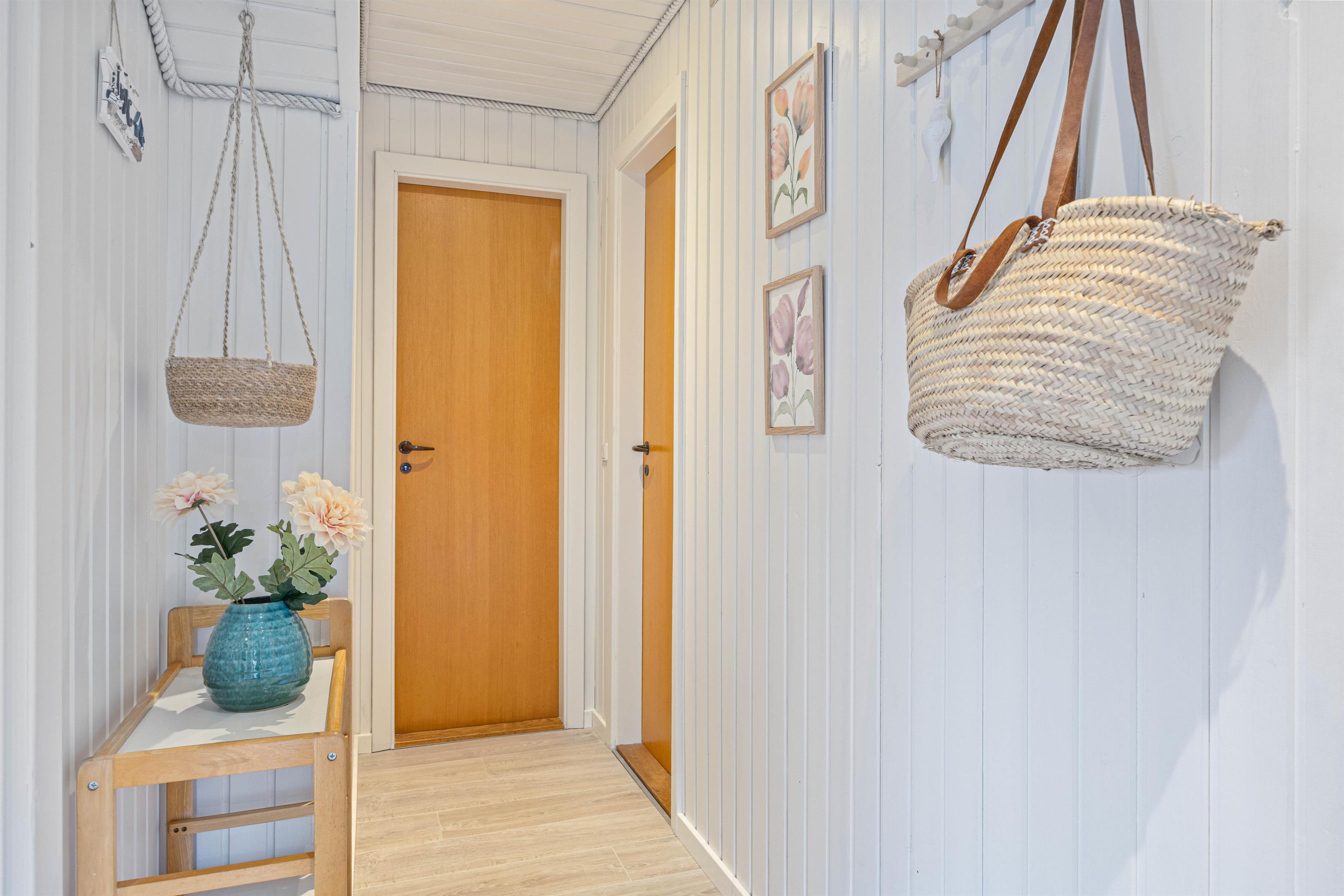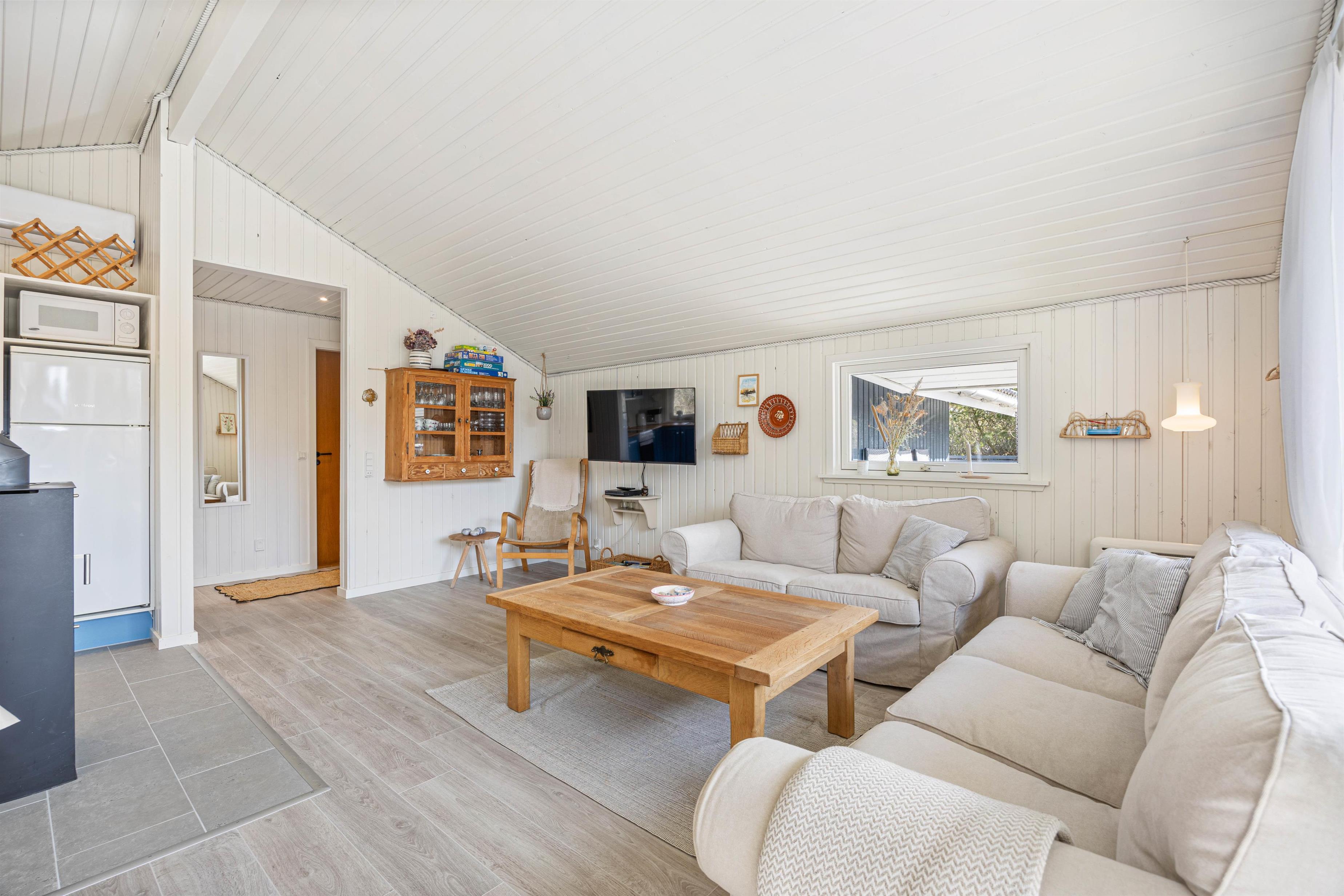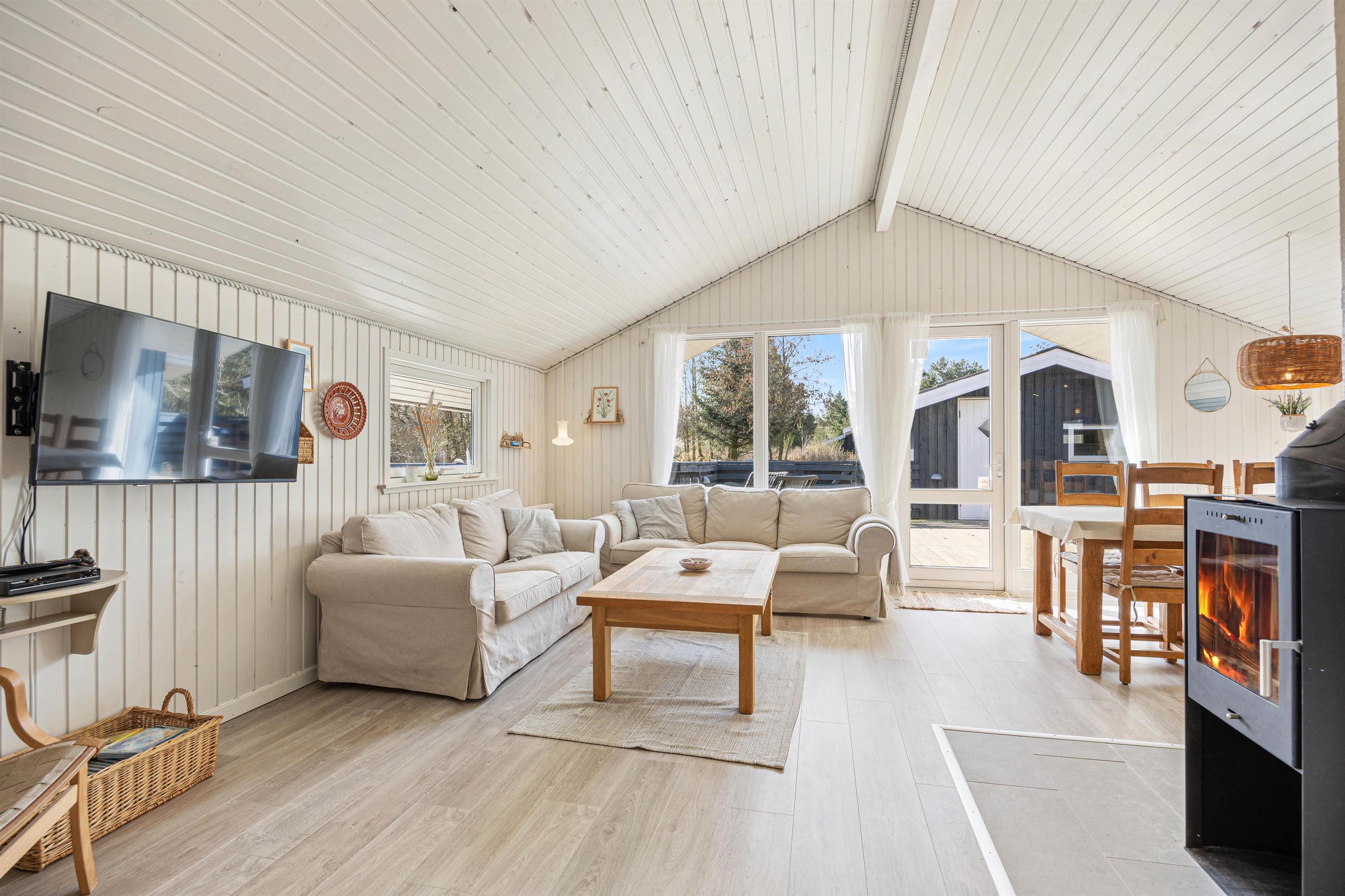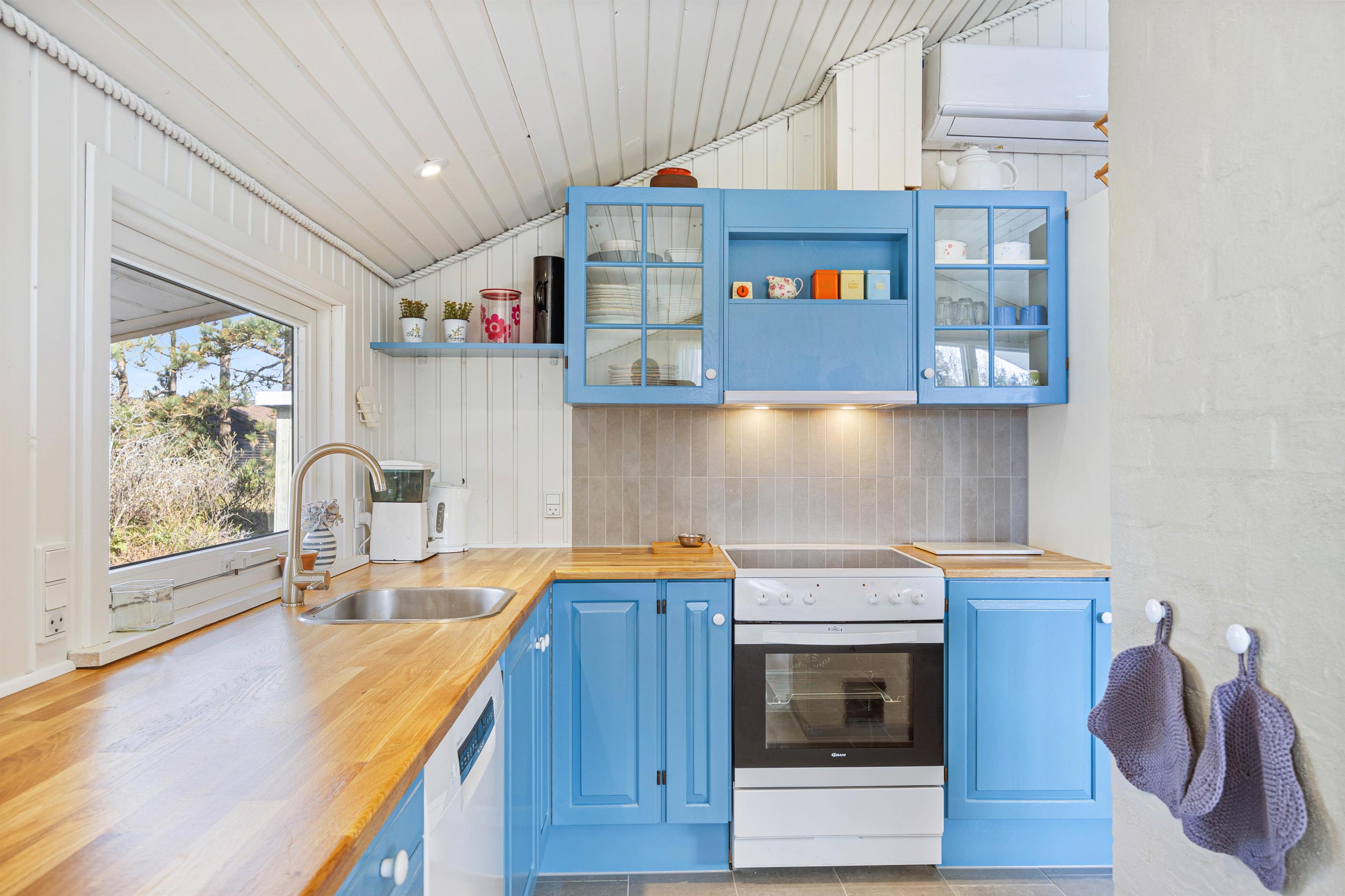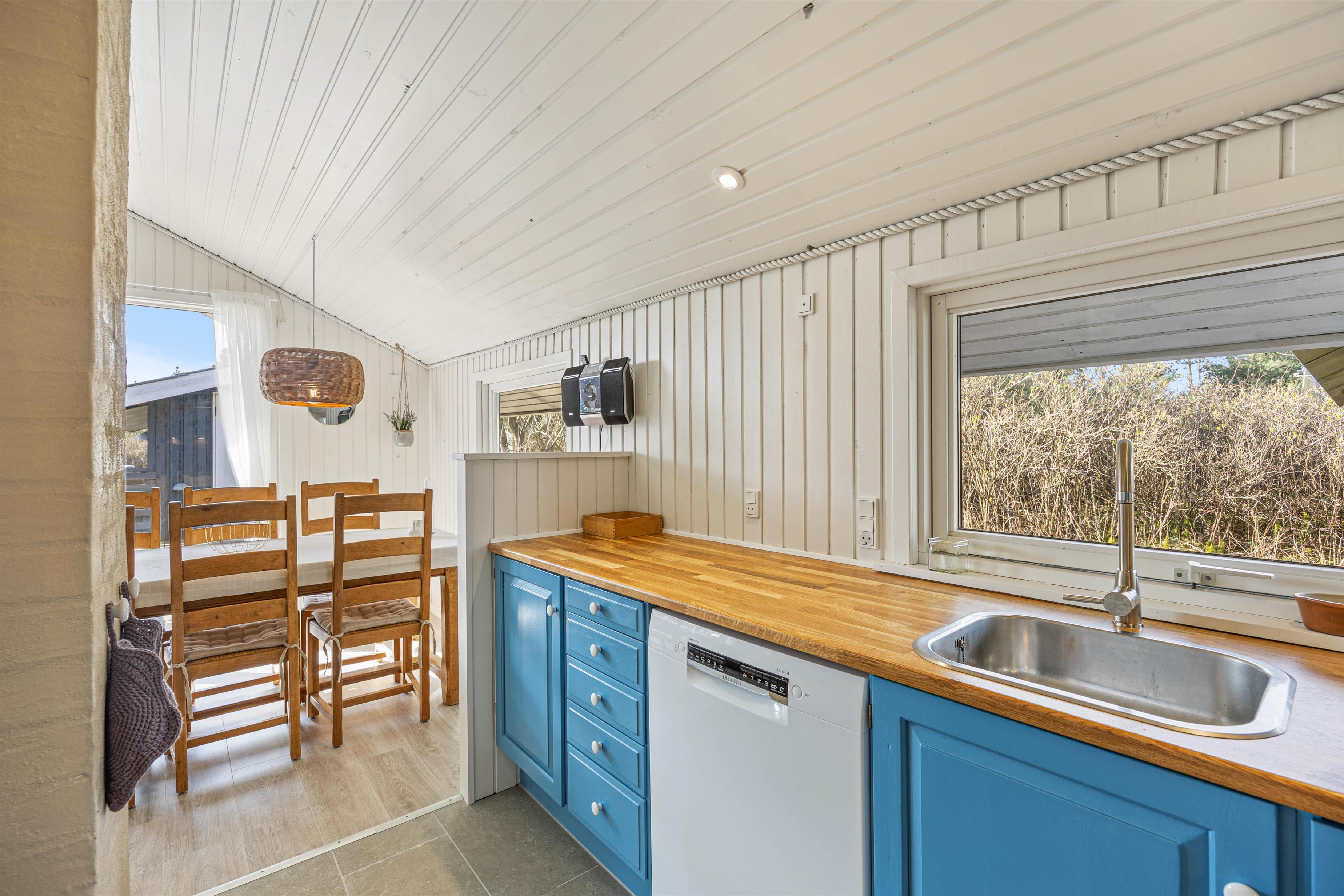 Når I træder ind i sommerhuset, vil I straks bemærke den hyggelige brændeovn, som er perfekt til at skabe stemningen på køligere aftener. Det flotte, blå køkken indeholder alt, hvad I behøver for at forkæle hinanden med lækre måltider, herunder opvaskemaskine.