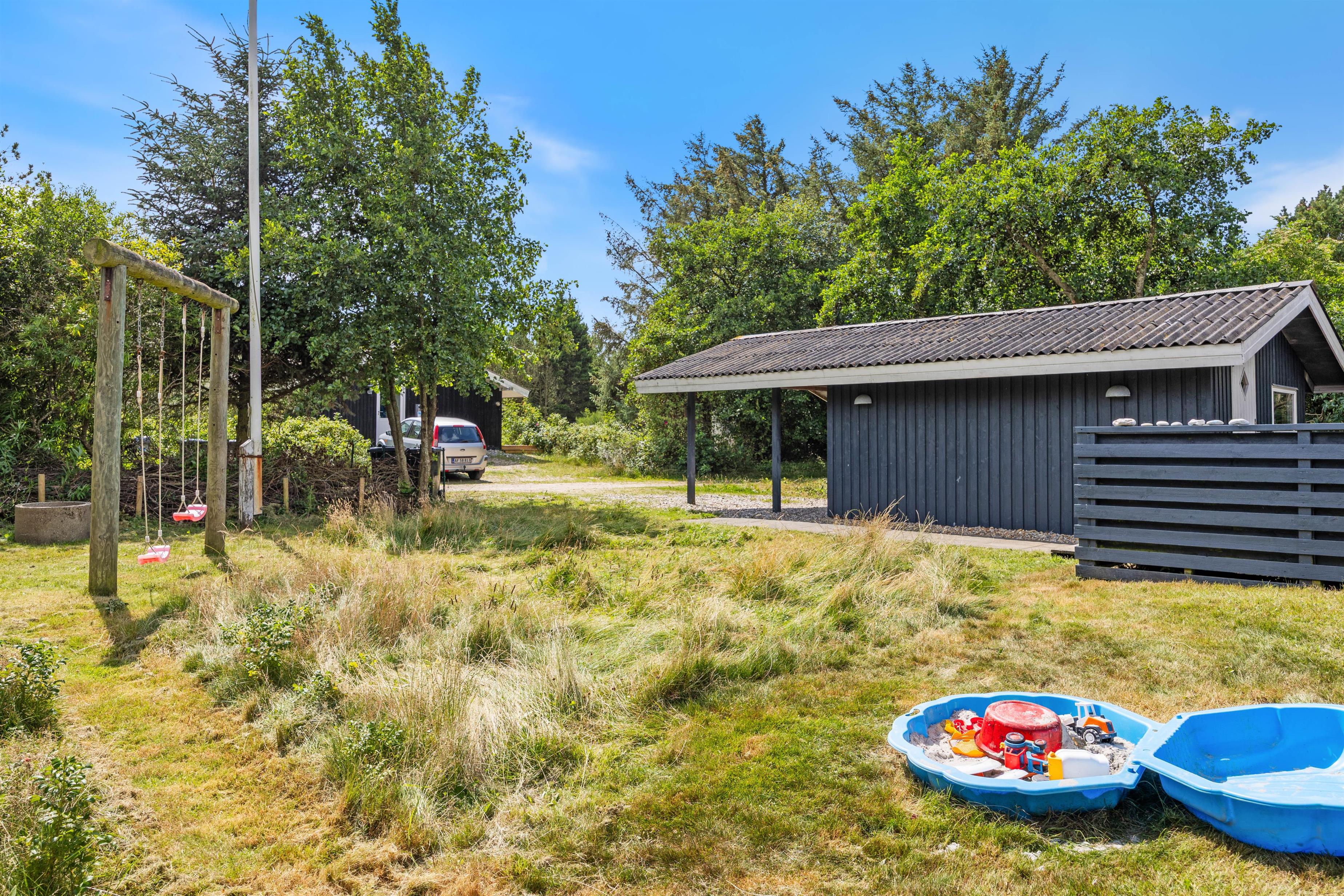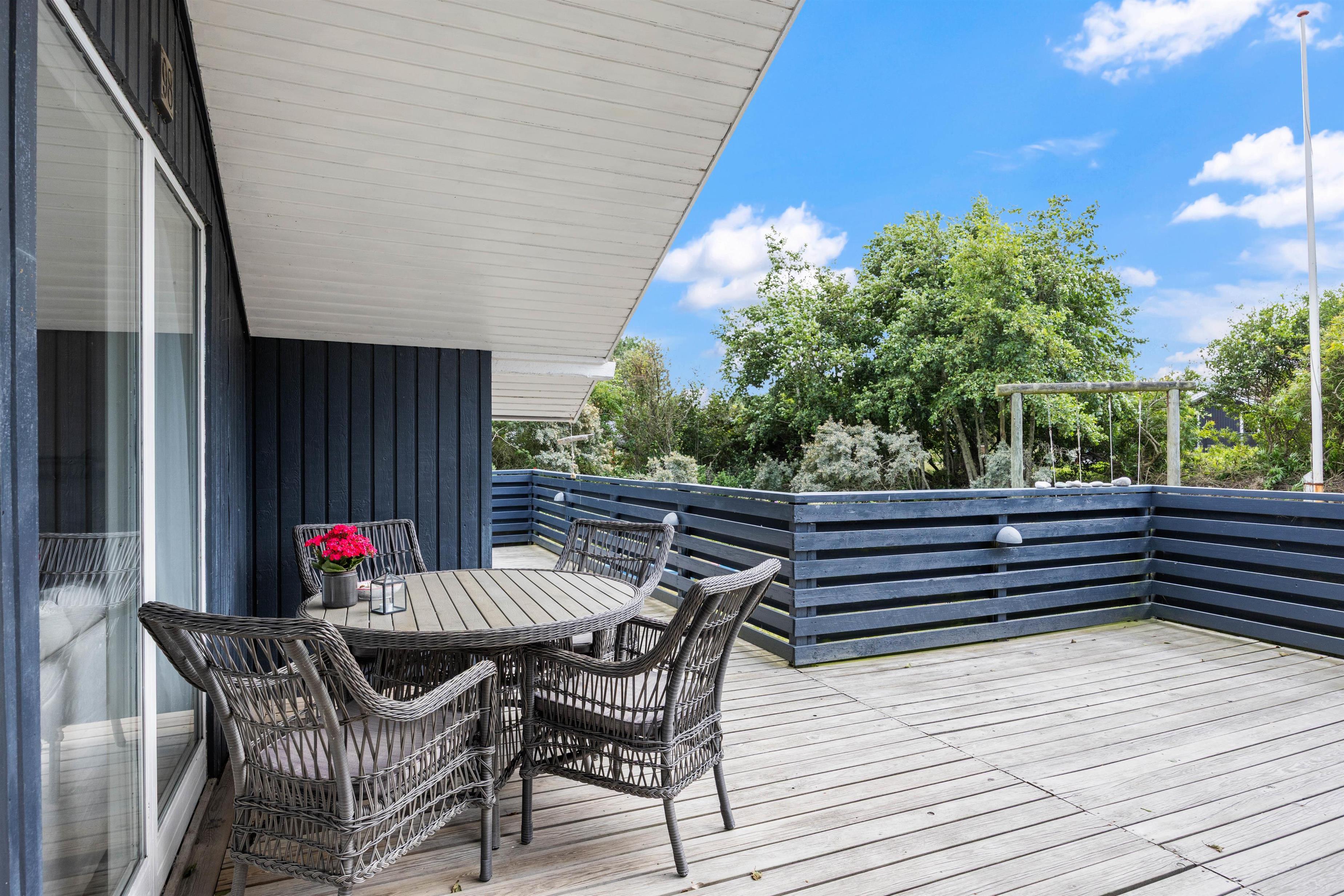 Ud over hyggen indendørs, kan I nyde plænegrunden på godt 1200 m2, hvor børnene kan lege, og hunden kan løbe frit. Udendørs finder I også et gyngestativ til de yngste samt en overdækket og en afskærmet terrasse, der gør det muligt at nyde grillmad i det fri uanset vejret.