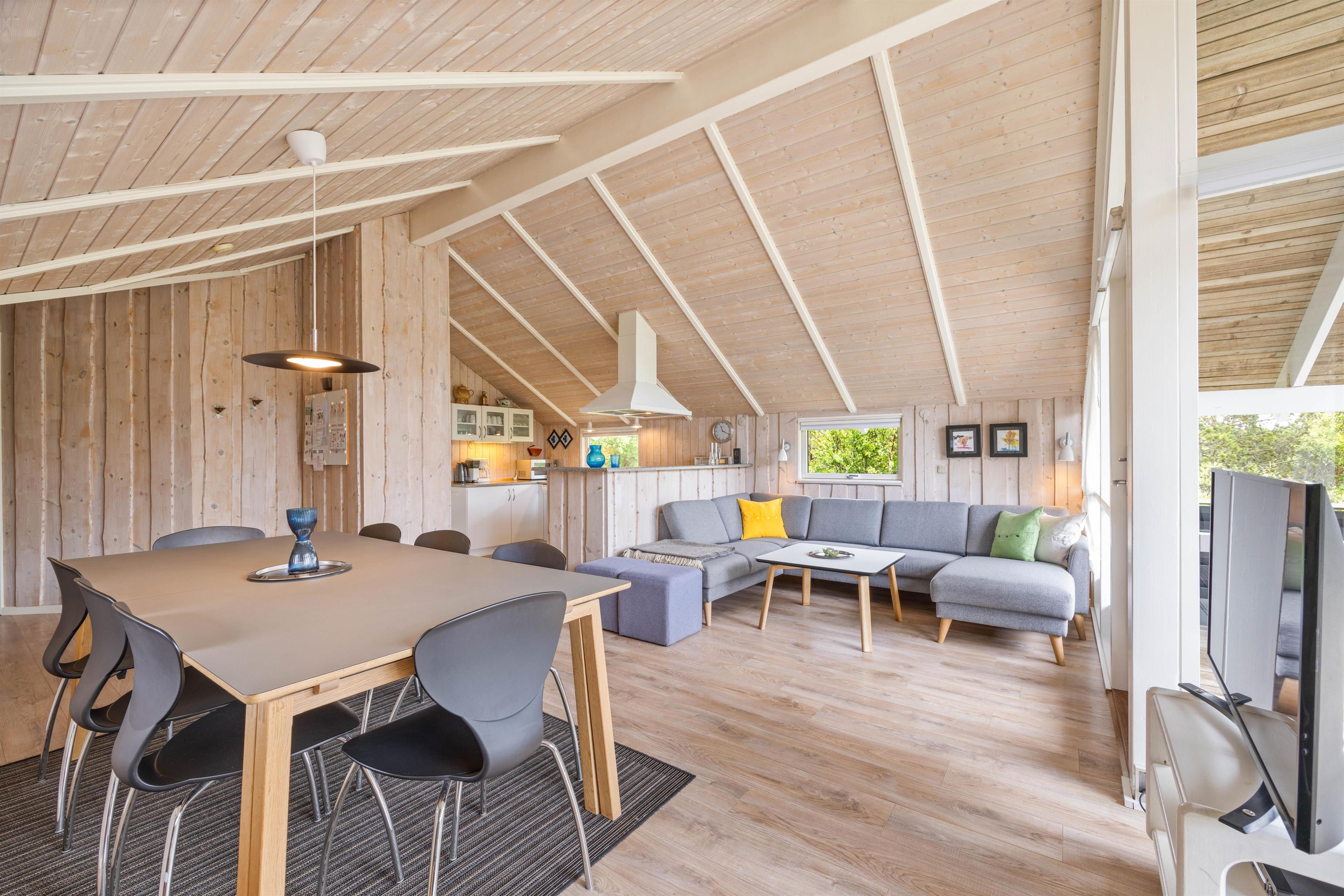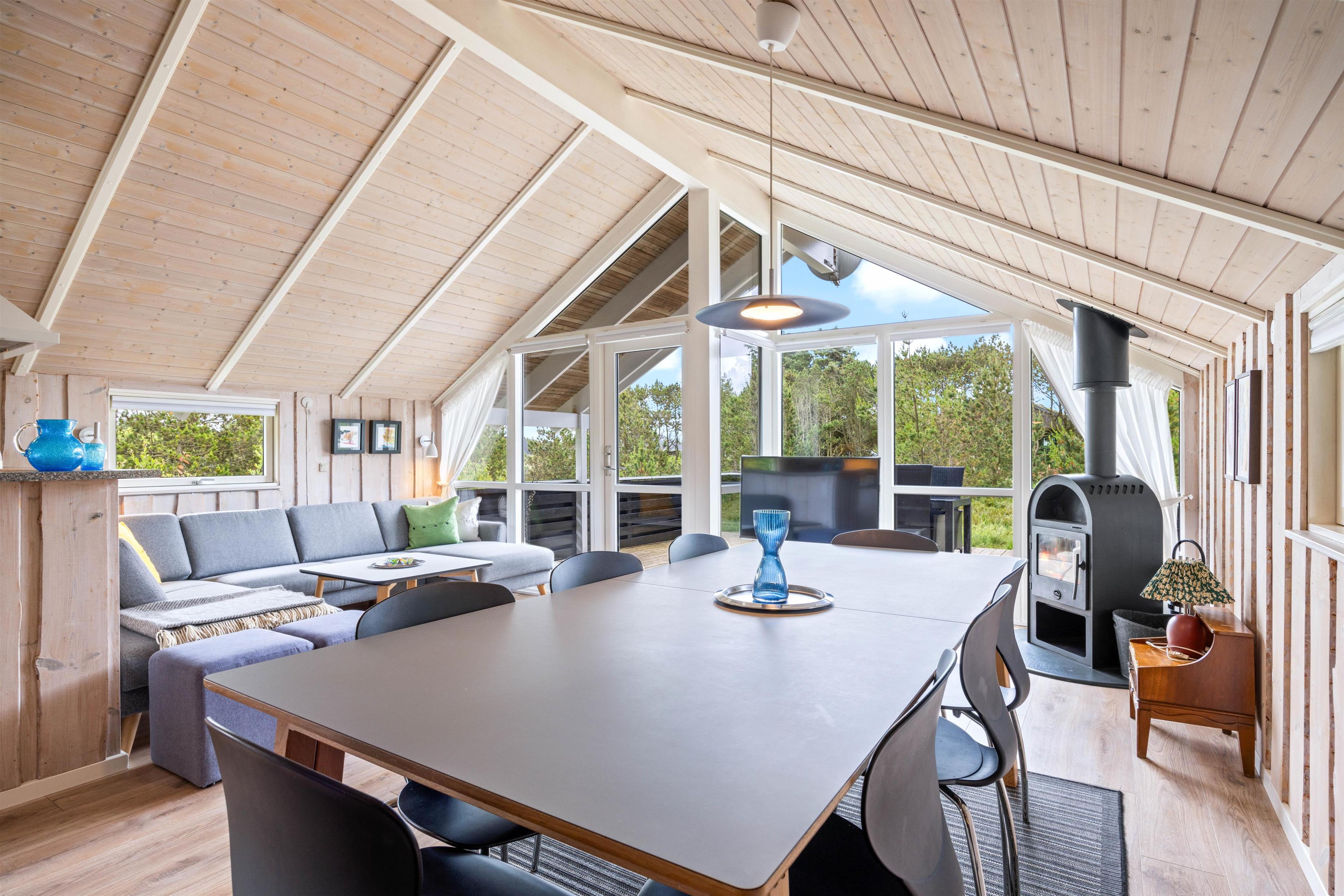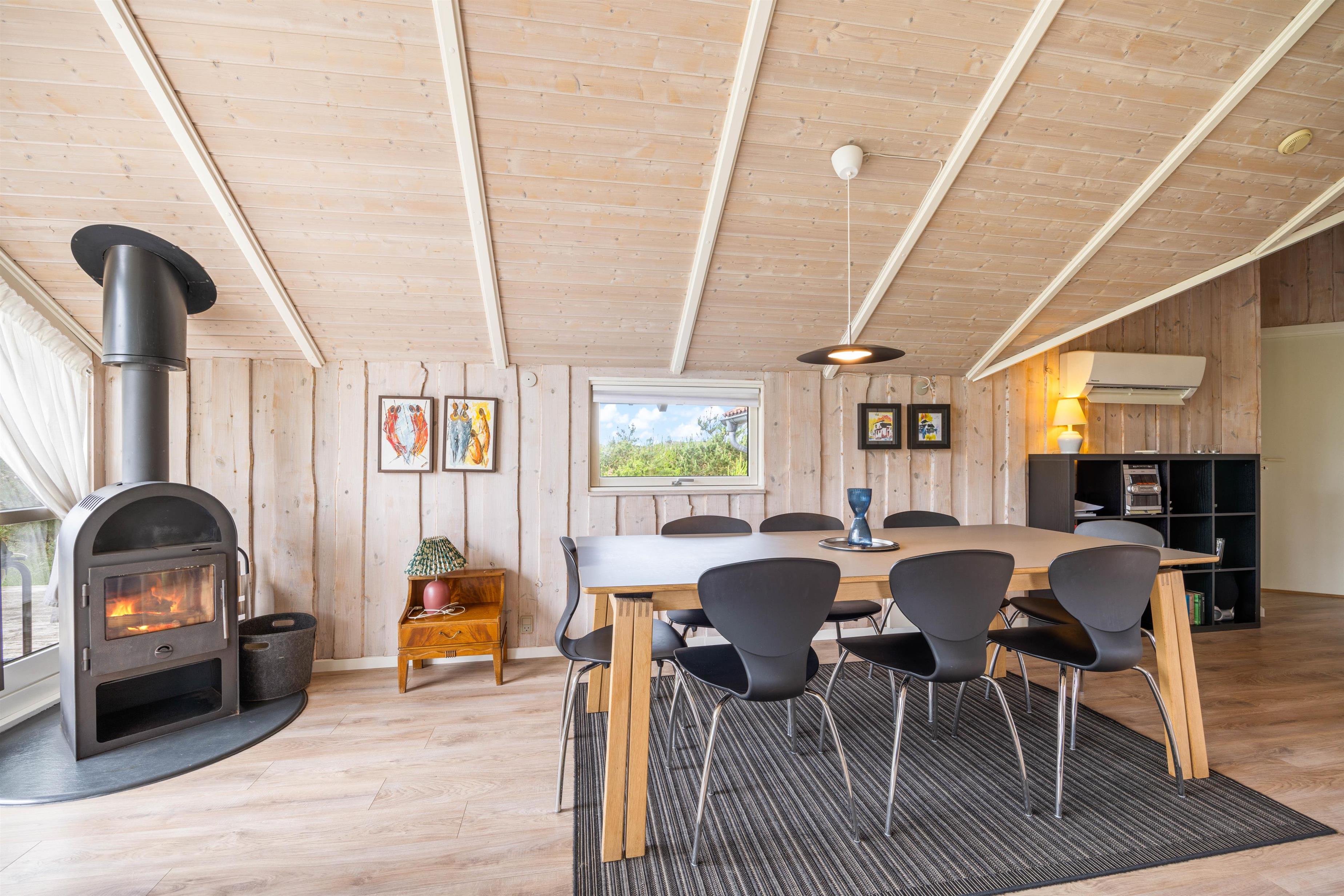 Sommerhuset er lyst og venligt indrettet, og alrummet vil blive jeres samlingsrum i løbet af ferien. Her kan hele familien samles til hyggelige stunder, hvad enten det er til madlavning i køkkenet, spil ved spisebordet eller afslapning i sofaen med en god film i fjernsynet. Det store, vestvendte vinduesparti skaber et godt lysindfald til rummet, og brændeovnen sætter prikken over i'et til ferietemningen.