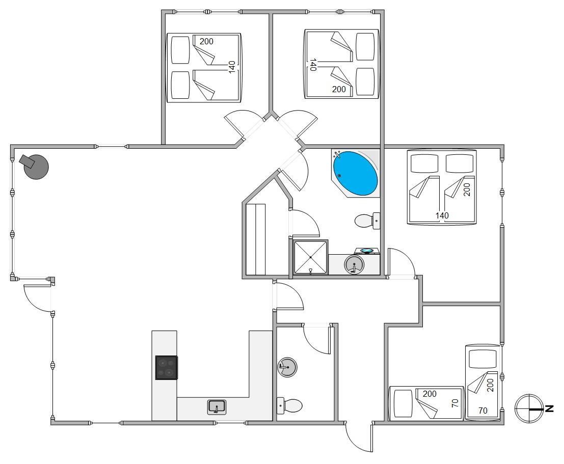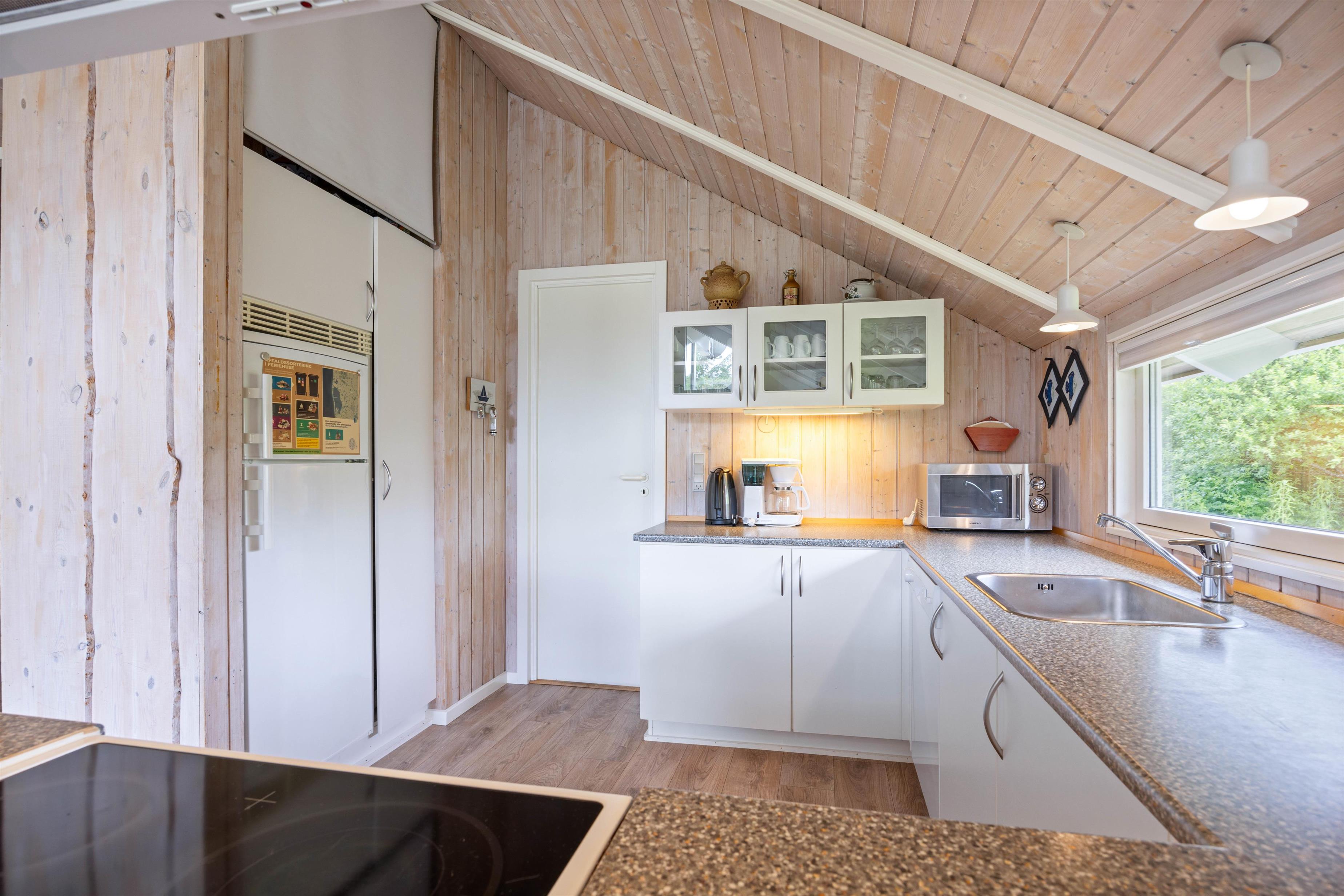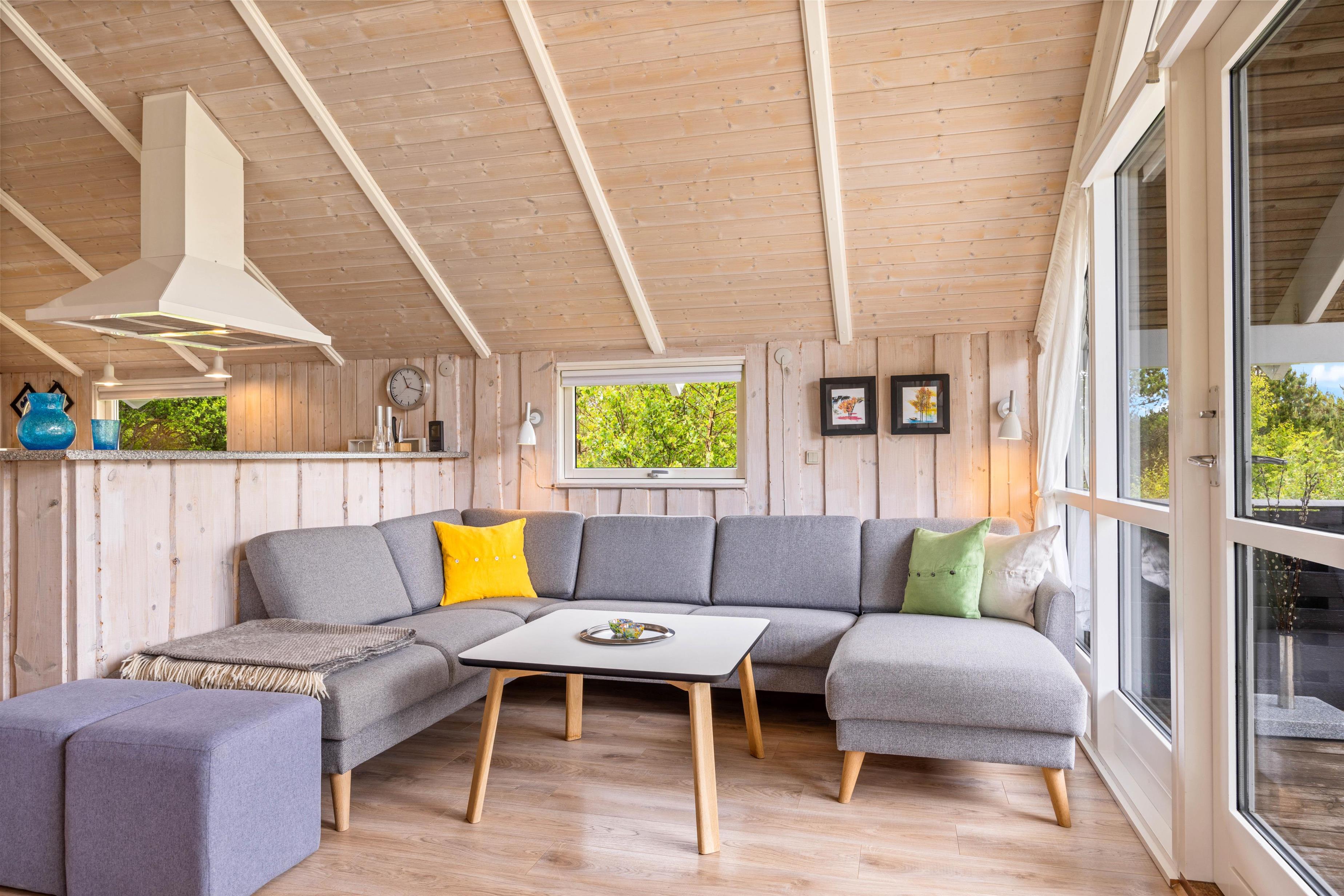 Sommerhuset er lyst og venligt indrettet, og alrummet vil blive jeres samlingsrum i løbet af ferien. Her kan hele familien samles til hyggelige stunder, hvad enten det er til madlavning i køkkenet, spil ved spisebordet eller afslapning i sofaen med en god film i fjernsynet. Det store, vestvendte vinduesparti skaber et godt lysindfald til rummet, og brændeovnen sætter prikken over i'et til ferietemningen.