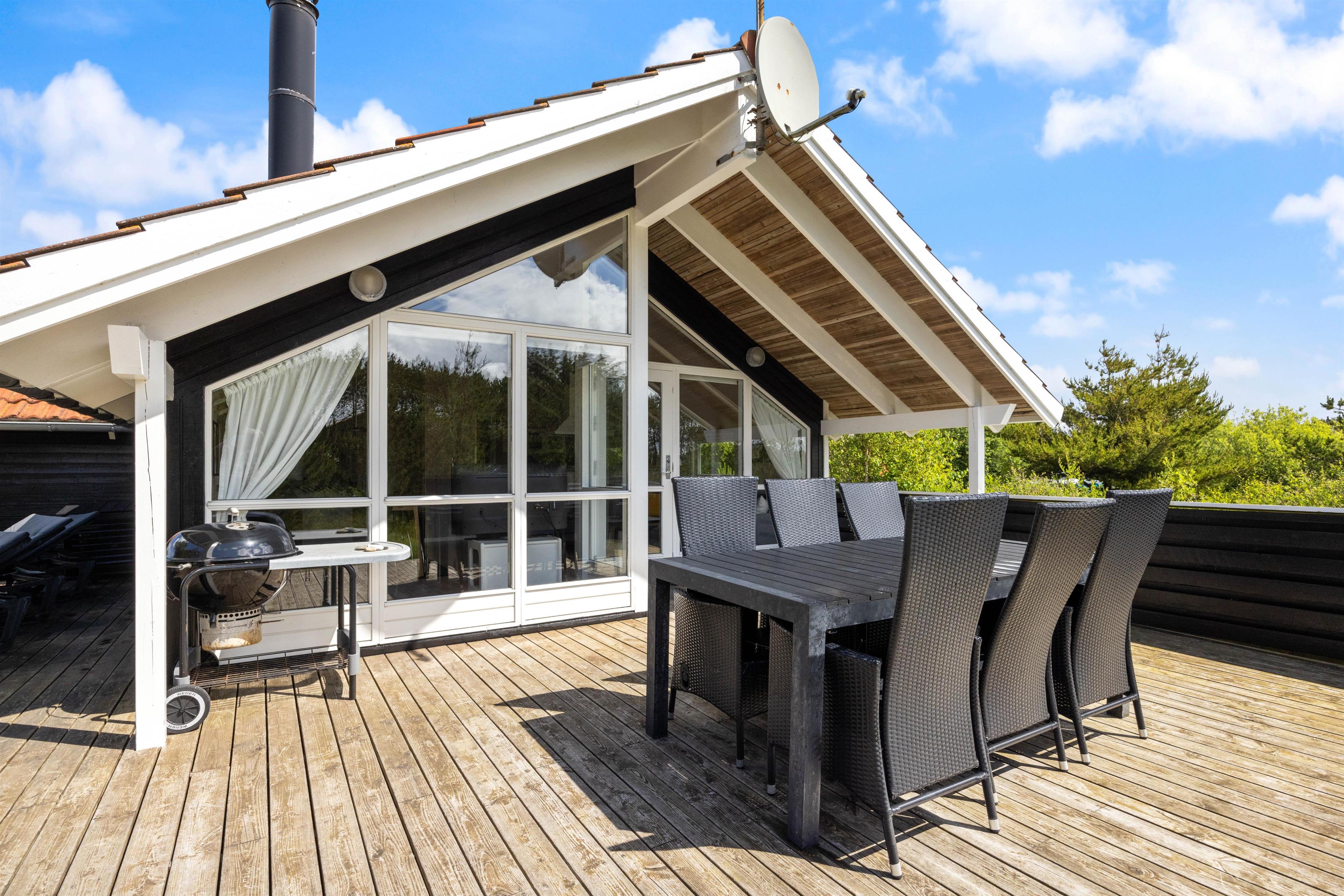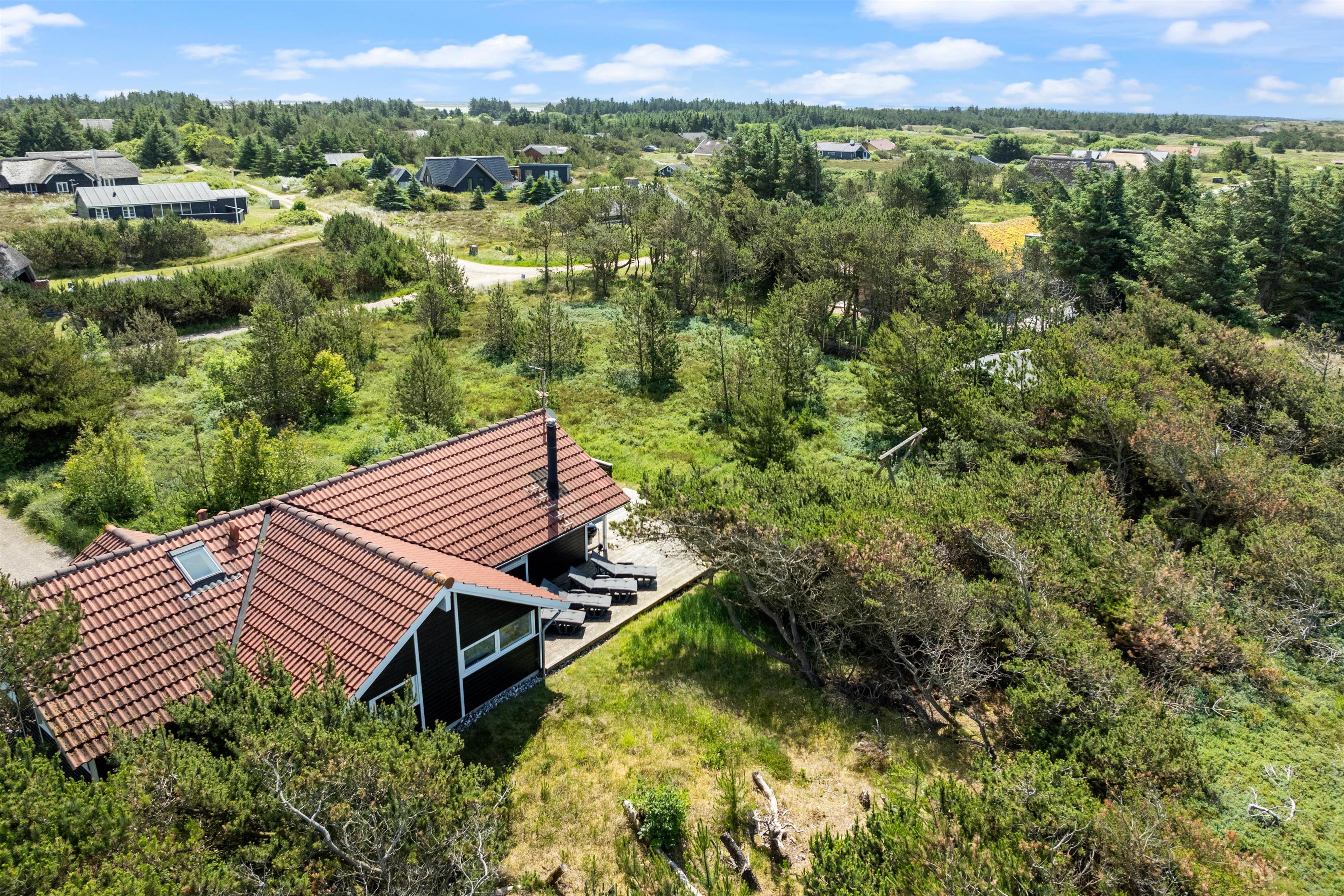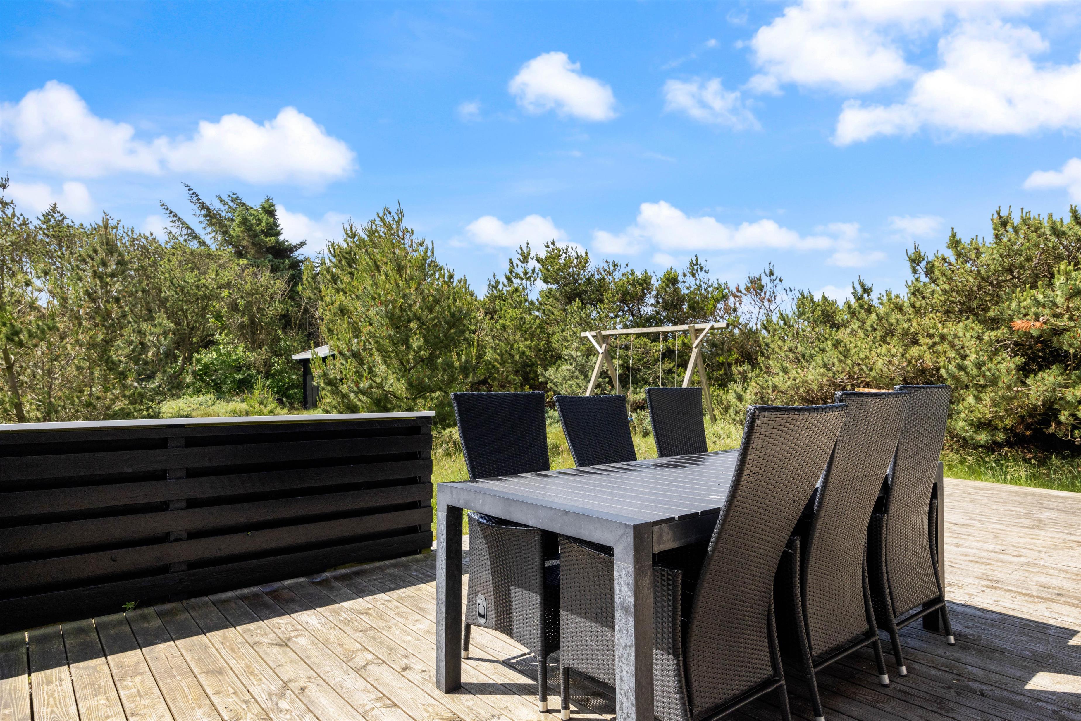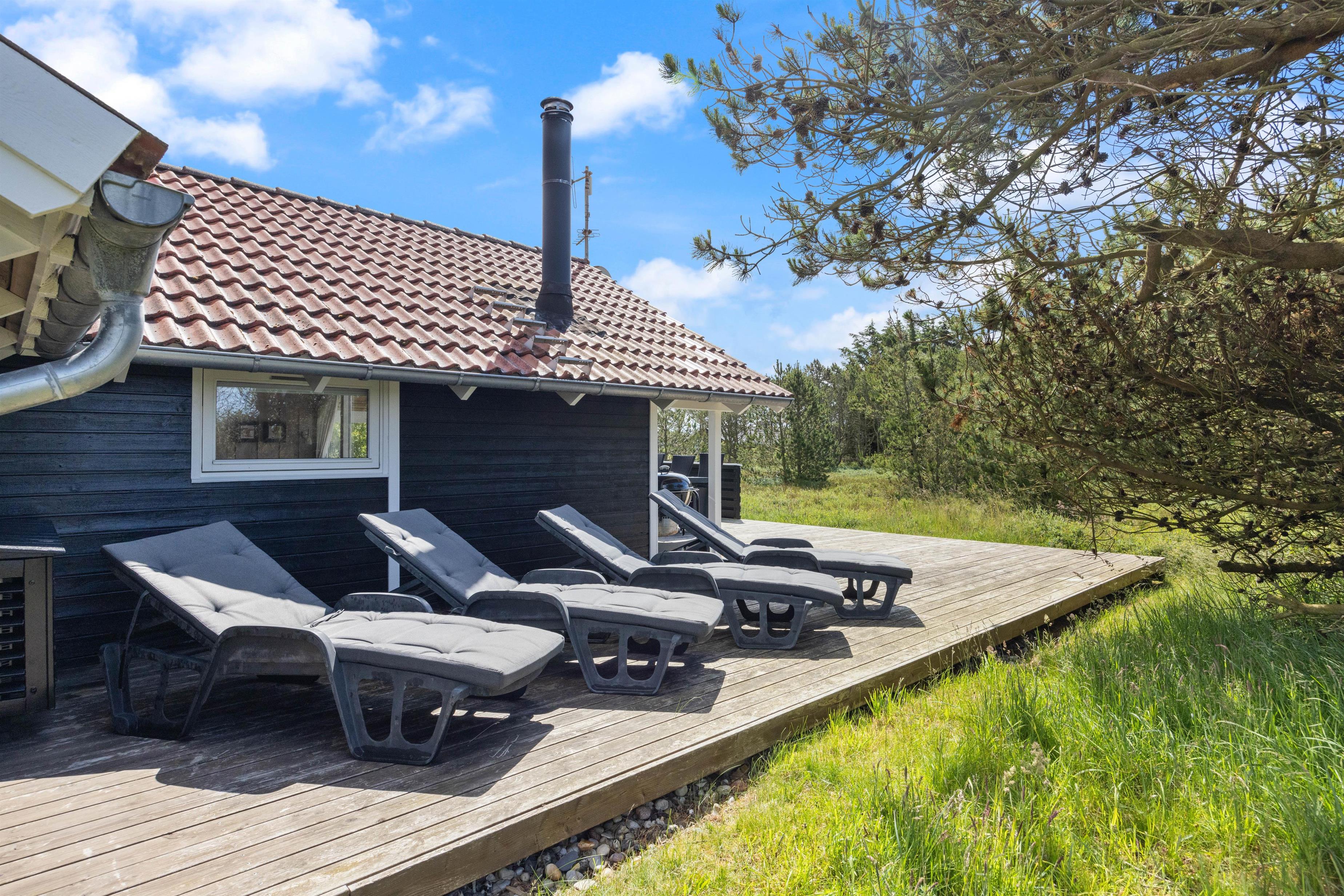 Fra sommerhusets opholdsrum har I udgang til sommerhusets store terrasse, der er delvist overdækket. Herfra kan I nyde sommersolens stråler med en kølig drink eller en god kop kaffe, mens børnene leger. Naturgrunden byder både på sandkasse og gyngestativ til familiens yngste, som I kan holde øje med fra liggestolene.