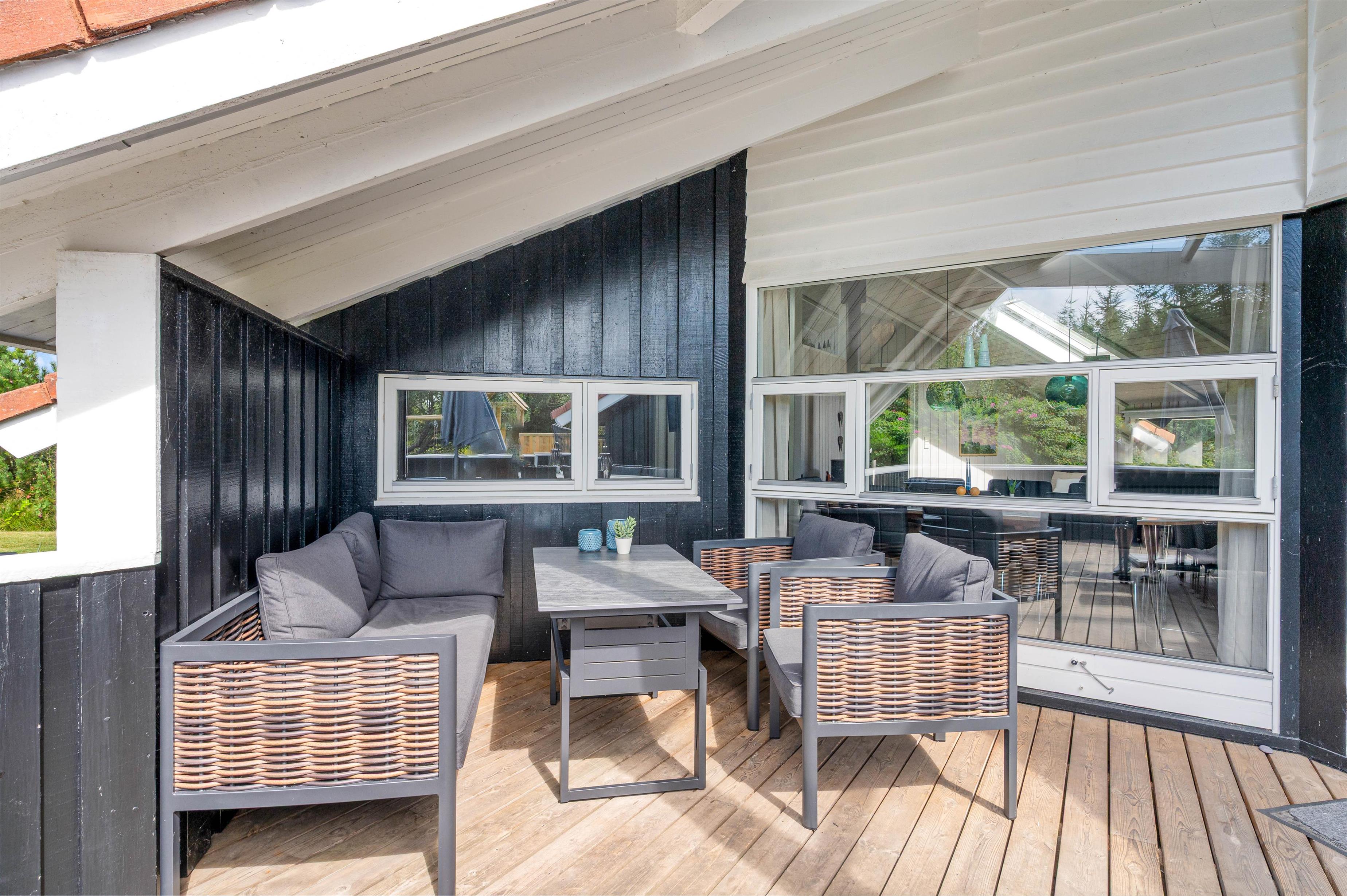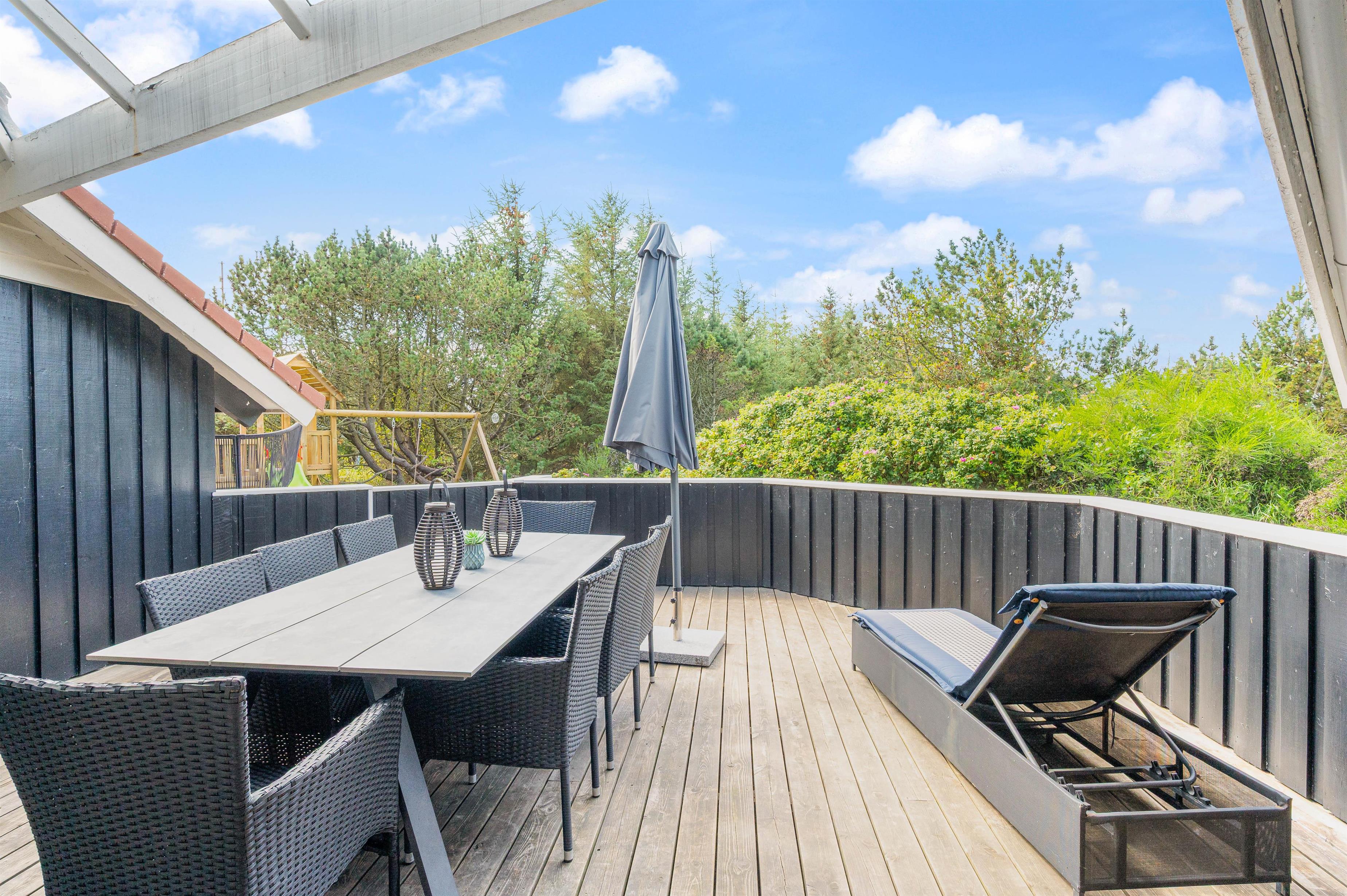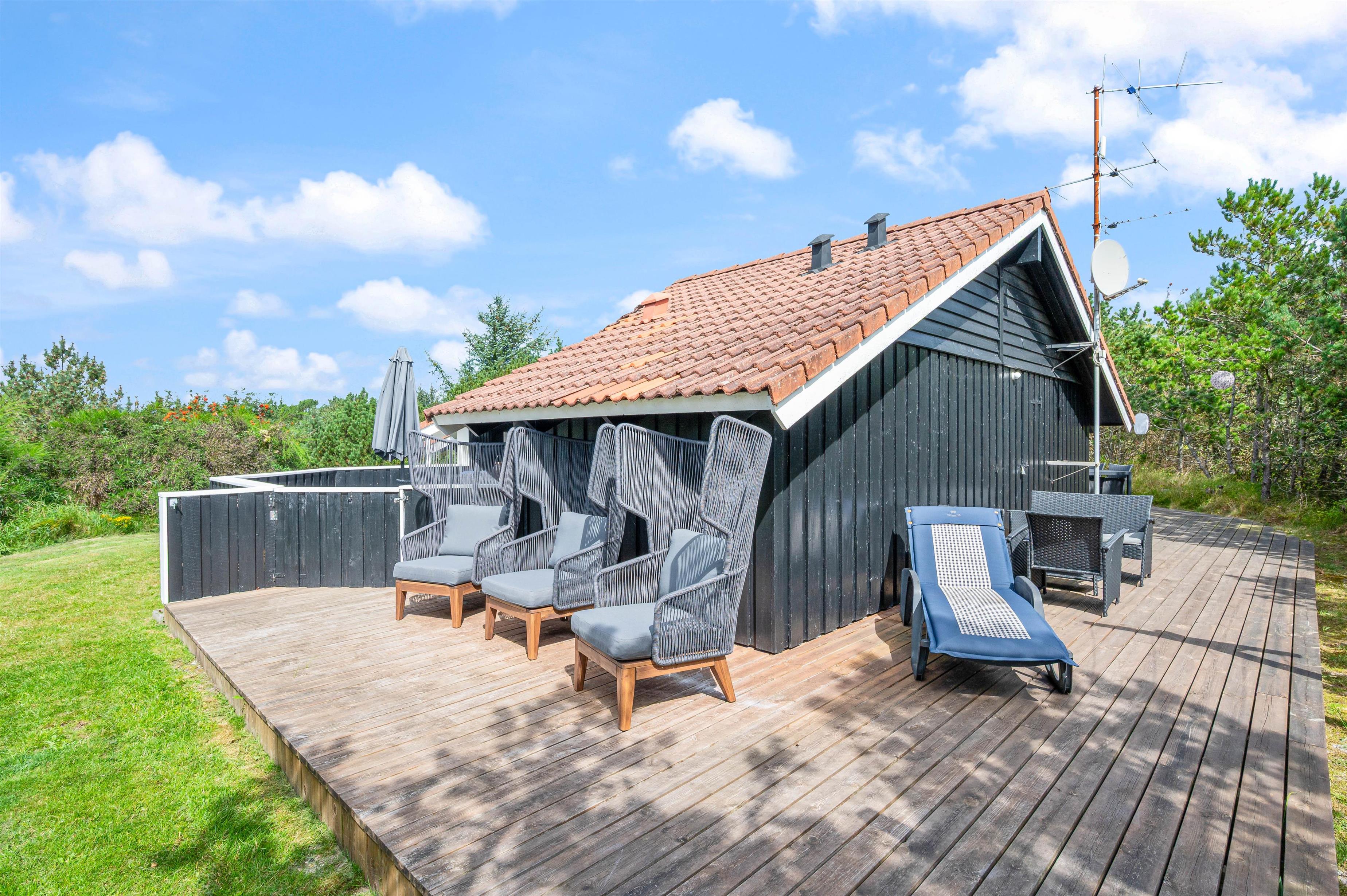 Beliggenheden på Holmsland Klit mellem Nordsøen og Ringkøbing Fjord i det naturskønne Vestjylland er den optimale for nydelse af solen og den friske, salte havluft på en afskærmet og delvis overdækket terrasse med fine havemøbler, som indbyder til hyggelige grillaftener. På den store naturgrund er der både sandkasse og gyngestativ til børnene.