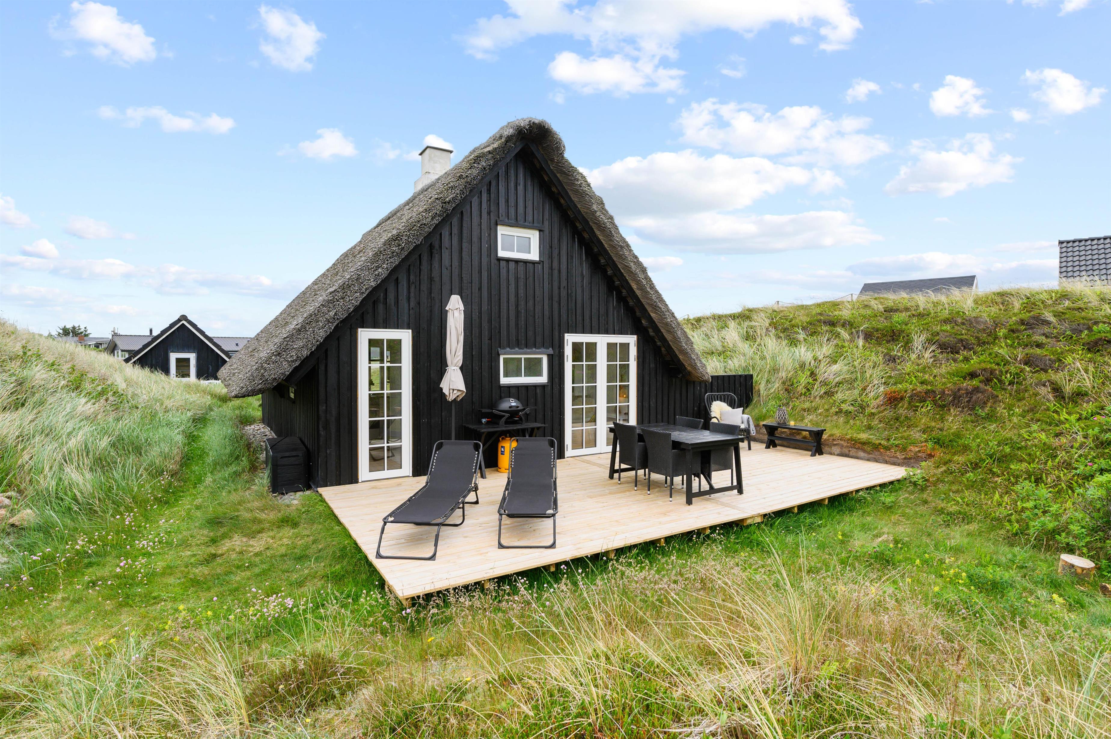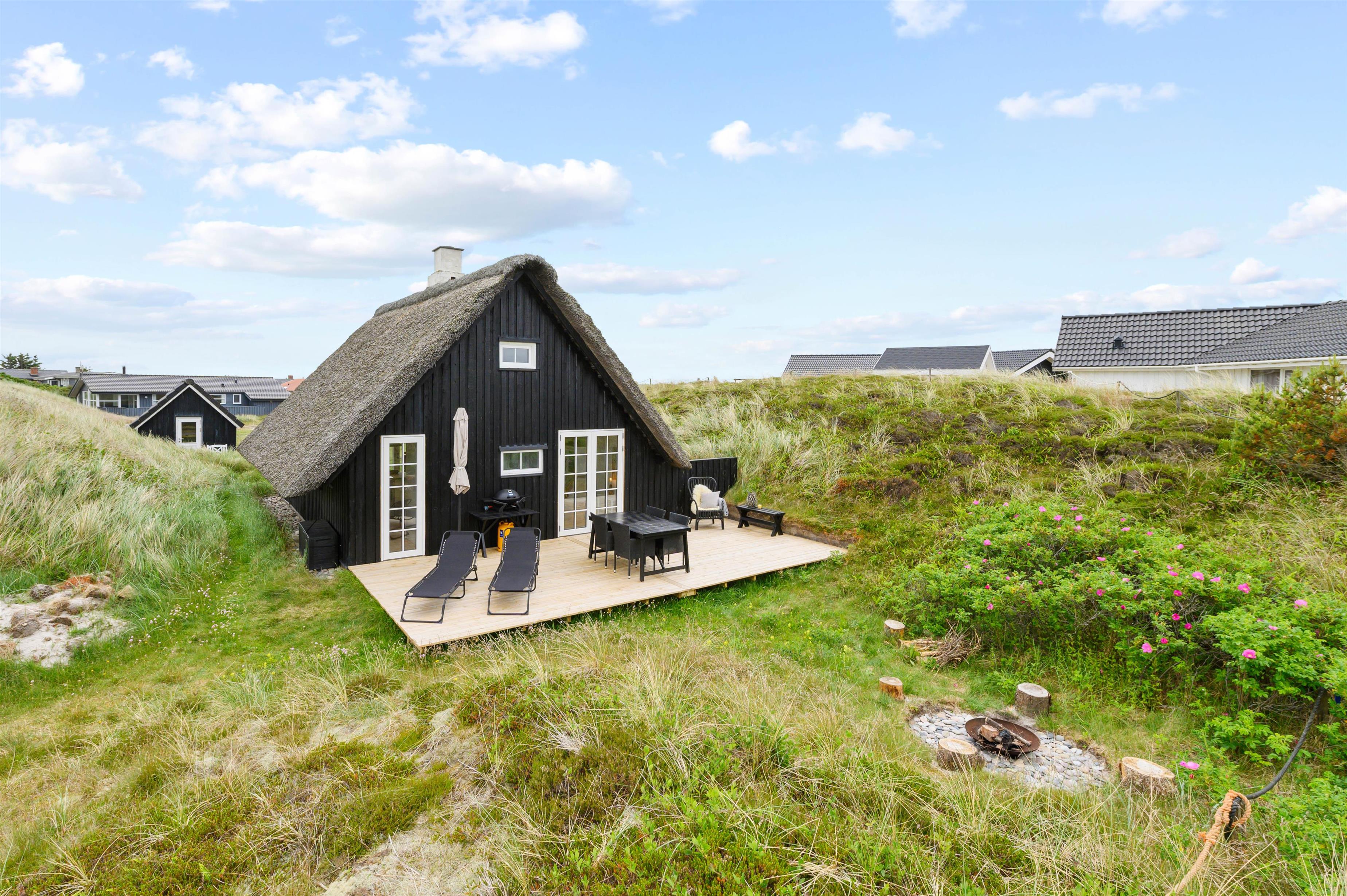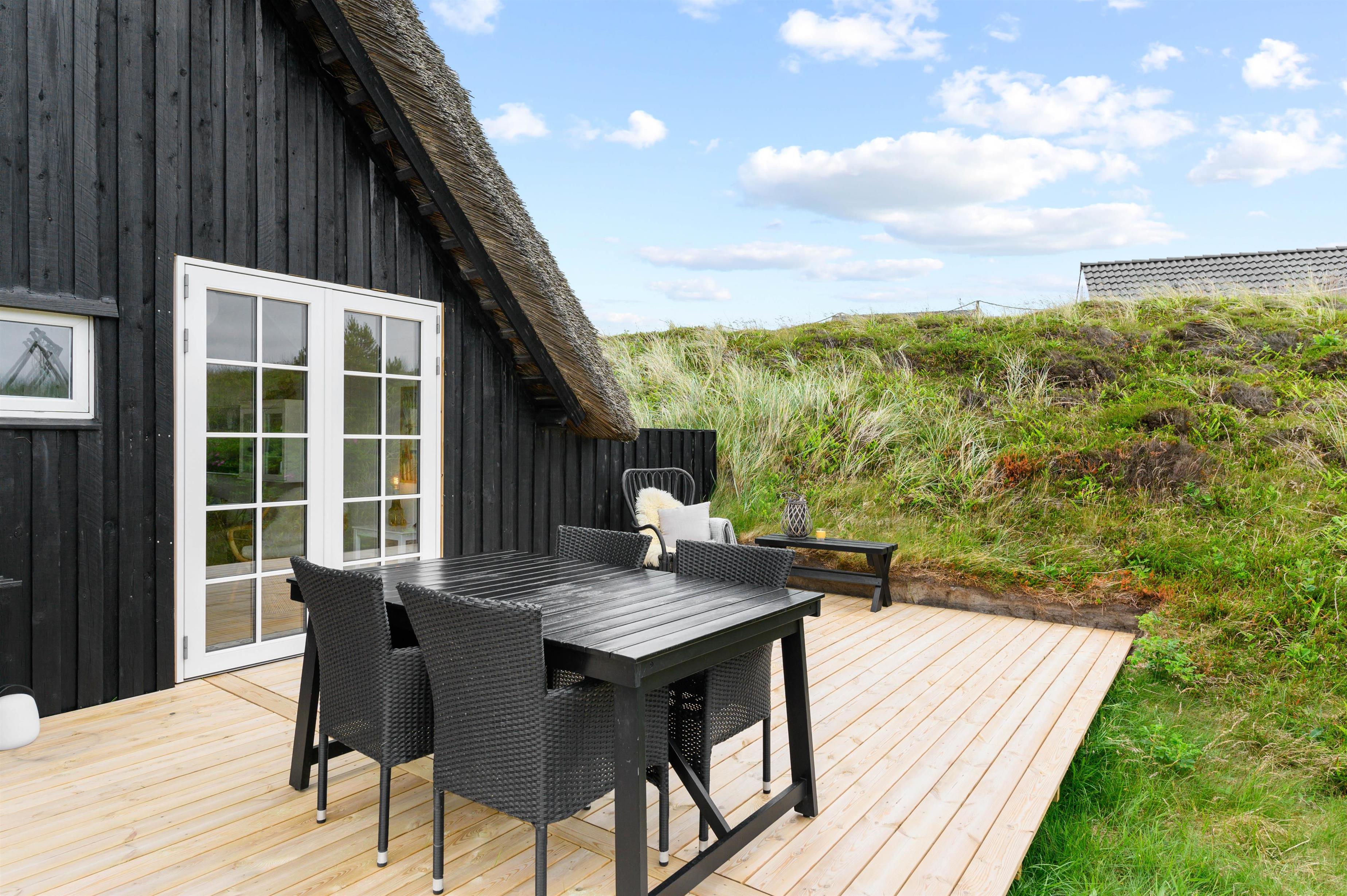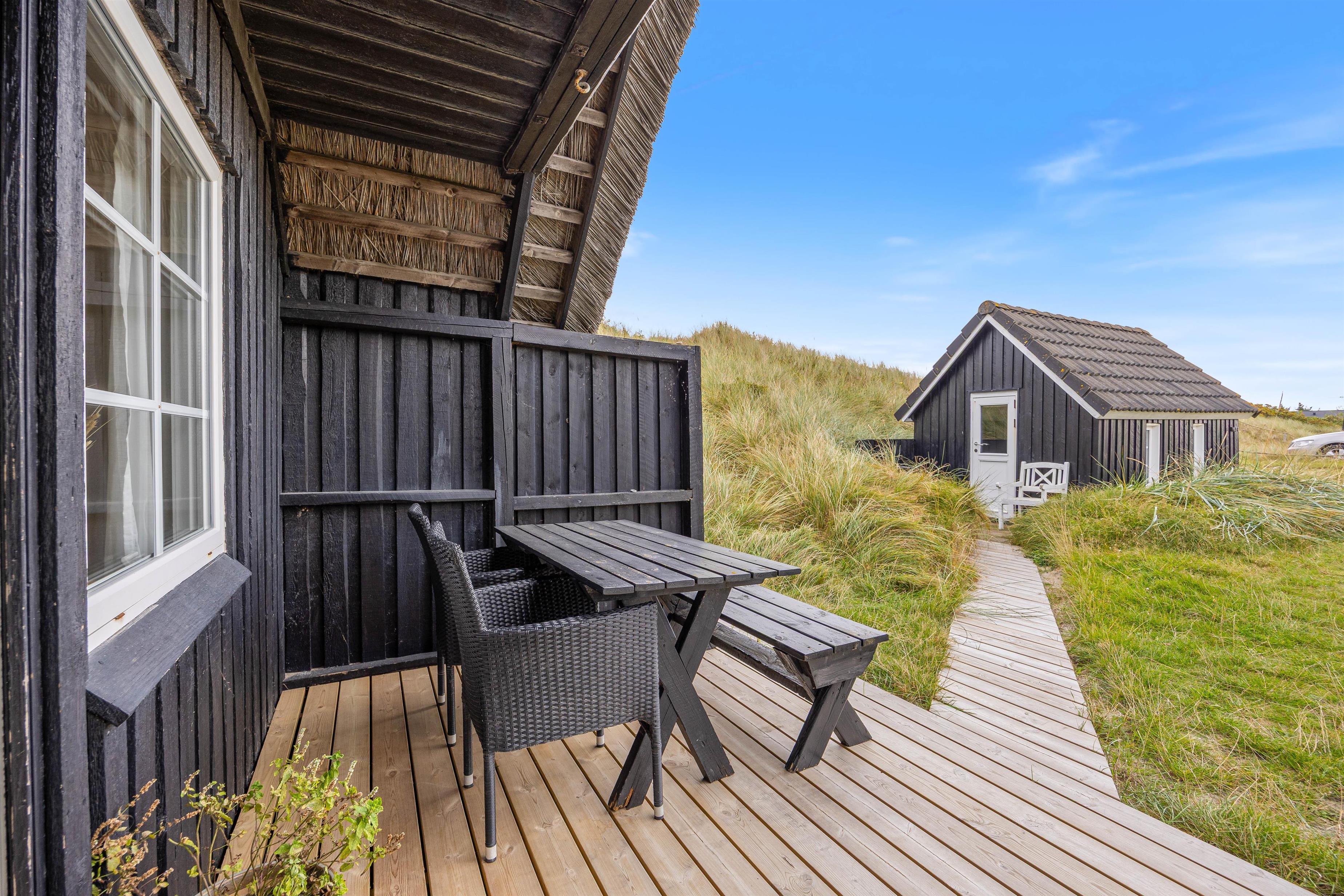 Fra stuen er der adgang til en dejlig morgenterrasse på forsiden af feriehuset samt en fantastisk, stor og velbeliggende vestvendt træterrasse med udsigt over klitgrunden på bagsiden af sommerhuset. Her er gode kvalitetshavemøbler, gasgrill og liggestole samt et bålområde, hvor der kan hygges om aftenen med skumfiduser eller laves bålmad.