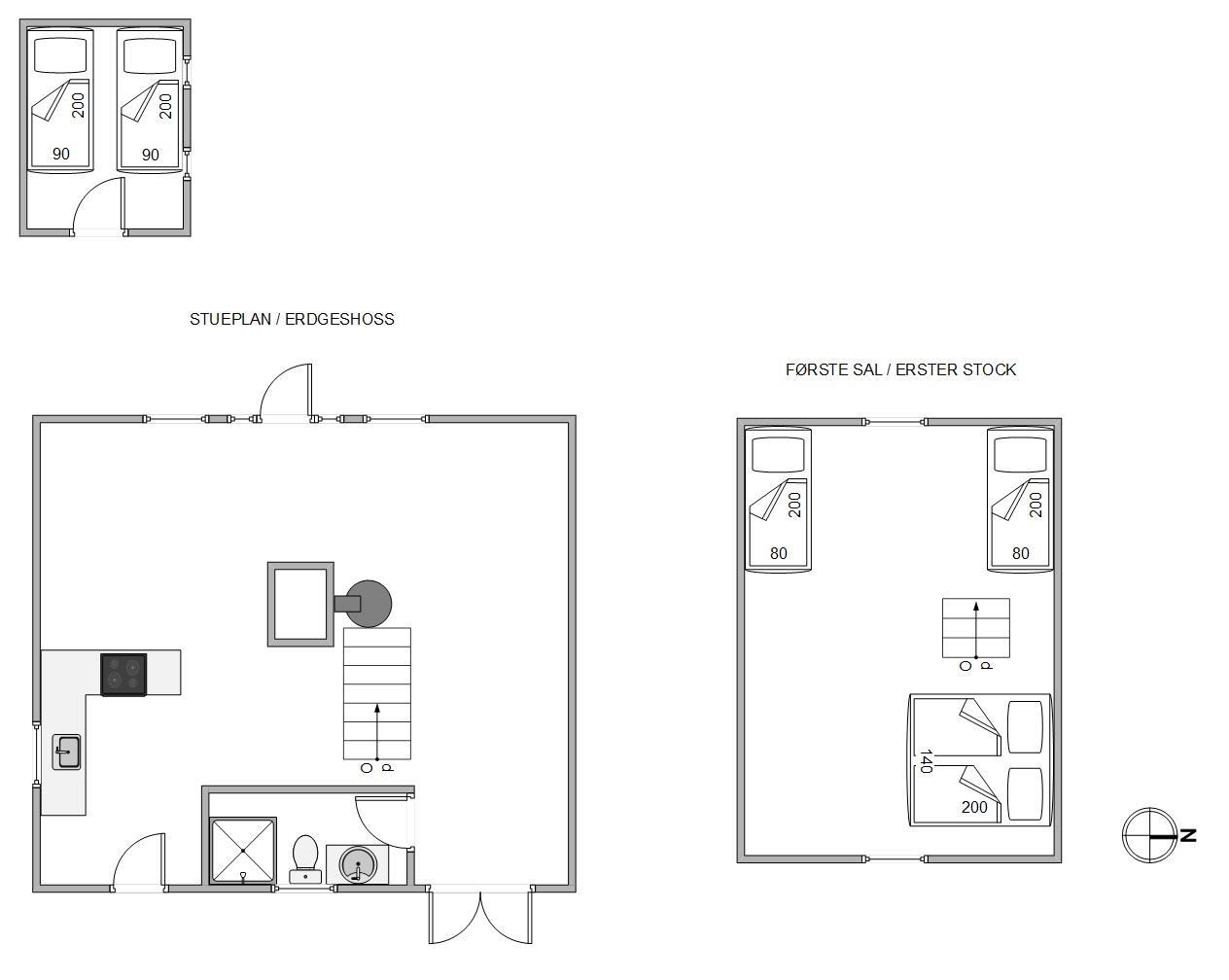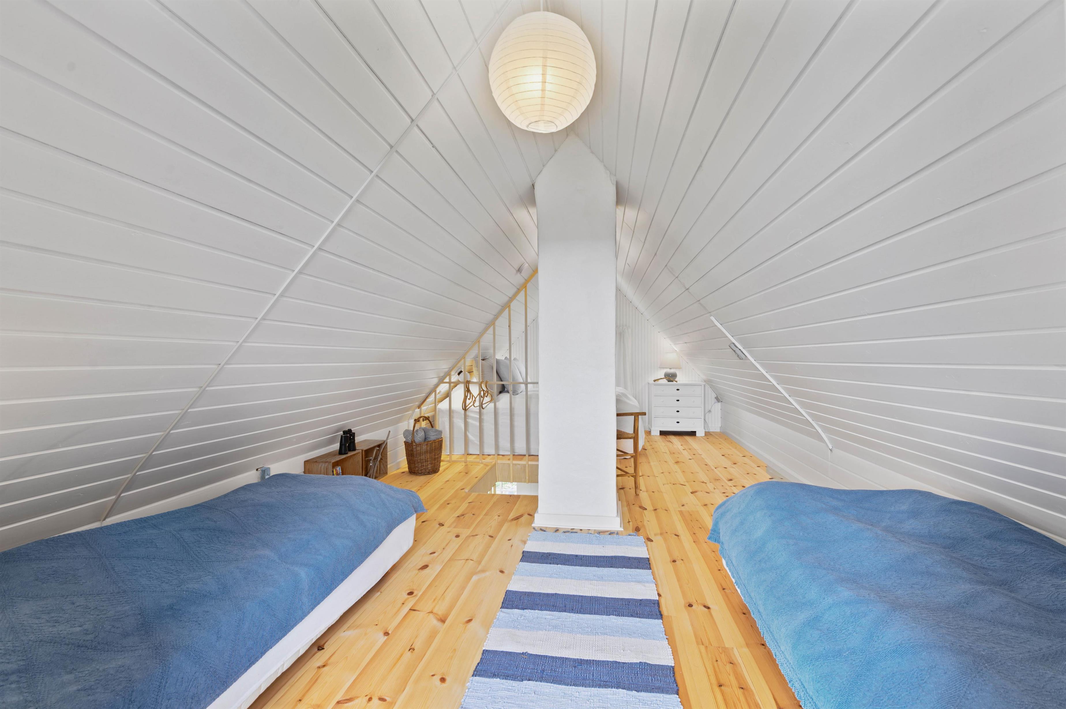 På sommerhusets førstesal er der ét stort soverum med dobbeltseng i den ene ende og 2 enkeltsenge i den anden ende. Afsnittet med dobbeltseng er delvist afskærmet af lamelvæg. 2 yderligere sovepladser findes desuden i sommerhusets hyggelige anneks, hvor der er 2 enkeltsenge, indlagt el og en fladskærm.