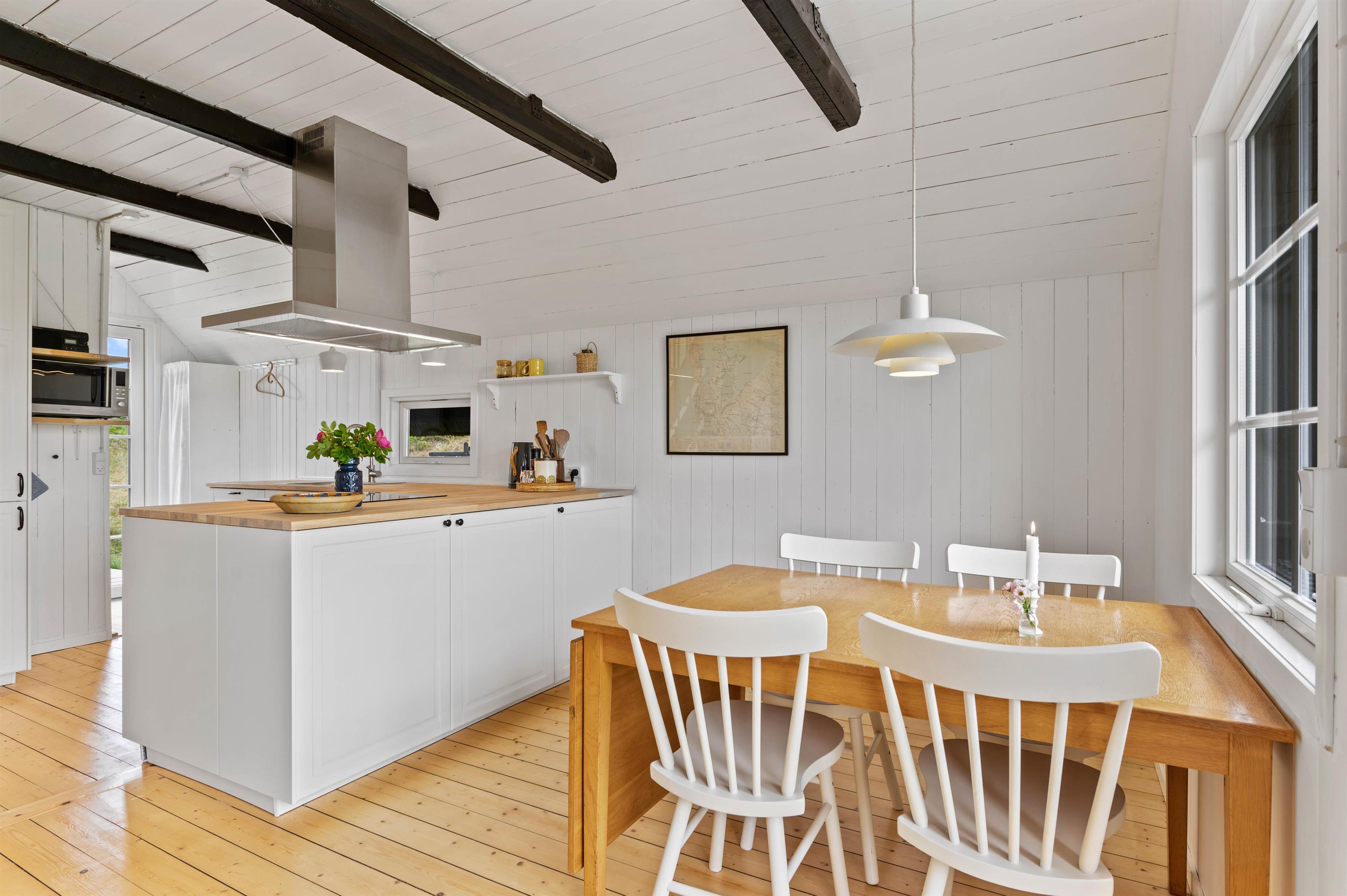 Feriehuset på Julianevej 128 indeholder i stueplan ét stort, åbent køkken/alrum/stue samt badeværelse med brus. I alrummet kan I nyde hinandens selskab med en god film eller et spil, mens brændeovnen knitrer og skaber en ekstra hyggelig feriestemning.