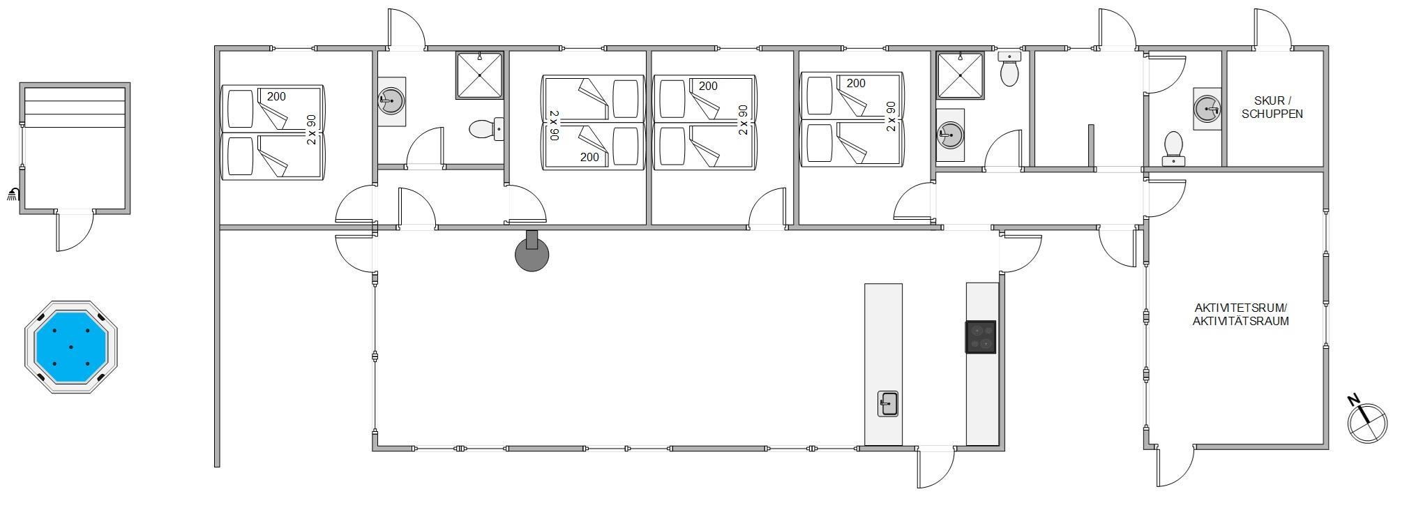 Det 166 m2 store aktivitetshus er indrettet med rigelig plads til alle. Her kan familien tilbringe mange hyggelige og underholdende feriestunder sammen. Lav f.eks. en bordtennisturnering og find feriens bordtennismester.