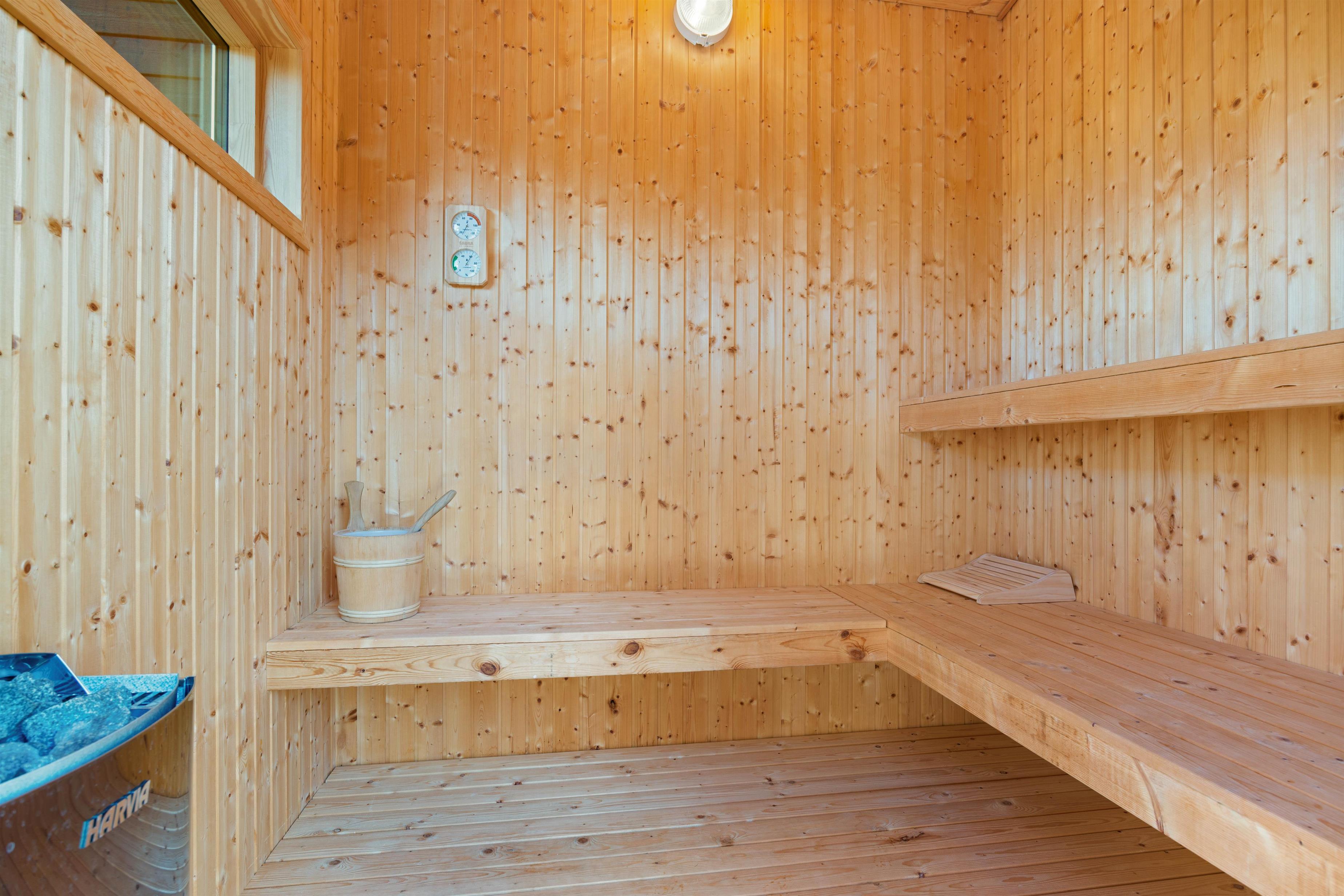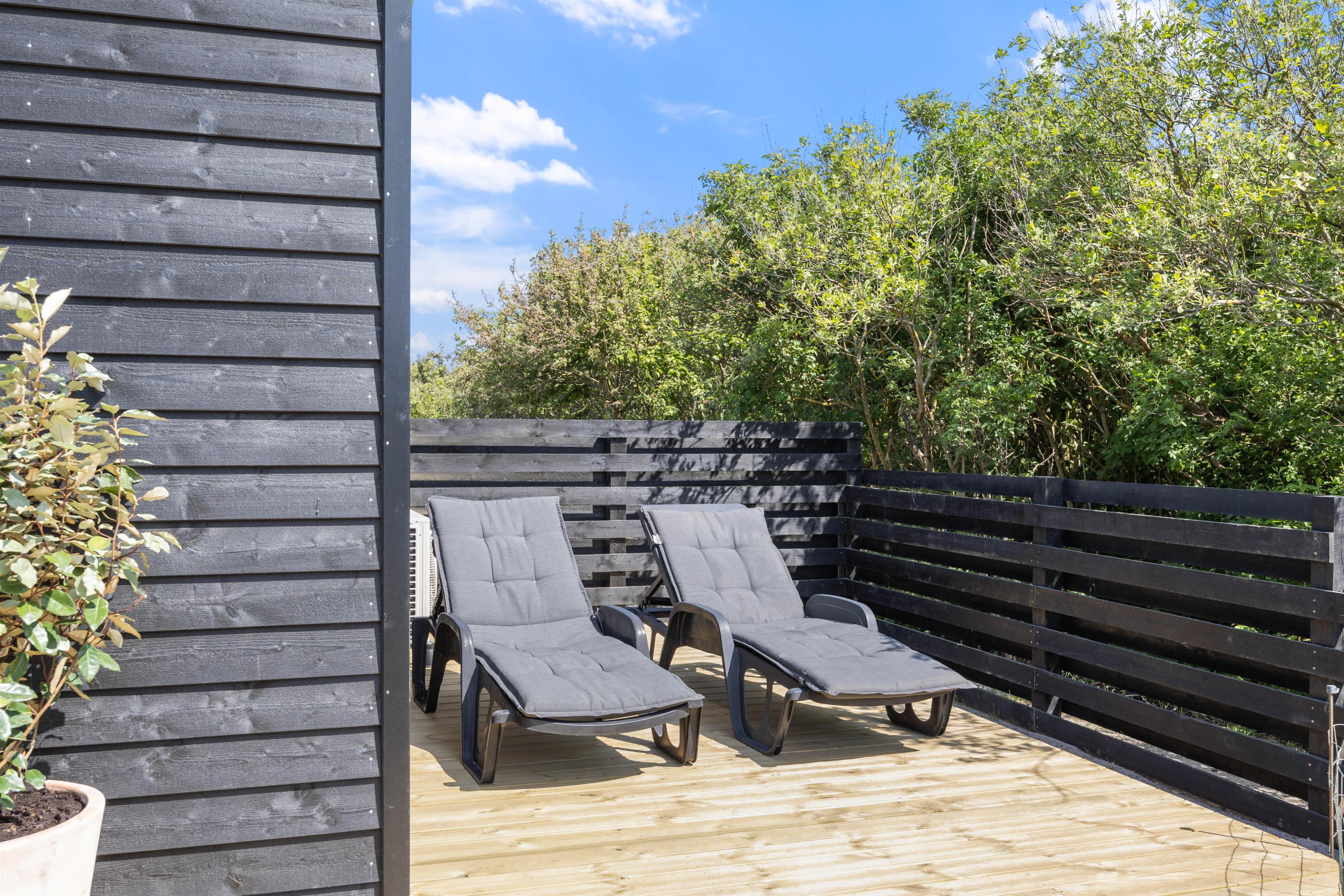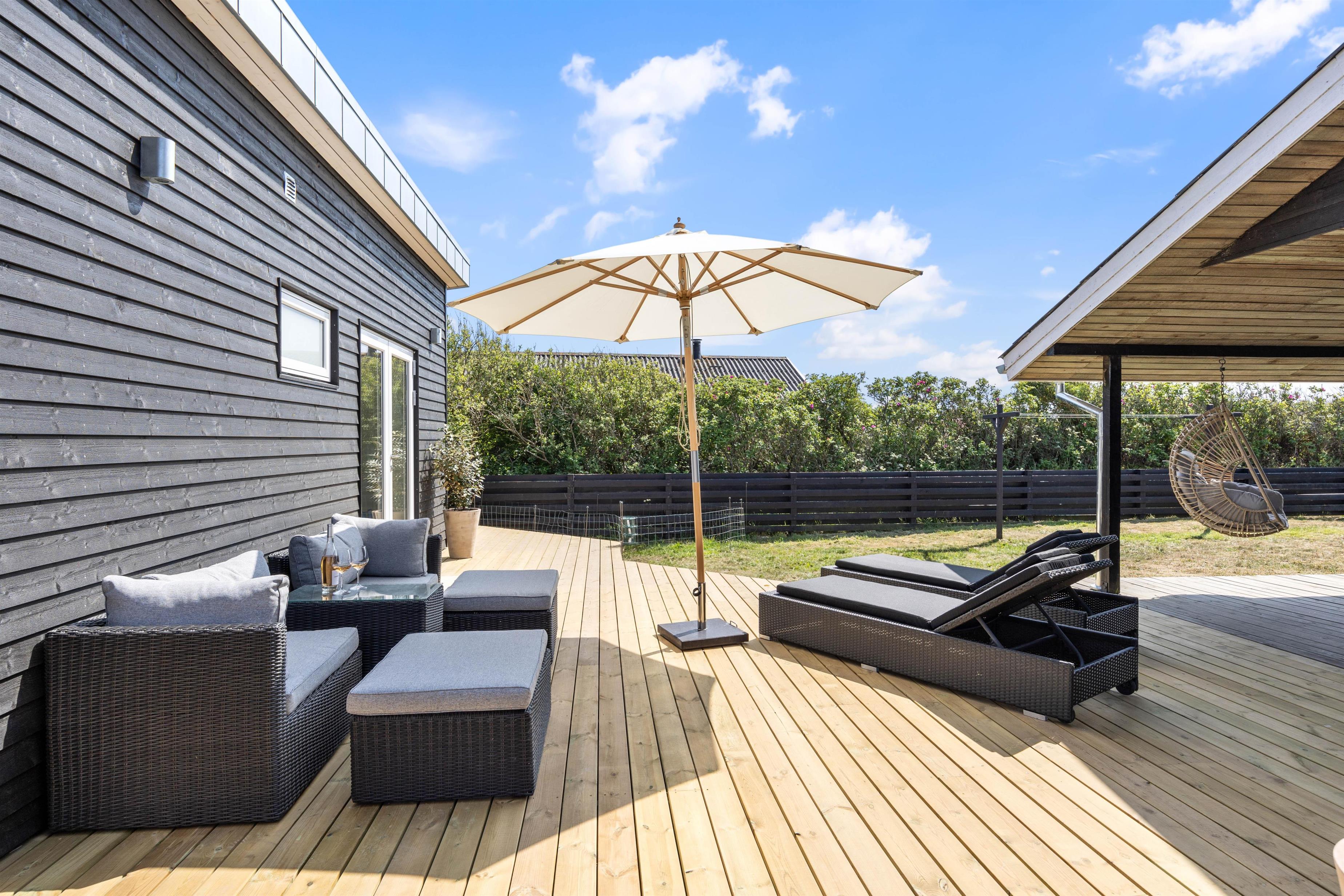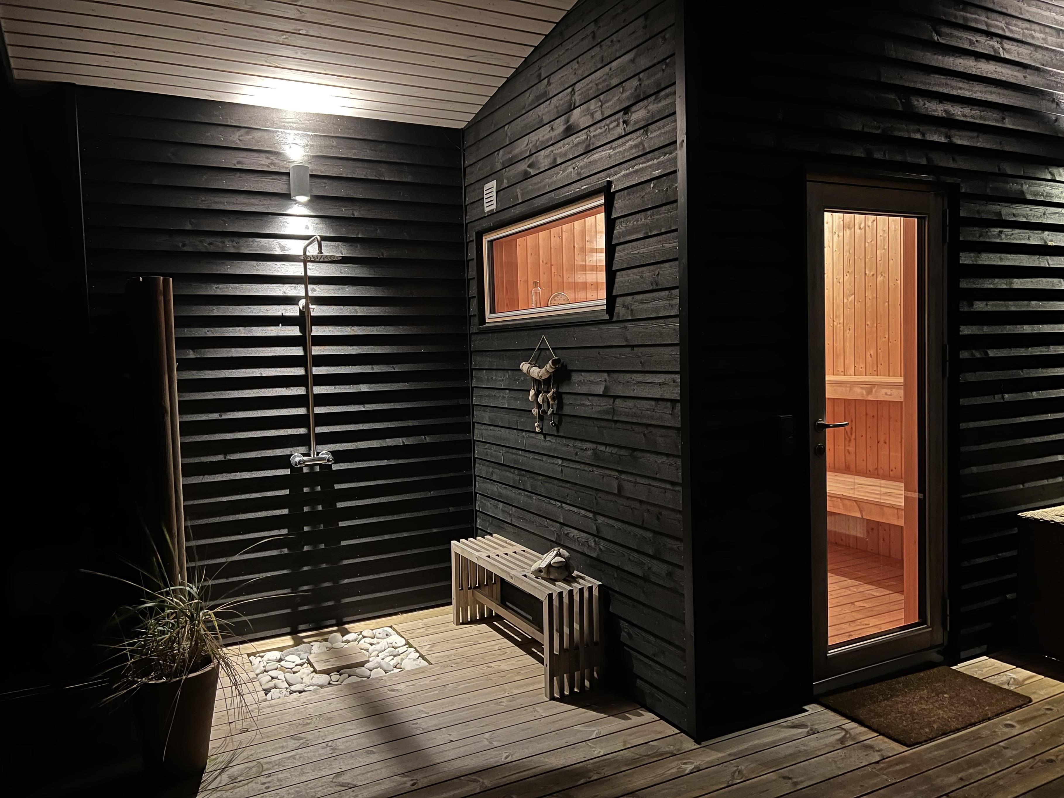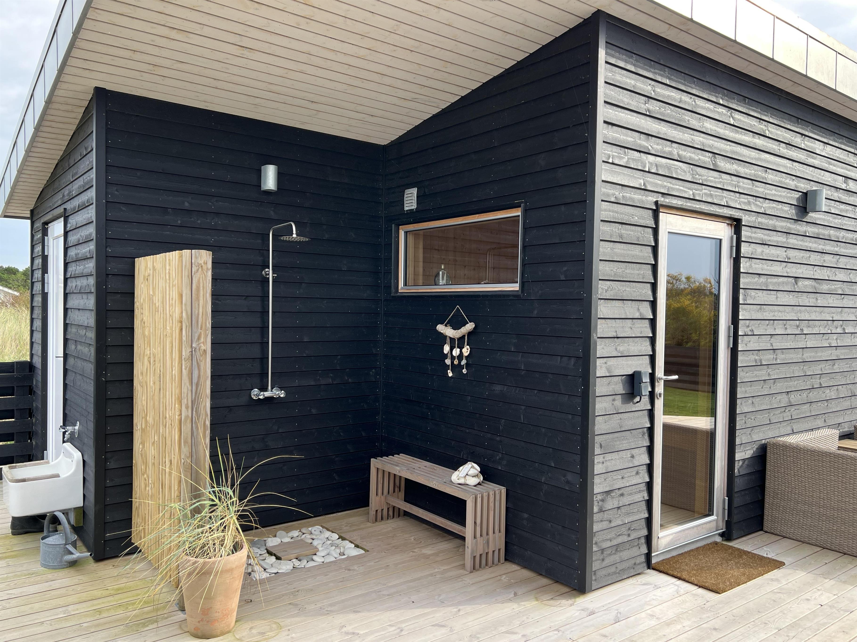 En stor del af grunden er indhegnet og dermed lukket, så du roligt kan lade børnene lege lidt alene. Og ligeledes kan du også lukke hunden ud uden at skulle bekymre dig om, at den løber. Slap af i havemøblerne, eller slik sol i de komfortable liggestole på den smukke terrasse. Bliver solen for stærk, kan du friske op under udebruseren. Udebruseren kan benyttes fra april til november. På kølige dage vil en tur i saunaen først give varme og afslapning. Til børnene er der en sandkasse, som de sikkert kan få meget sjov ud af. Tænd op i grillen, og slut dagen af med et lækkert grillmåltid sammen.