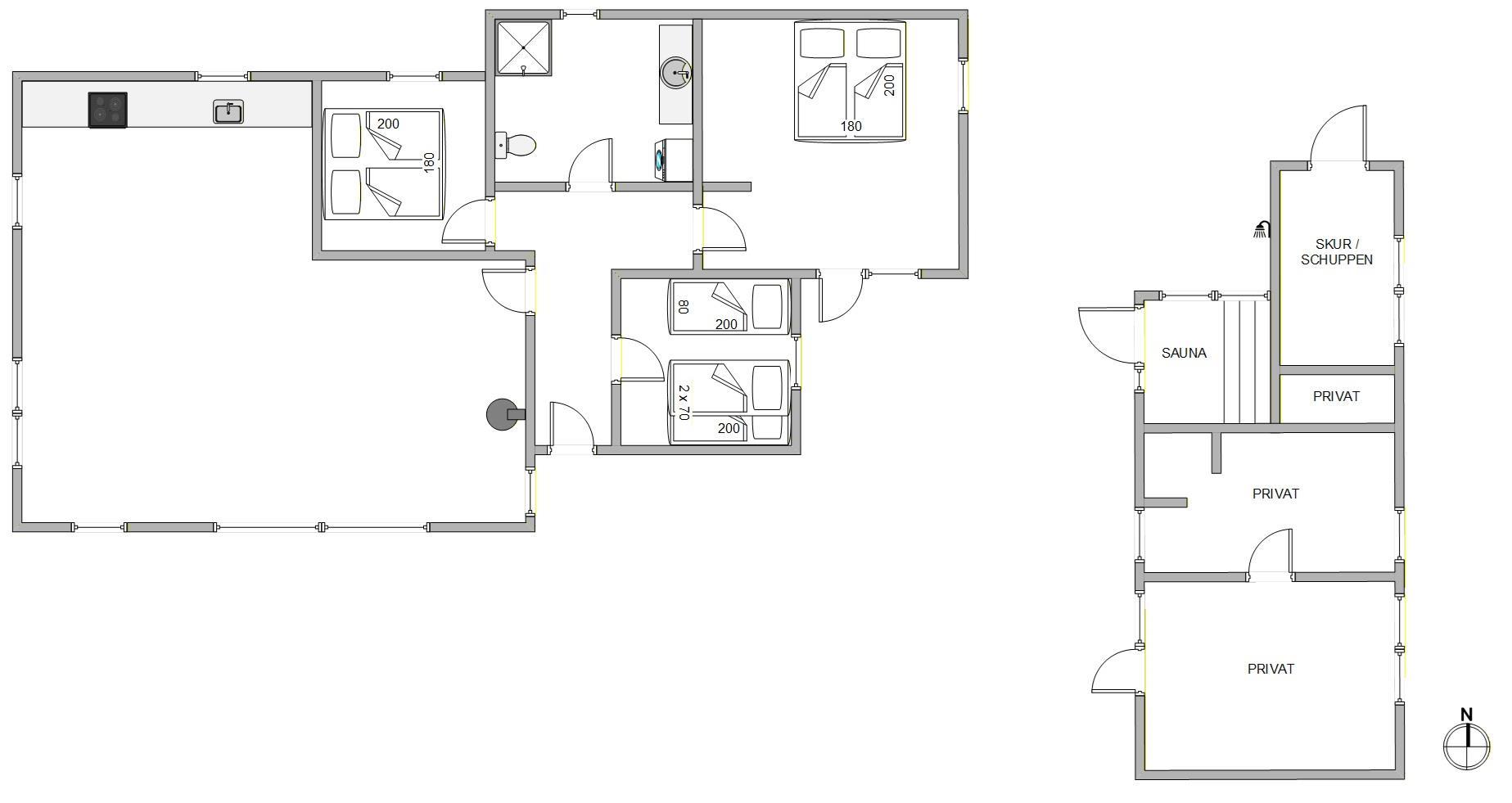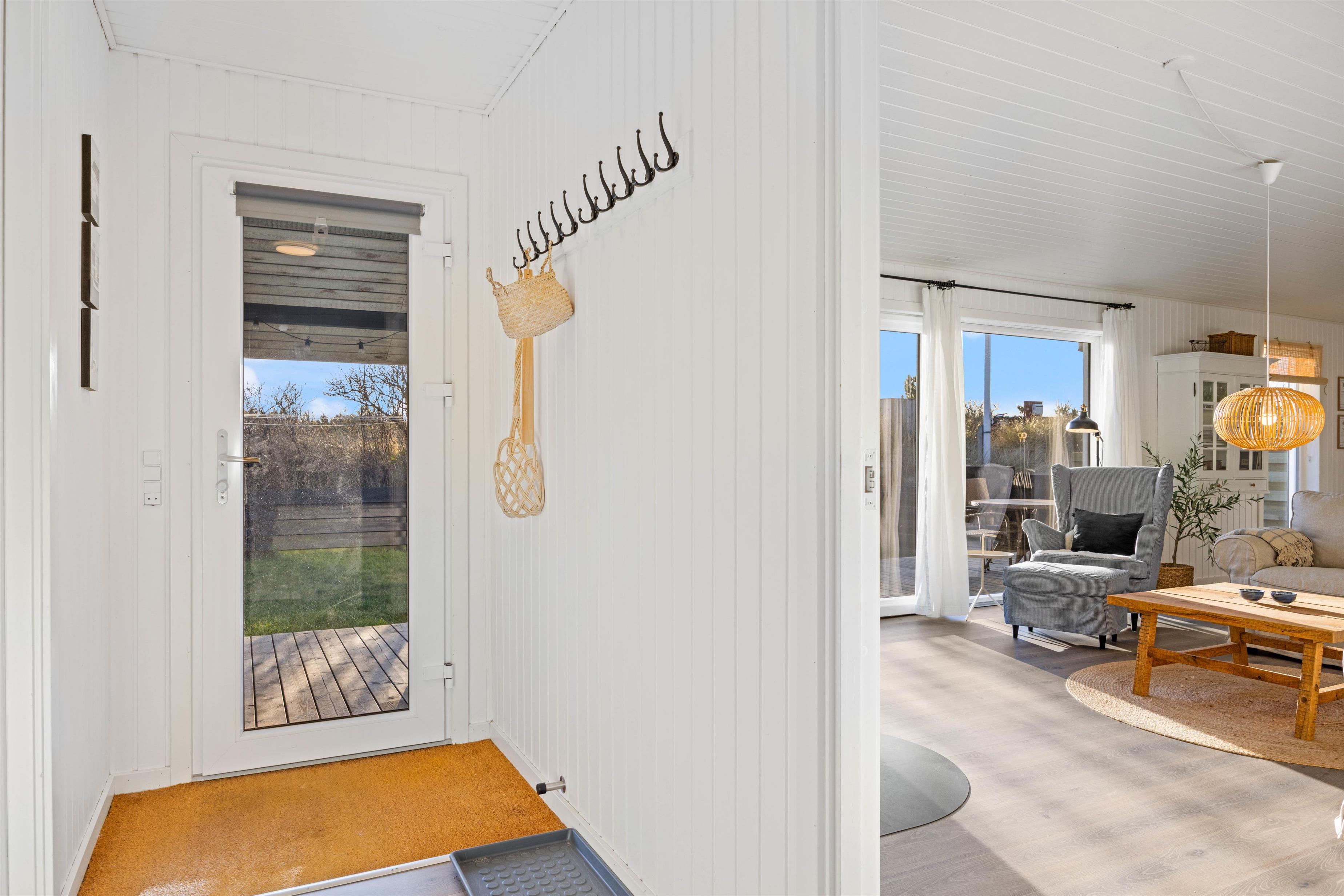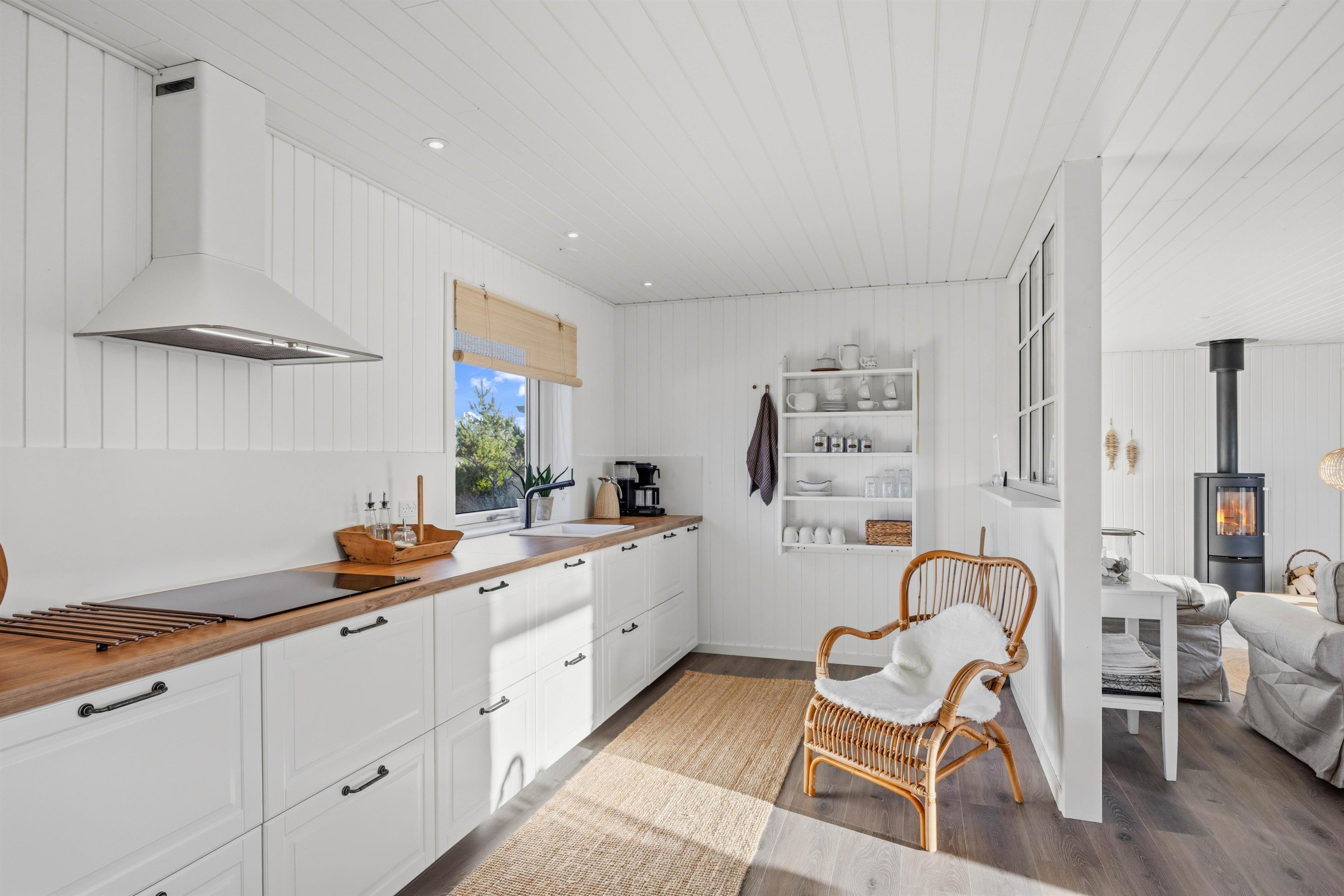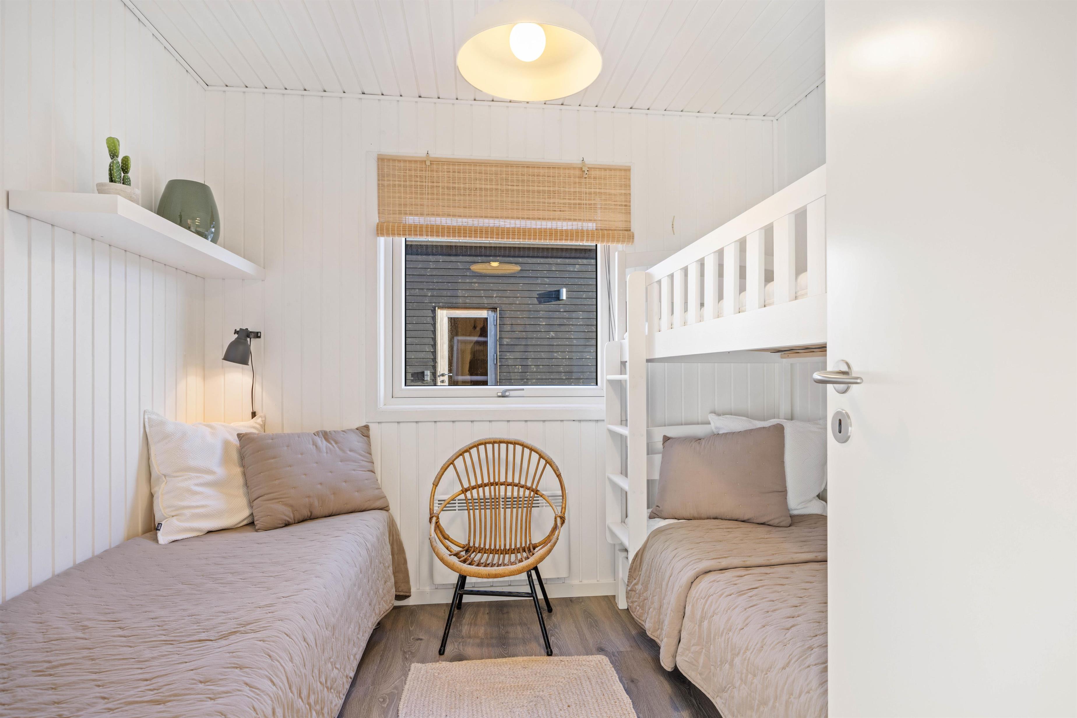 I det praktiske køkken kan du hygge dig med madlavningen og bagefter sætte dig godt til rette i stuen og se en god film. Stuen og soverummene er adskilt af en lille gang, så du sagtens kan nyde de lange aftener i sofaen med et glas vin, mens de små sover uforstyrret. Sommerhuset har 3 værelser, 2 med dobbeltsenge, mens det sidste er indrettet med en køjeseng samt en enkeltseng. Den ene dobbeltseng er med elevation.