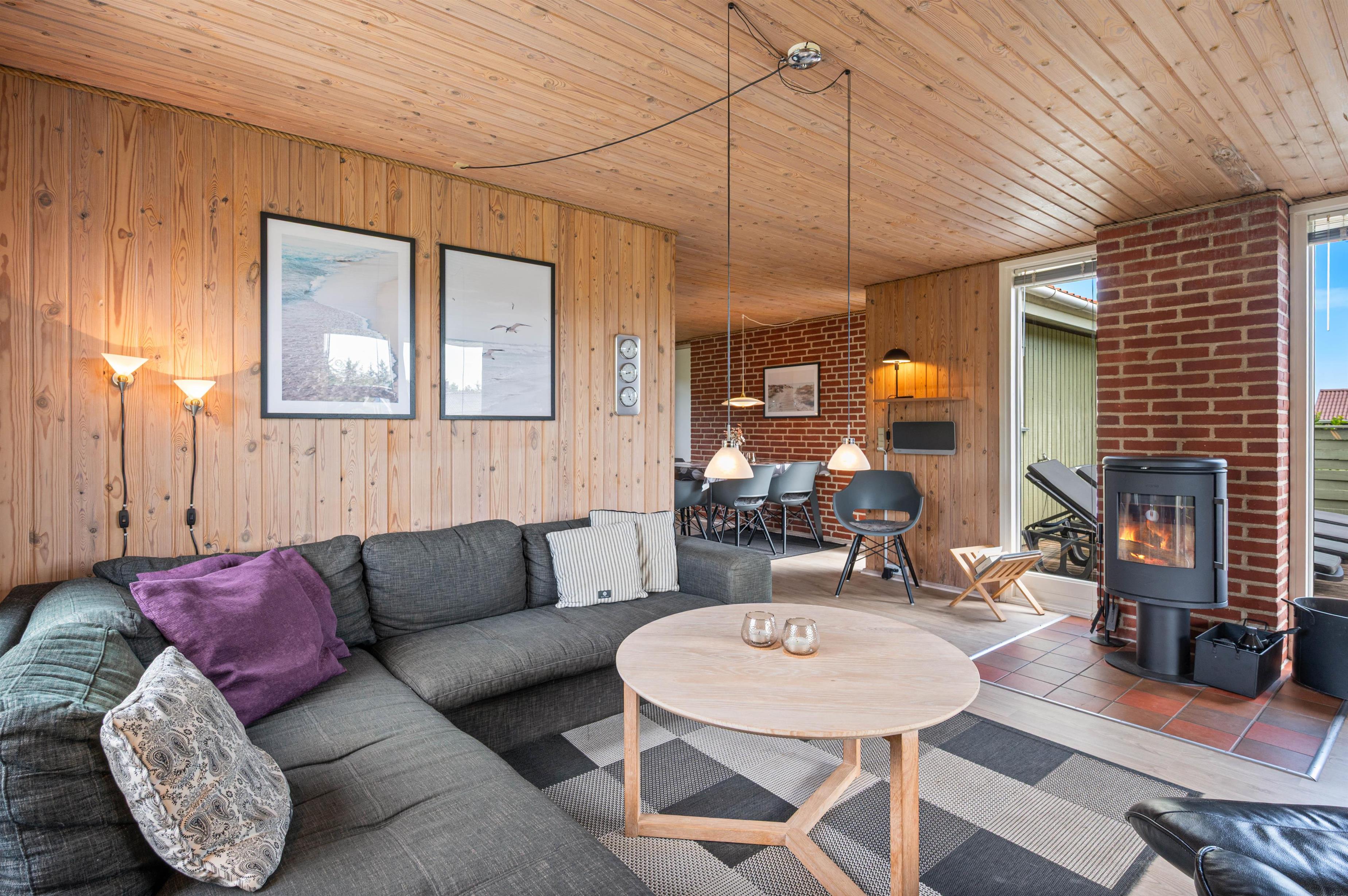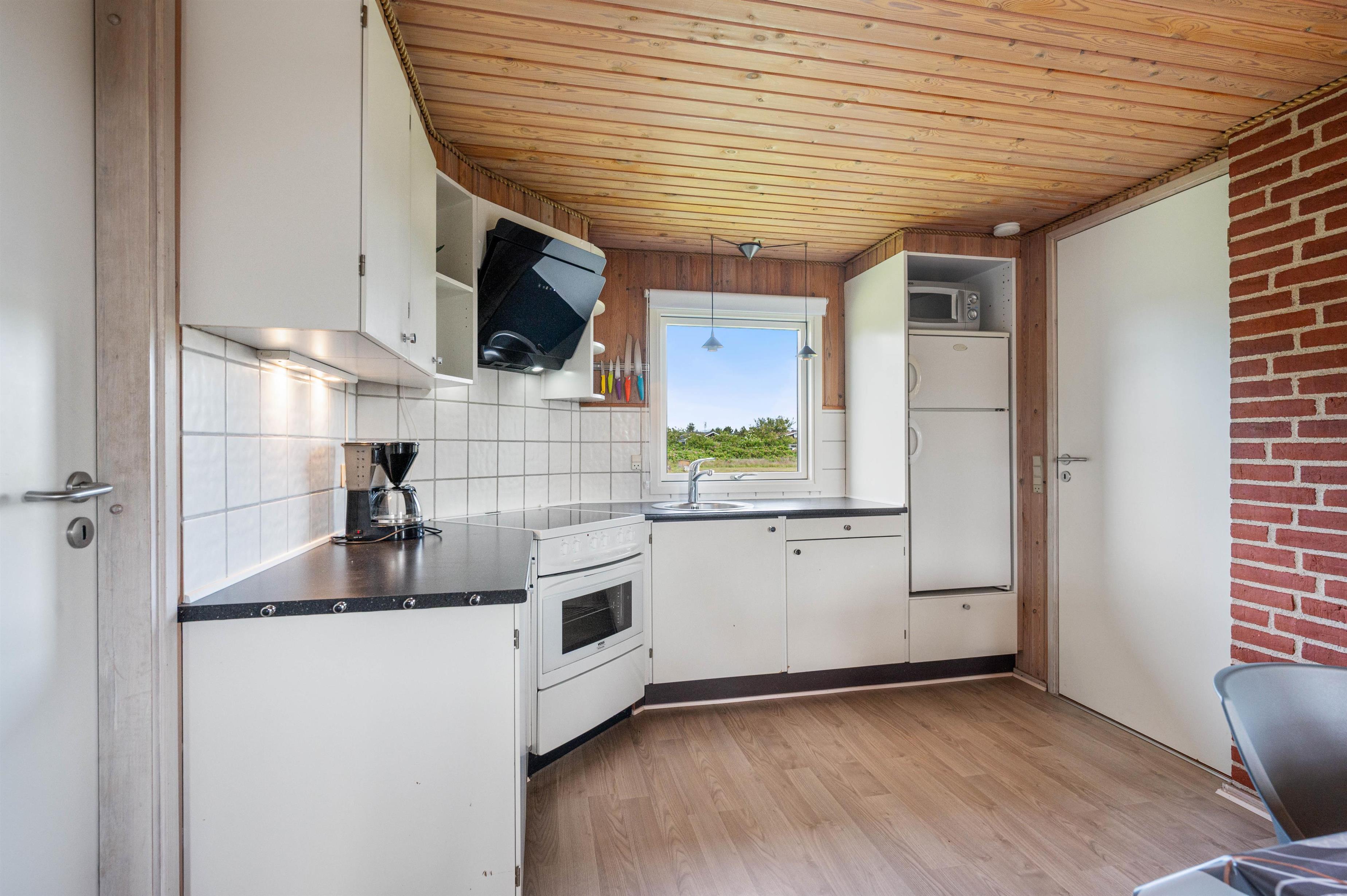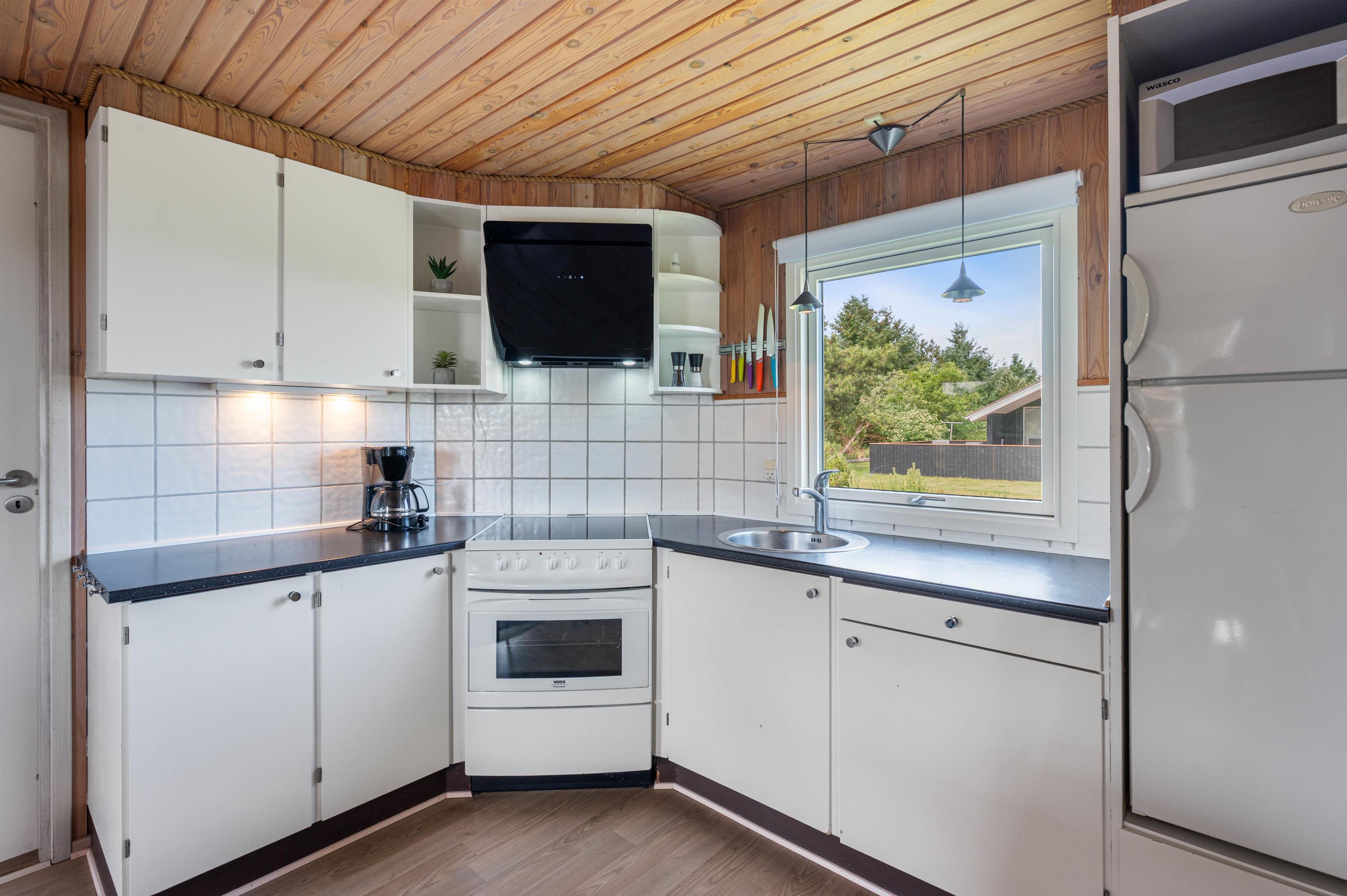 Køkkenet er funktionelt og udstyret med mikroovn, køleskab og fryser. Det åbne køkkenalrum ligger i forbindelse med stuen, som har siddepladser, pejs og tv. Her kan man samles til måltider eller stille aktiviteter, og pejsen kan skabe en afdæmpet varme og stemning på kølige aftener.