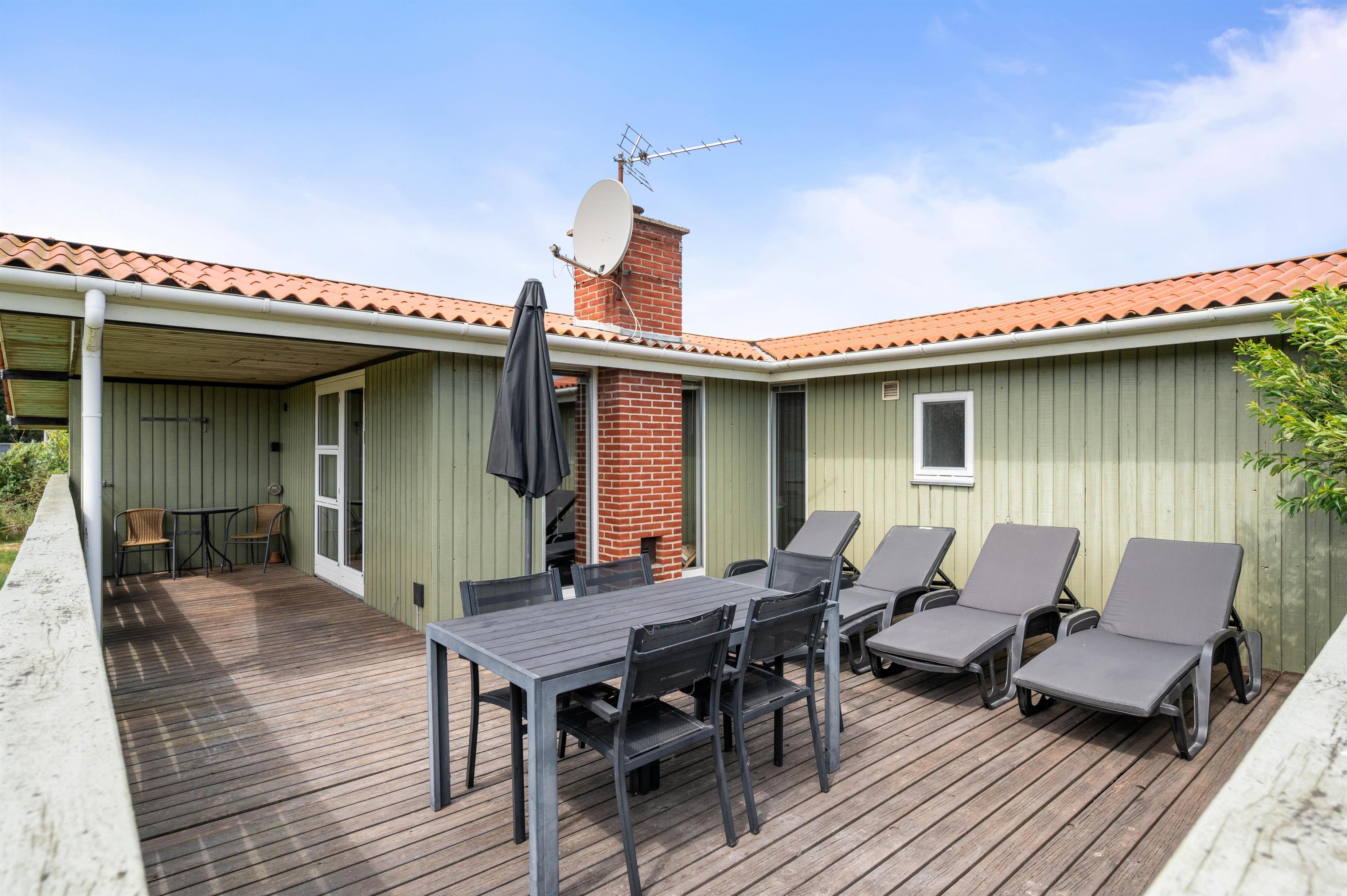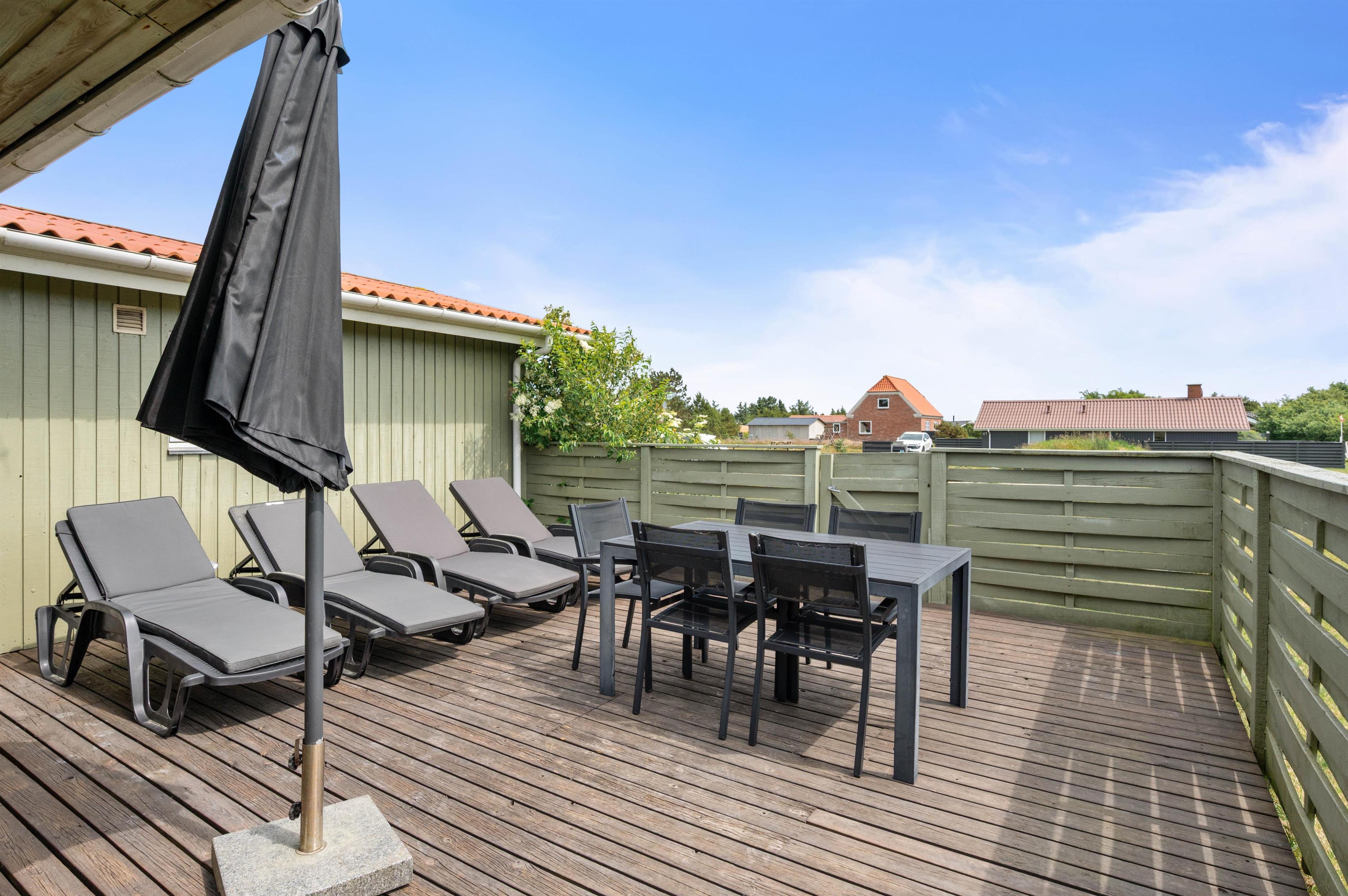 Den afskærmede terrasse gør sommerhuset praktisk for familier med små børn eller hunde. Terrassen har grill, liggestole og havemøbler, og den lille overdækkede del giver en enkel beskyttelse mod vind og vejr. Sommerhuset ligger kun 400 meter fra stranden og 950 meter fra de nærmeste indkøbsmuligheder, hvilket gør det nemt at kombinere afslapning med praktiske ærinder.